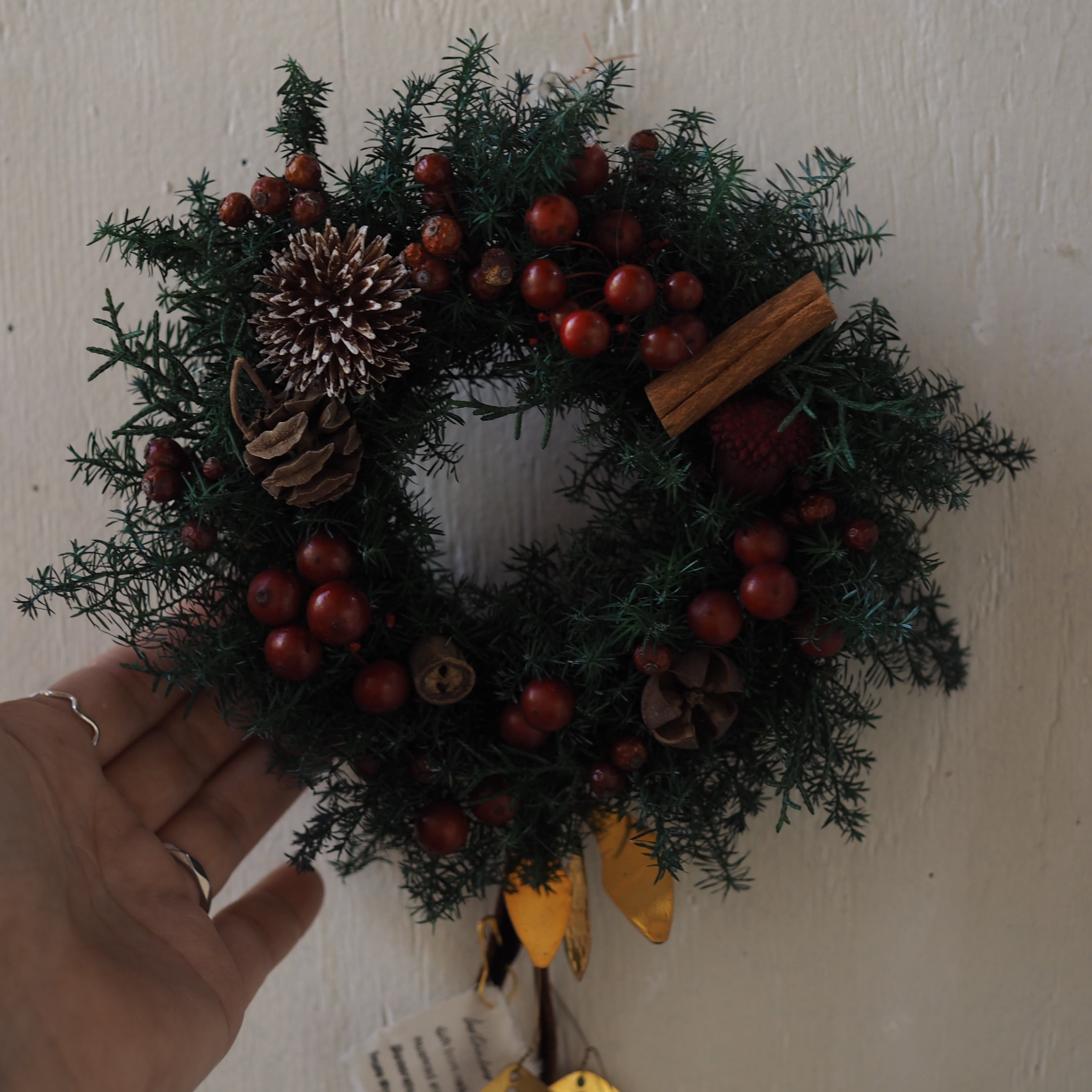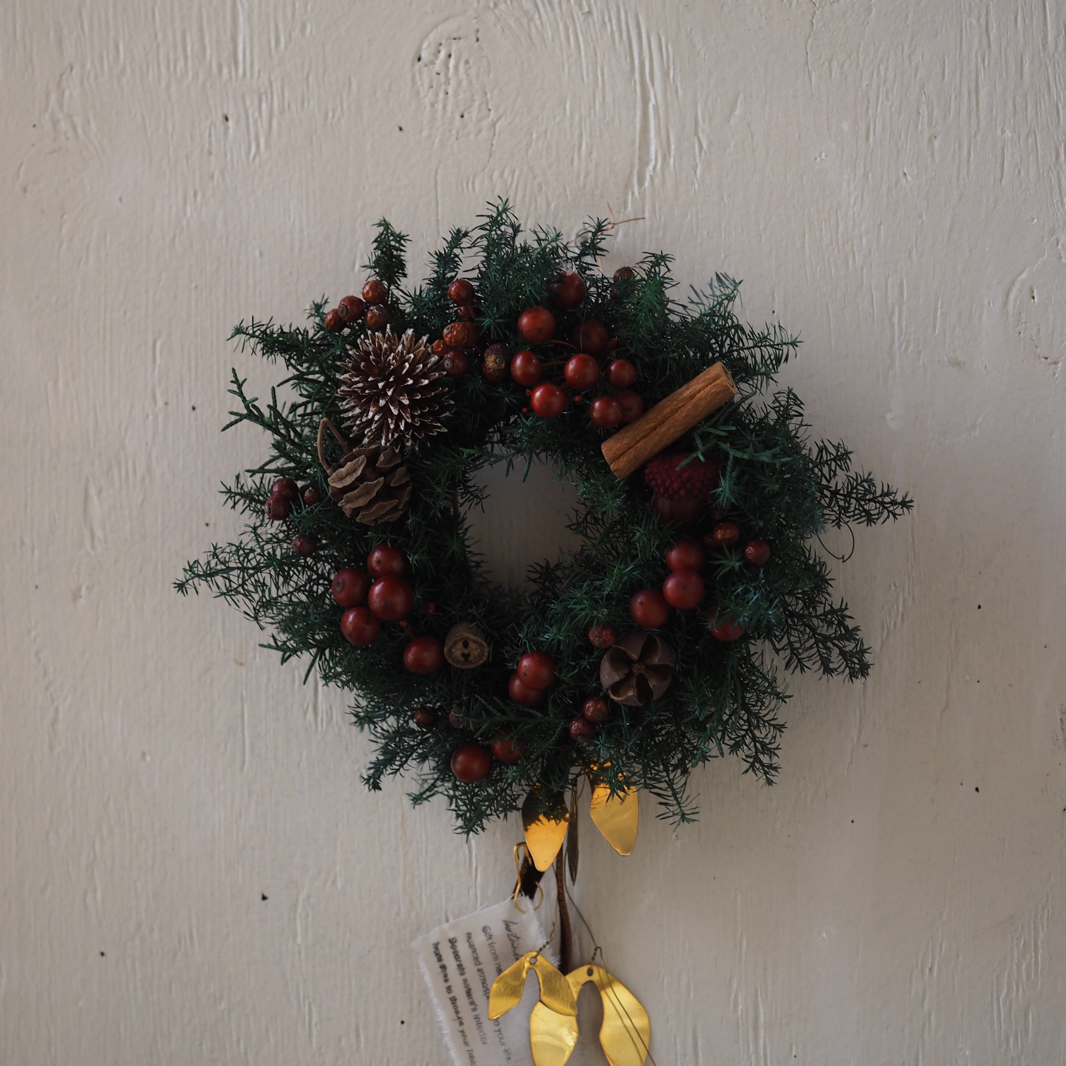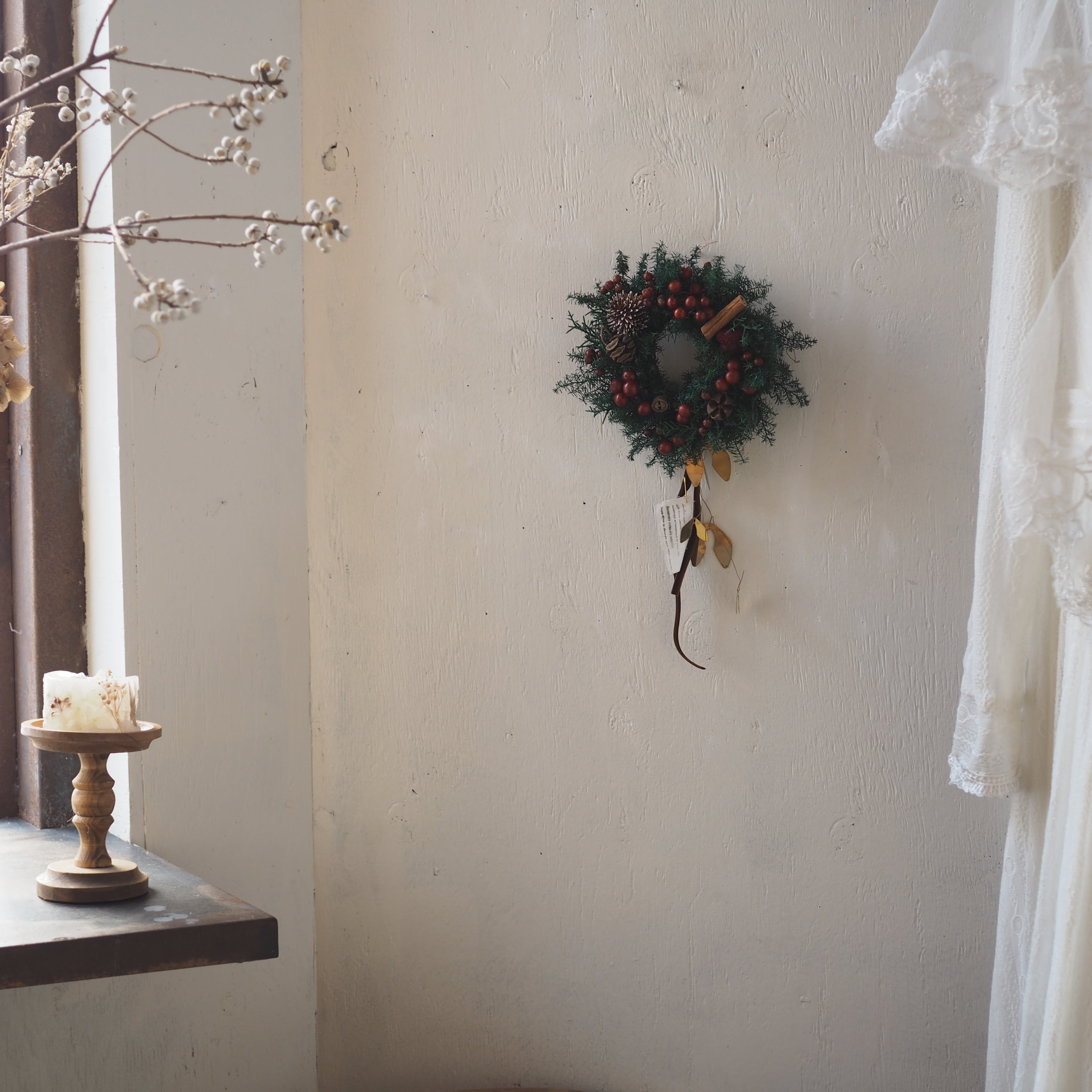 プリザーブドグリーンのマウンテンジュニパーやヒムロスギをベースに、木の実をあしらったナチュラルなクリスマスリース。