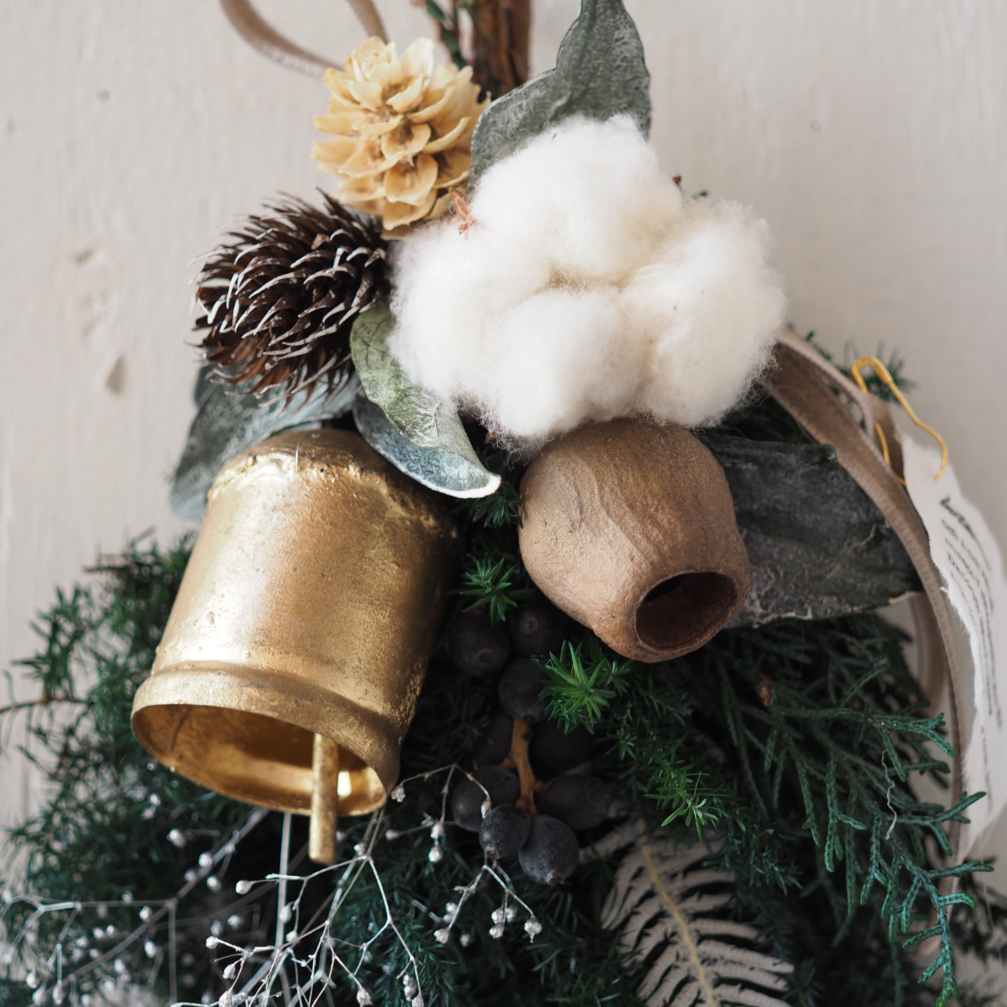 温かみのあるベルと、深いグリーンのコントラストが美しく、クリスマスシーズンのデコレーションにもおすすめです。