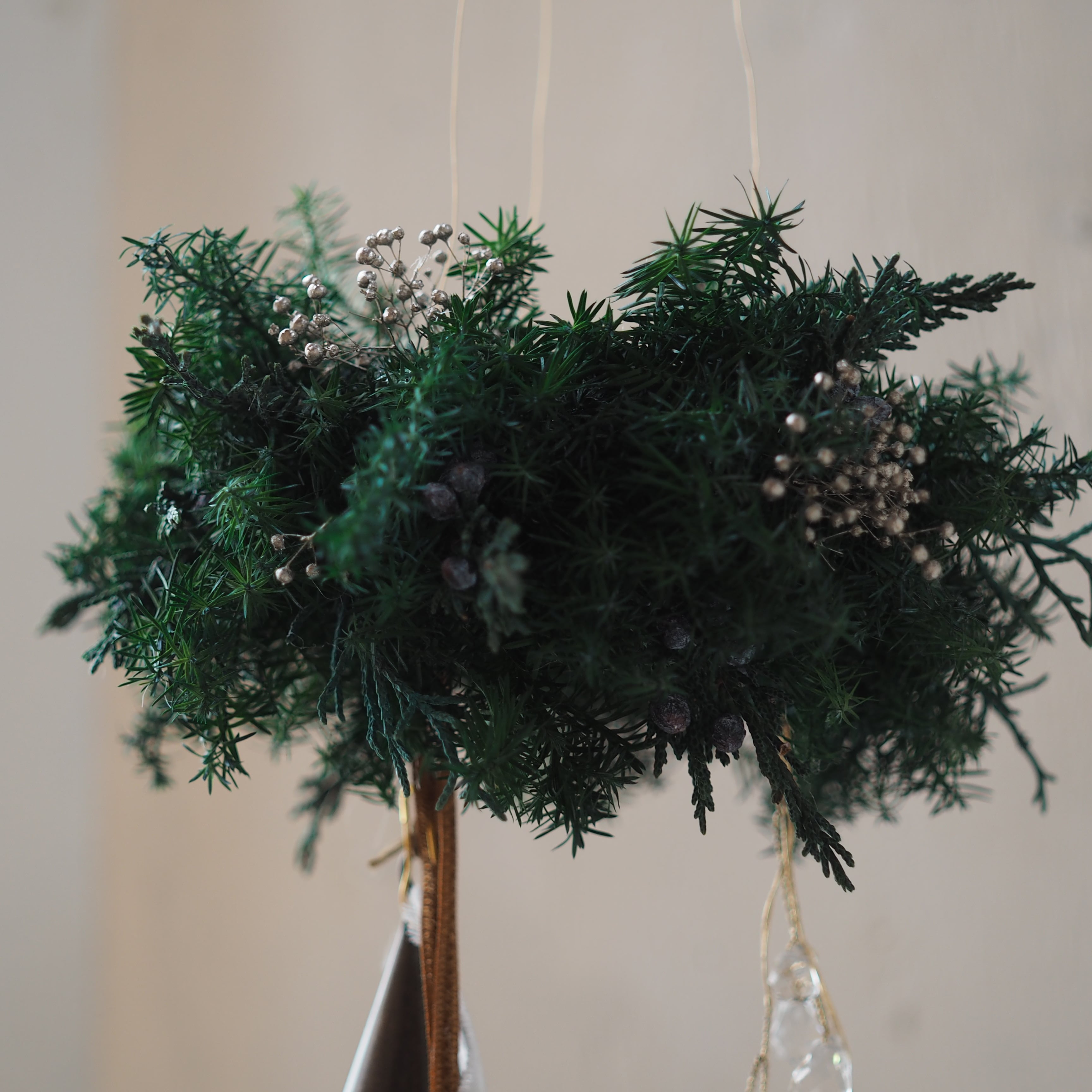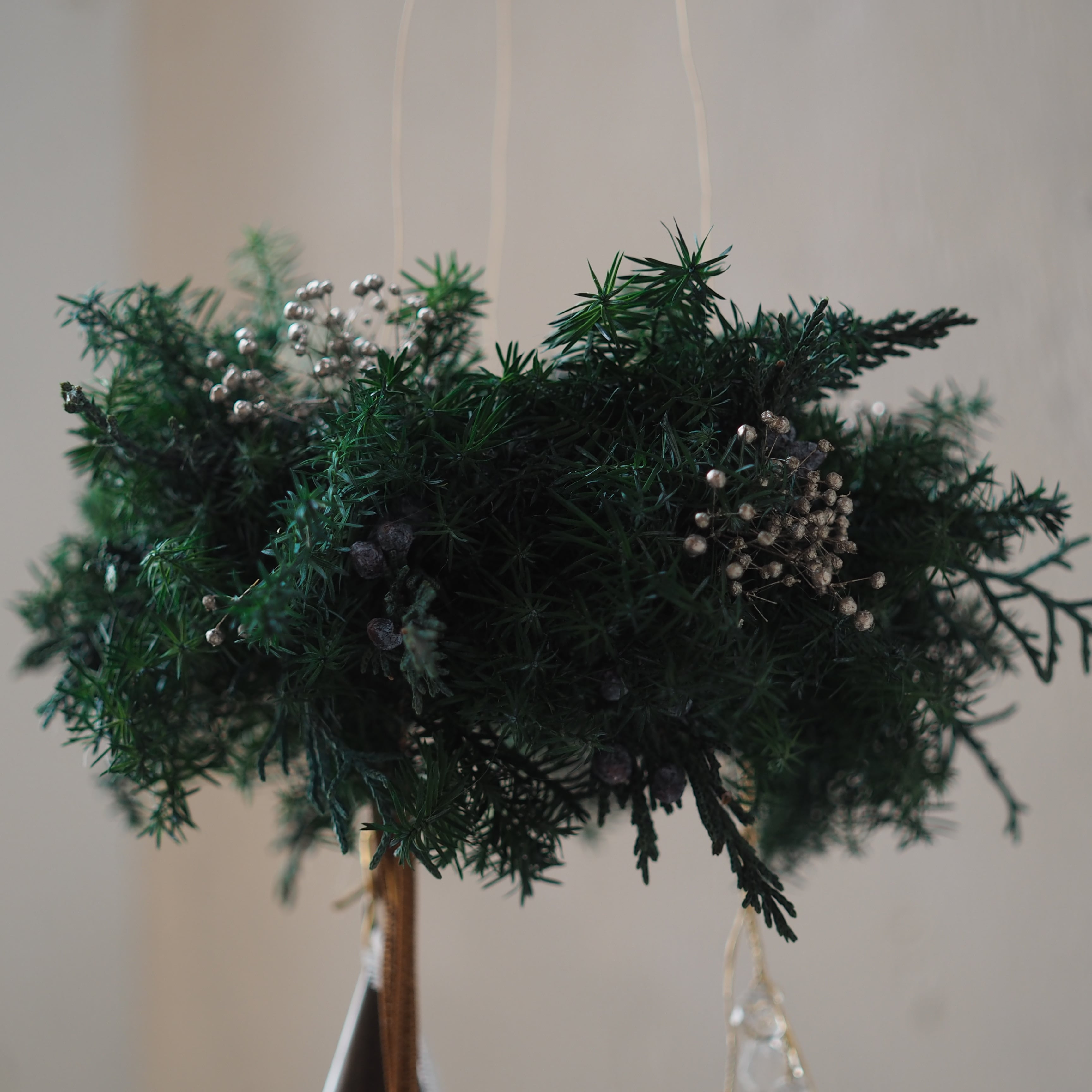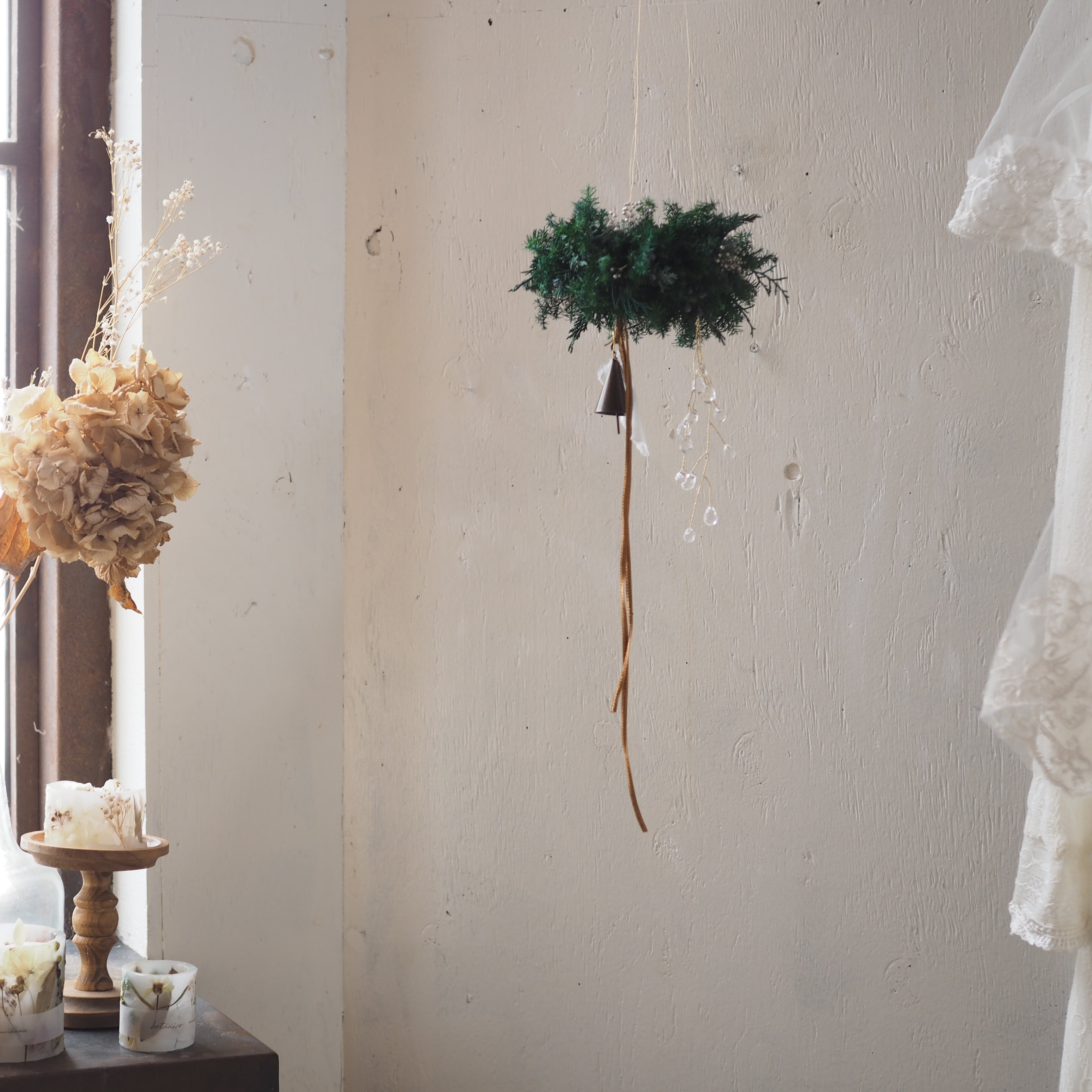 美しいグリーン色が魅力の プリザーブド針葉樹をたっぷりと使い、ところどころにかすみ草をあしらい、上品で柔らかな雰囲気に仕上げました。