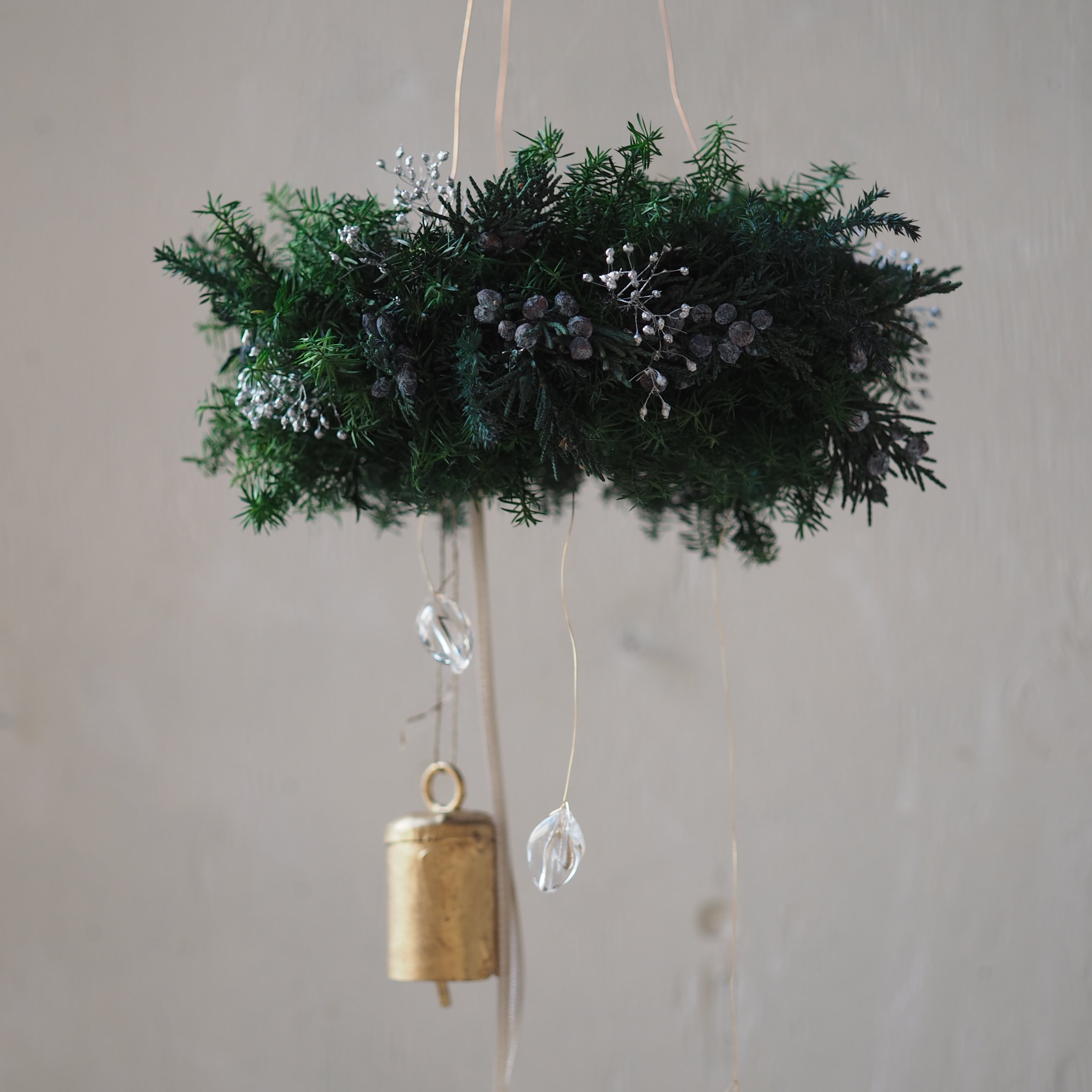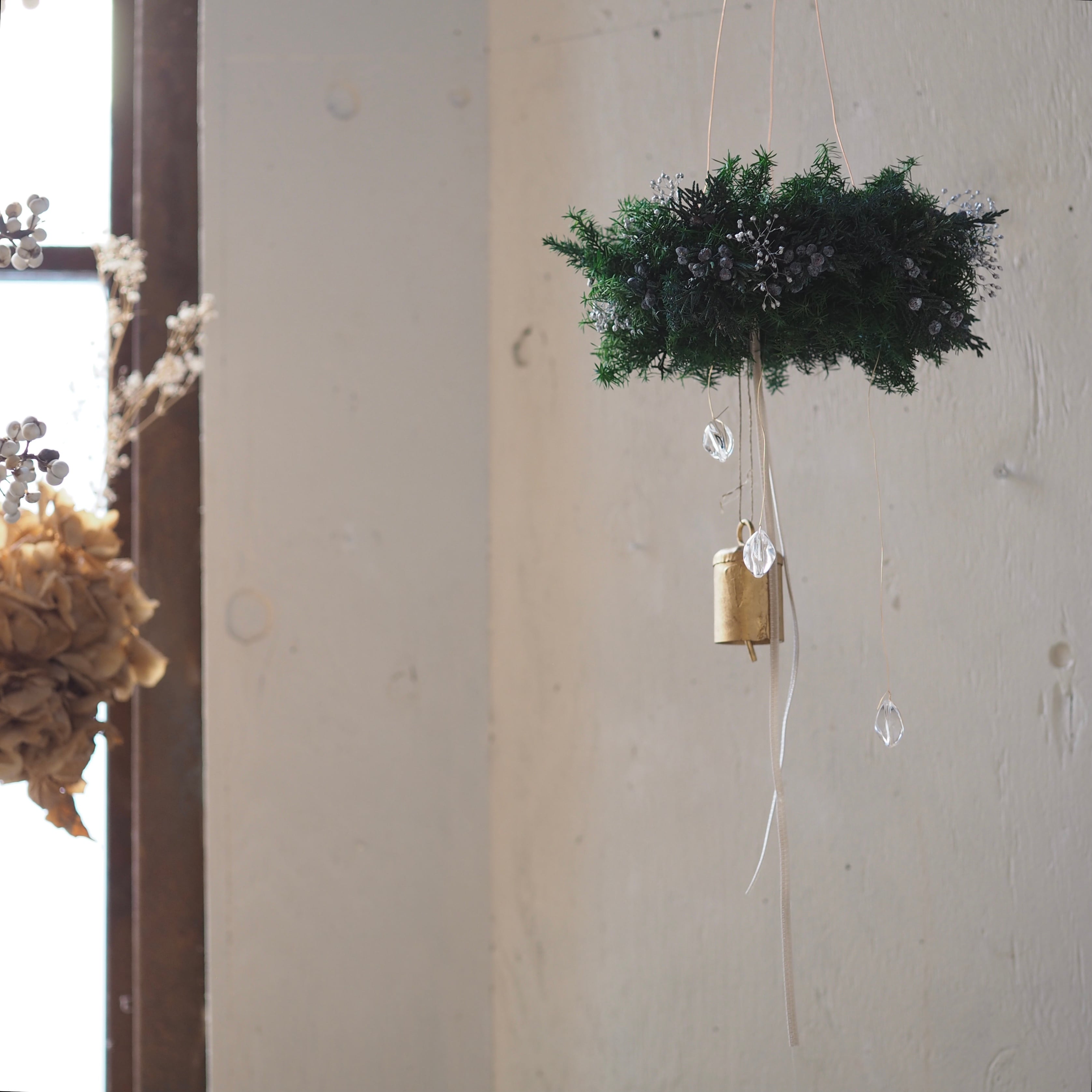 美しいグリーン色が魅力の プリザーブド針葉樹をたっぷりと使い、ところどころにかすみ草をあしらい、上品で柔らかな雰囲気に仕上げました。