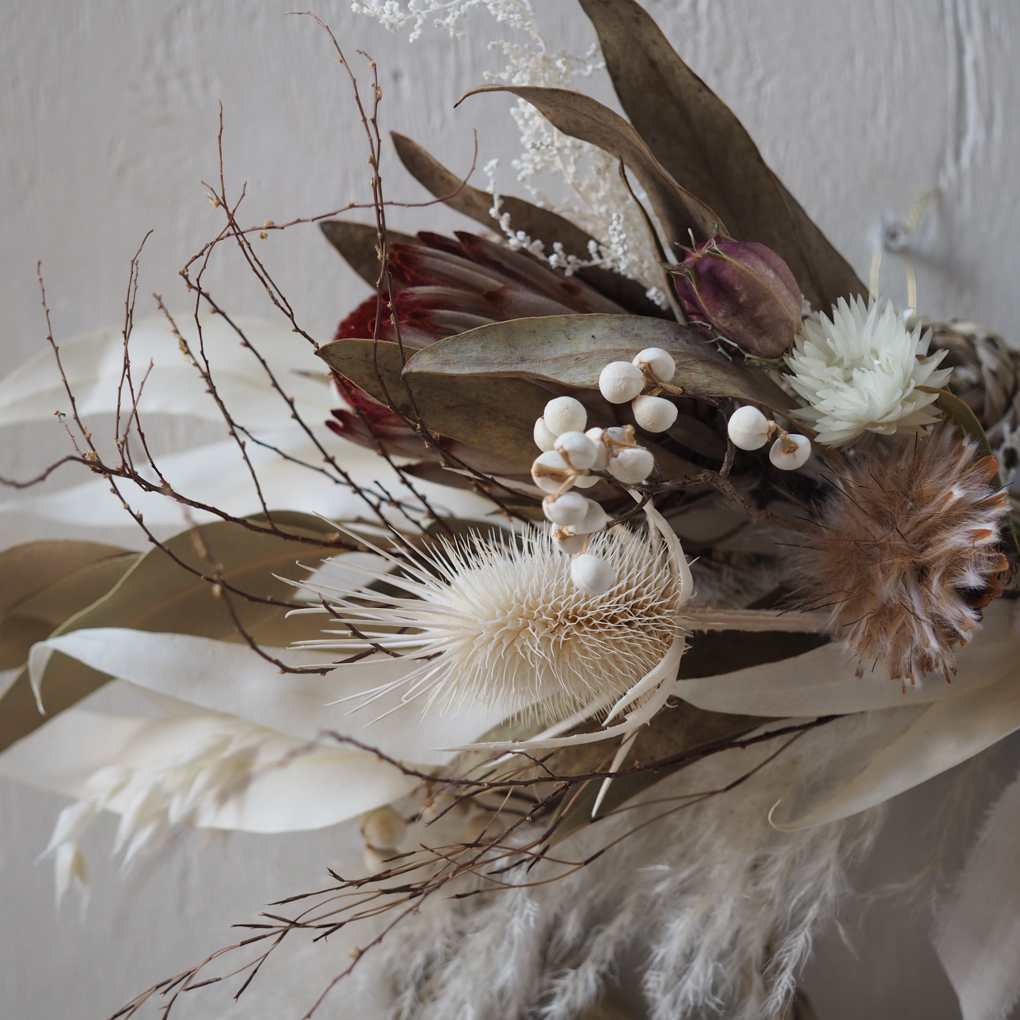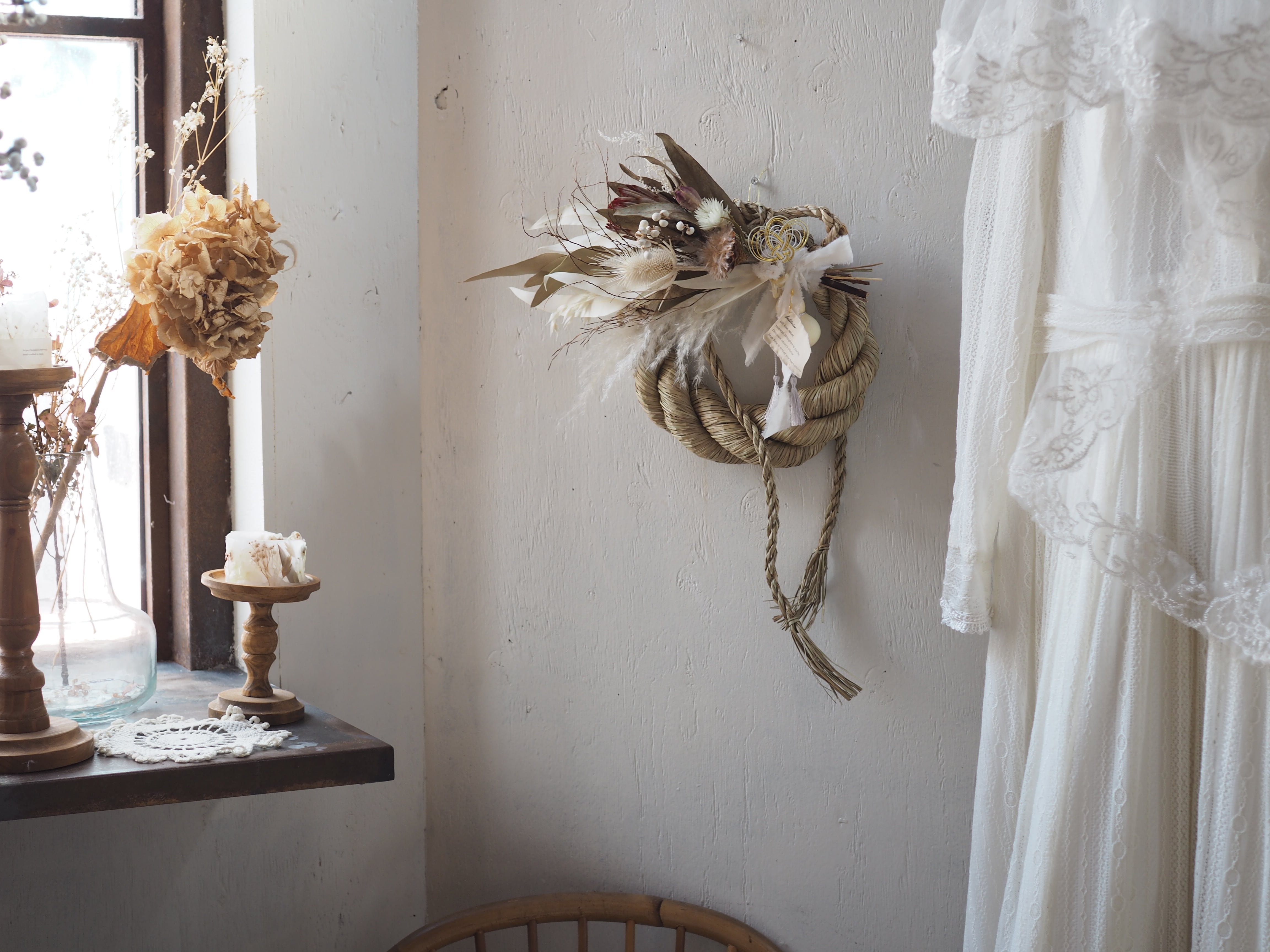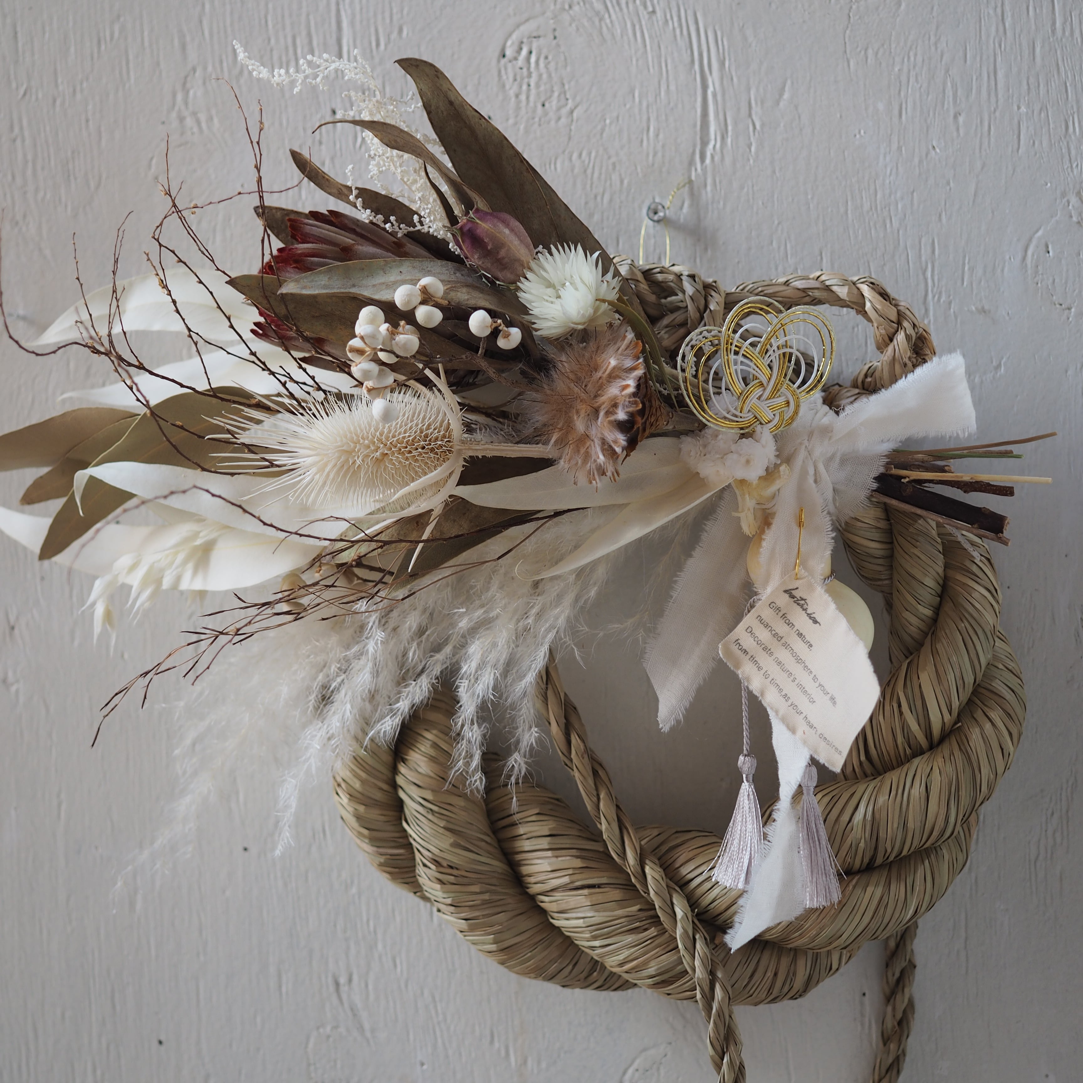 ナチュラルな素材を使った、個性溢れるデザインに仕上げた一点もののしめ飾り。