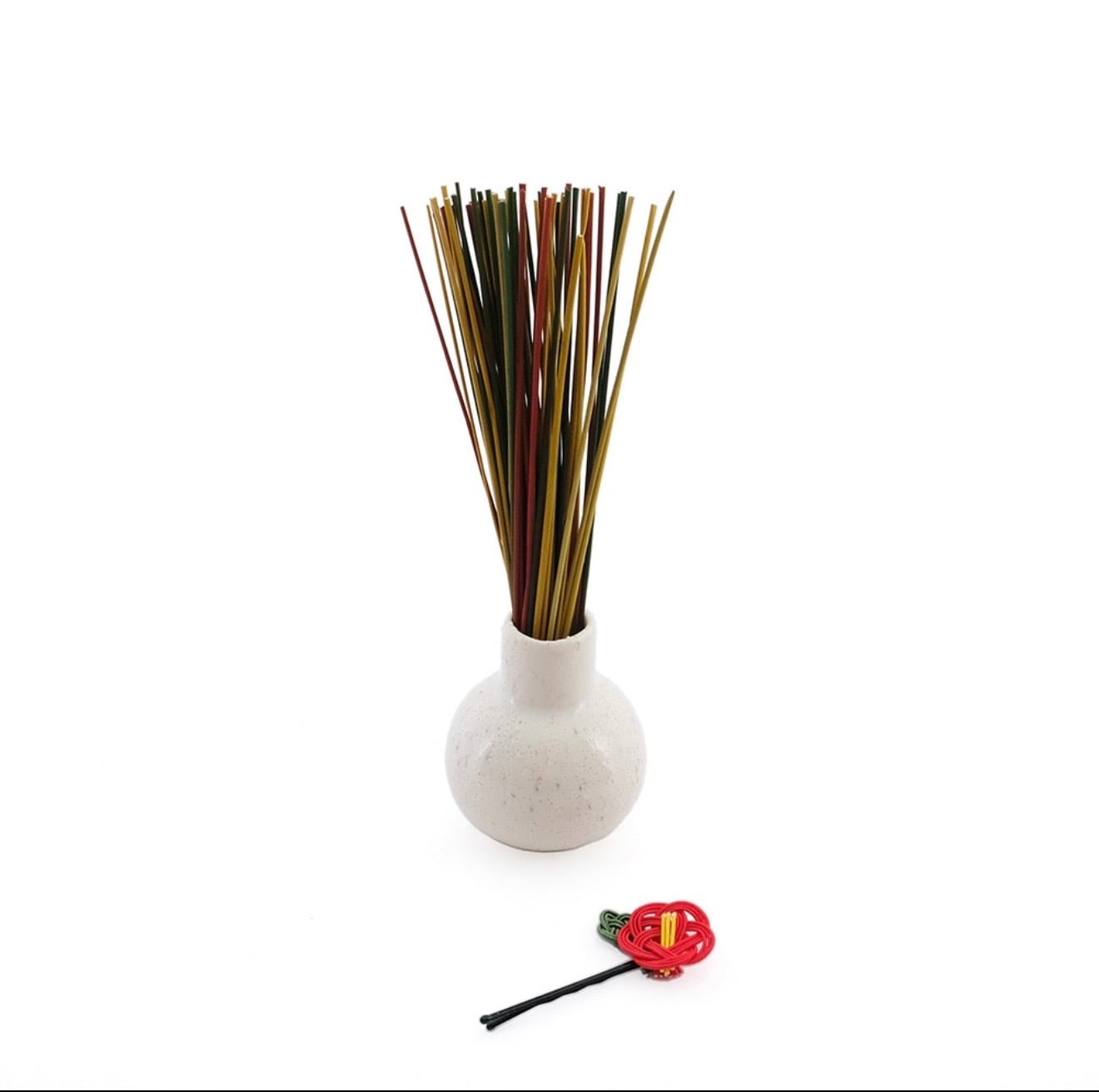 国内で生産される陶磁器のおよそ半数が美濃焼といわれている焼物の産地で作られた小さな花瓶とセットになったい草のお飾りです。