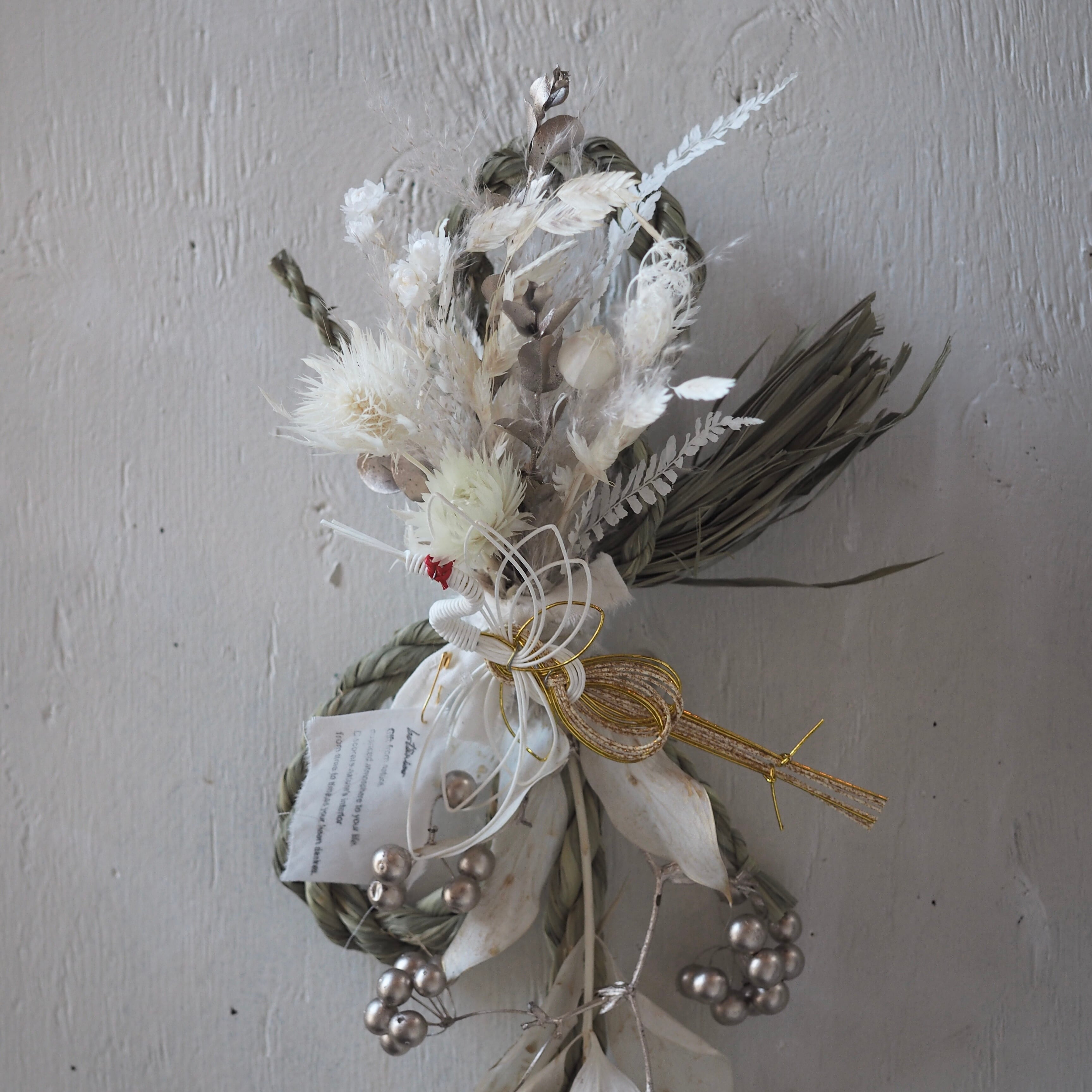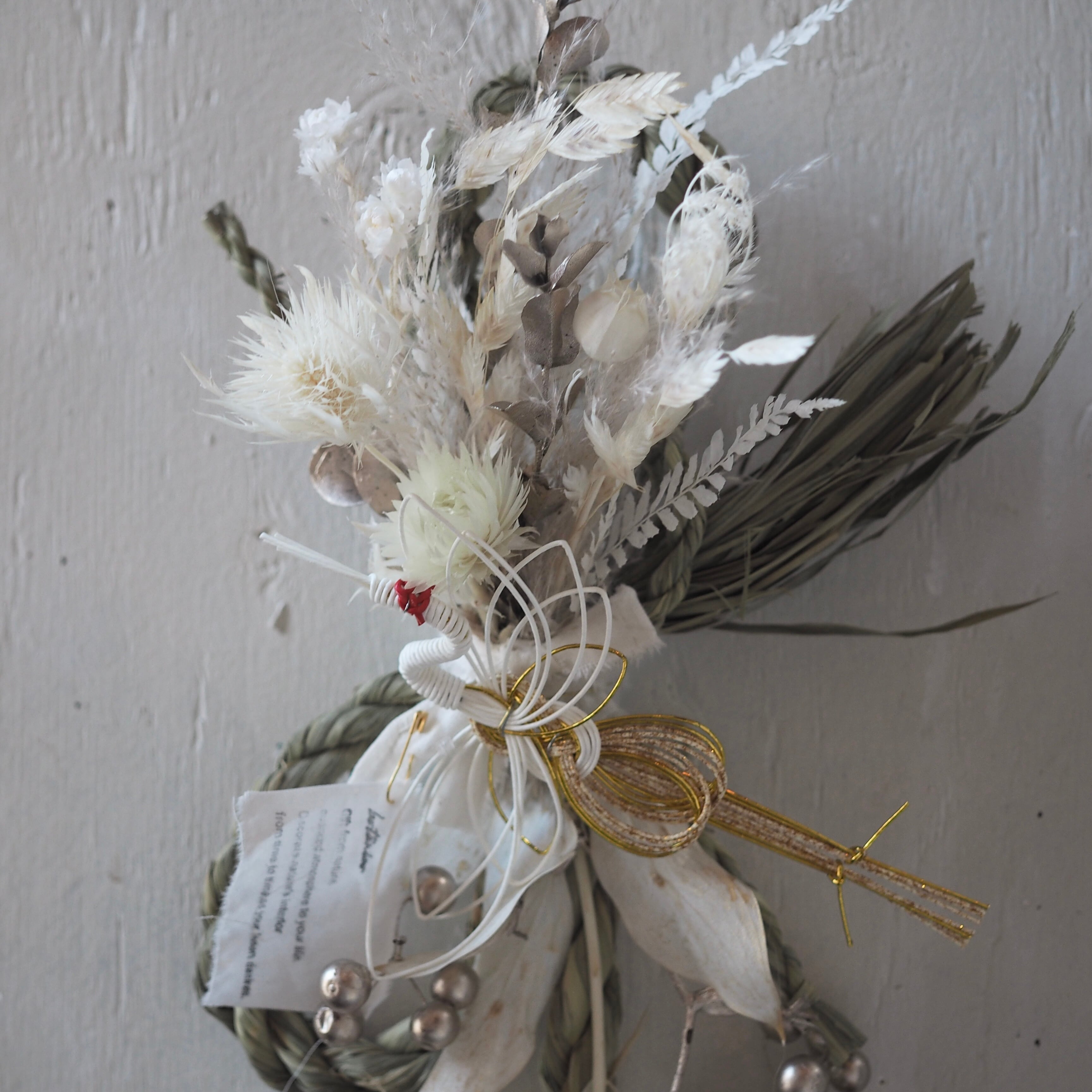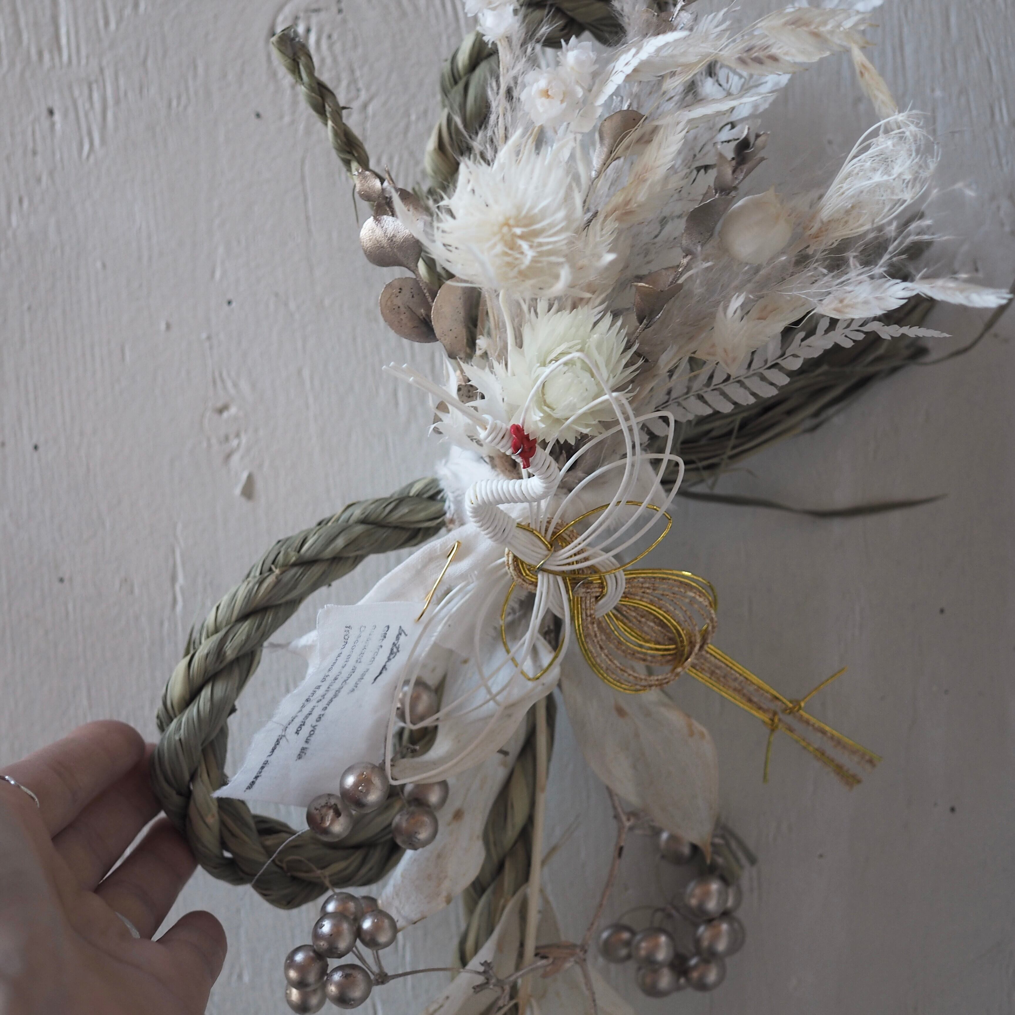 ナチュラルな素材を使った、個性溢れるデザインに仕上げた一点もののしめ飾り。