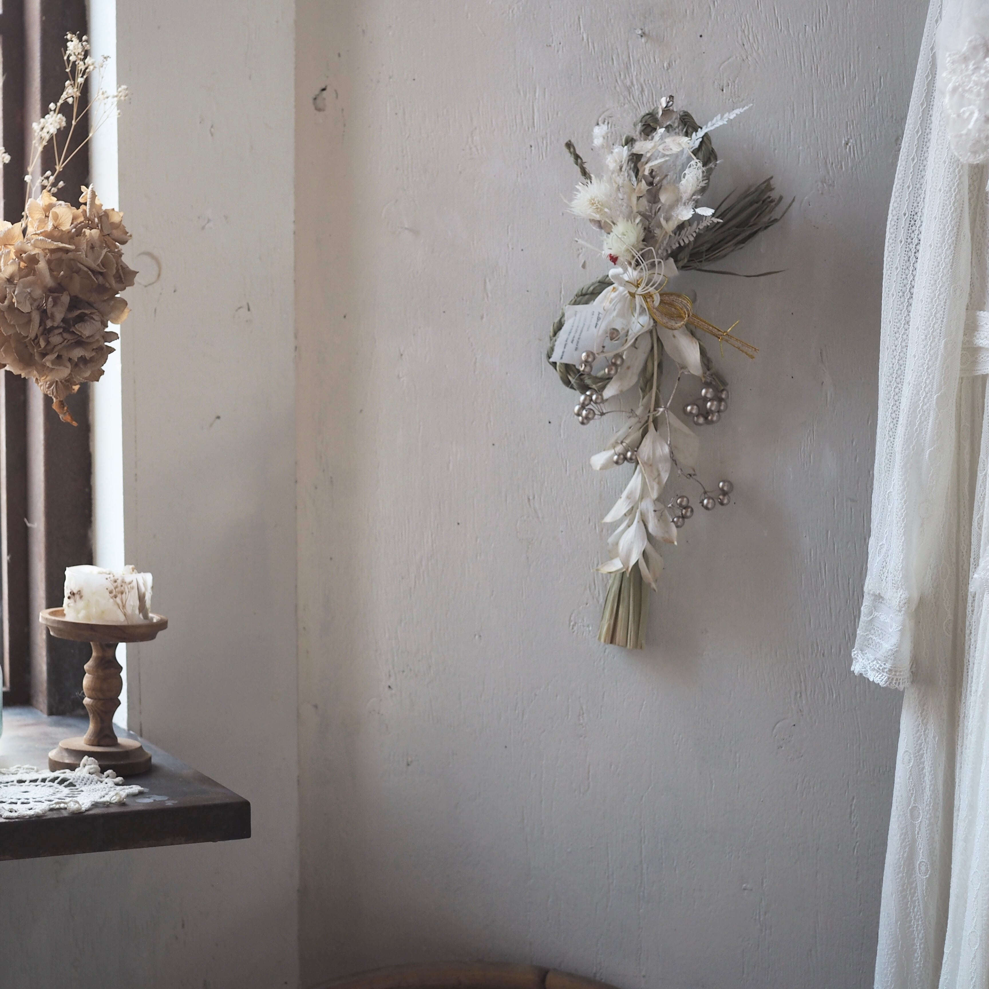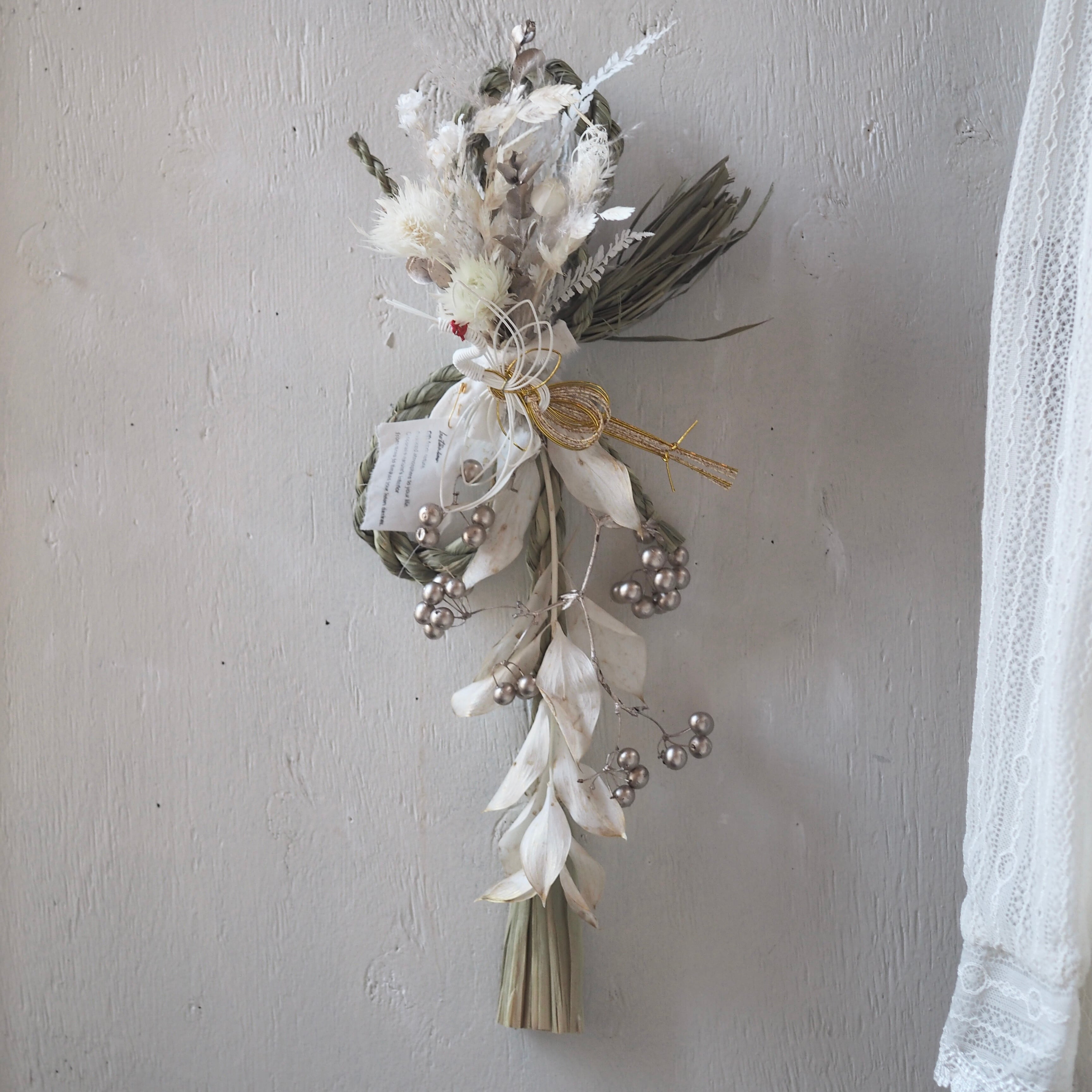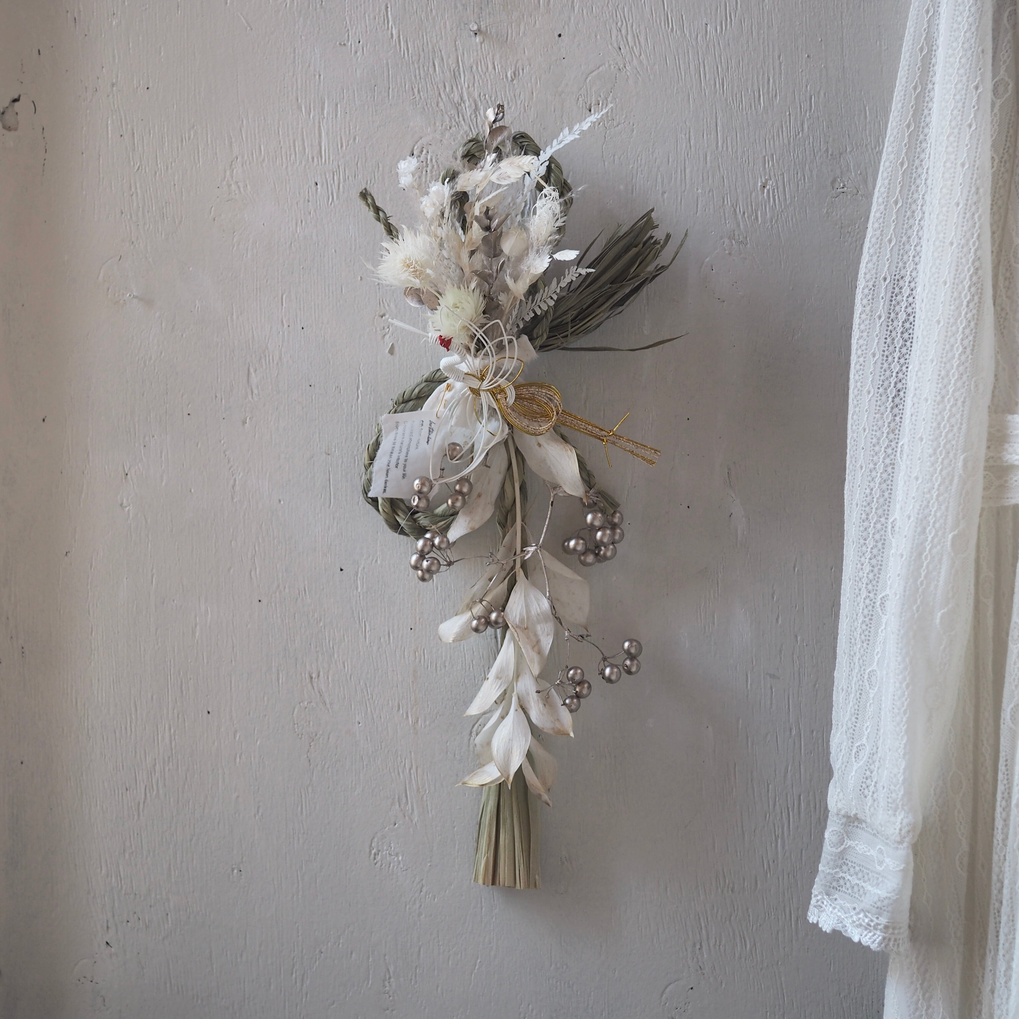 ナチュラルな素材を使った、個性溢れるデザインに仕上げた一点もののしめ飾り。