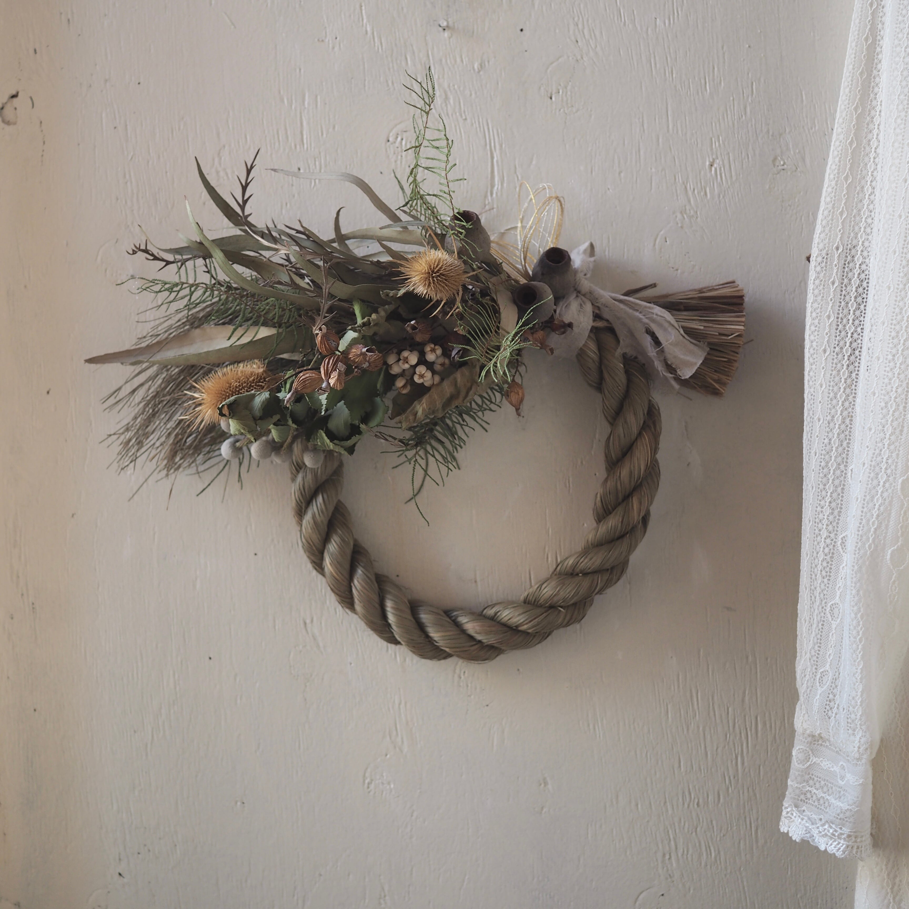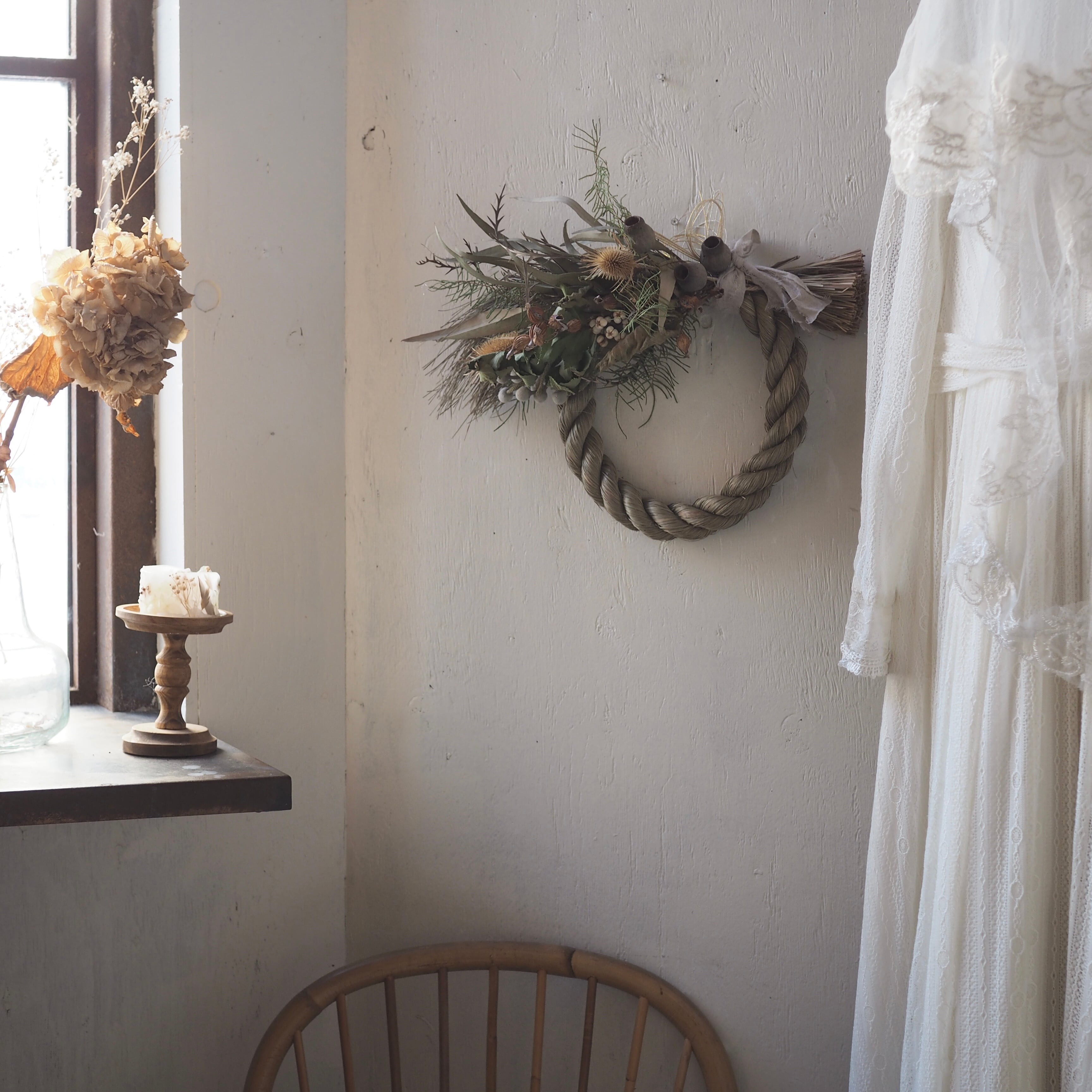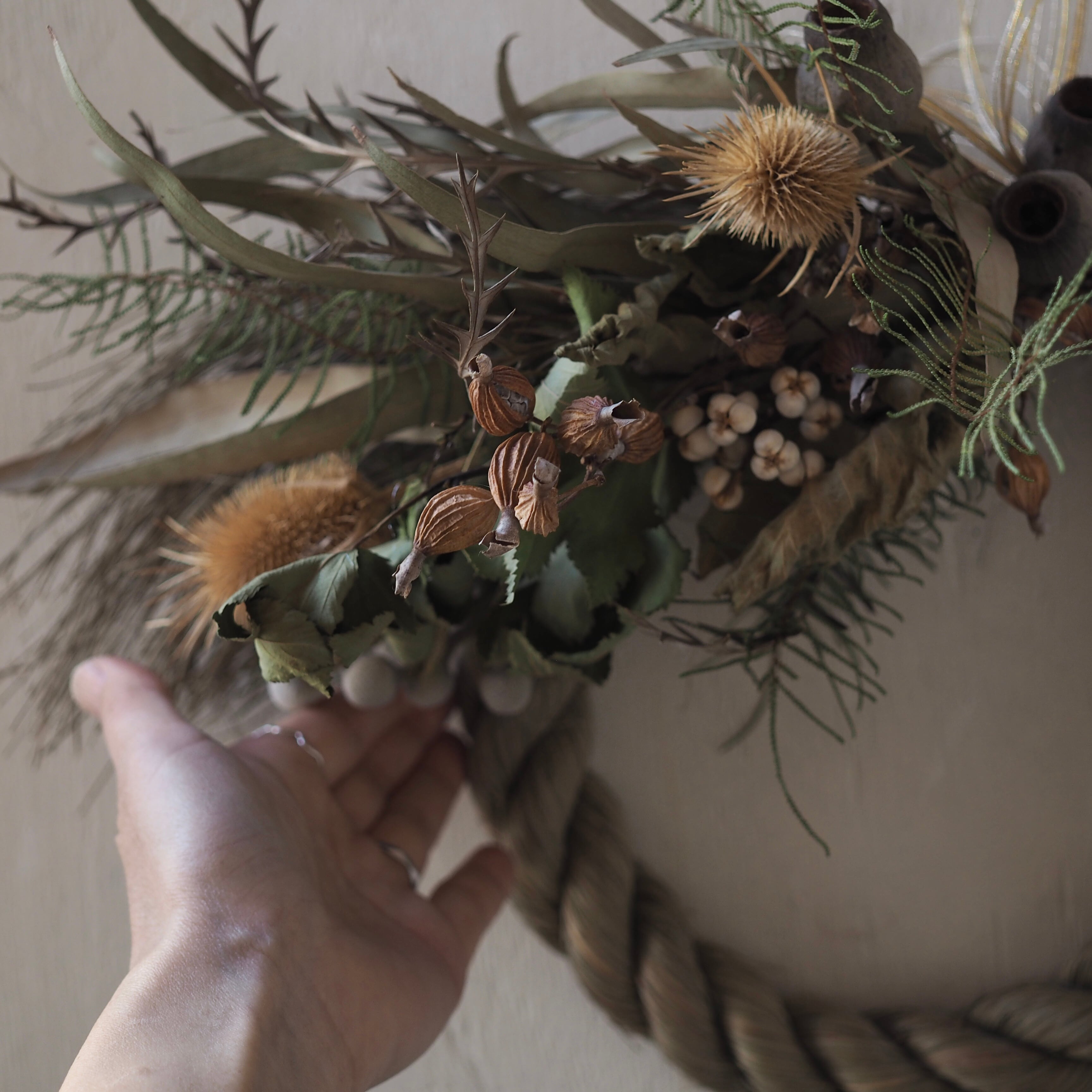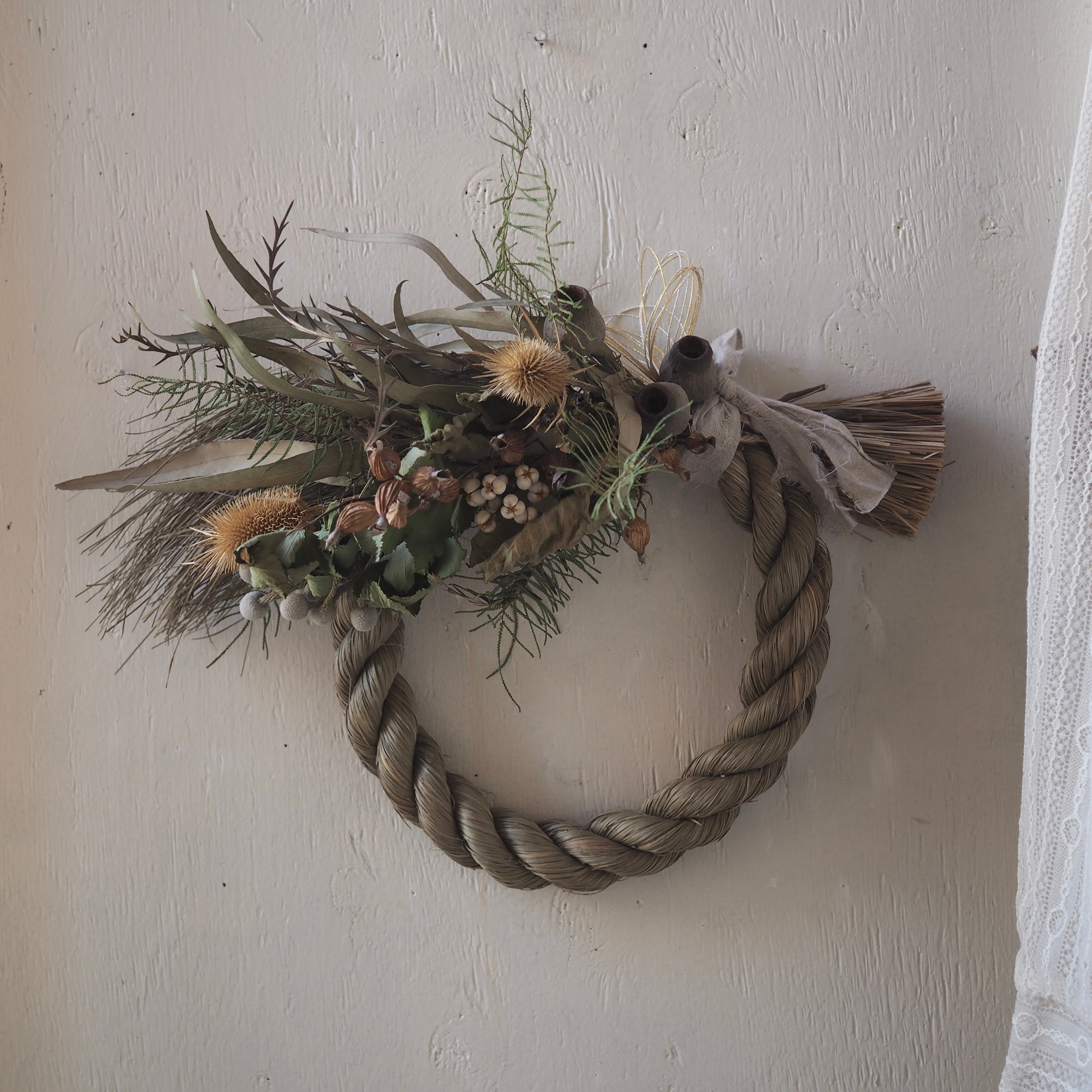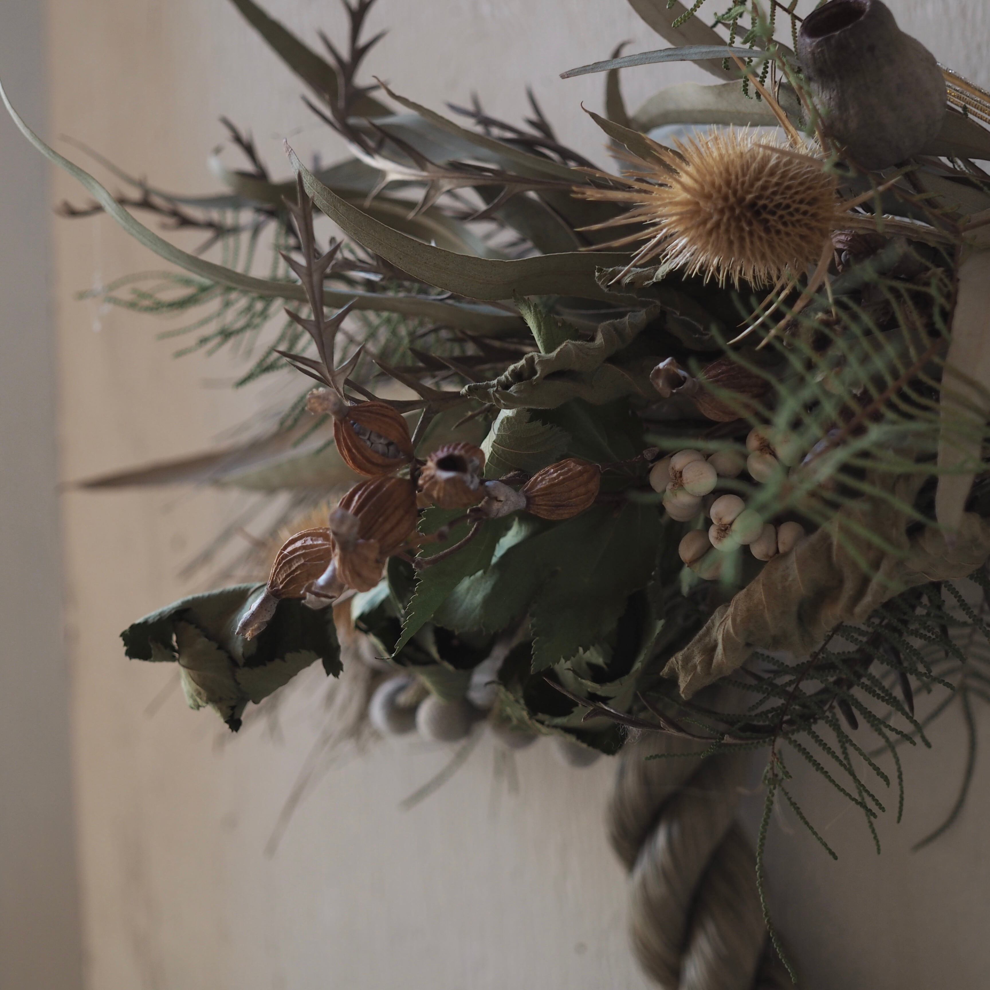 ナチュラルな素材を使った、個性溢れるデザインに仕上げた一点もののしめ飾り。
