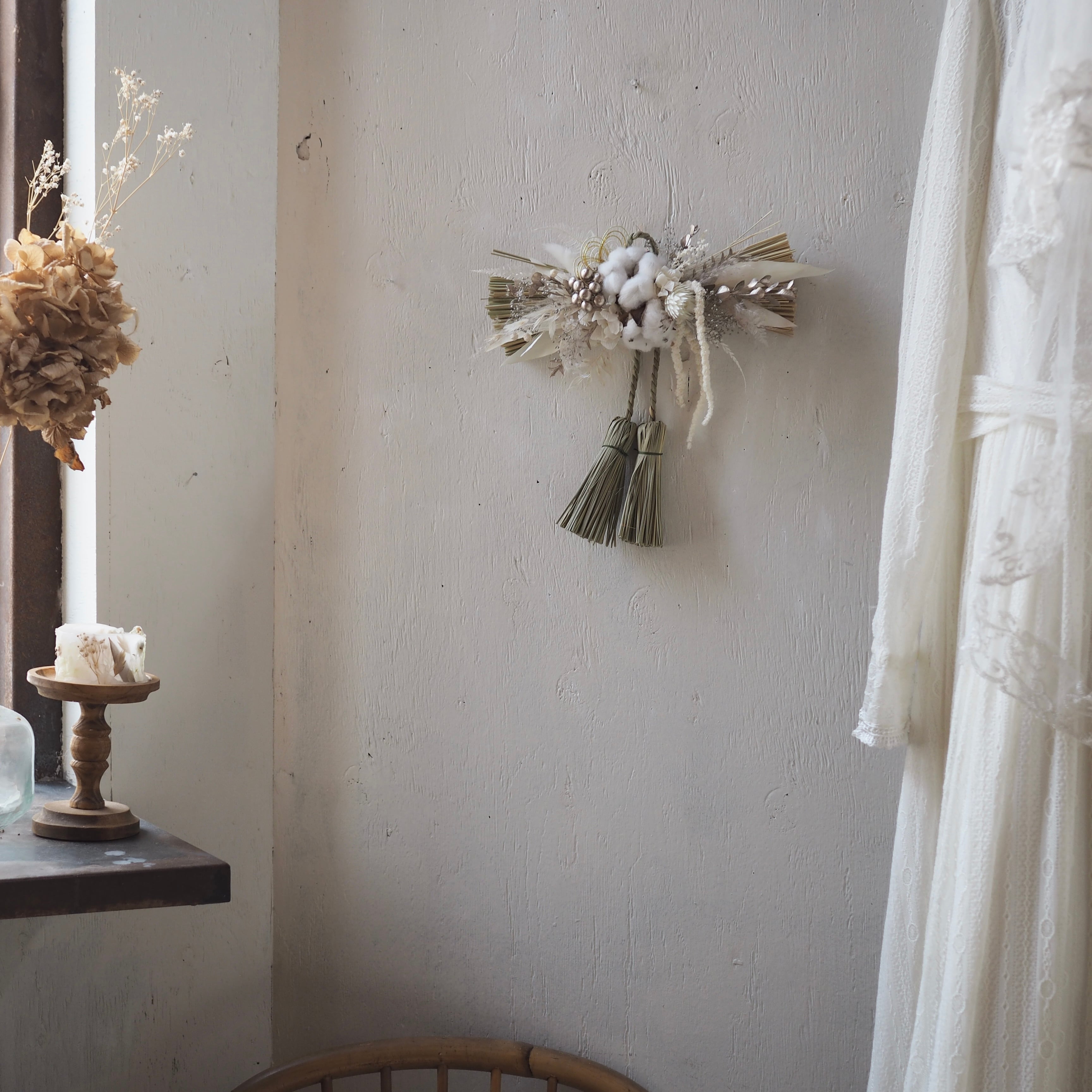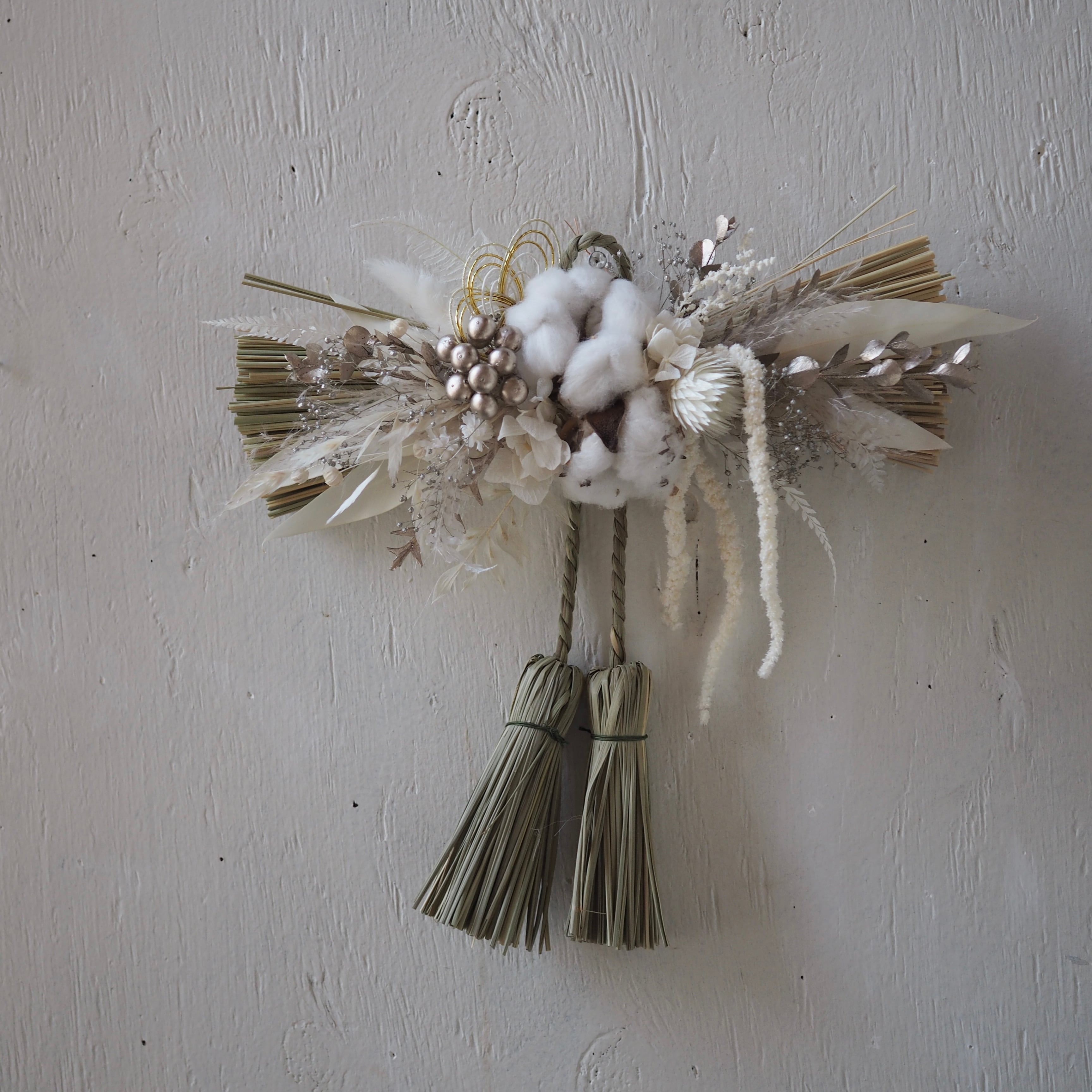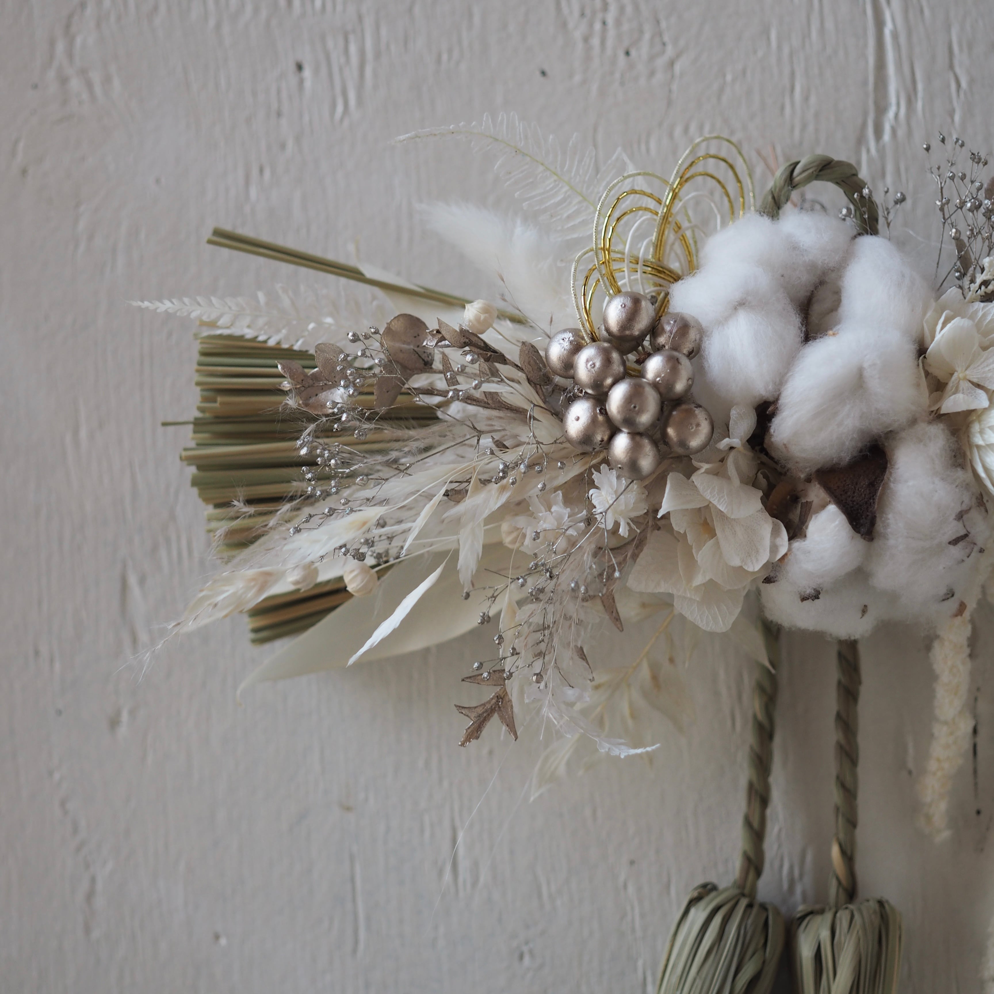 ナチュラルな素材を使った、個性溢れるデザインに仕上げた一点もののしめ飾り。