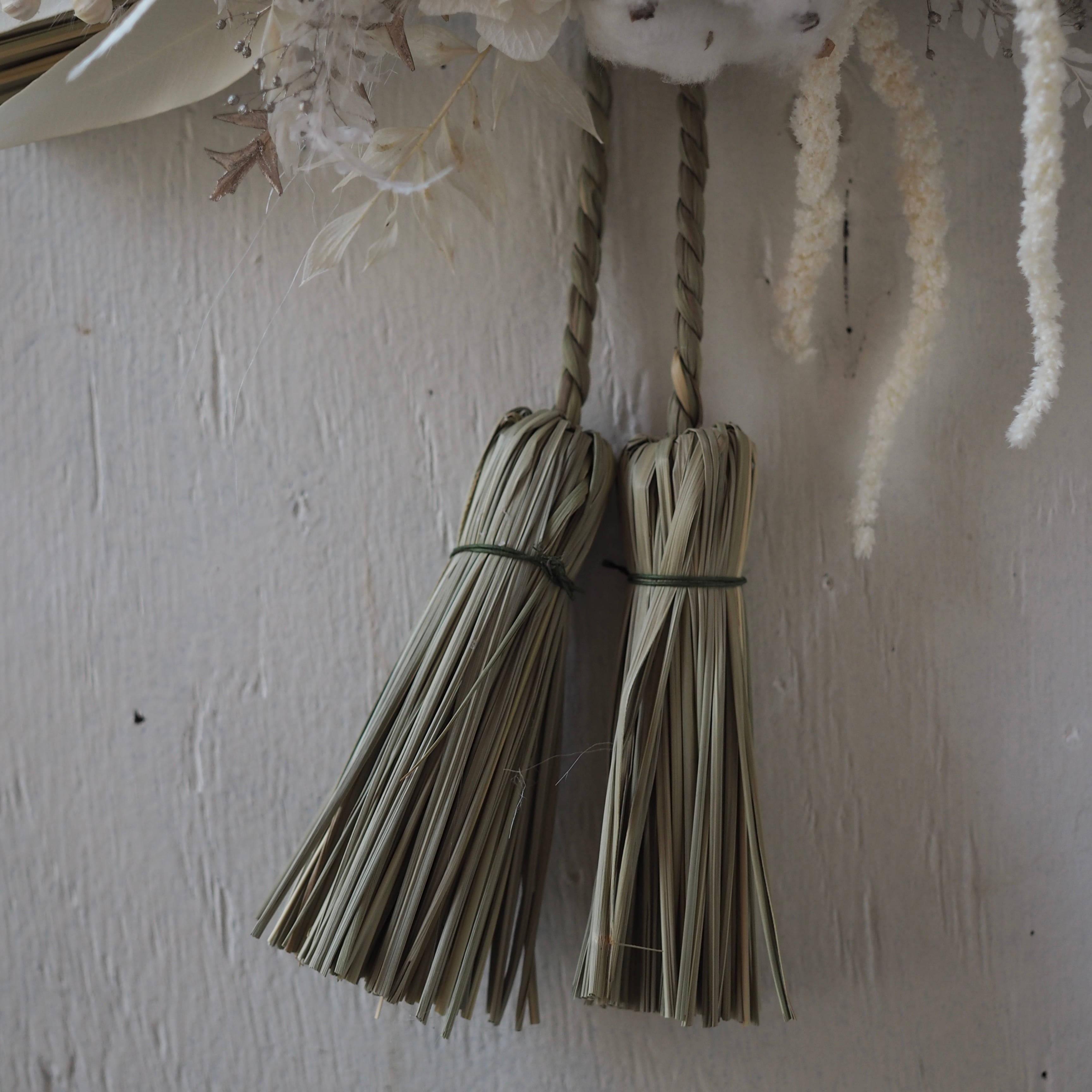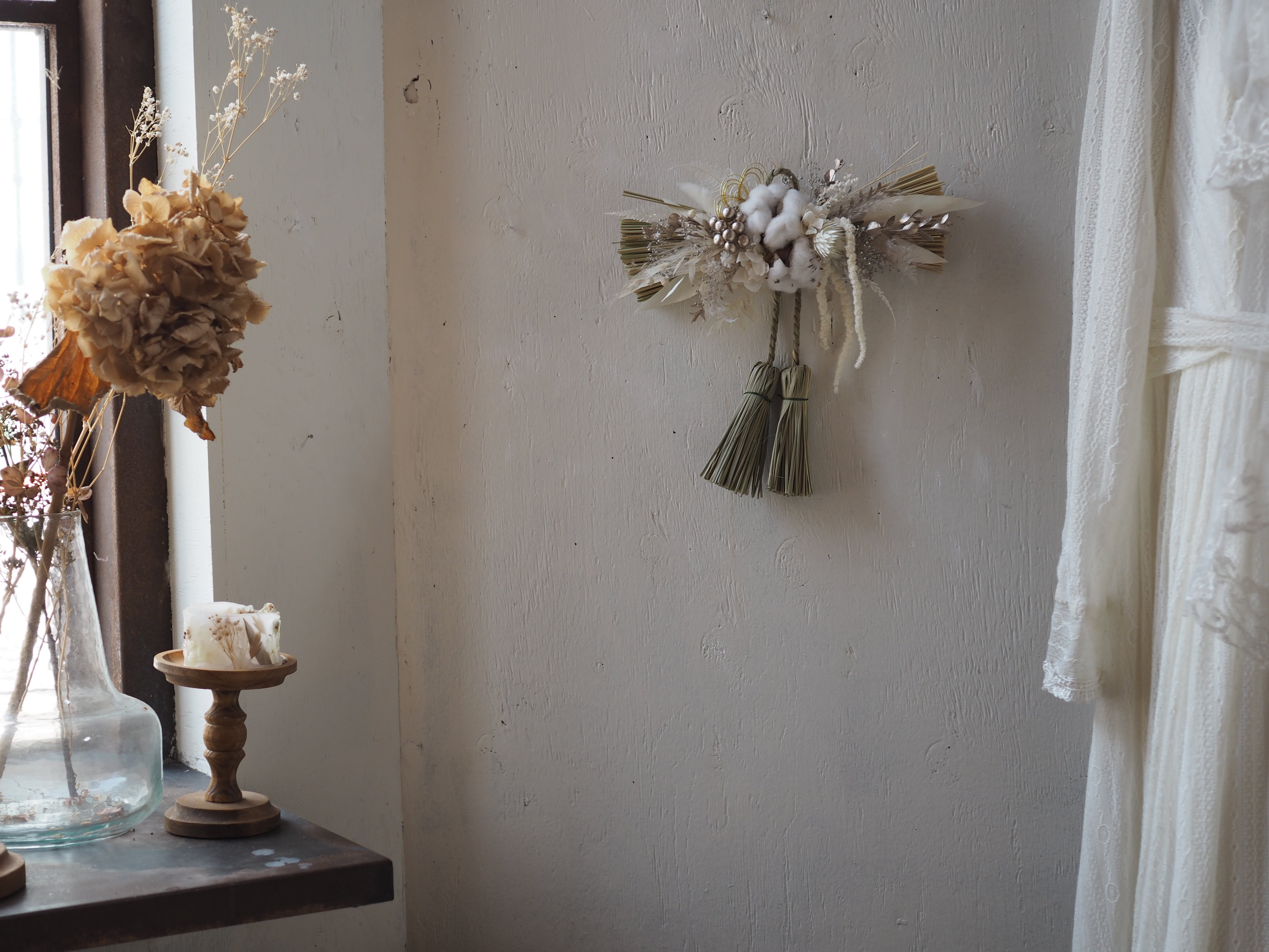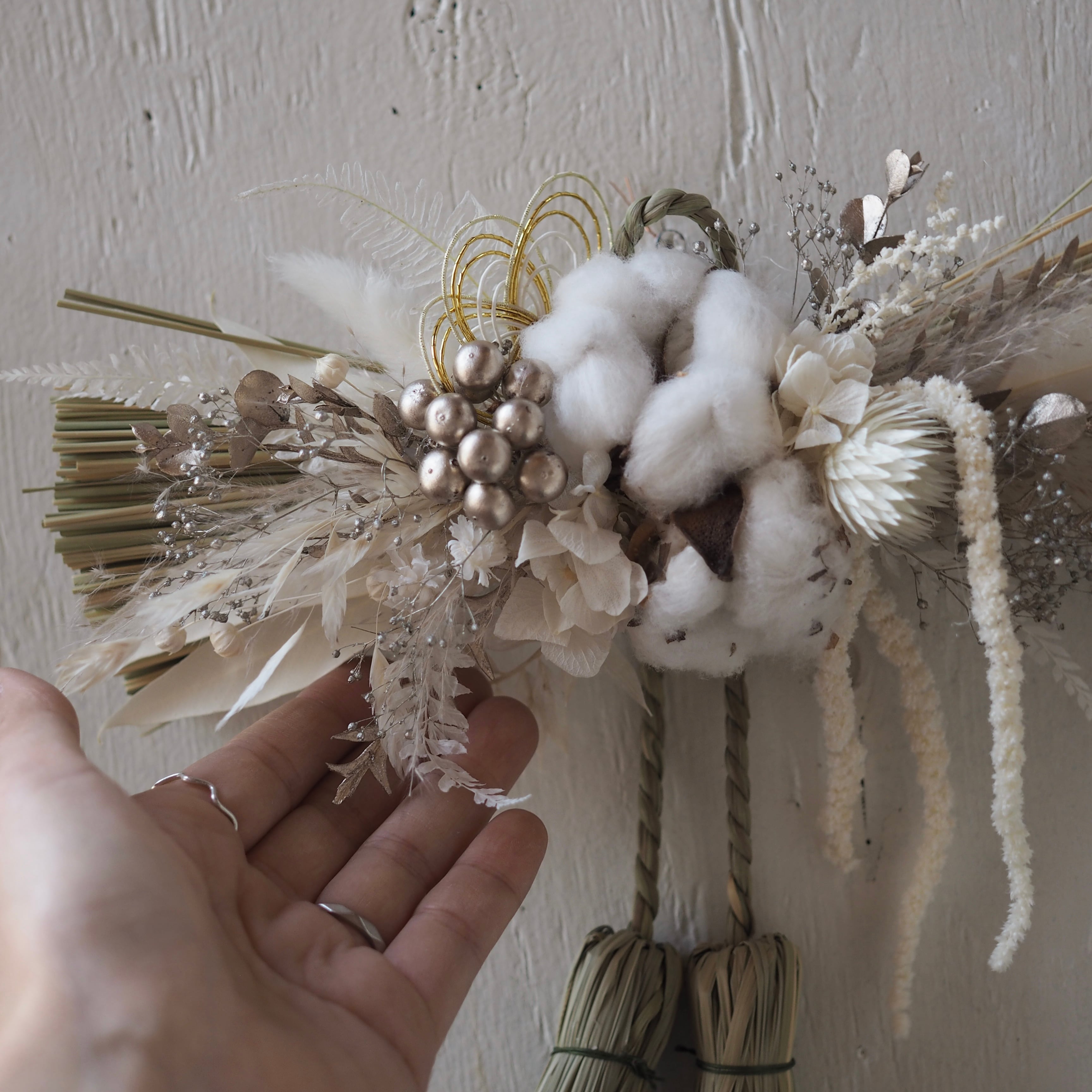 ナチュラルな素材を使った、個性溢れるデザインに仕上げた一点もののしめ飾り。