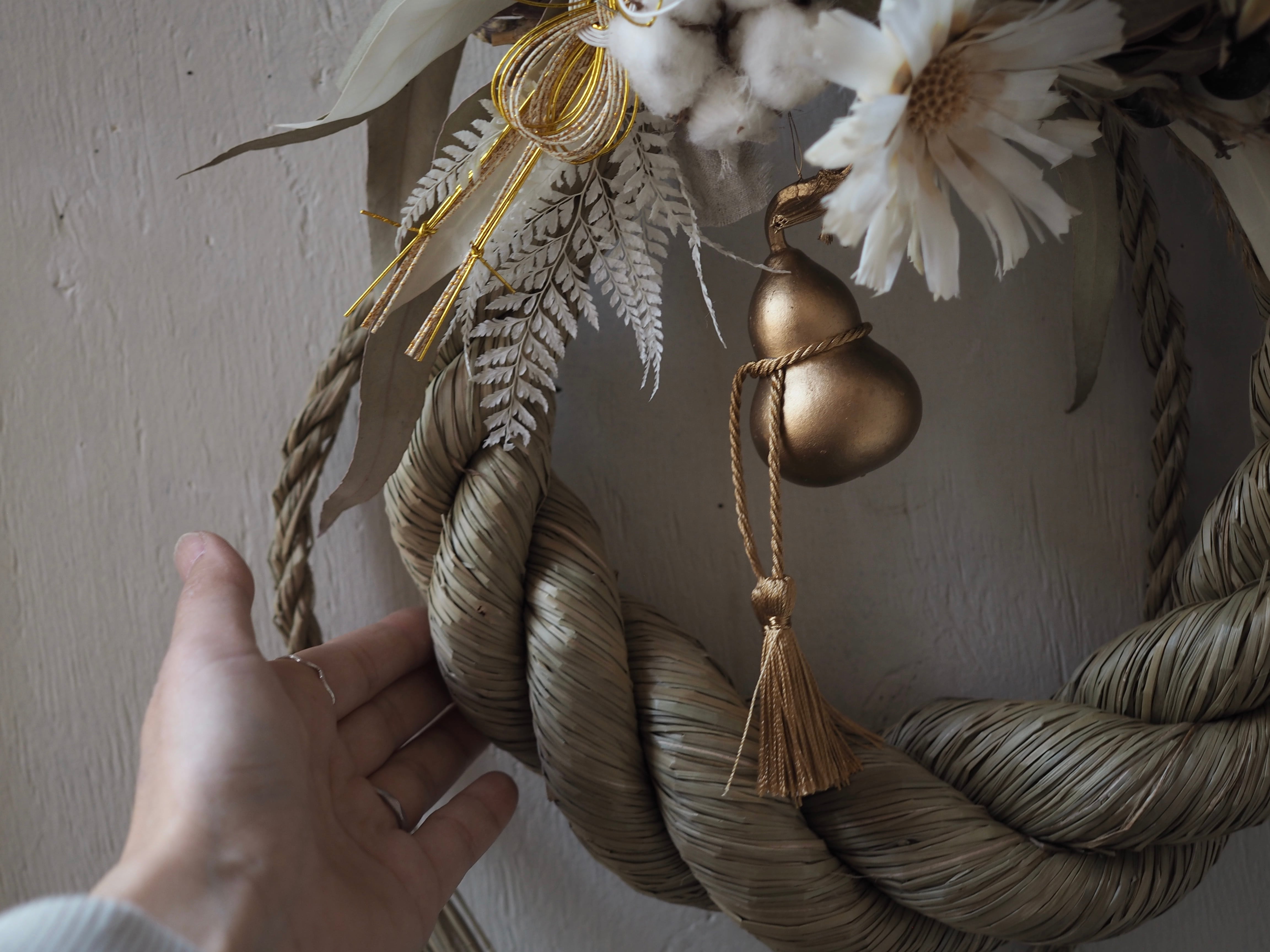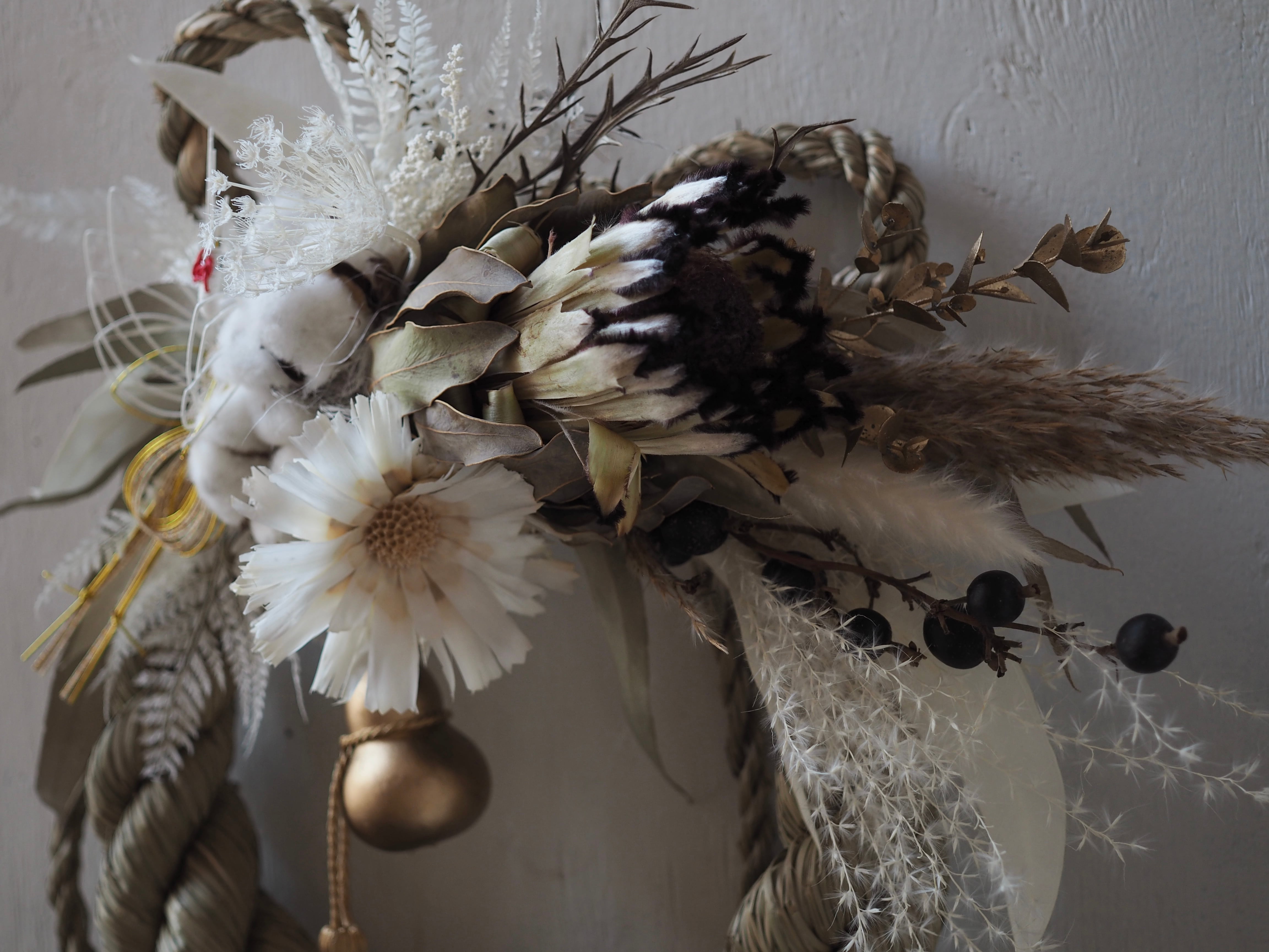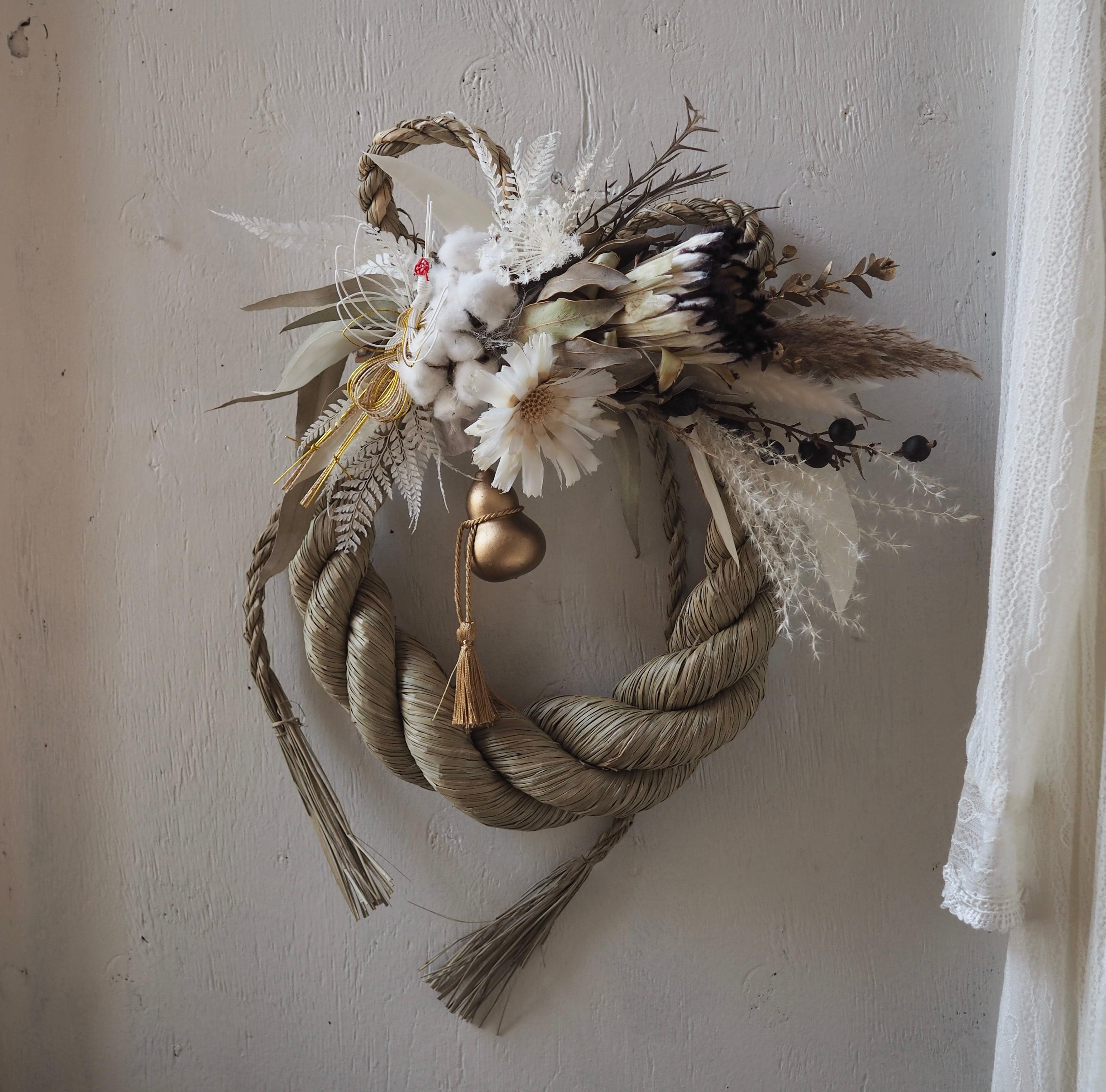 ナチュラルな素材を使った、個性溢れるデザインに仕上げた一点もののしめ飾り。