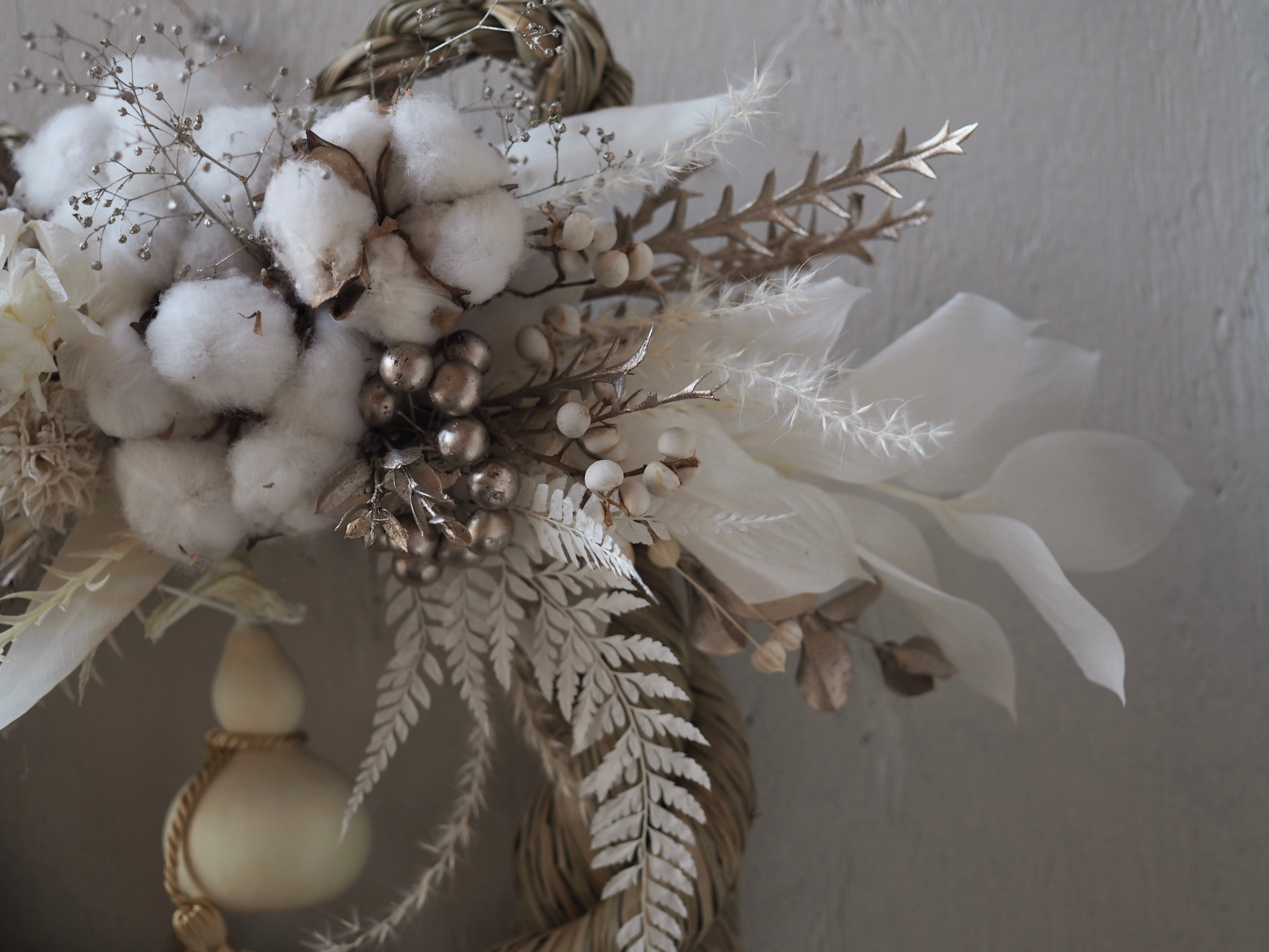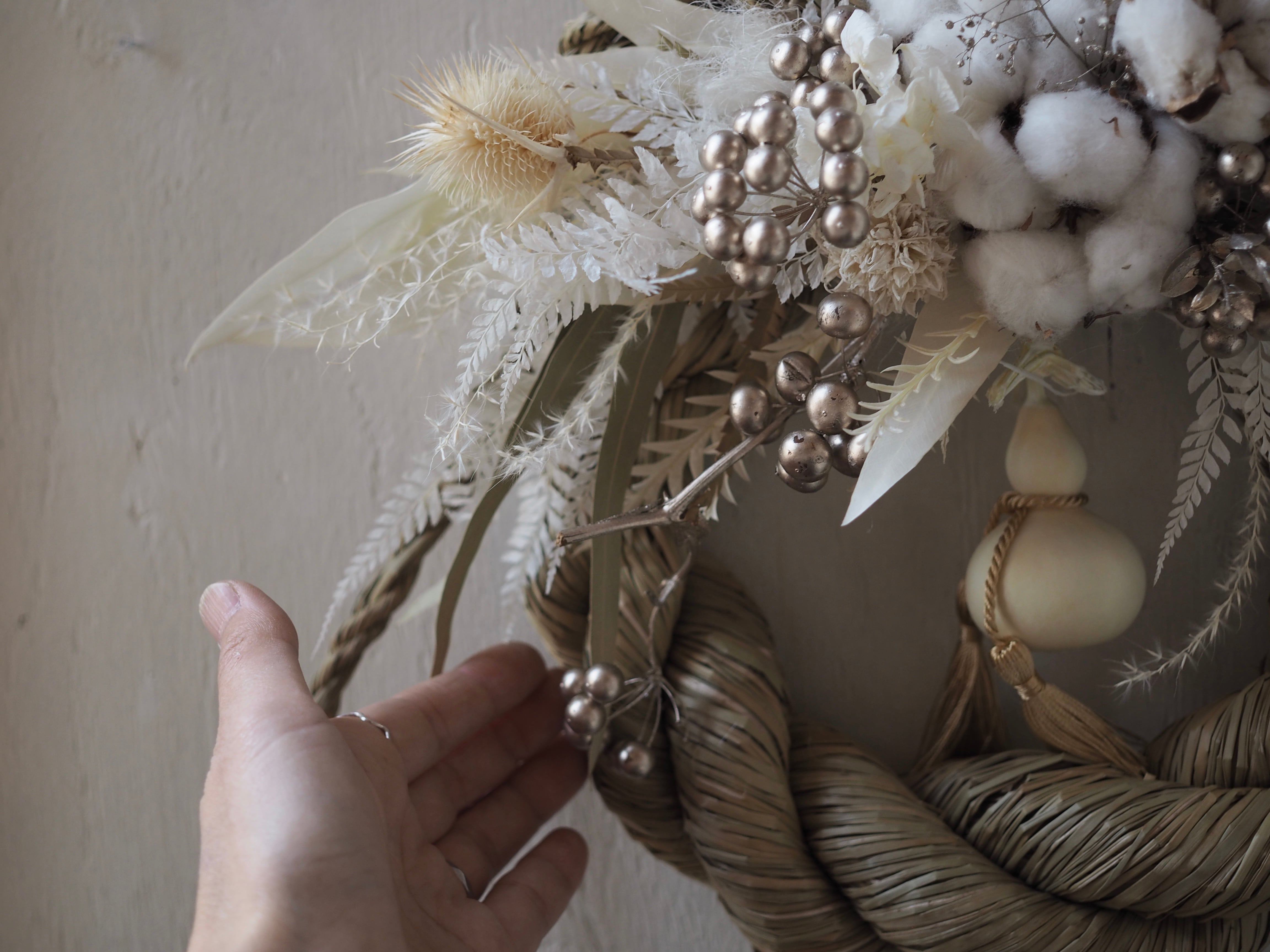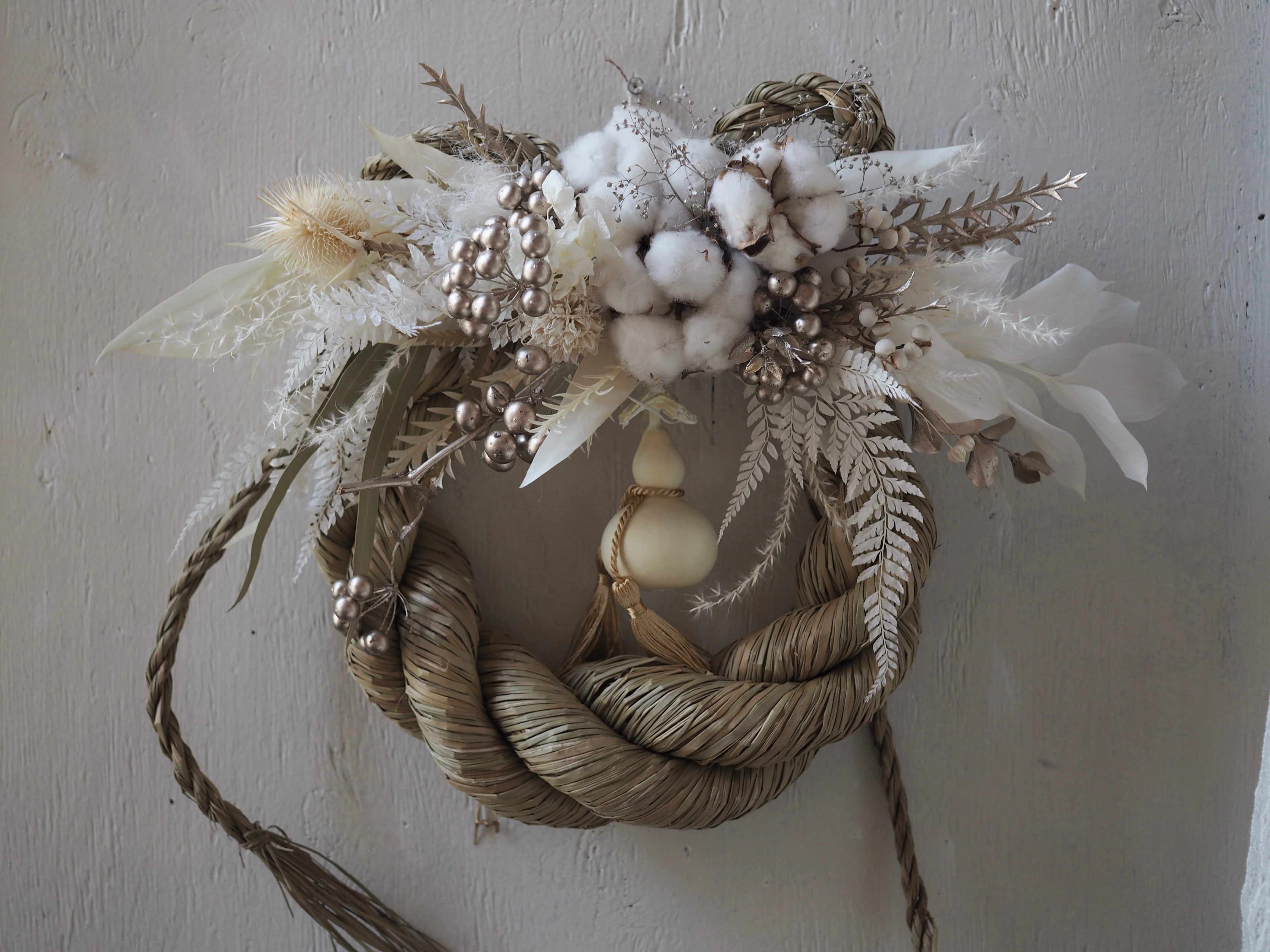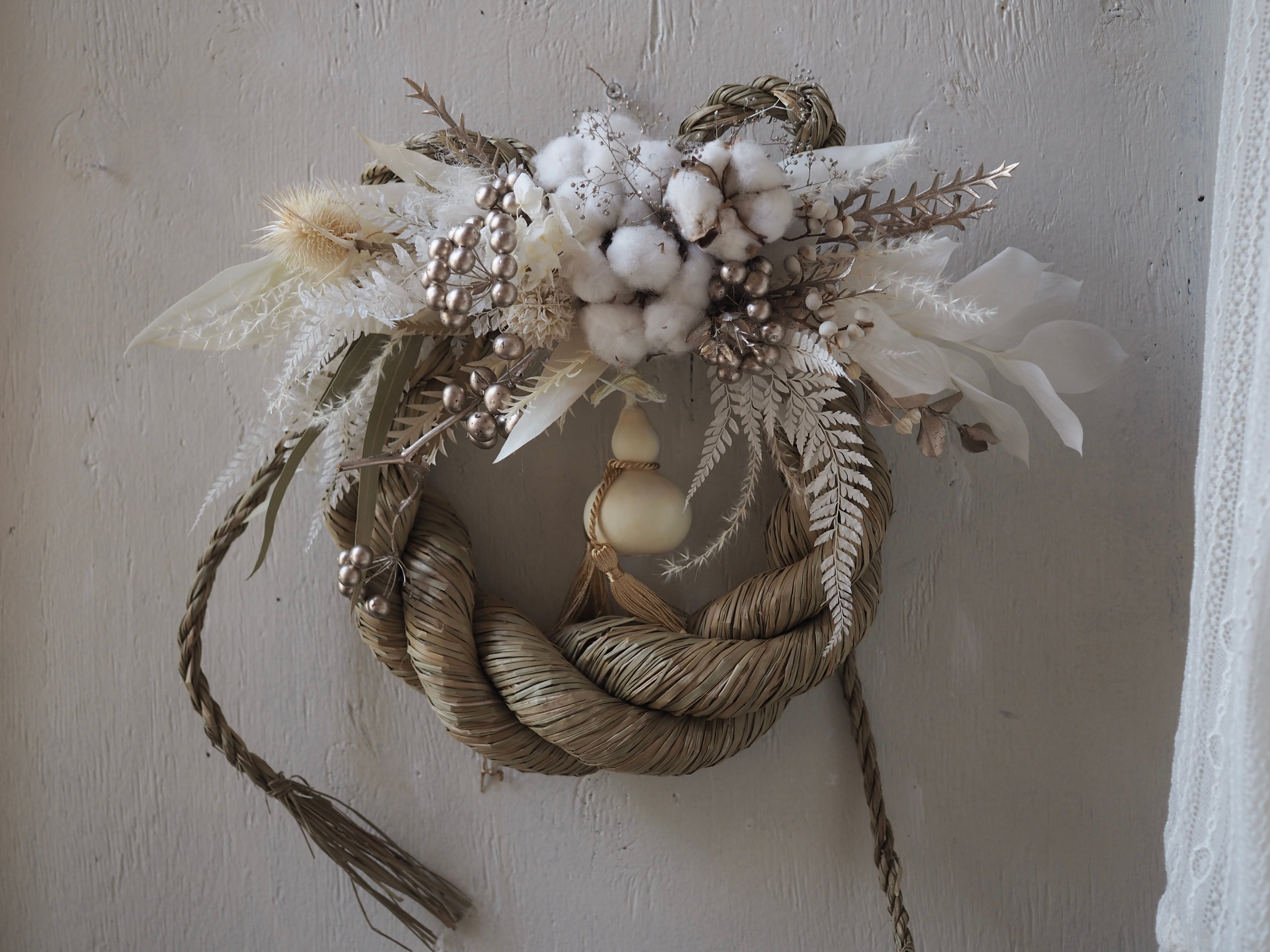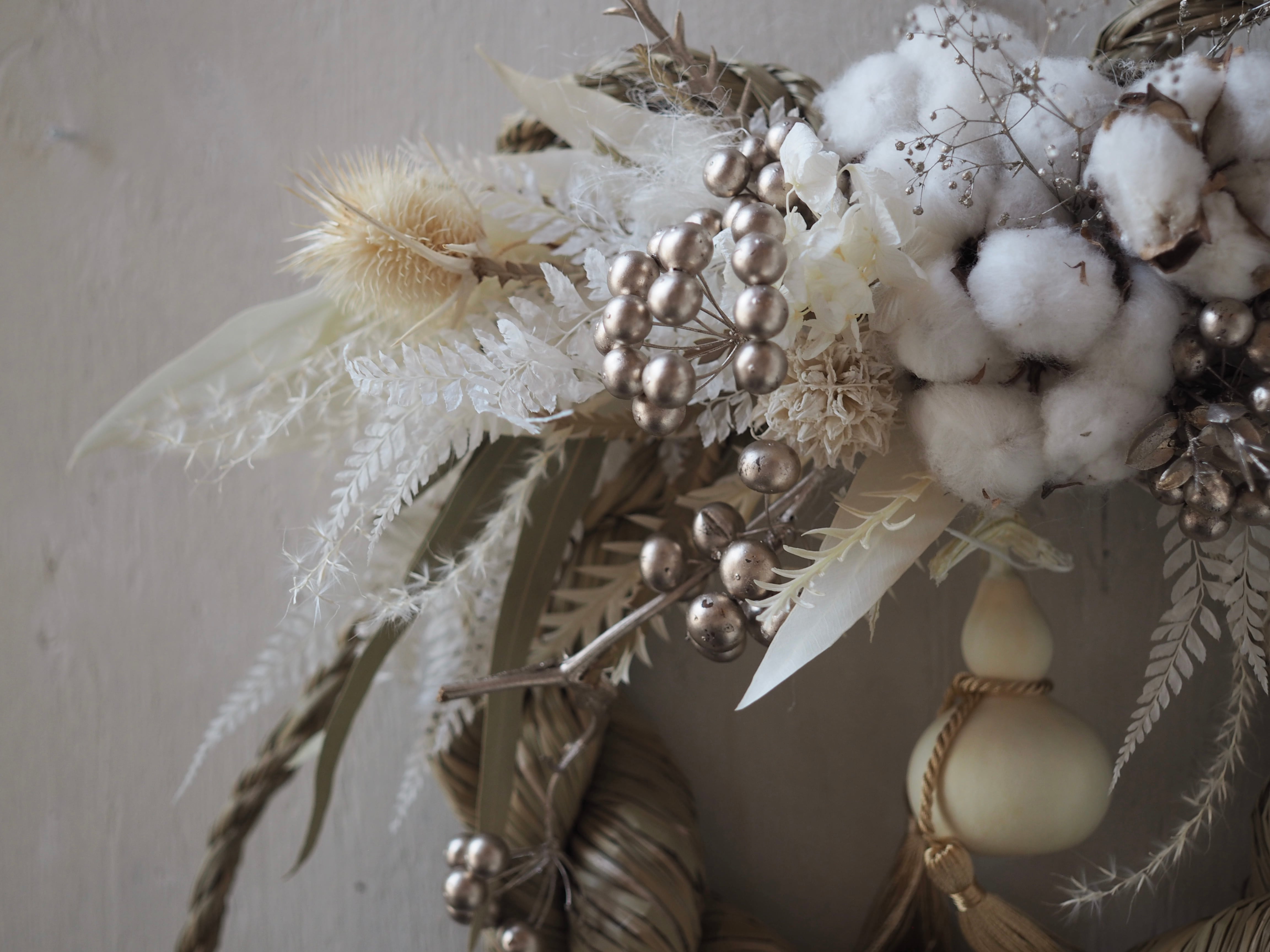ナチュラルな素材を使った、個性溢れるデザインに仕上げた一点もののしめ飾り。