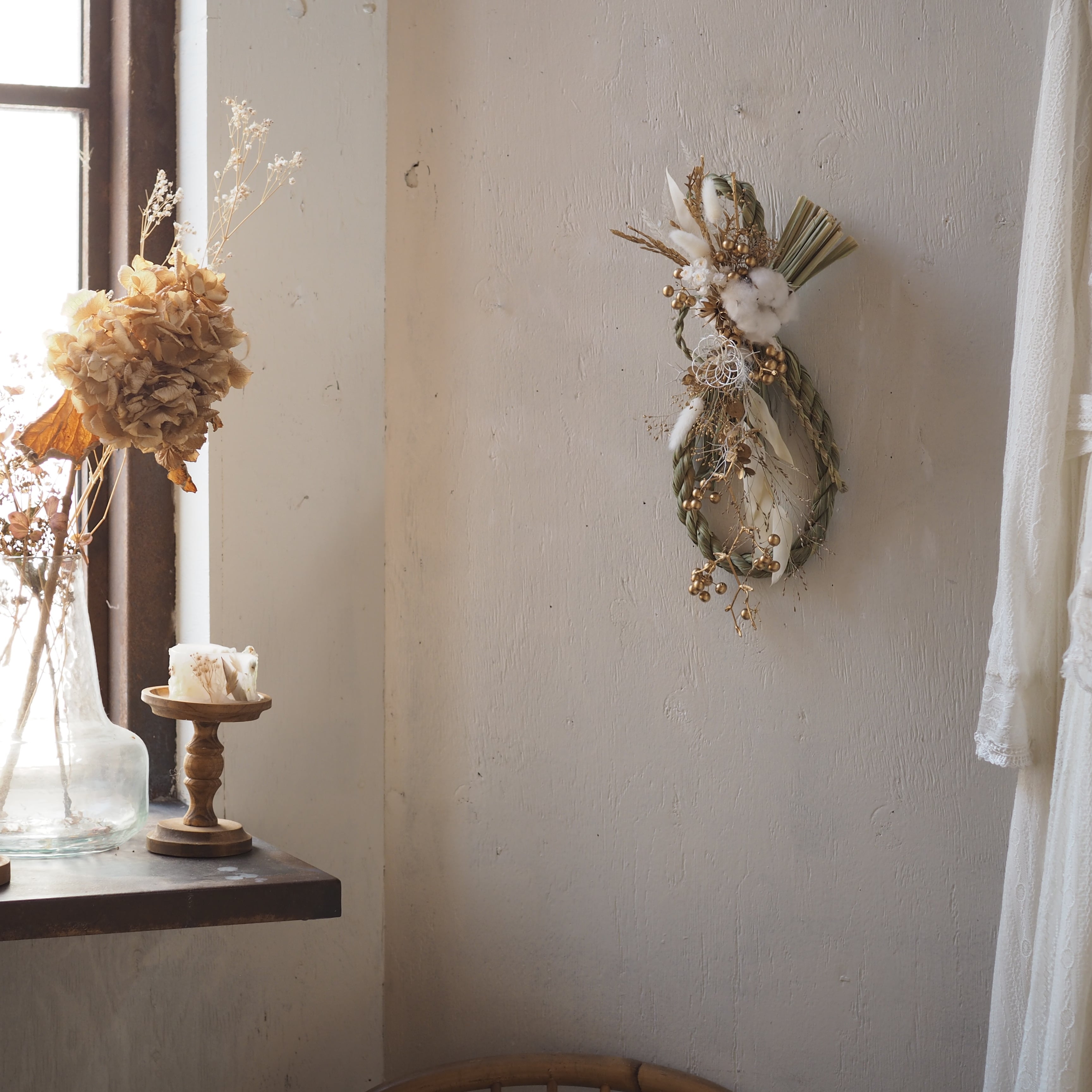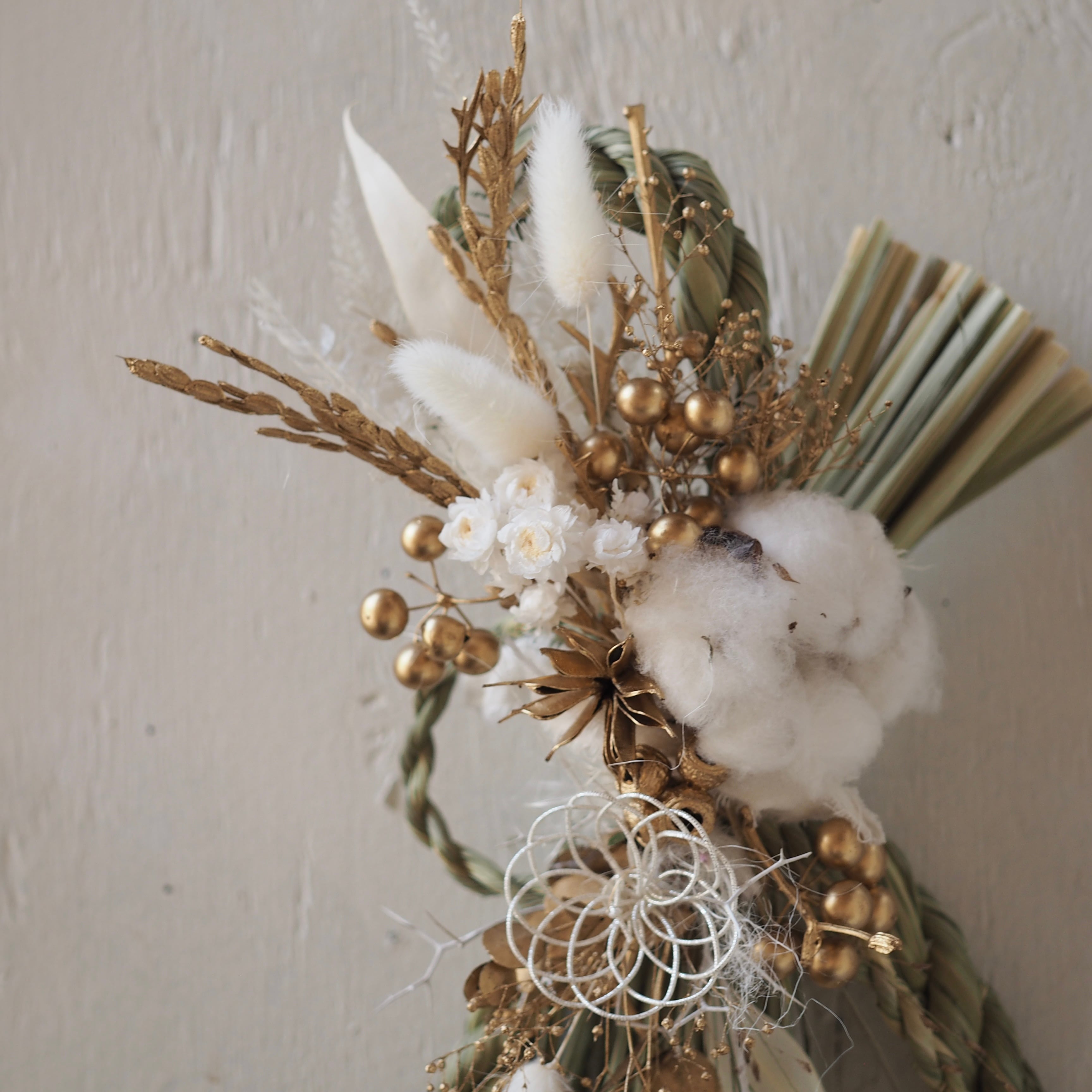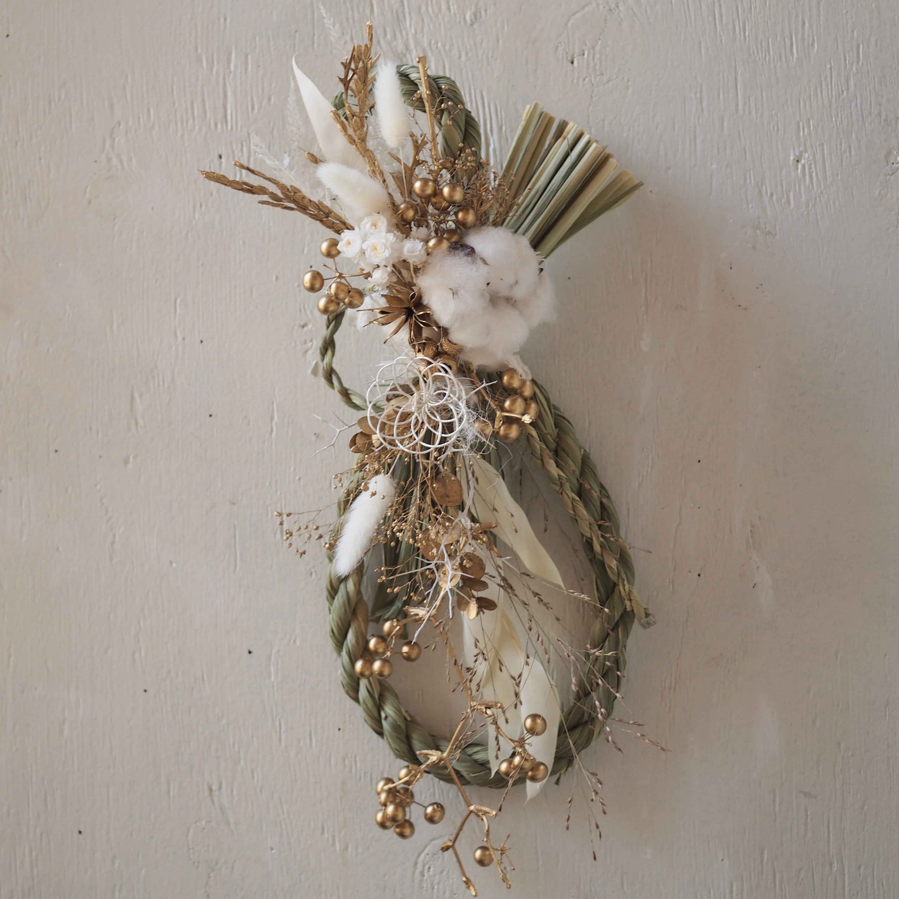 ナチュラルな素材を使った、個性溢れるデザインに仕上げた一点もののしめ飾り。