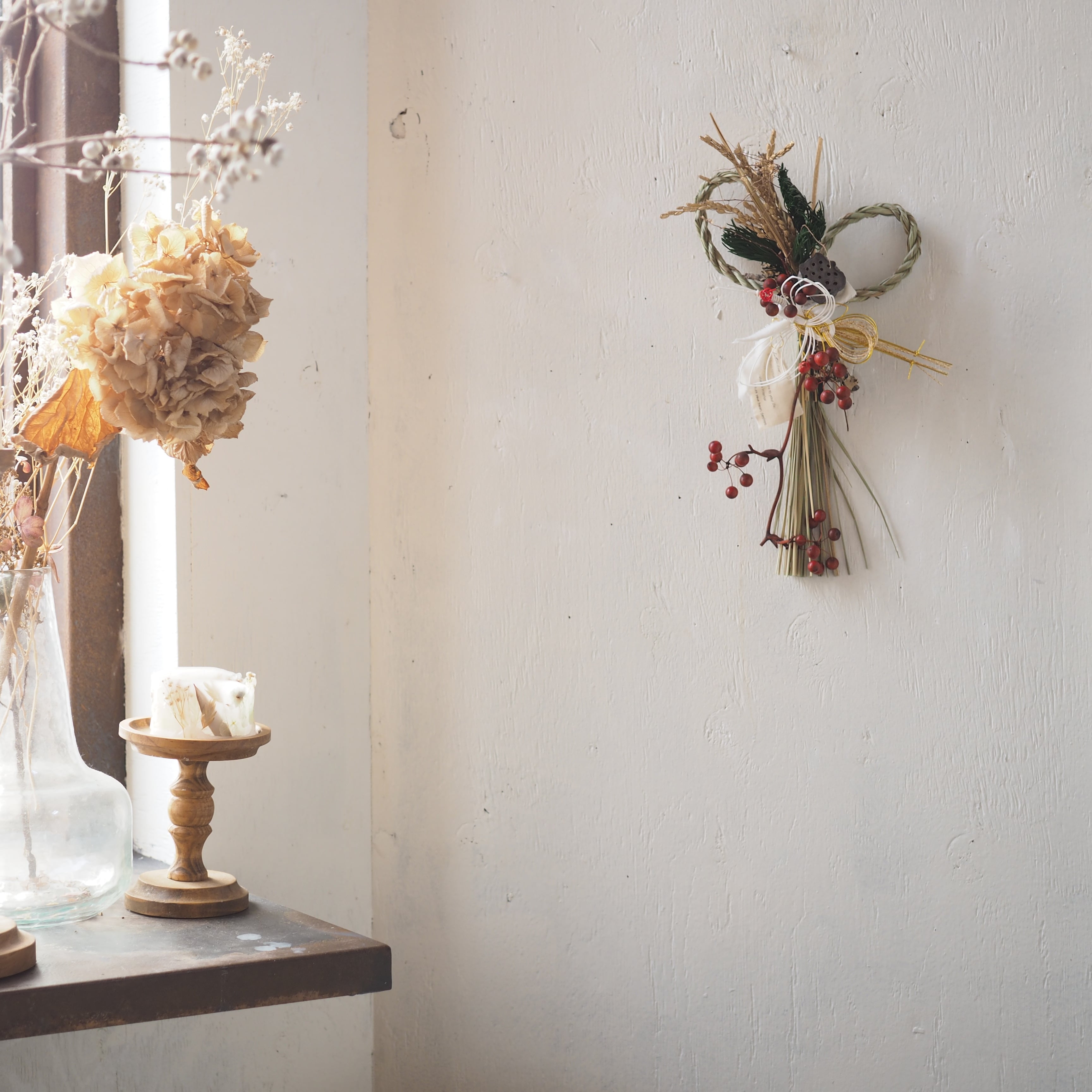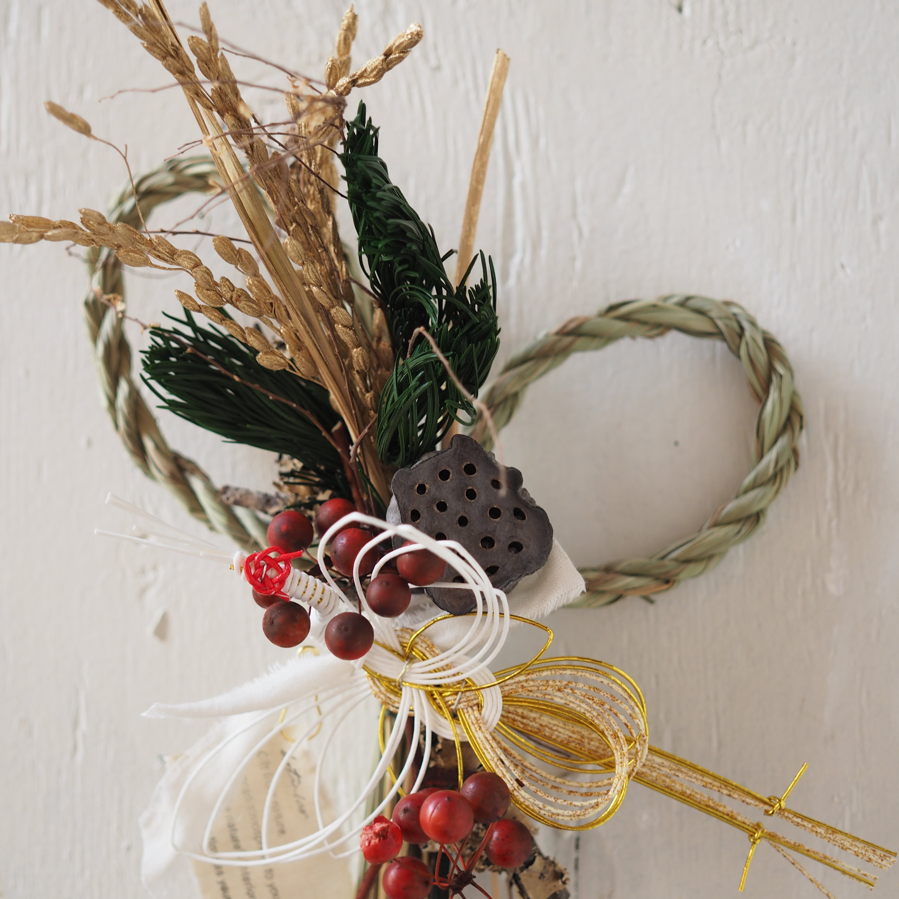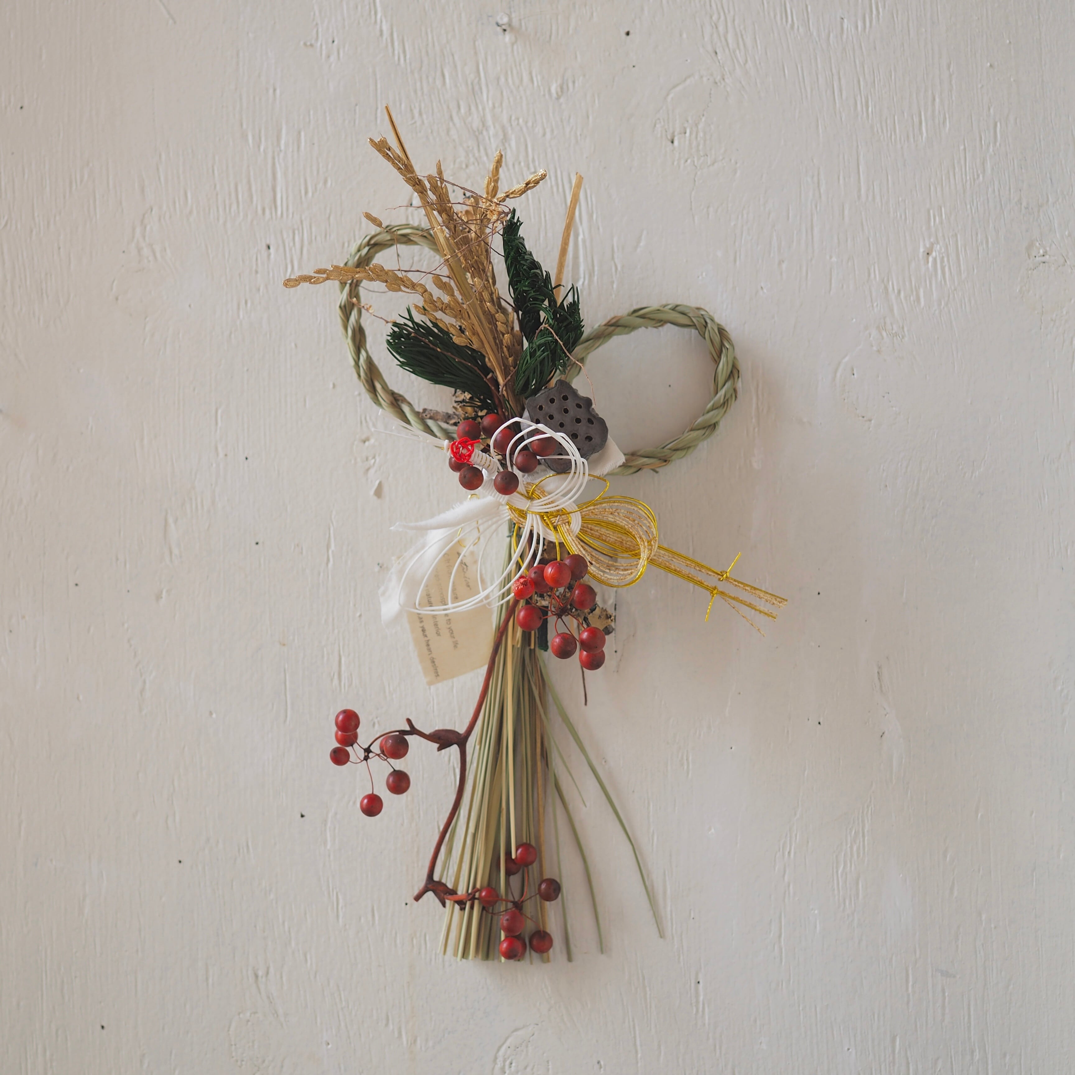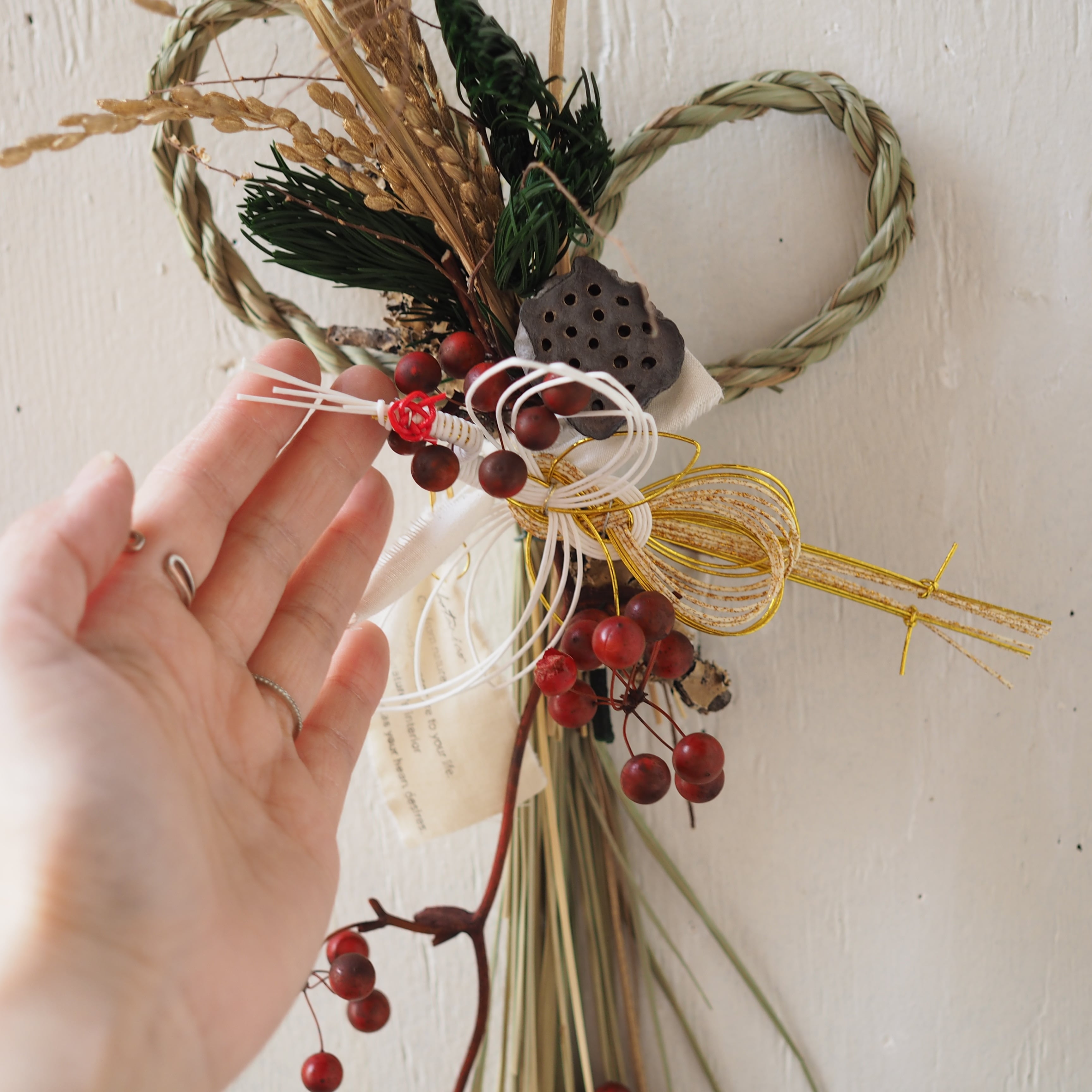 ナチュラルな素材を使った、個性溢れるデザインに仕上げた一点もののしめ飾り。
