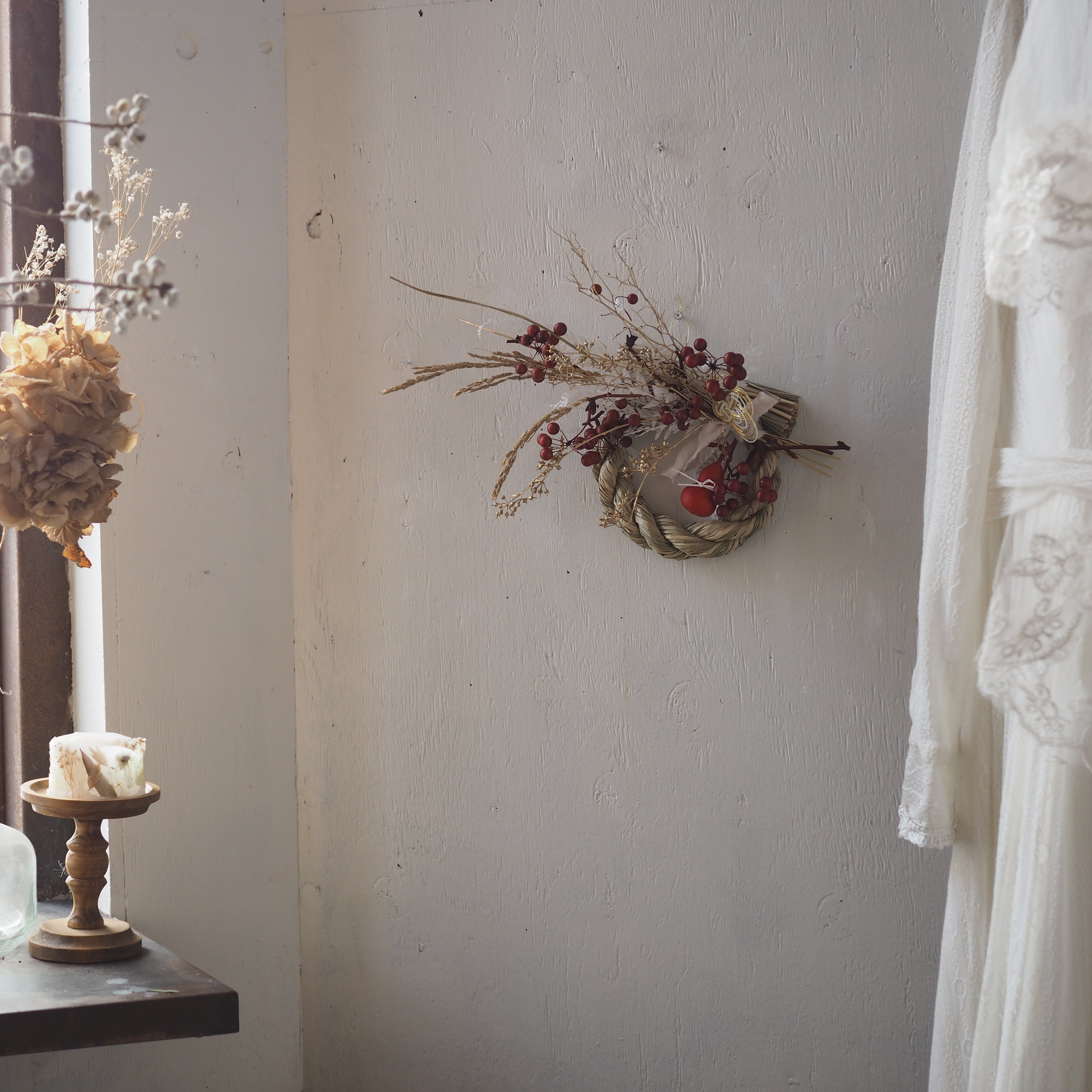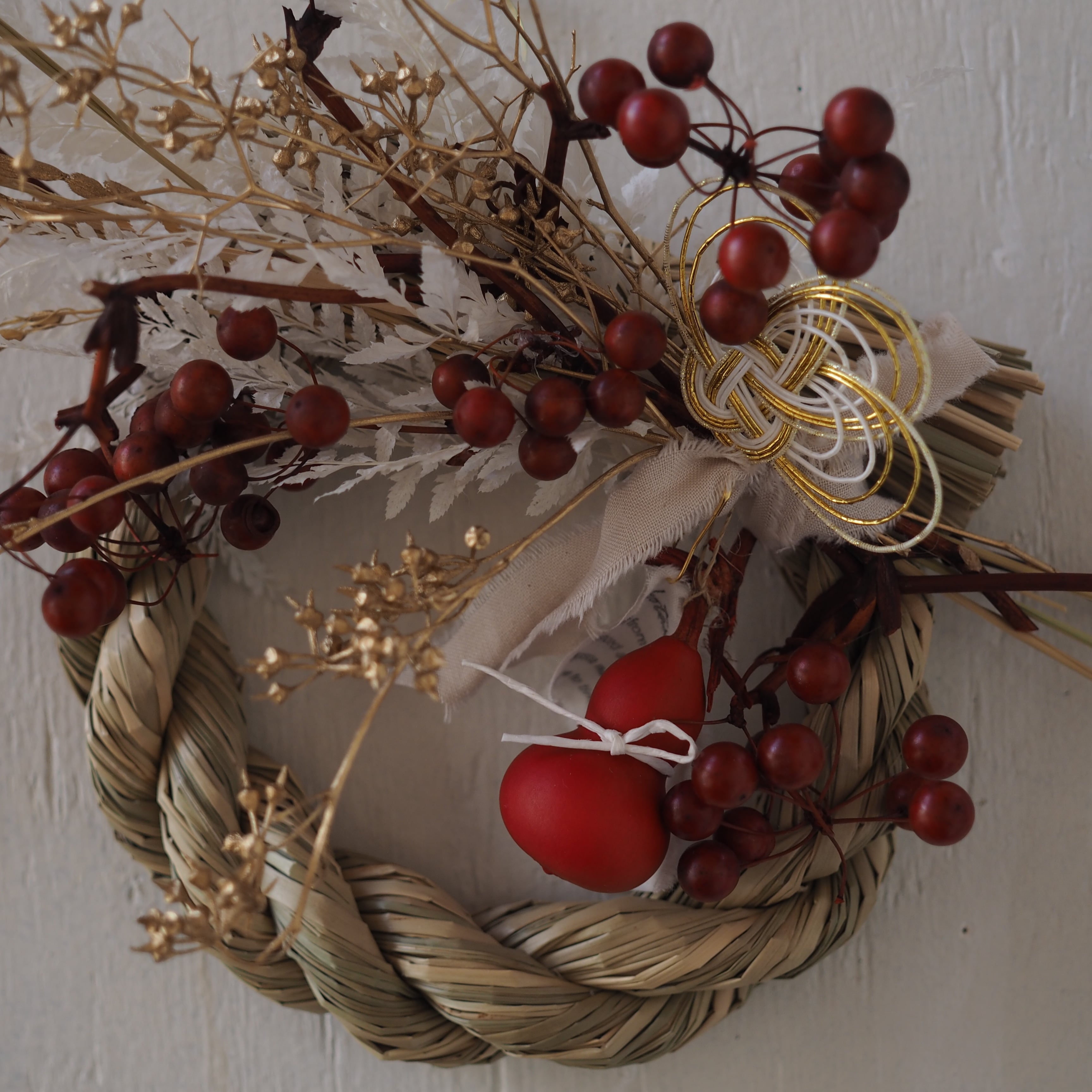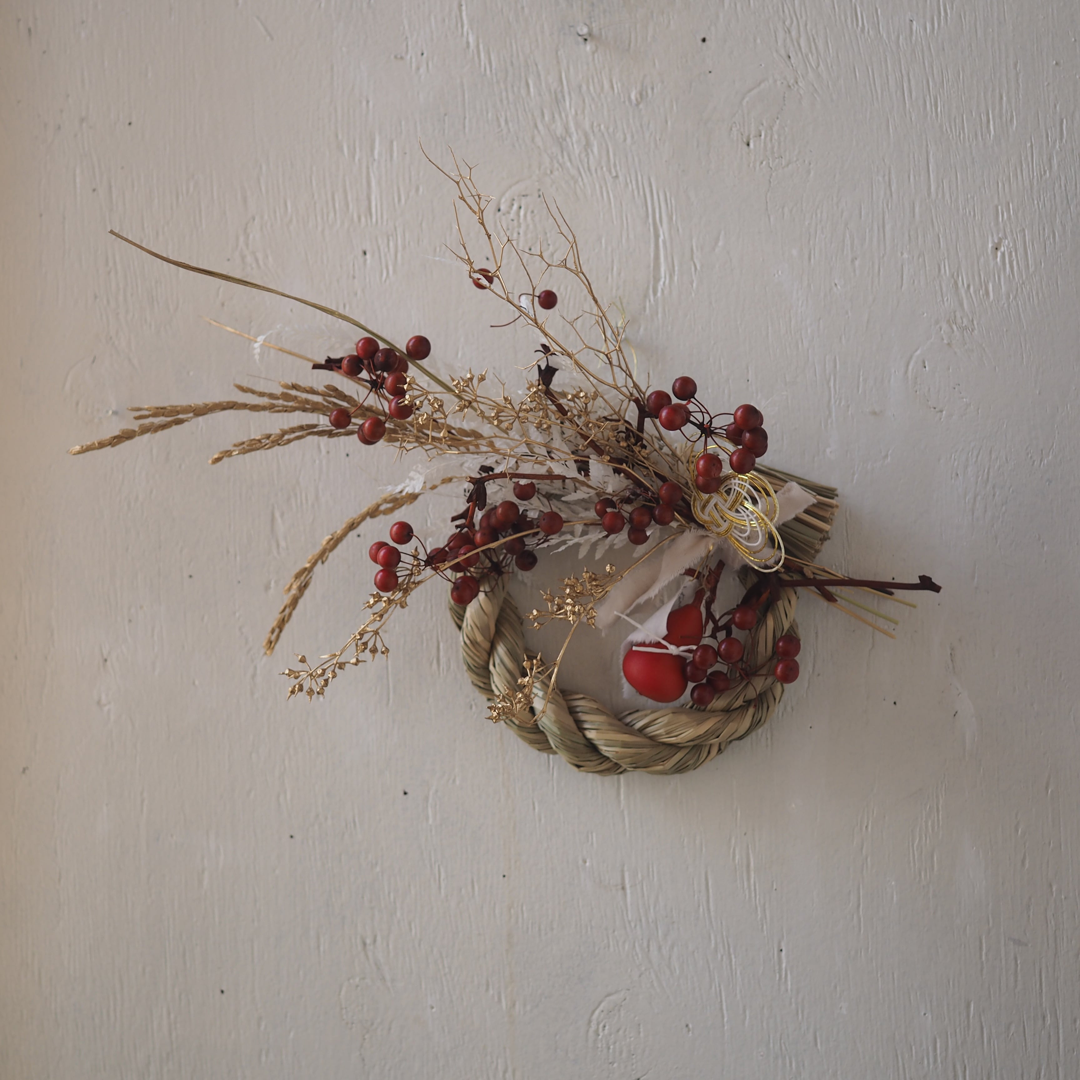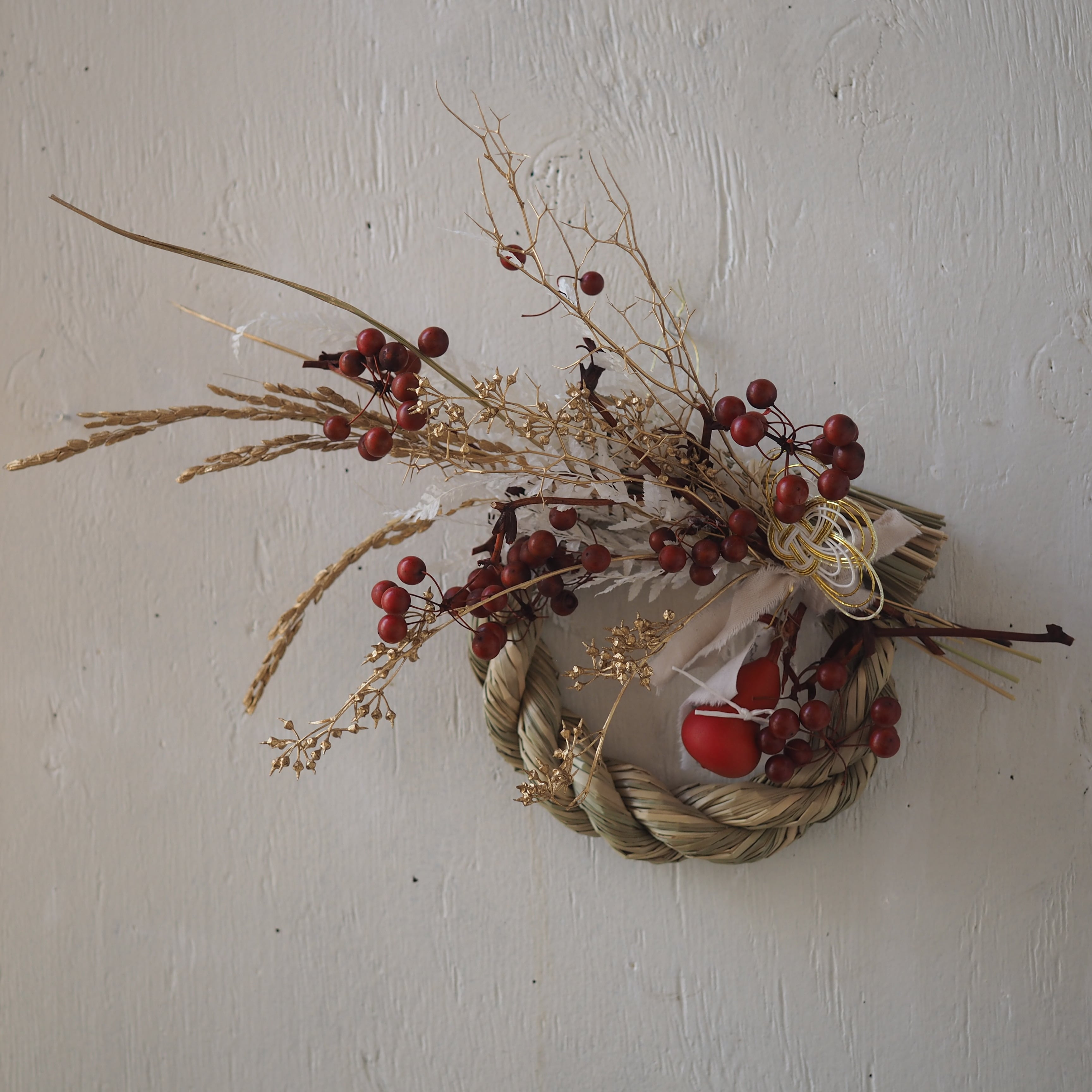 ナチュラルな素材を使った、個性溢れるデザインに仕上げた一点もののしめ飾り。