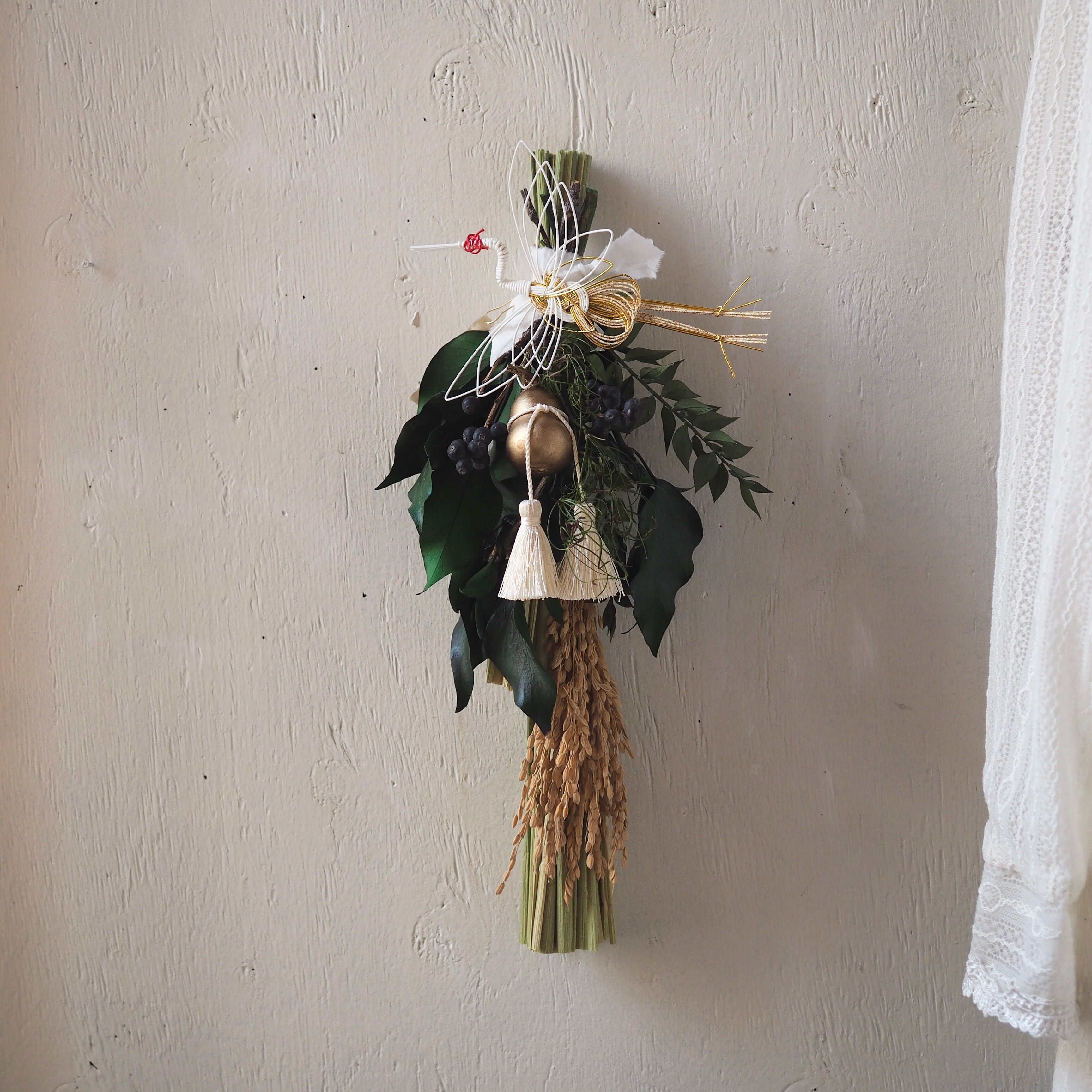 ナチュラルな素材を使った、個性溢れるデザインに仕上げた一点もののしめ飾り。