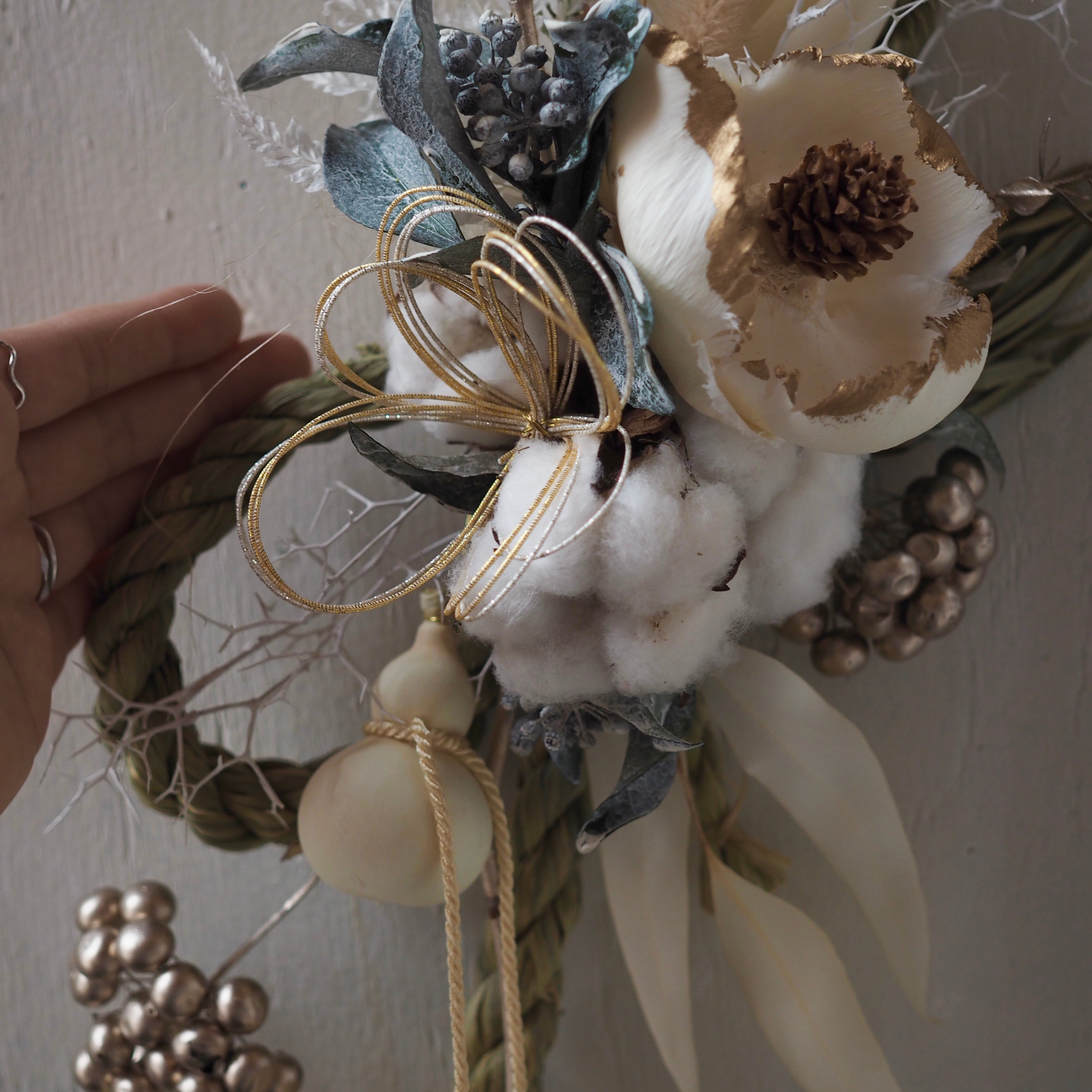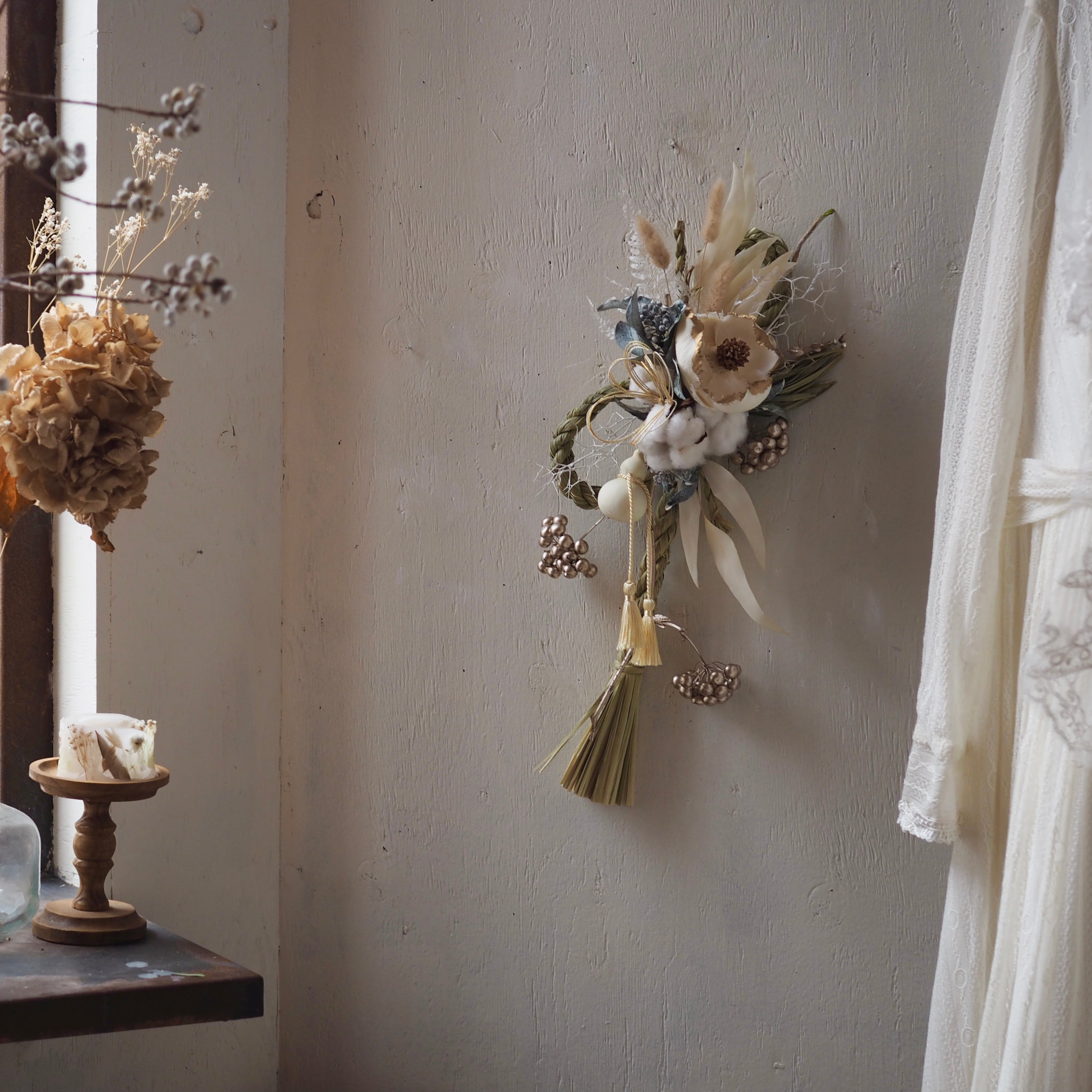 ナチュラルな素材を使った、個性溢れるデザインに仕上げた一点もののしめ飾り。