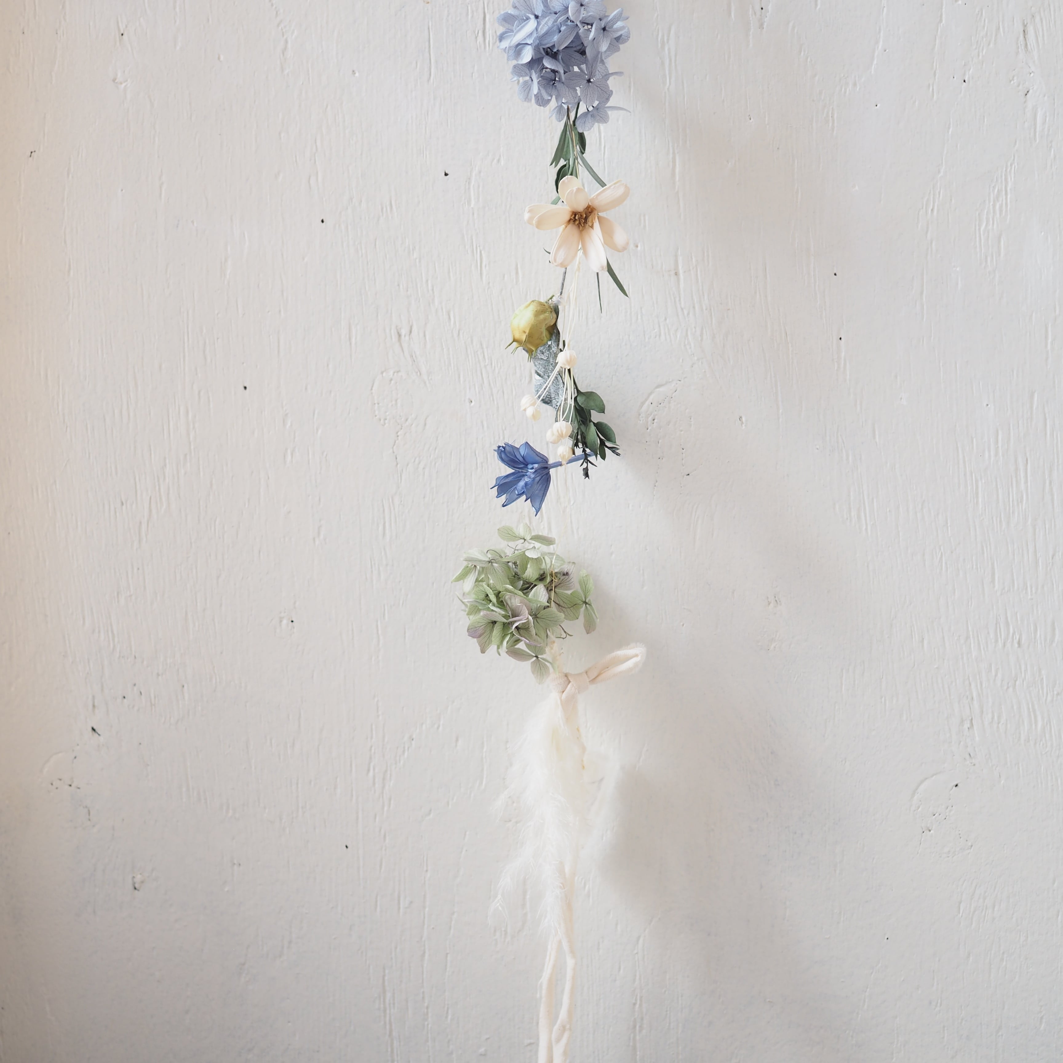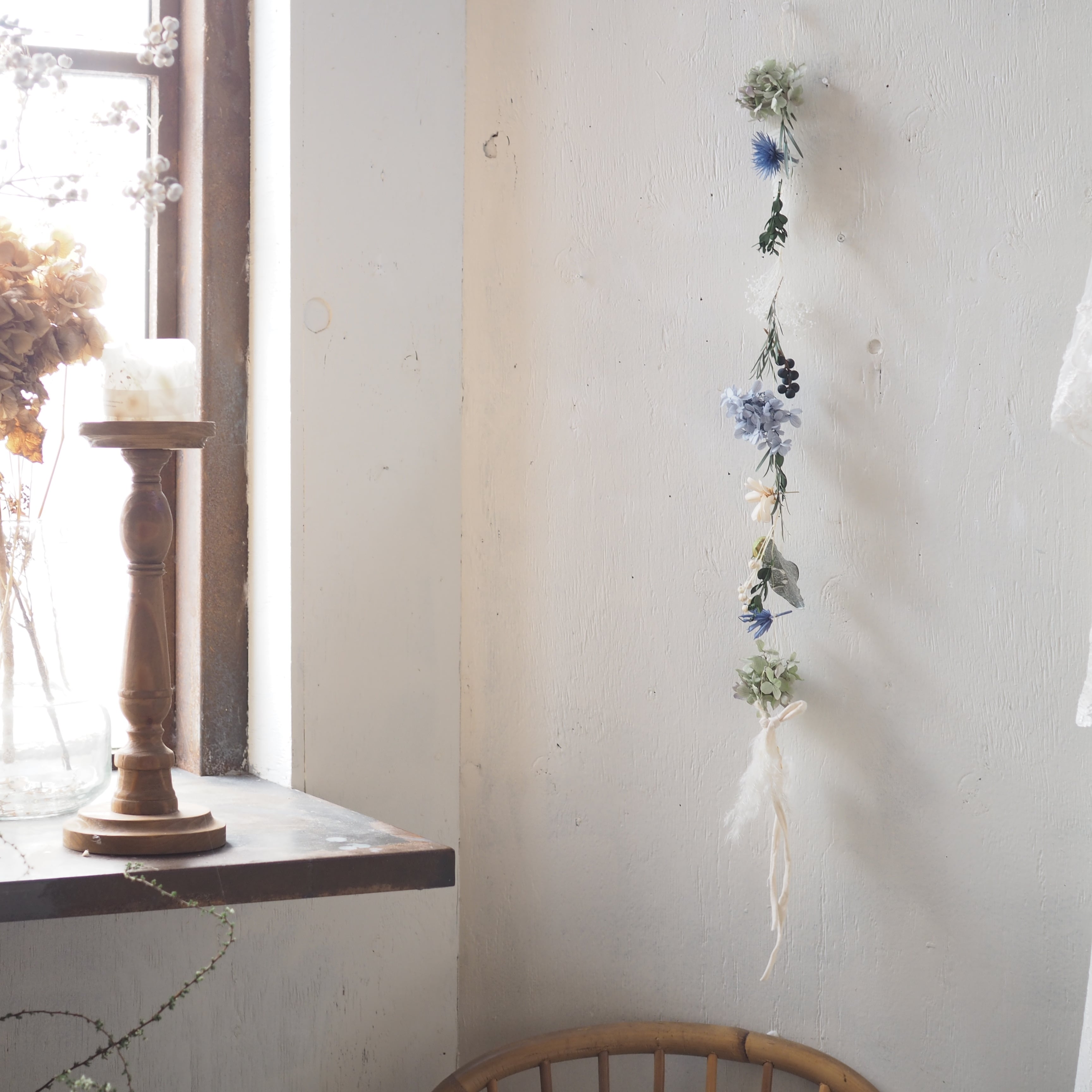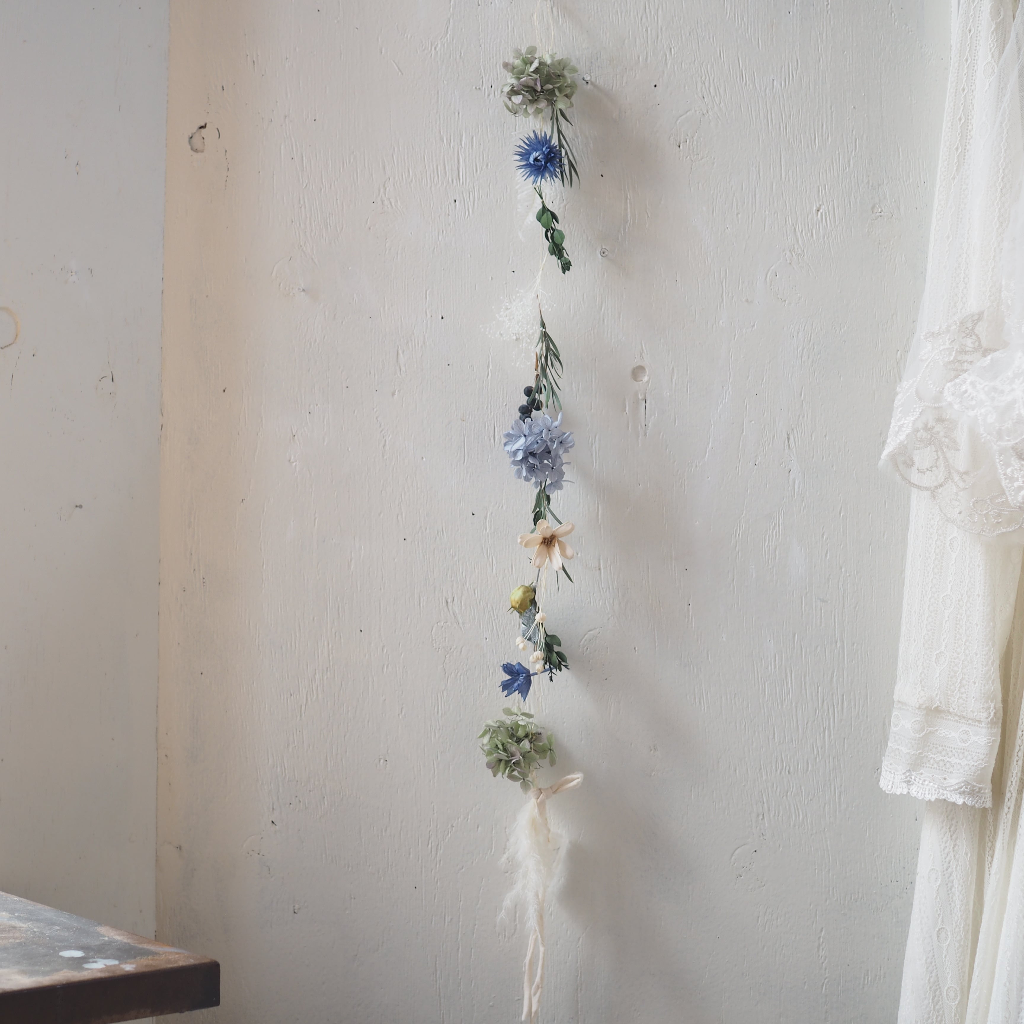 細いワイヤーに可愛いドライフラワーやプリザーブドフラワーにあしらったガーランドです。