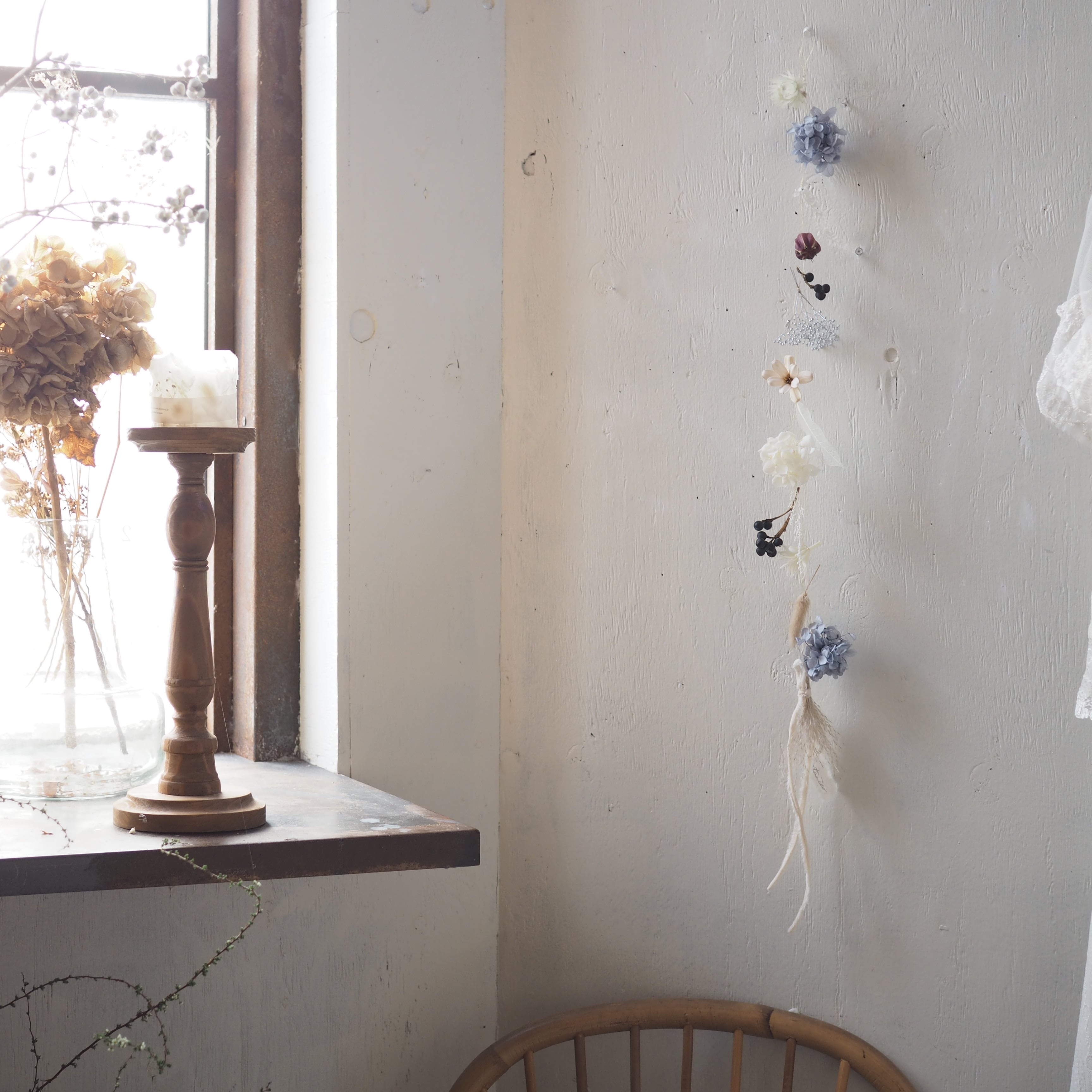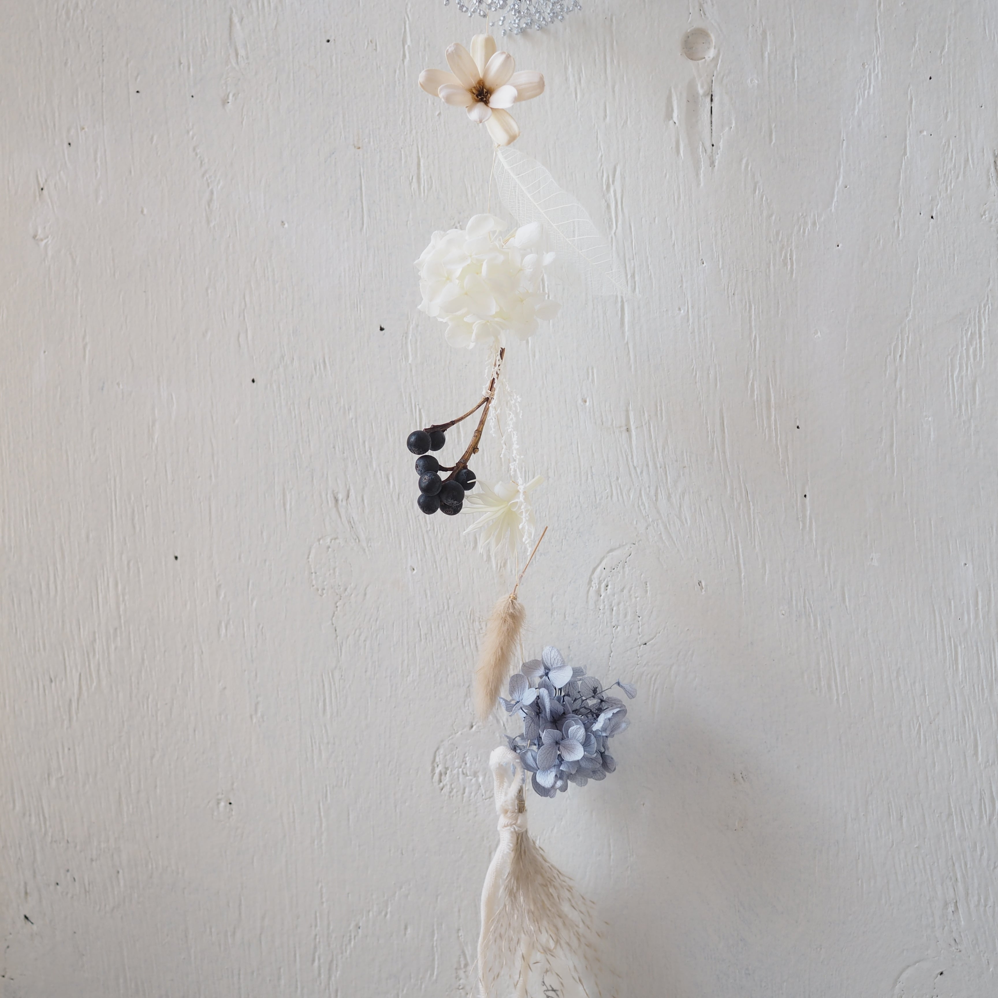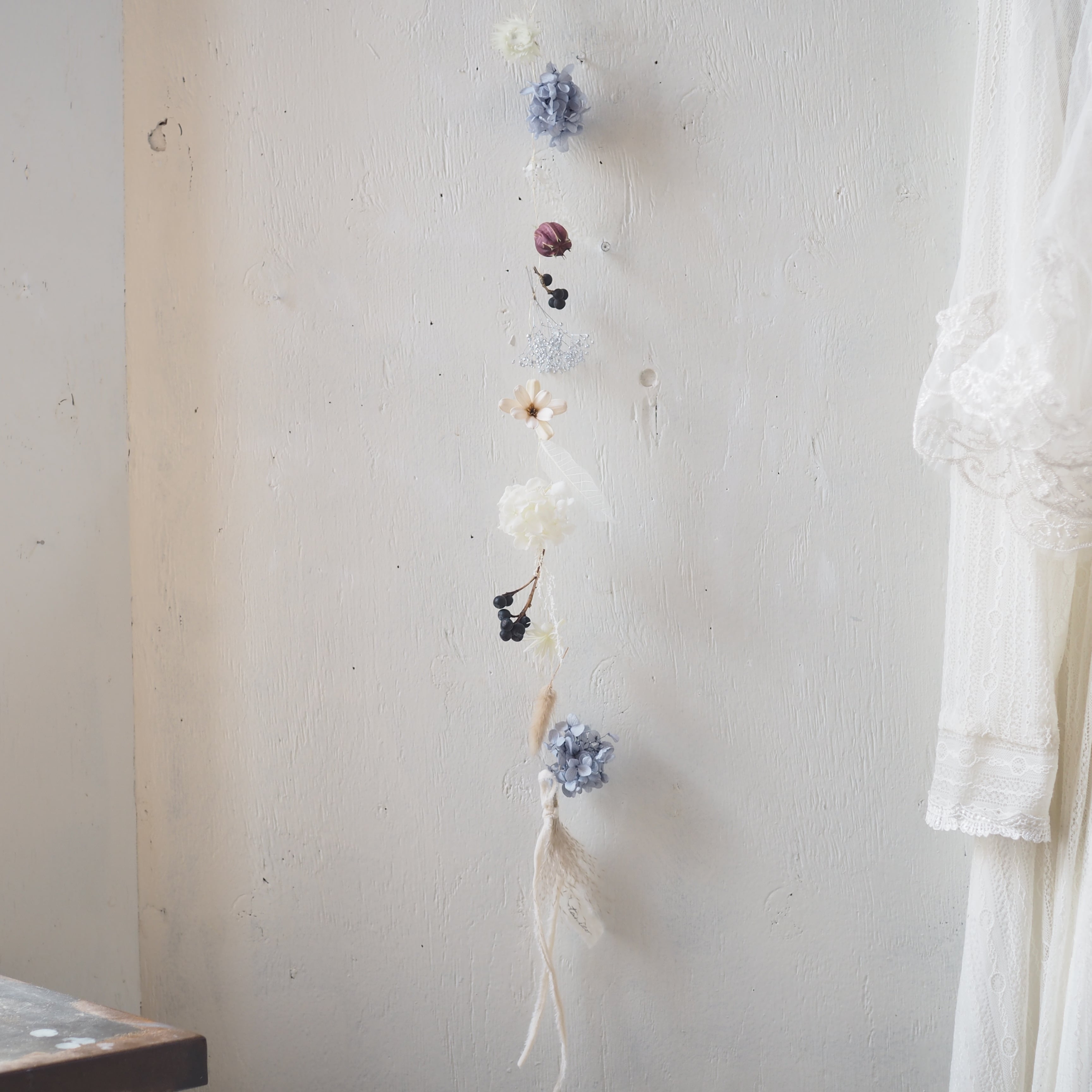 細いワイヤーに可愛いドライフラワーやプリザーブドフラワーにあしらったガーランドです。