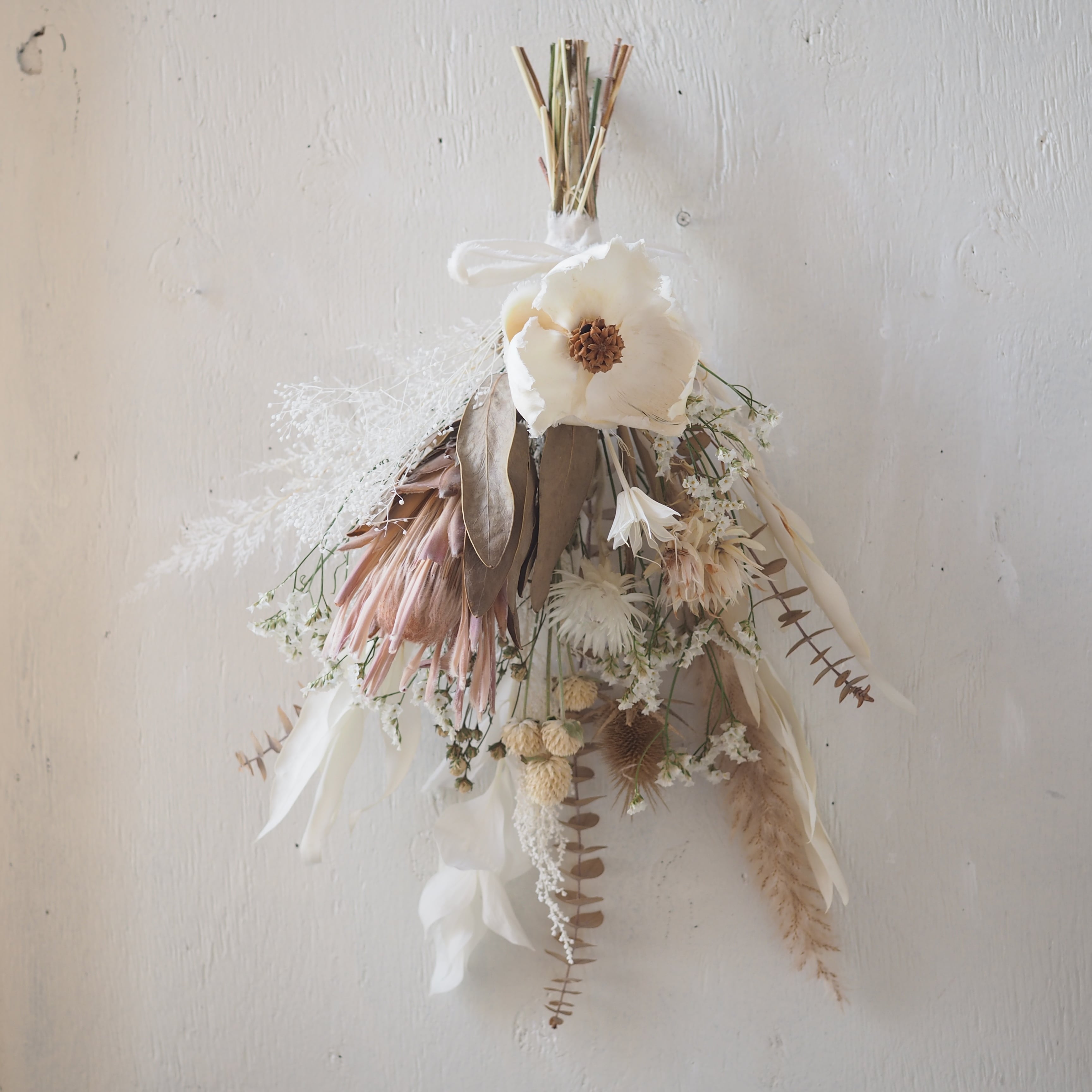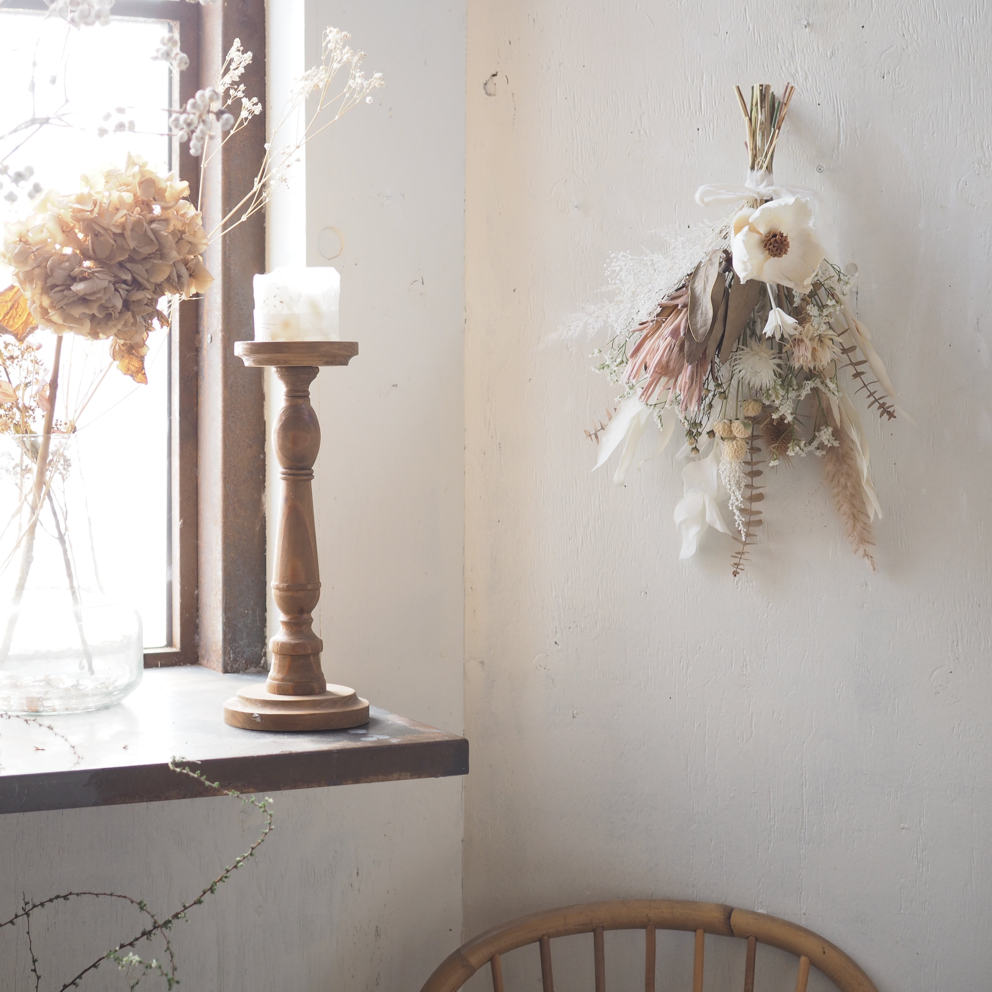 ドライフラワーの雰囲気溢れるスワッグに仕立てました。