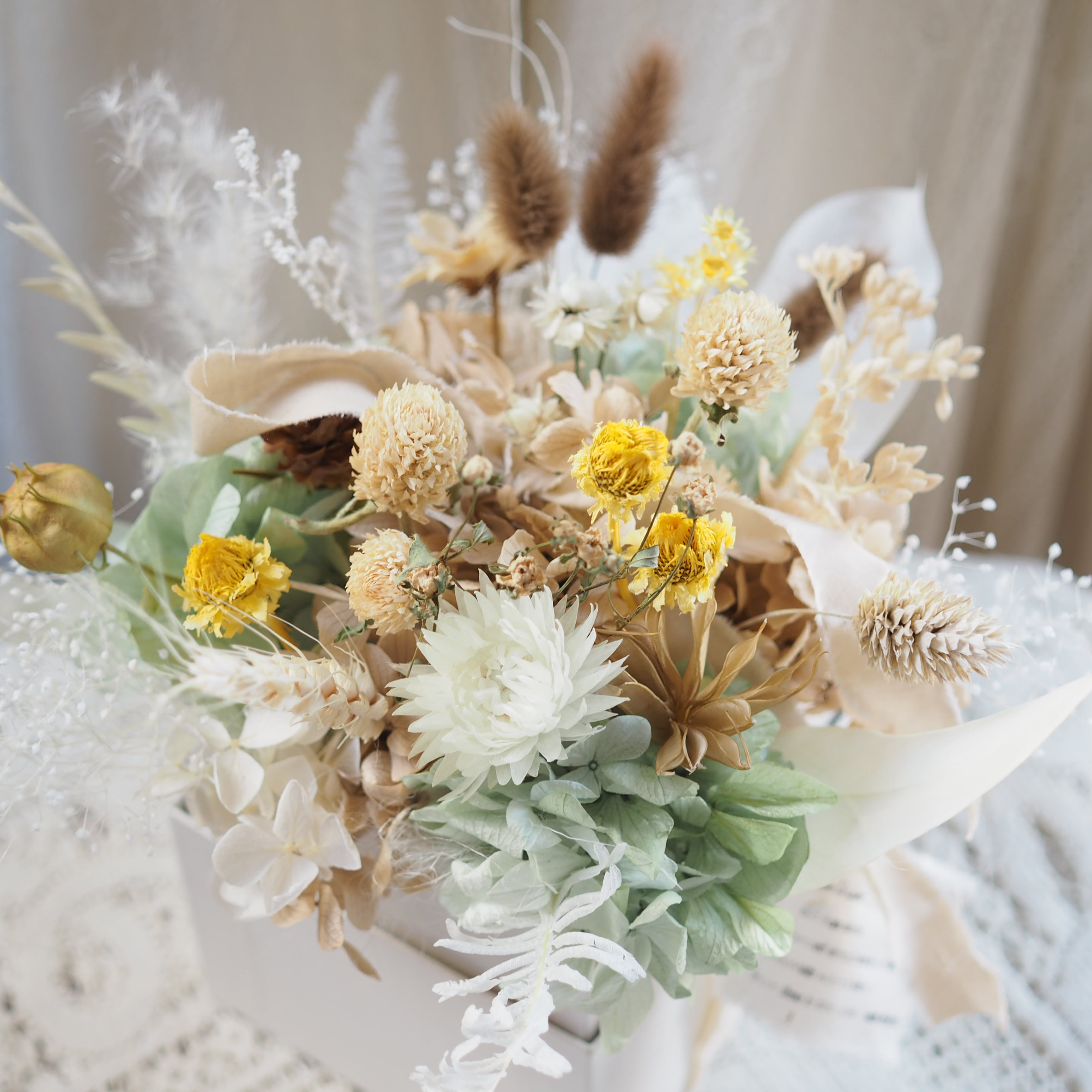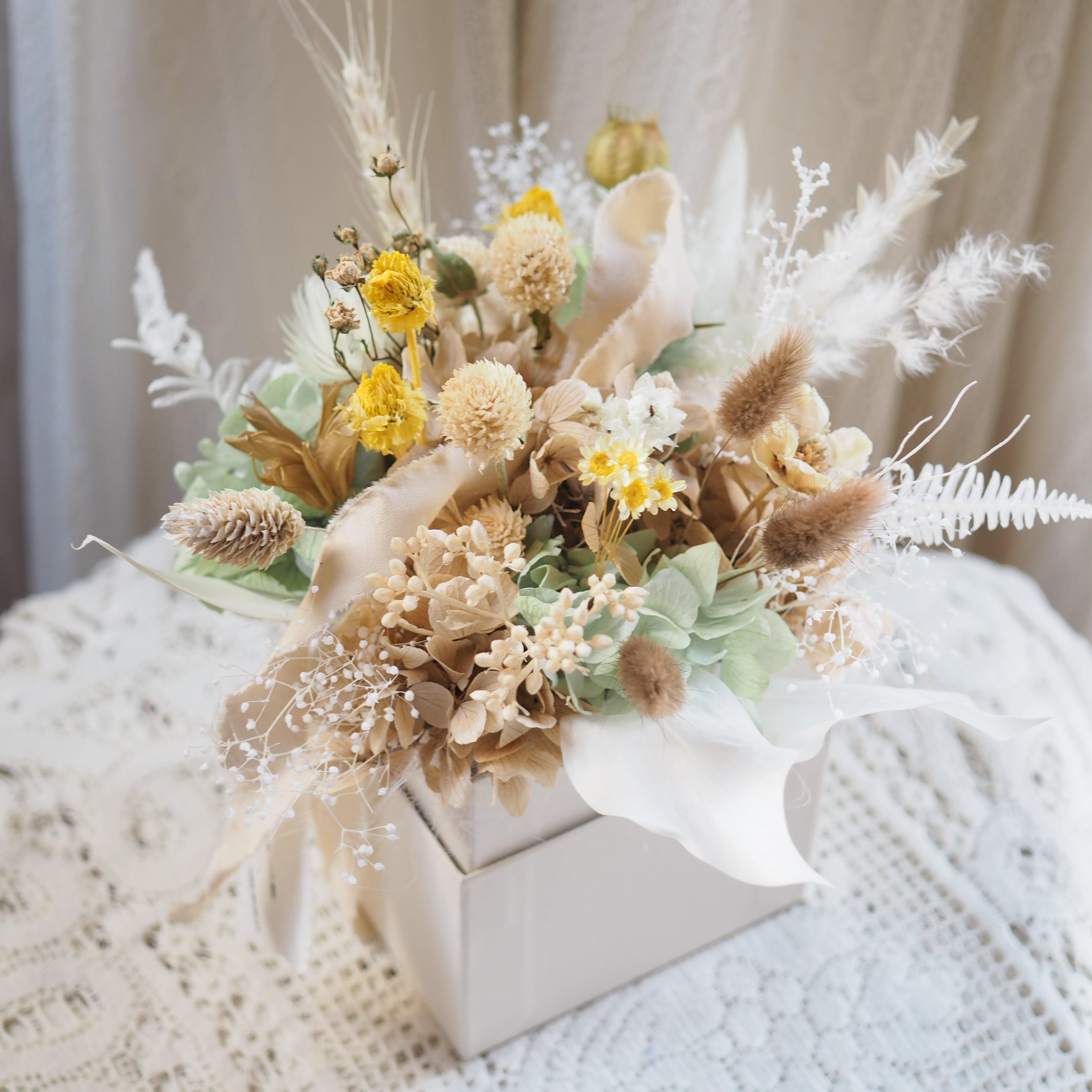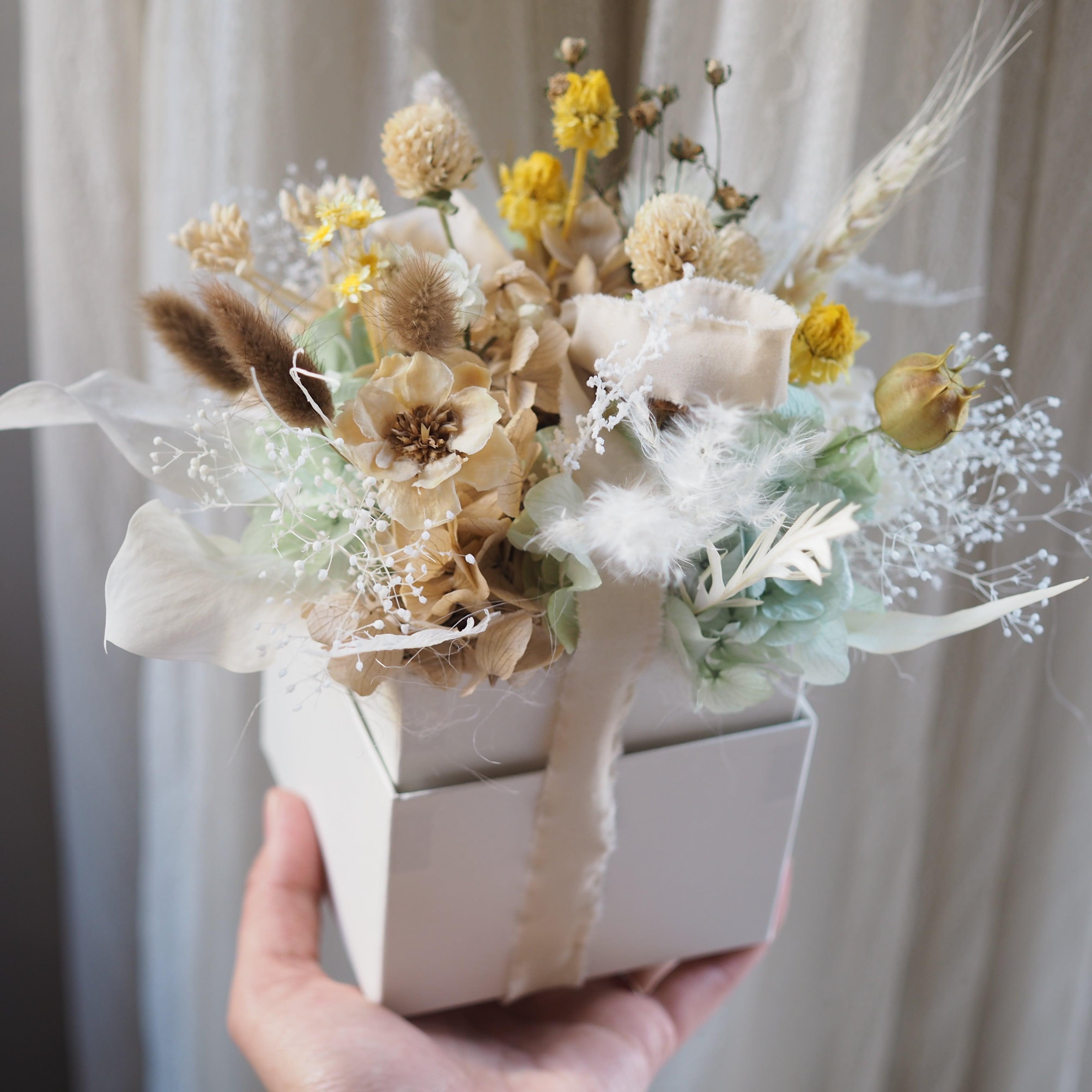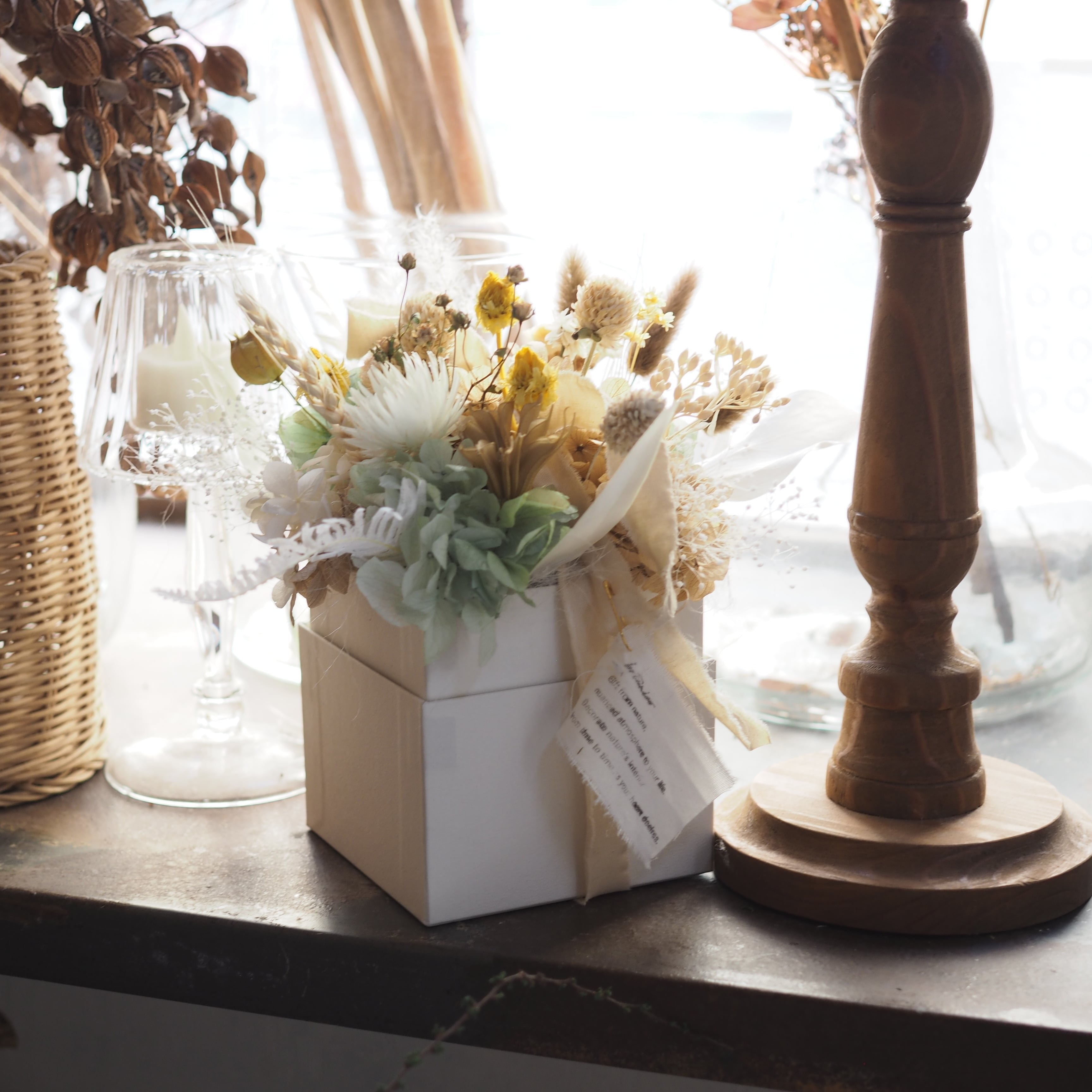 上質なボックスに贅沢にお花をアレンジして、プレゼントのようにリボンを結びました。