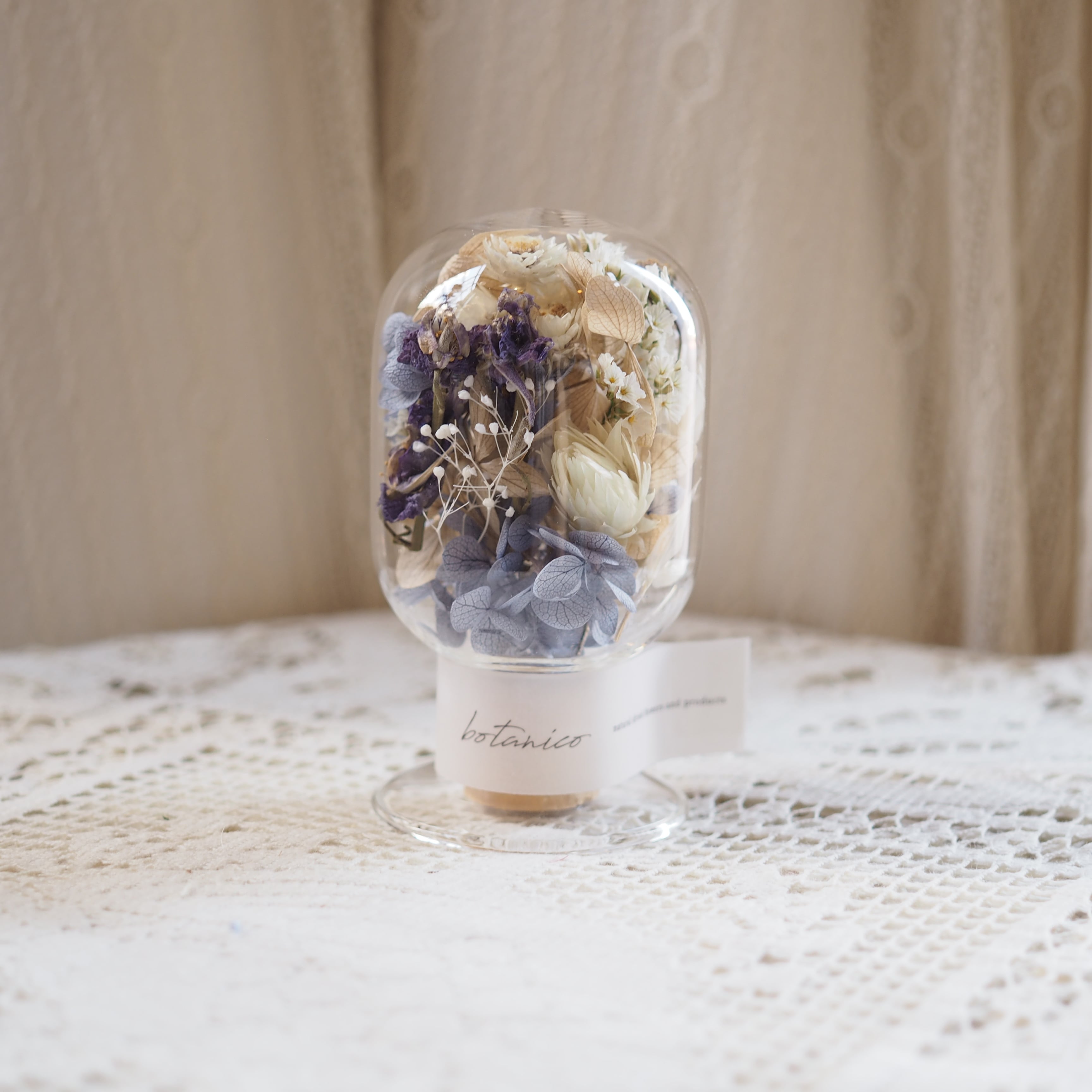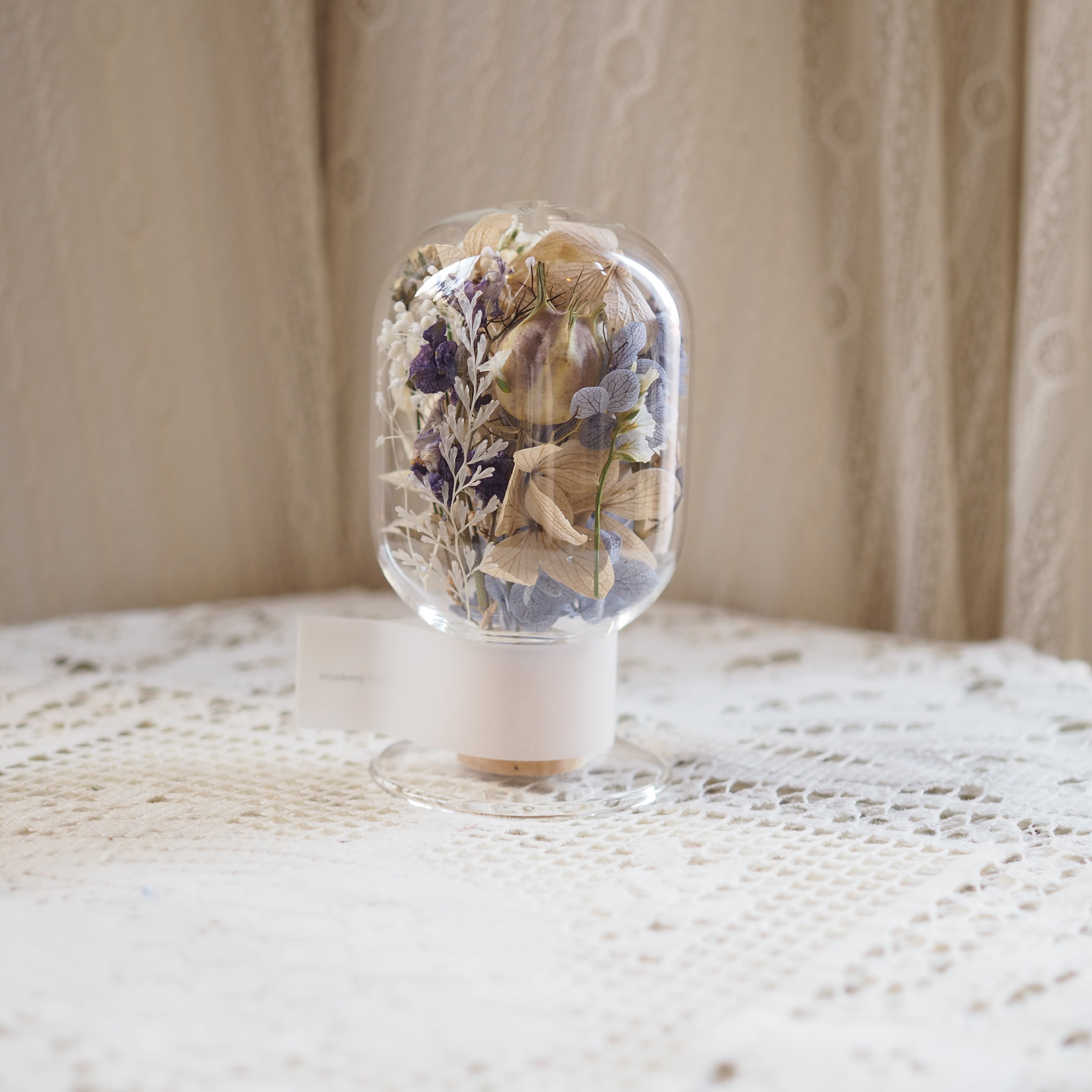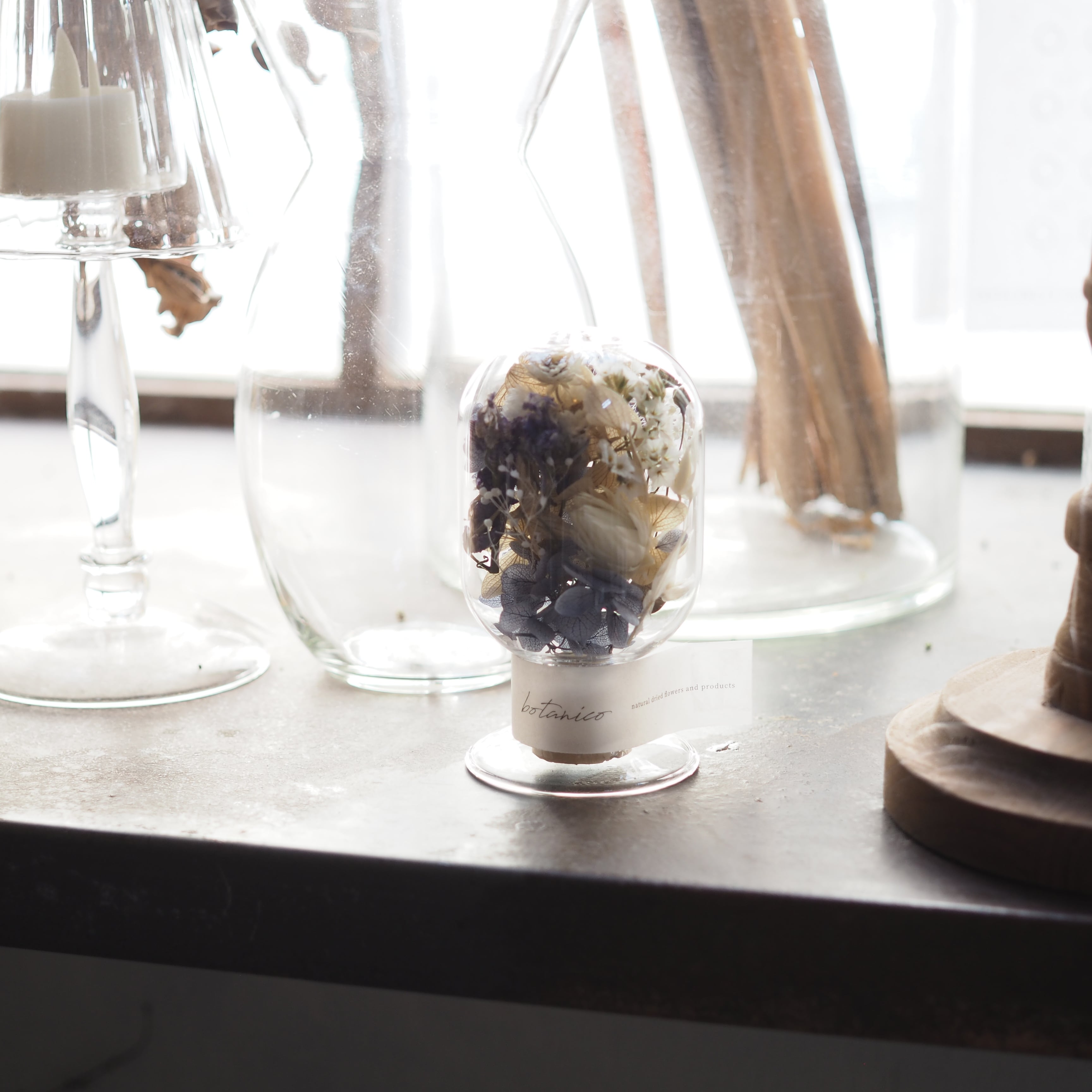 手作業で丁寧に仕上げたコルク瓶の中には、通年で扱いやすいドライフラワーを使用しています。
