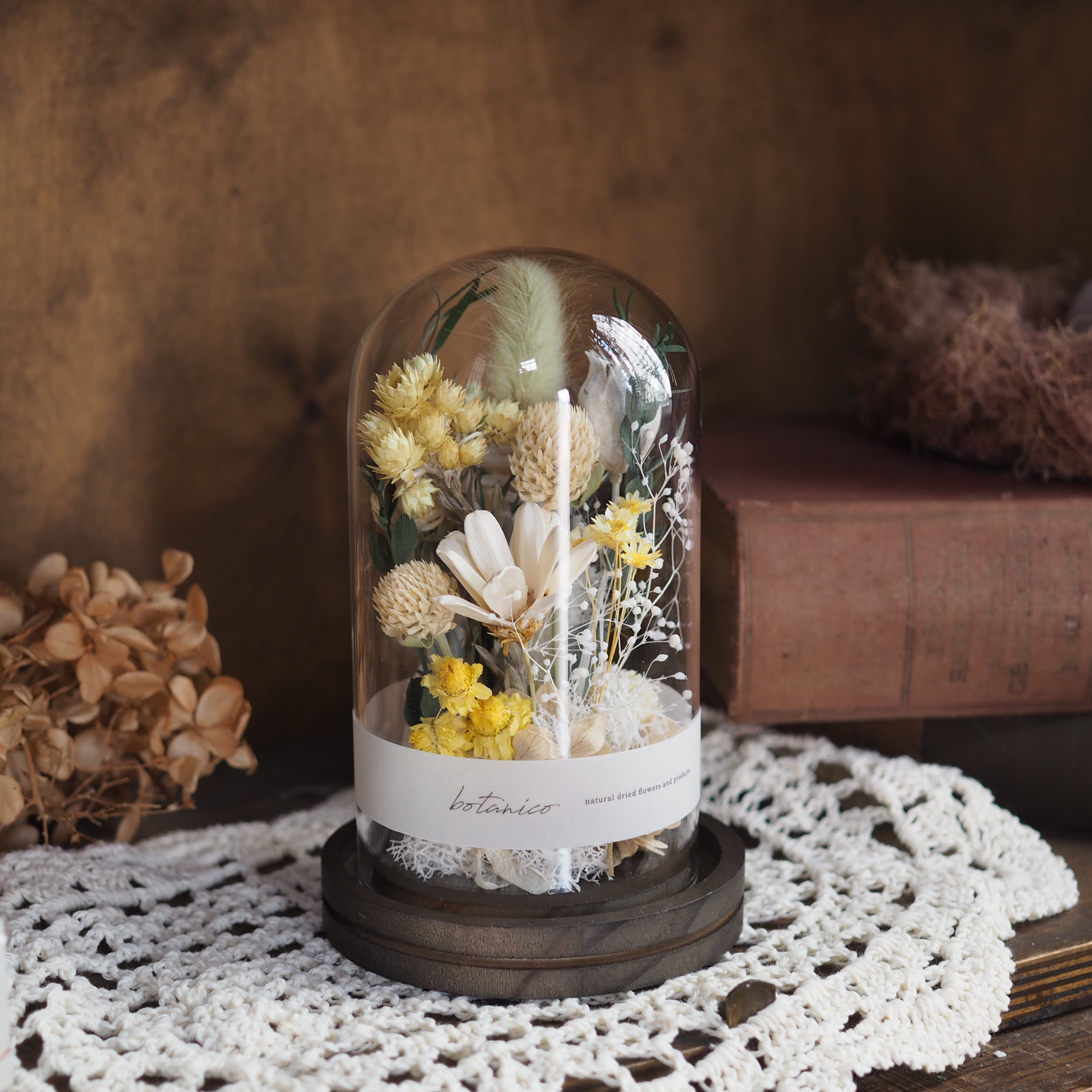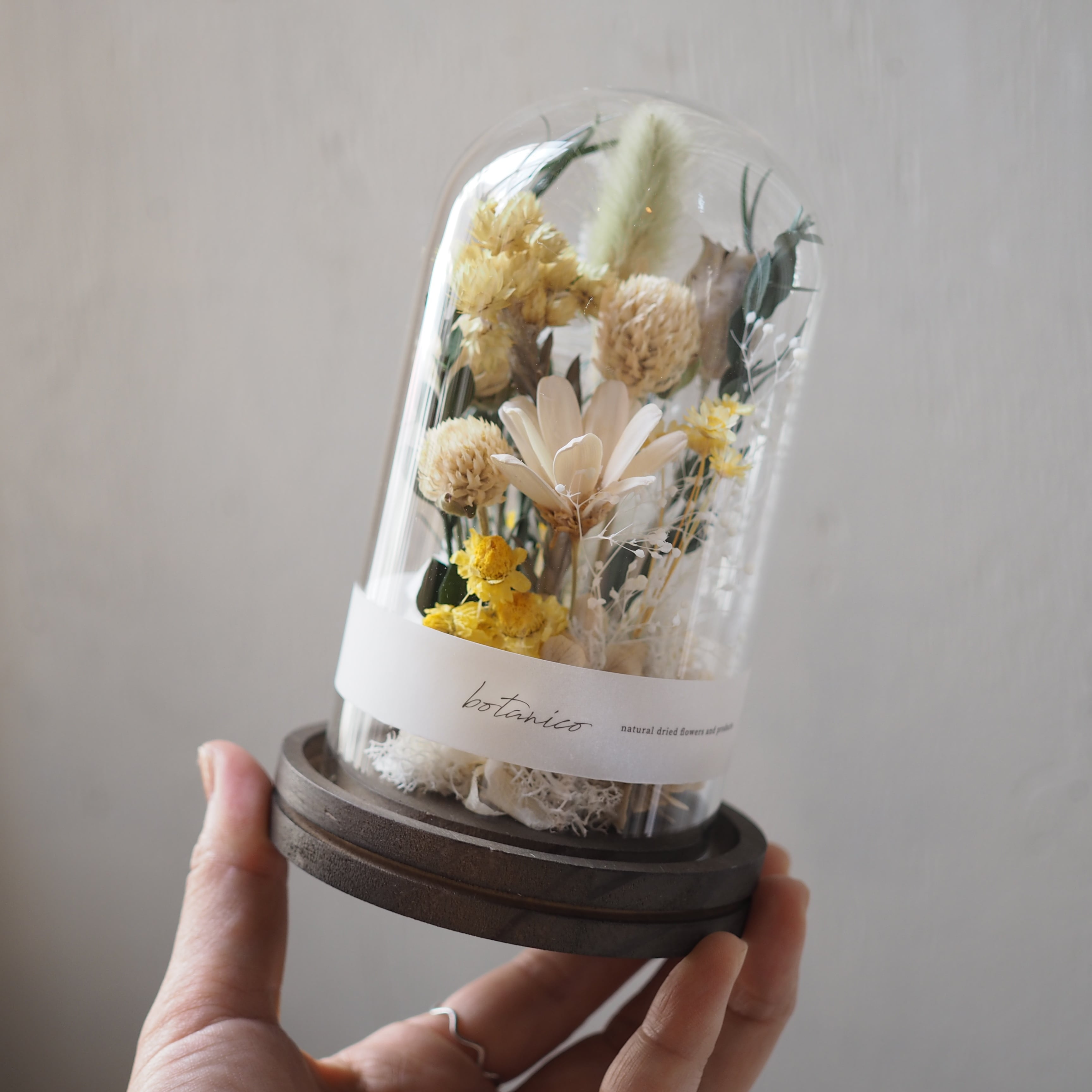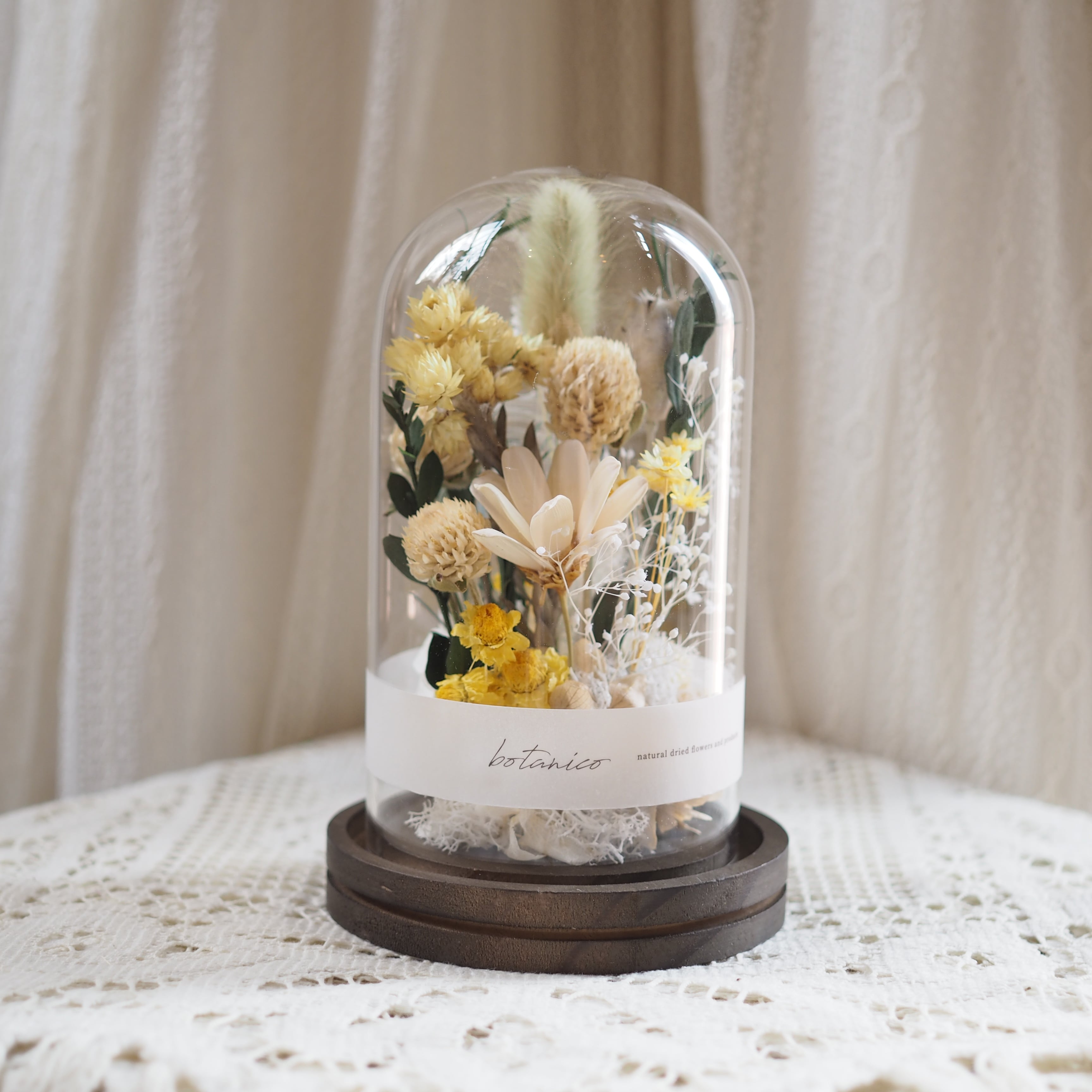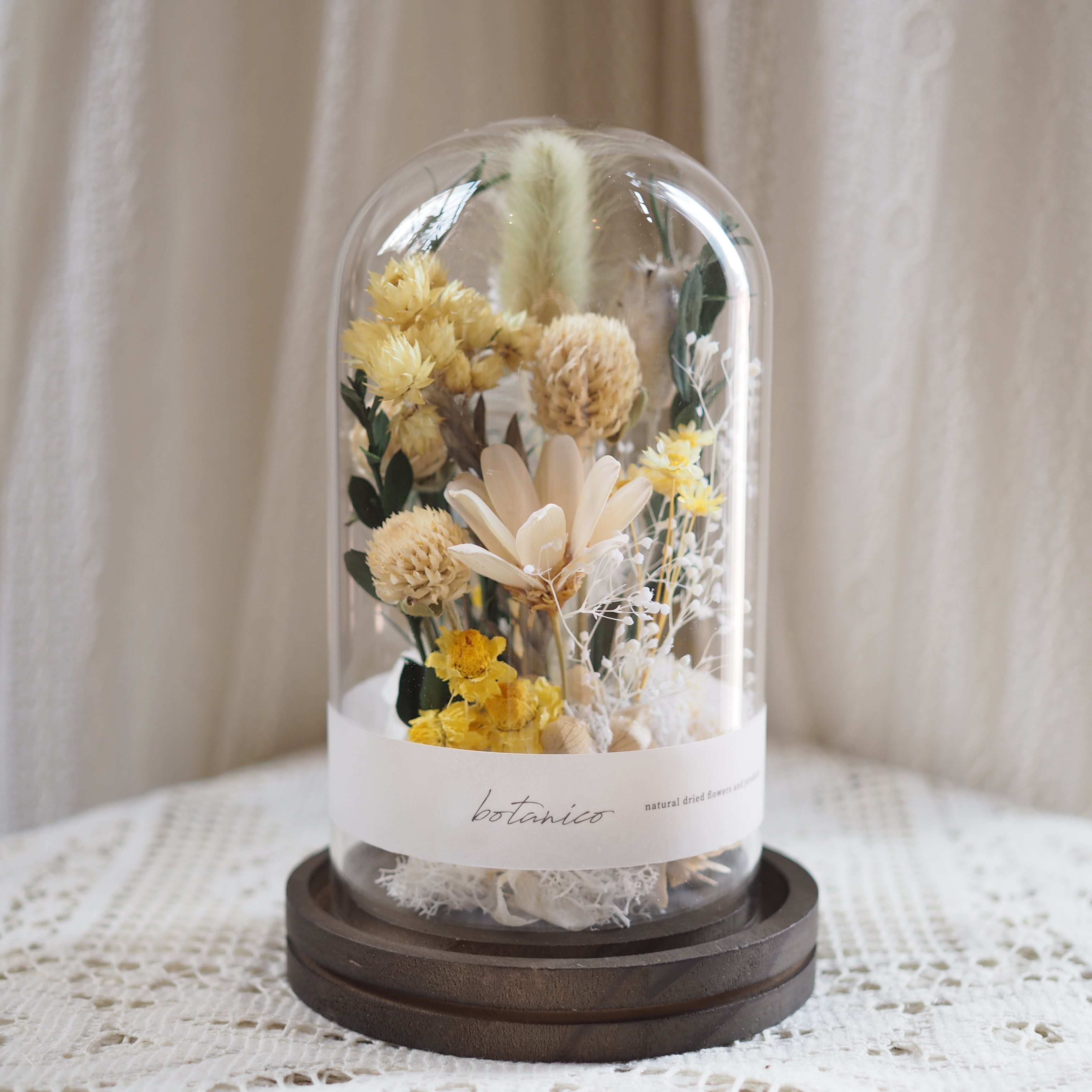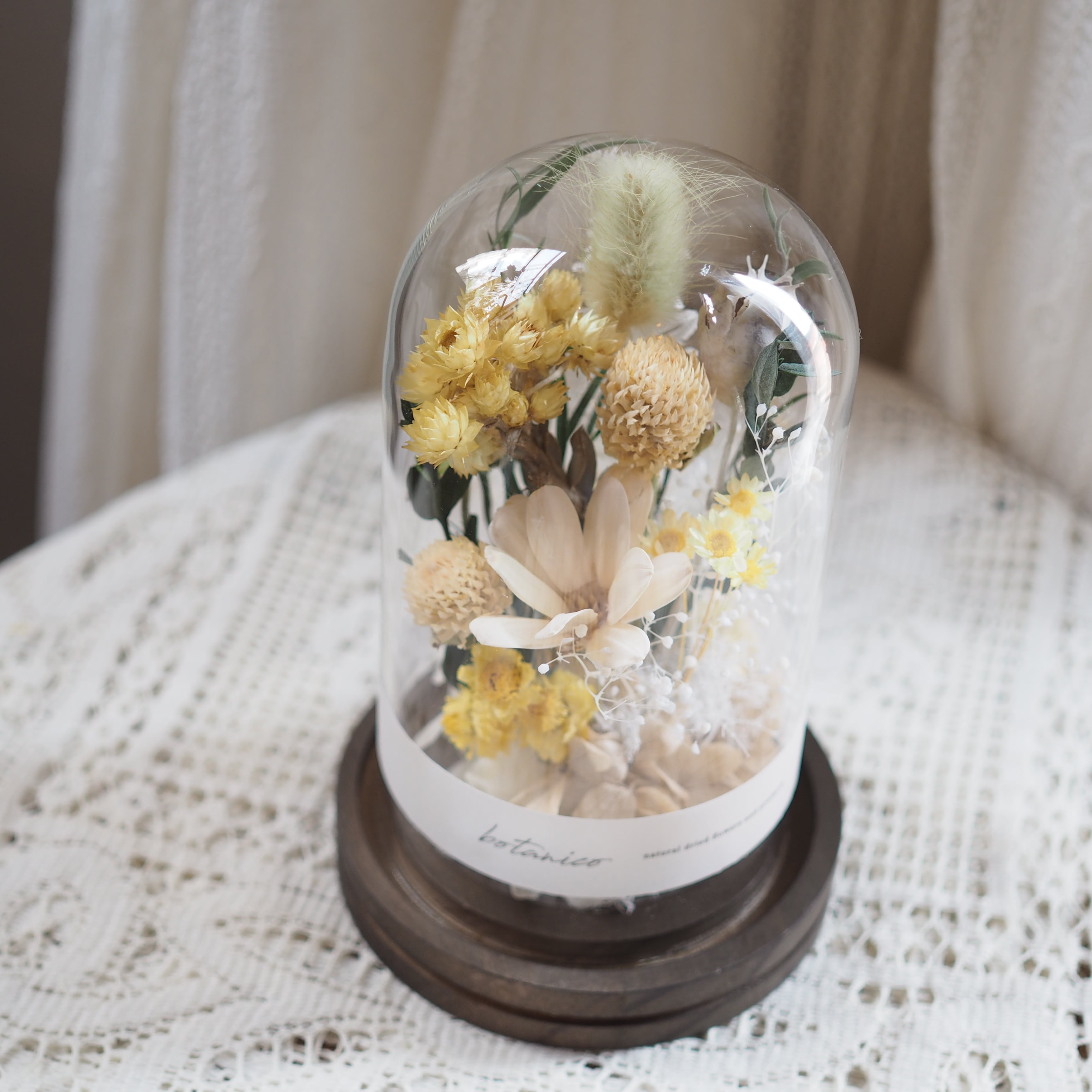 木の台座に、花や葉をひとつひとつ丁寧に配置し、ガラスドームでやさしく包みました。