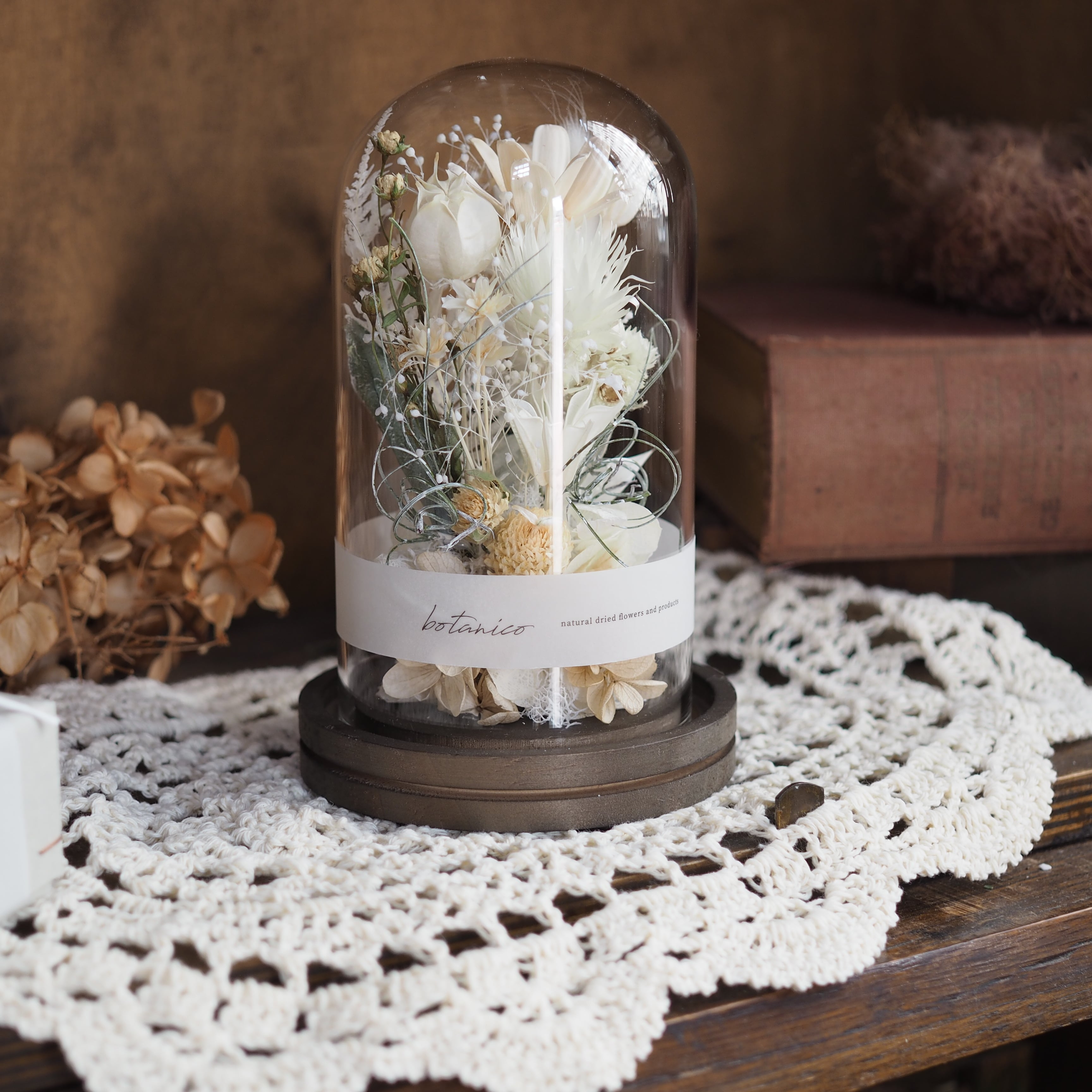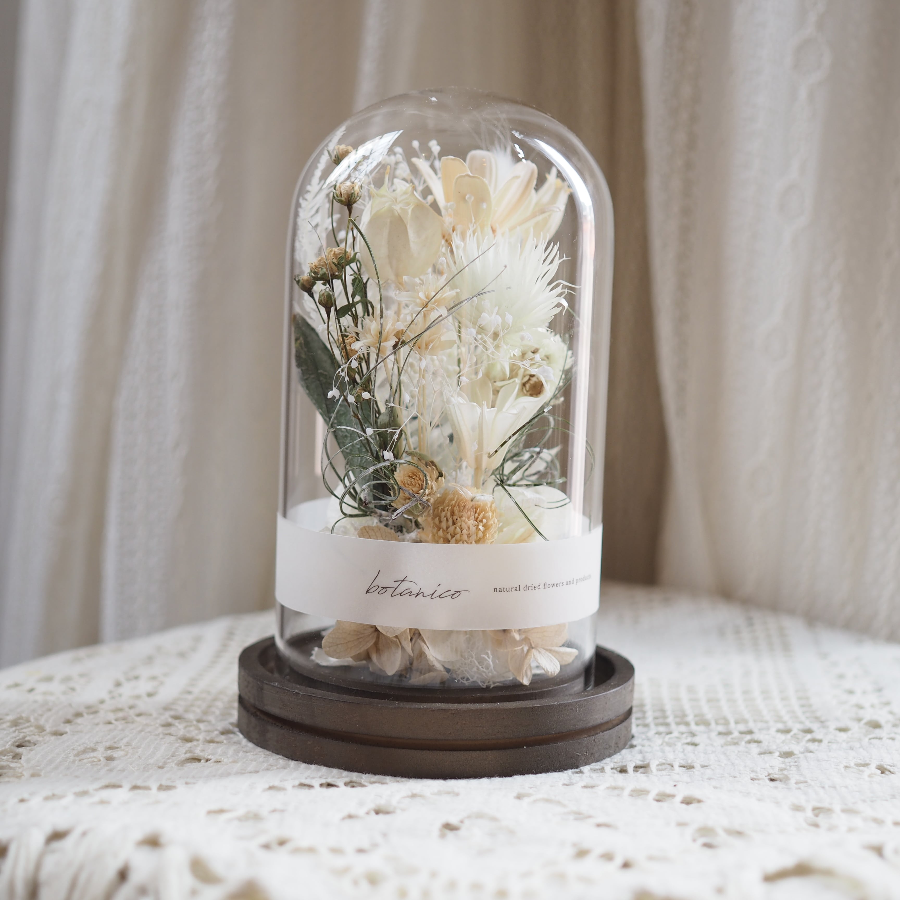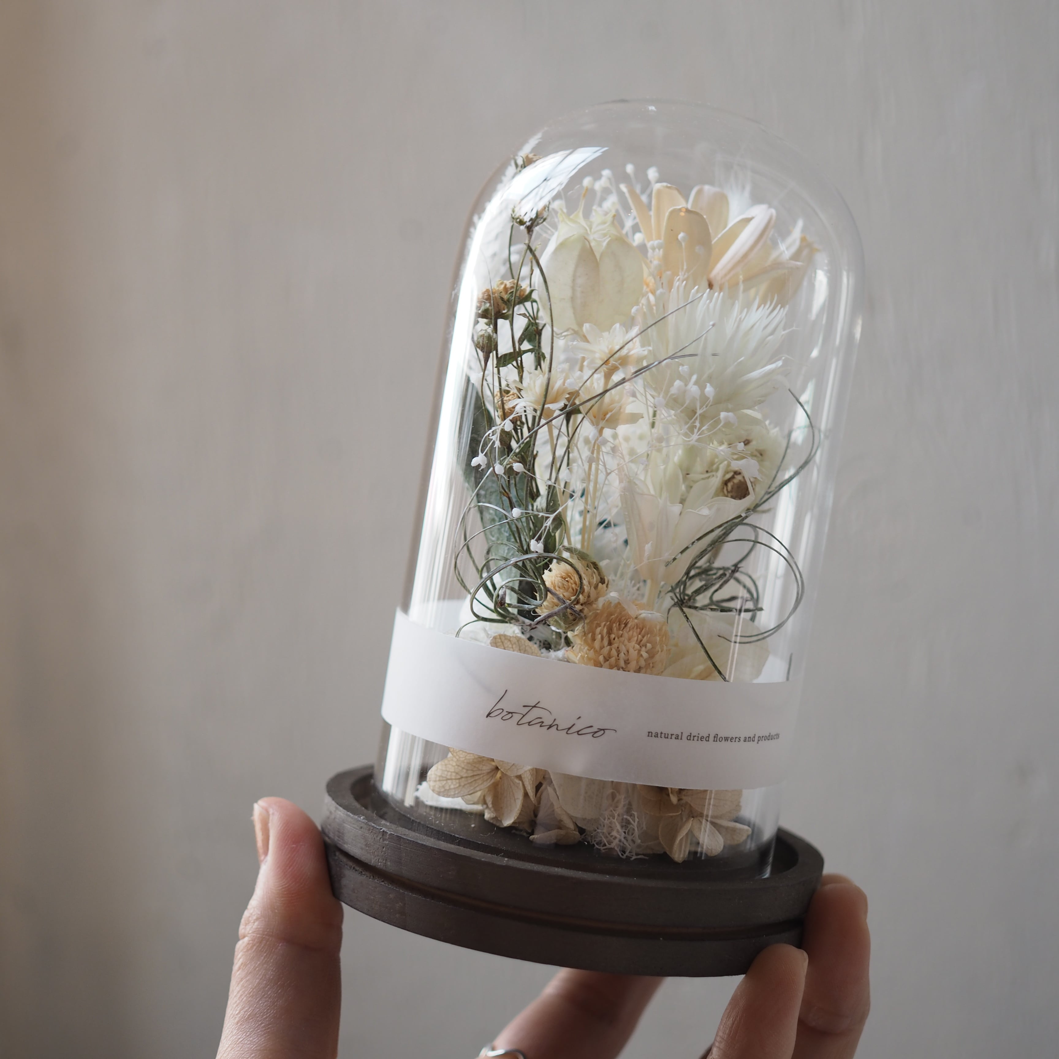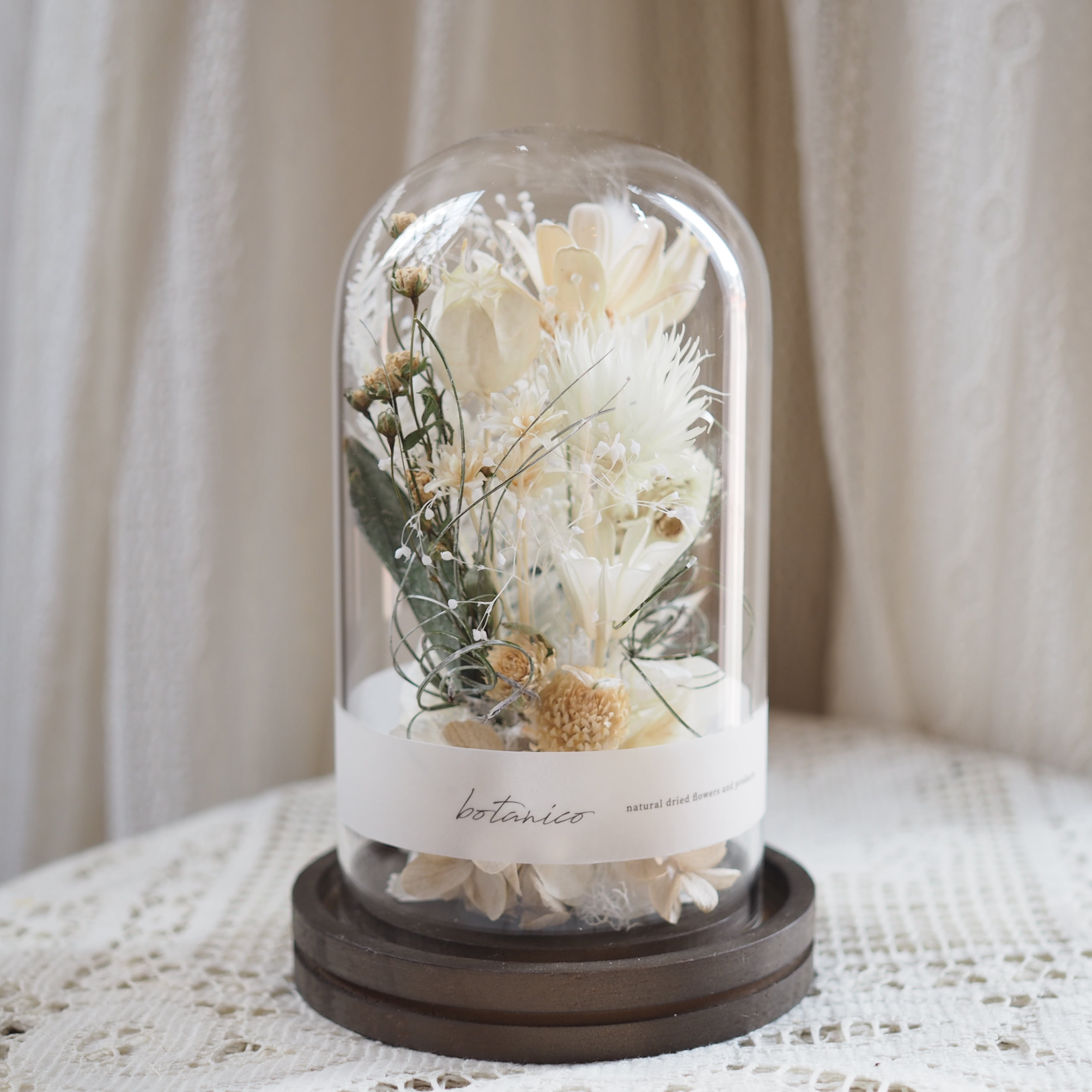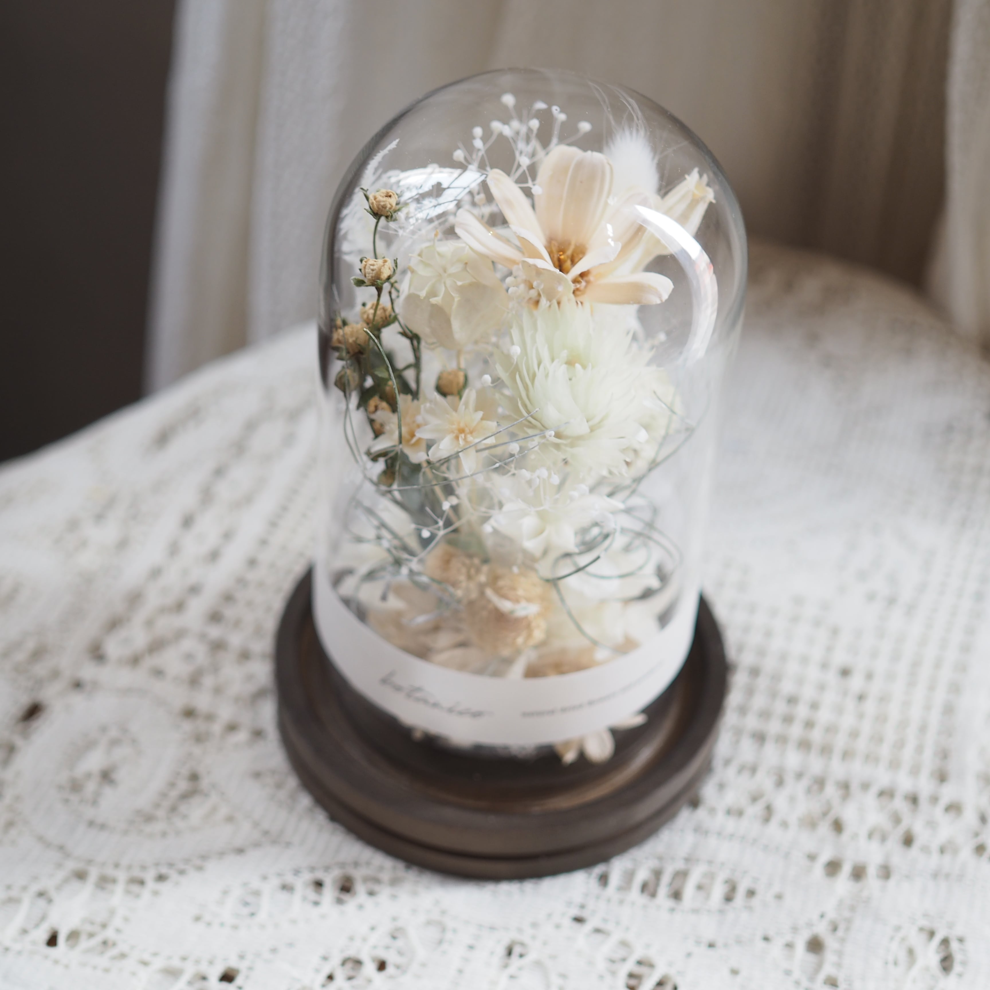 木の台座に、花や葉をひとつひとつ丁寧に配置し、ガラスドームでやさしく包みました。