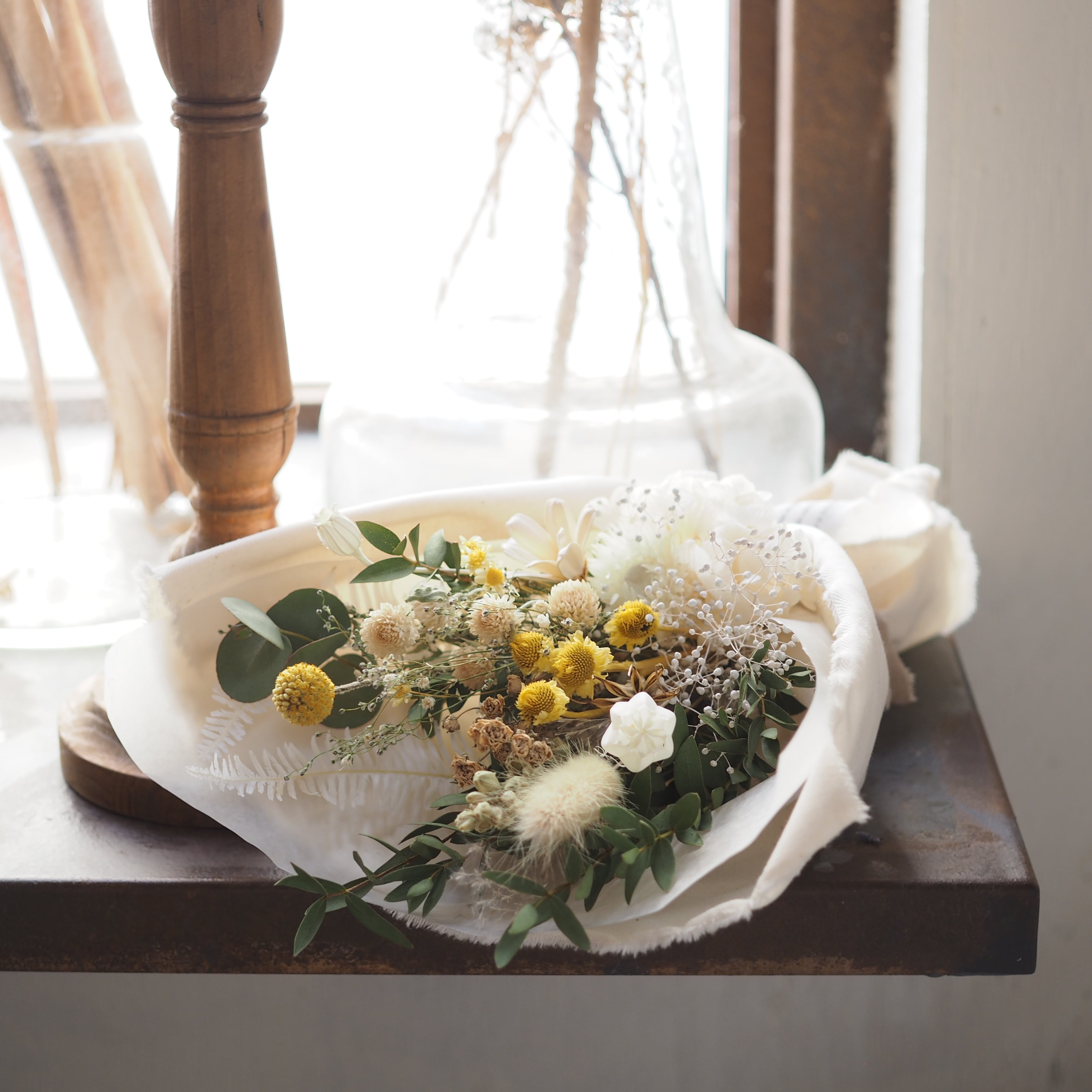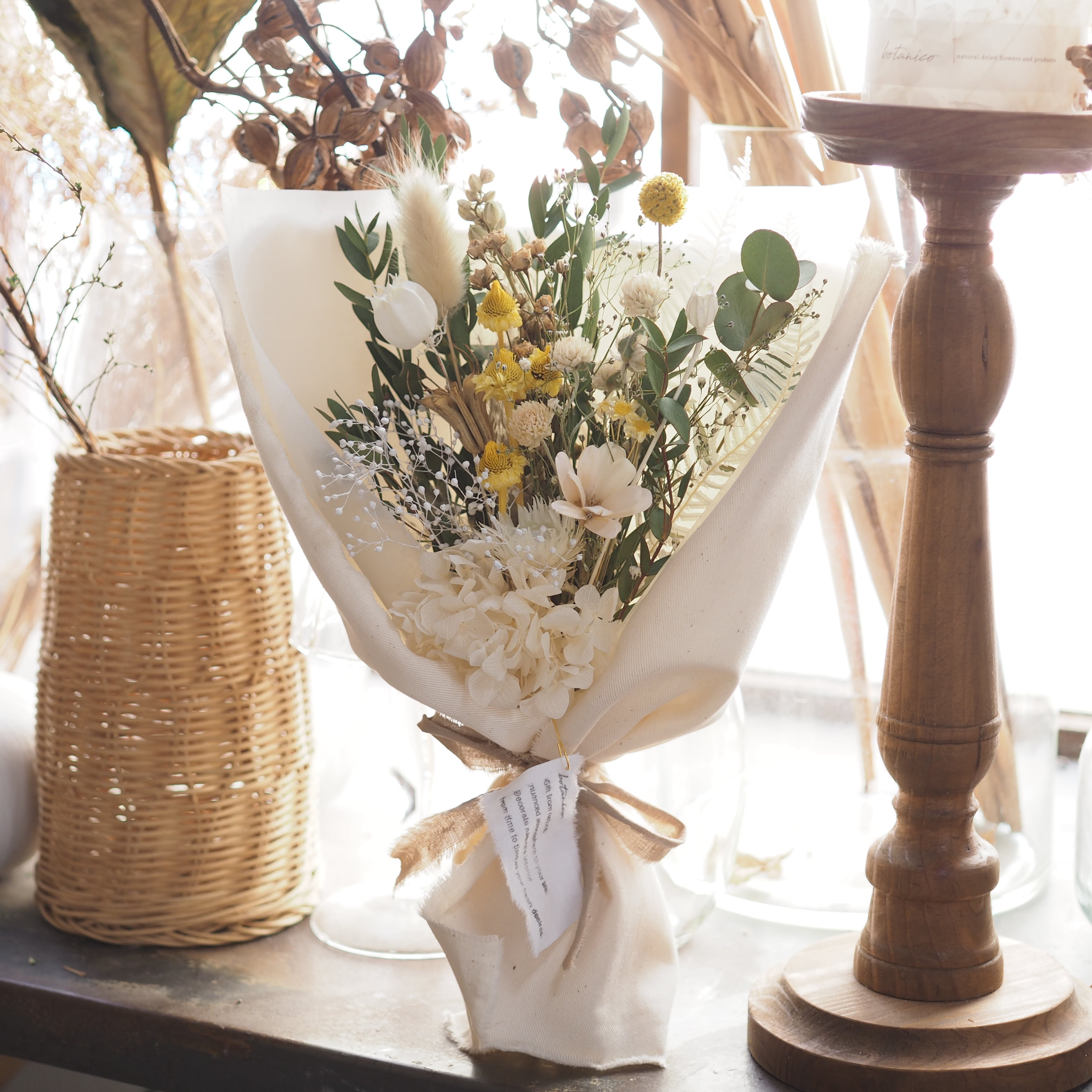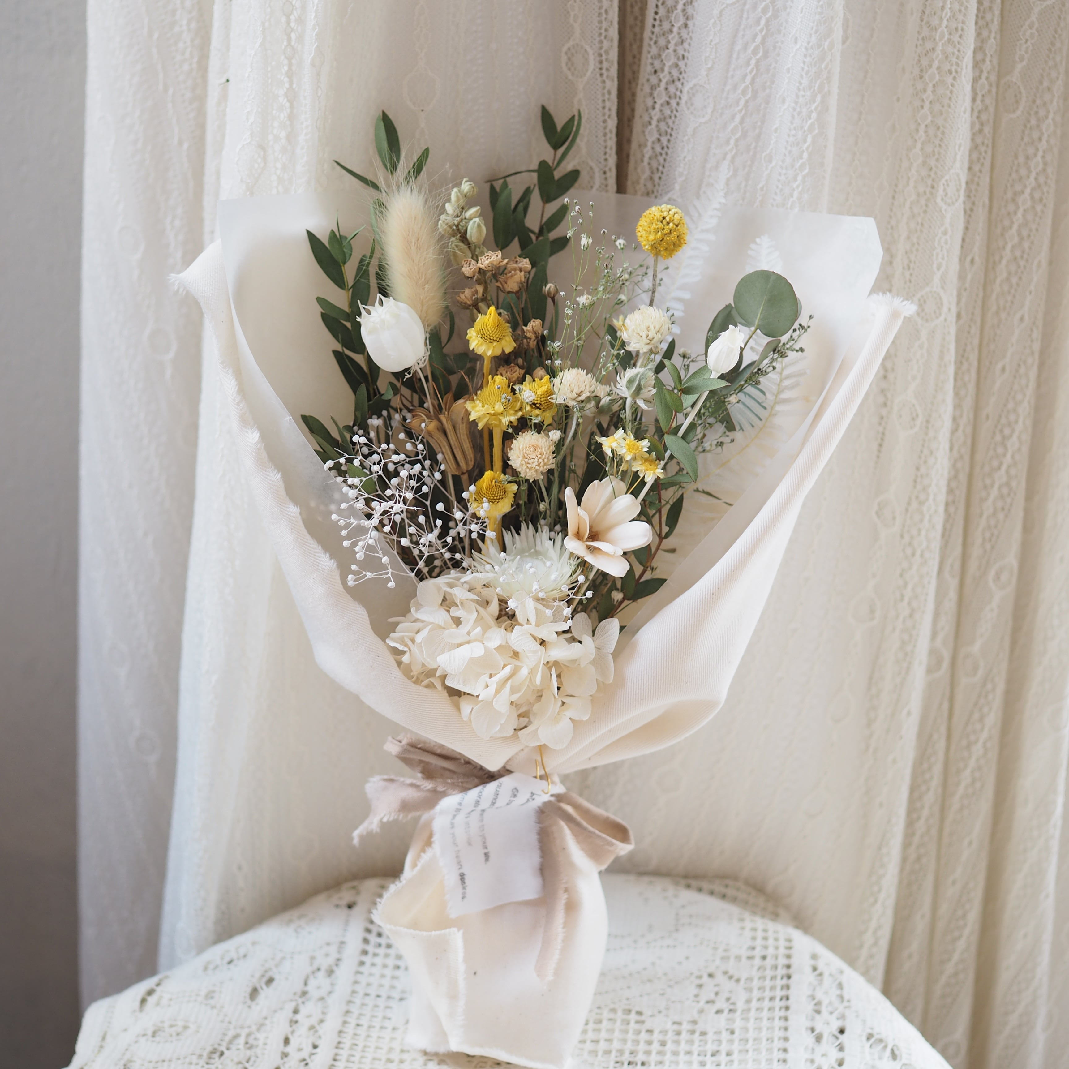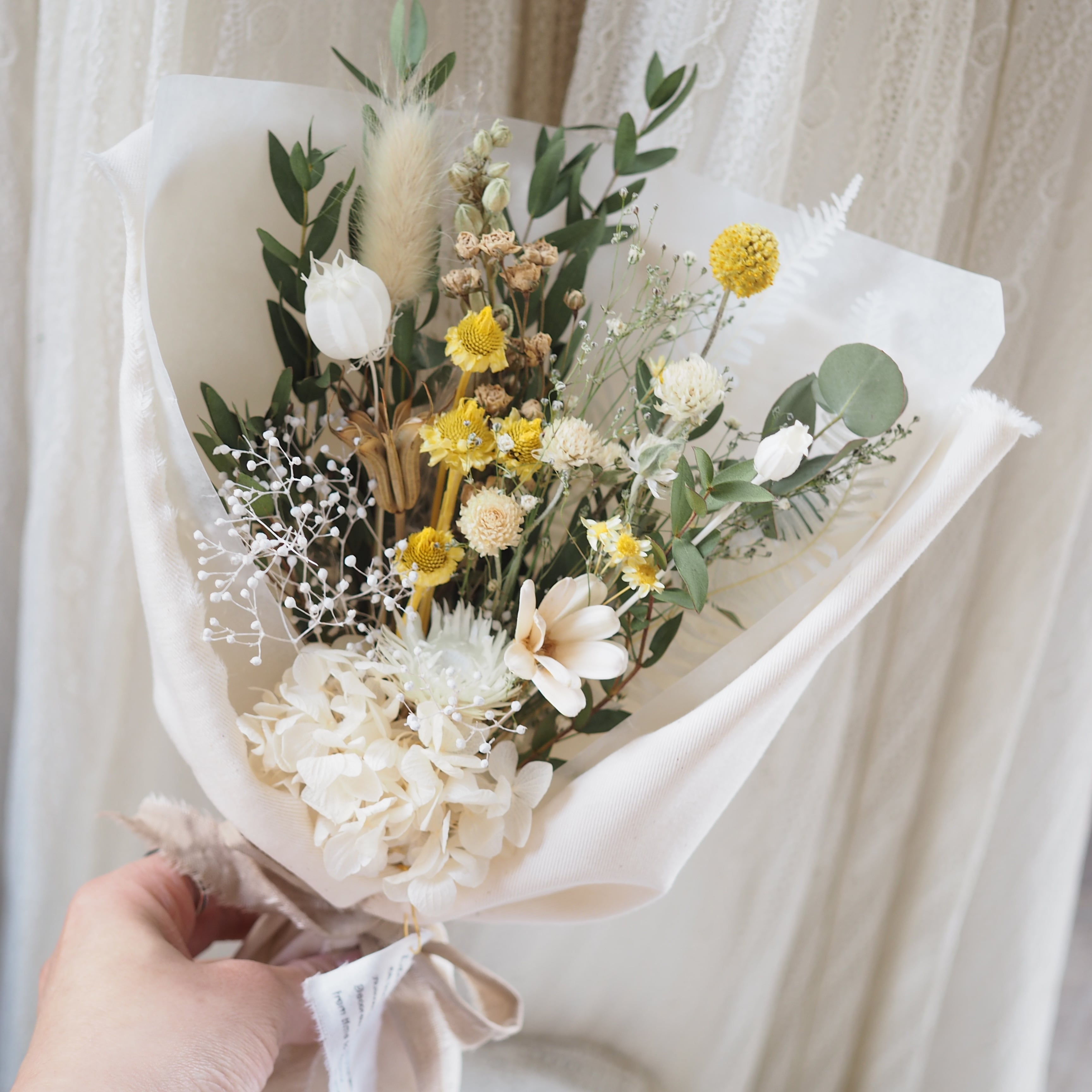 可愛い小花をたっぷり束ね、布で包んだブーケです。