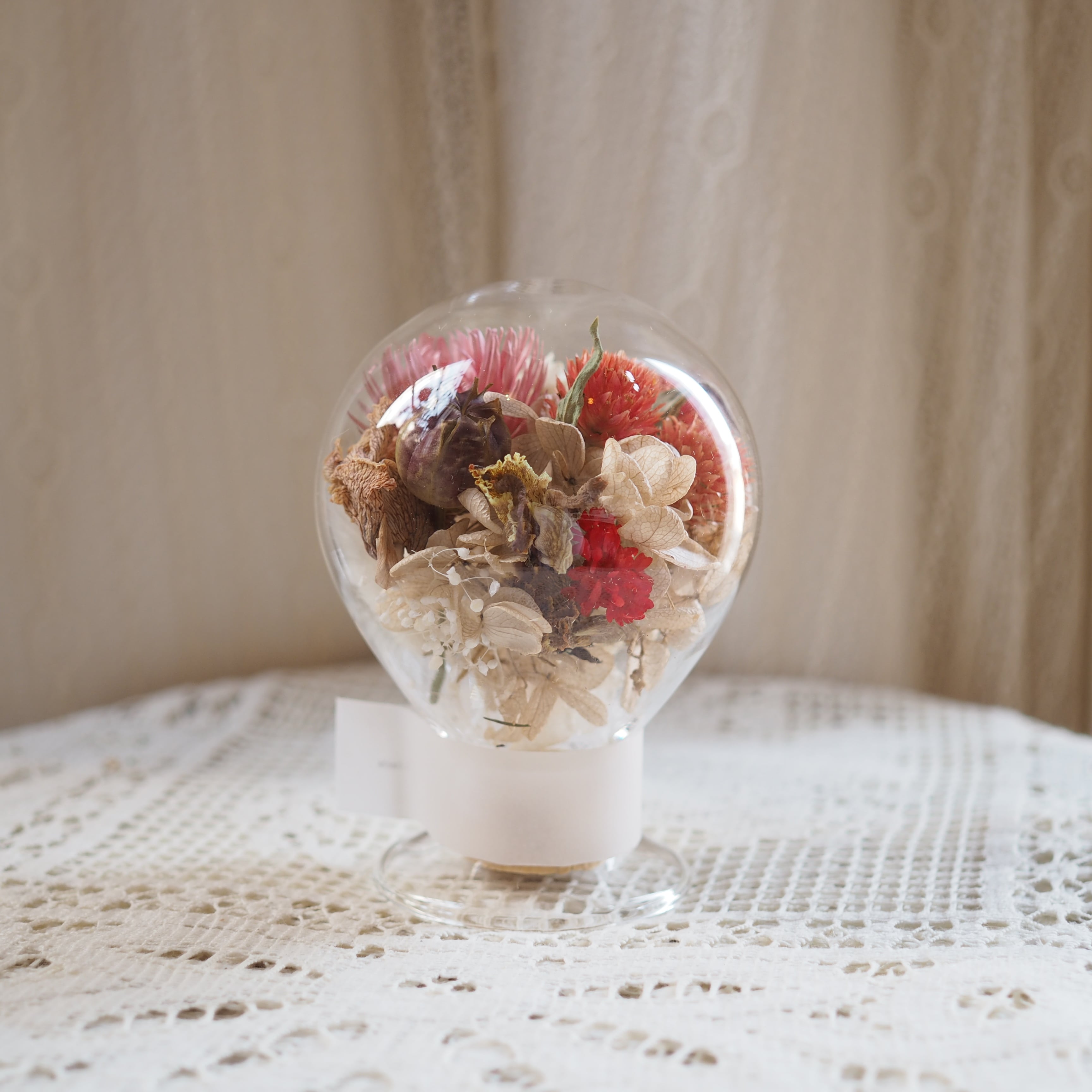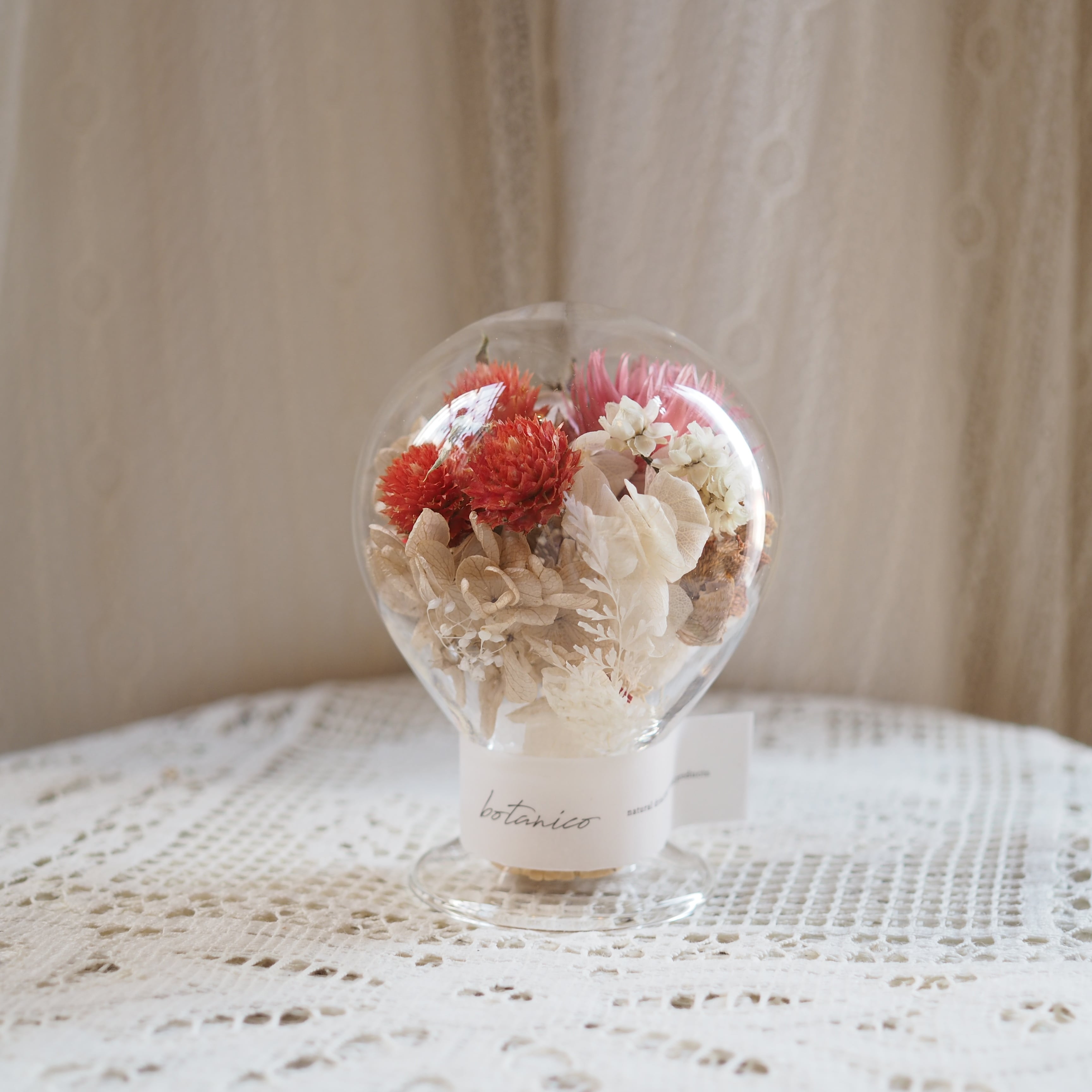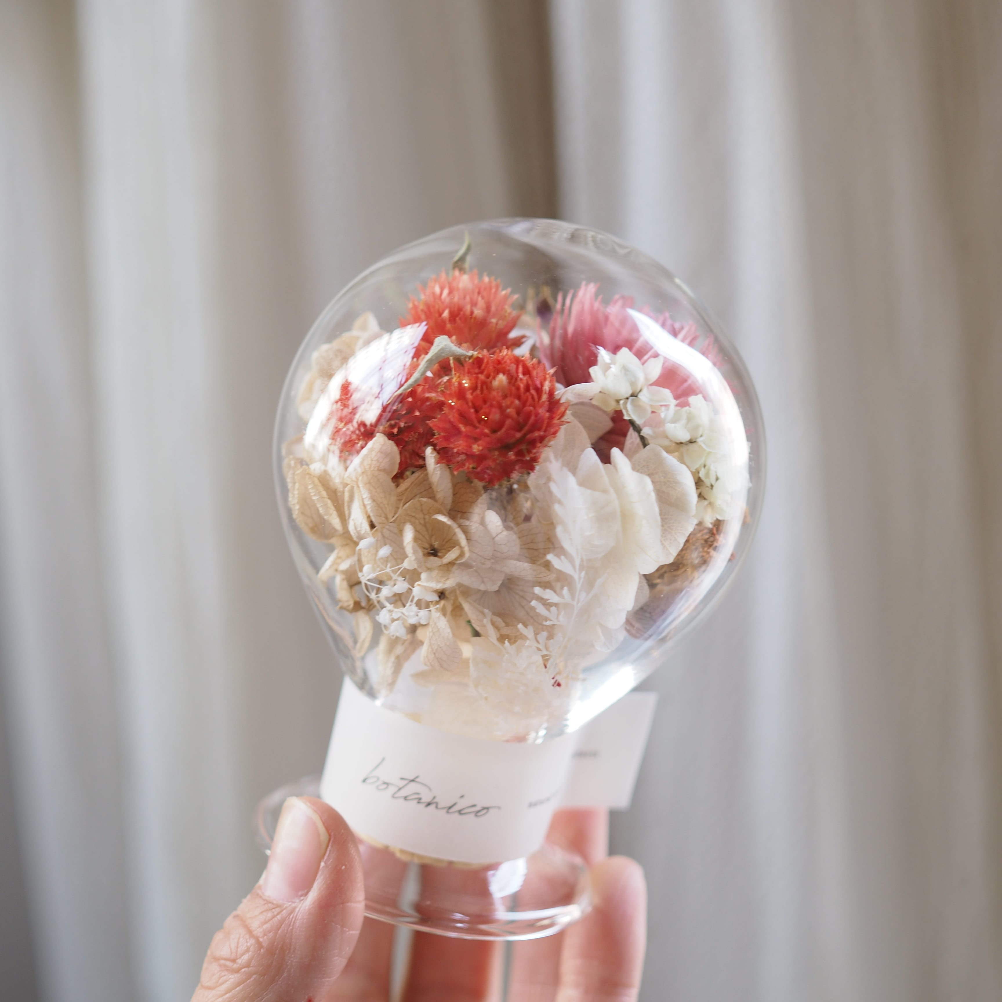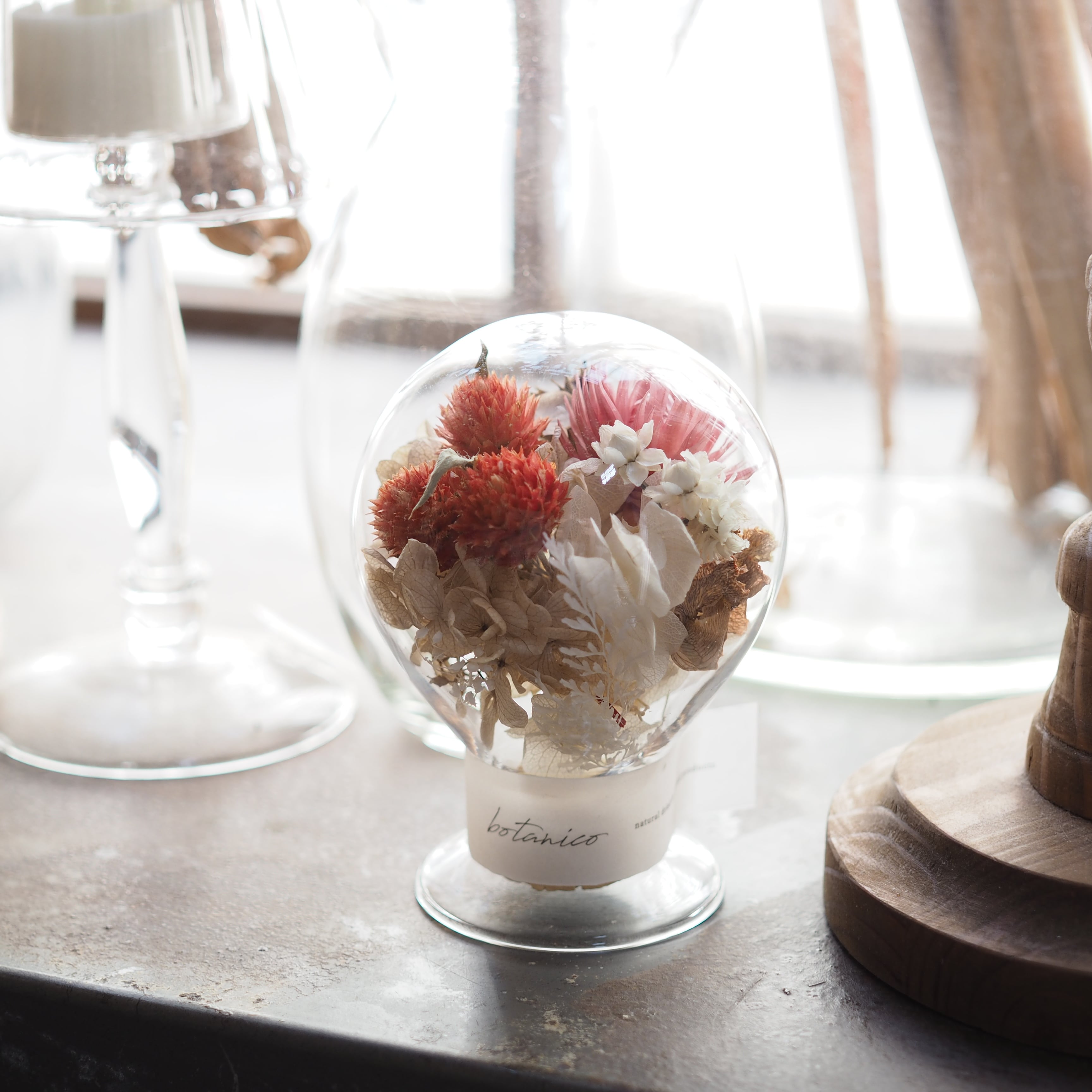 手作業で丁寧に仕上げたコルク瓶の中には、通年で扱いやすいドライフラワーを使用しています。