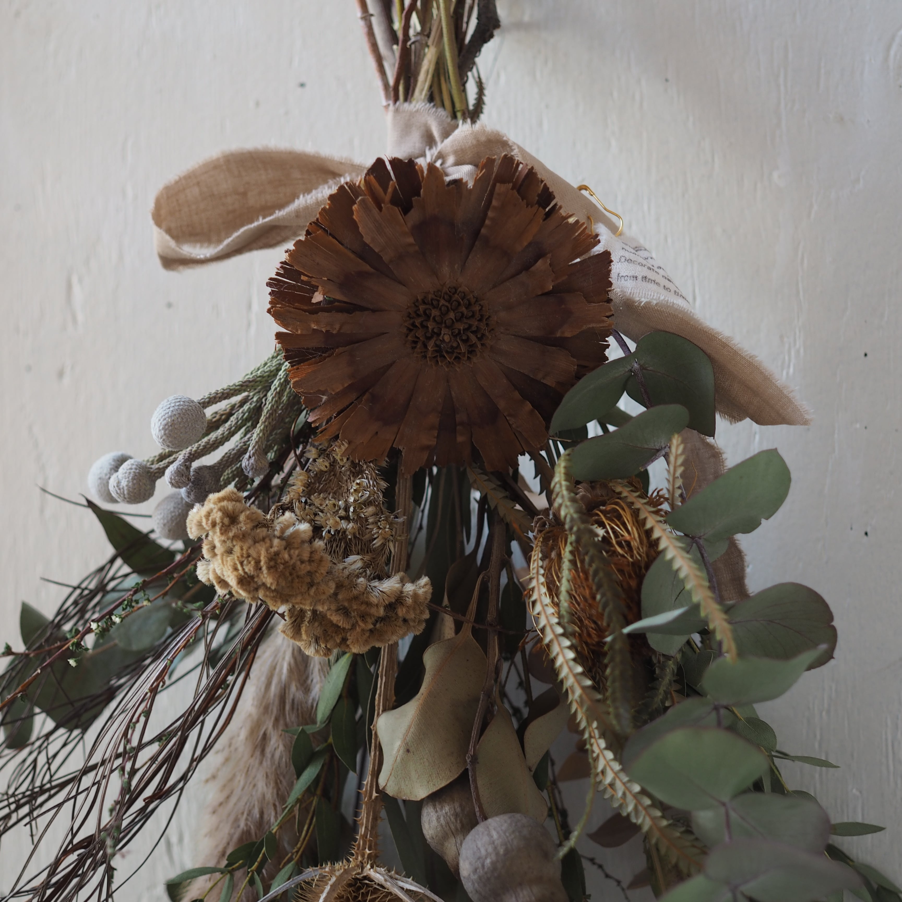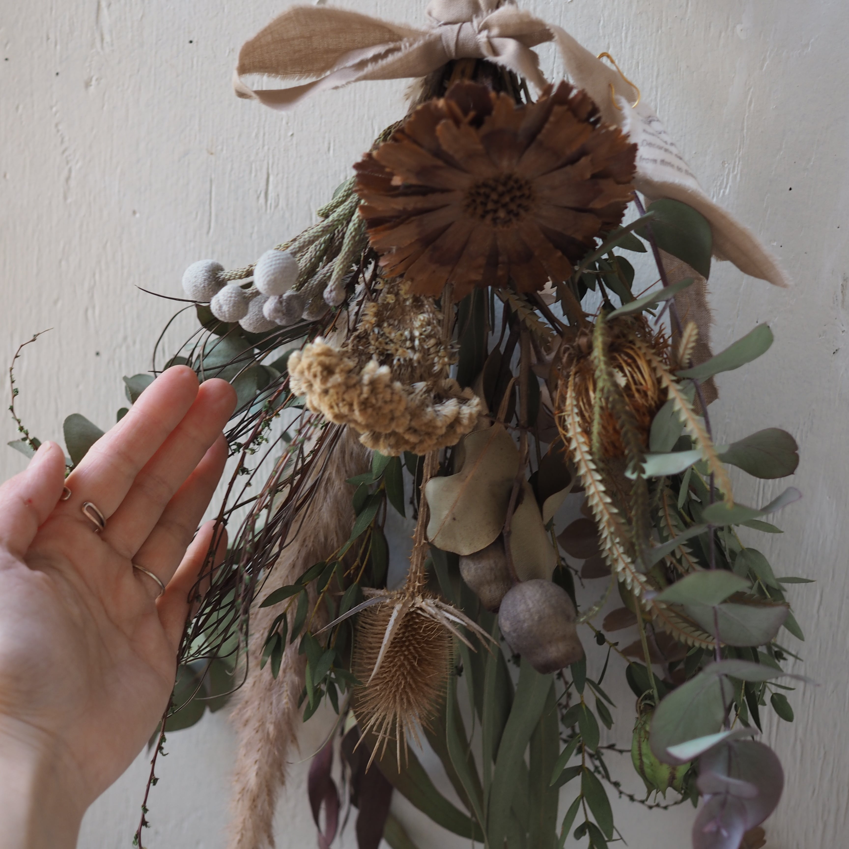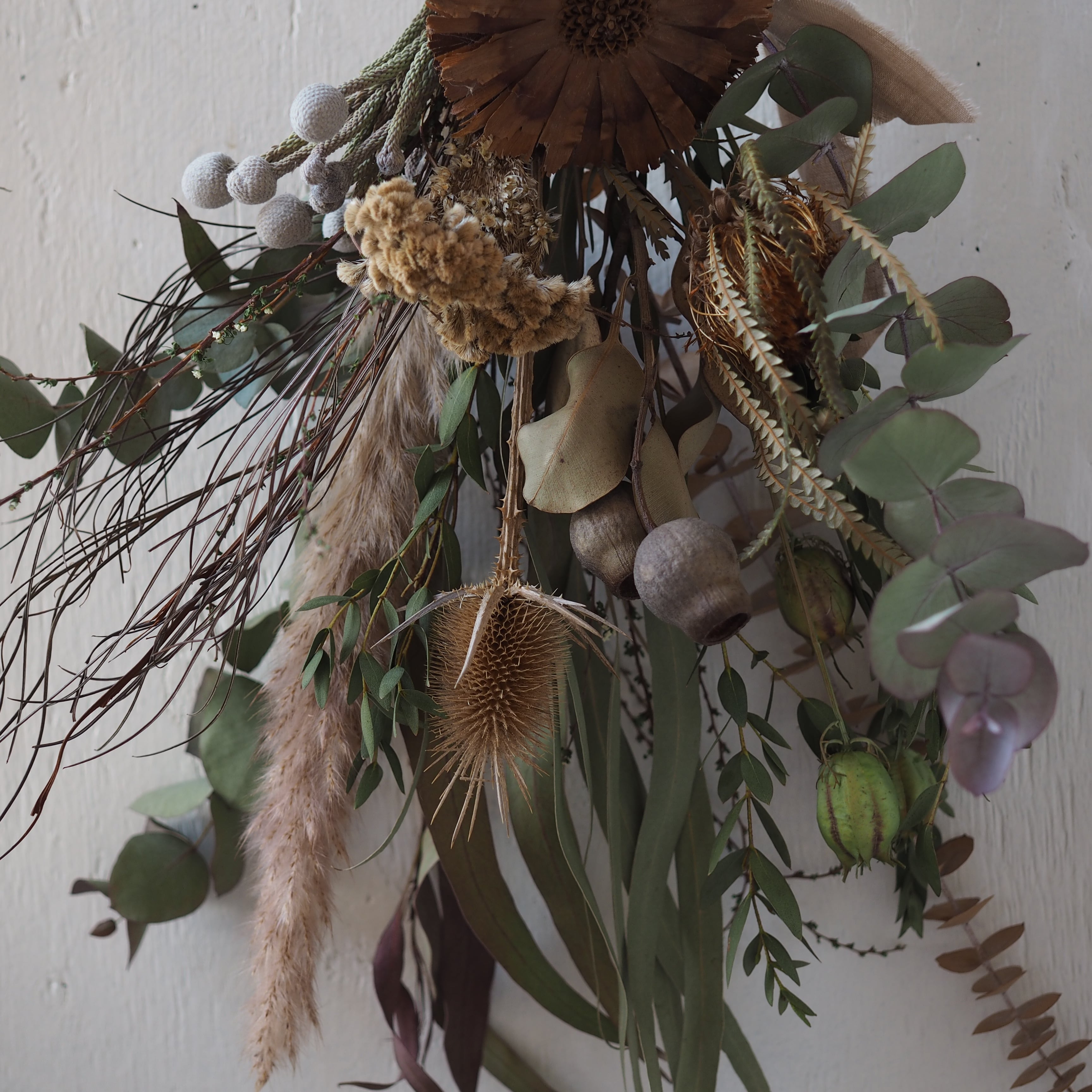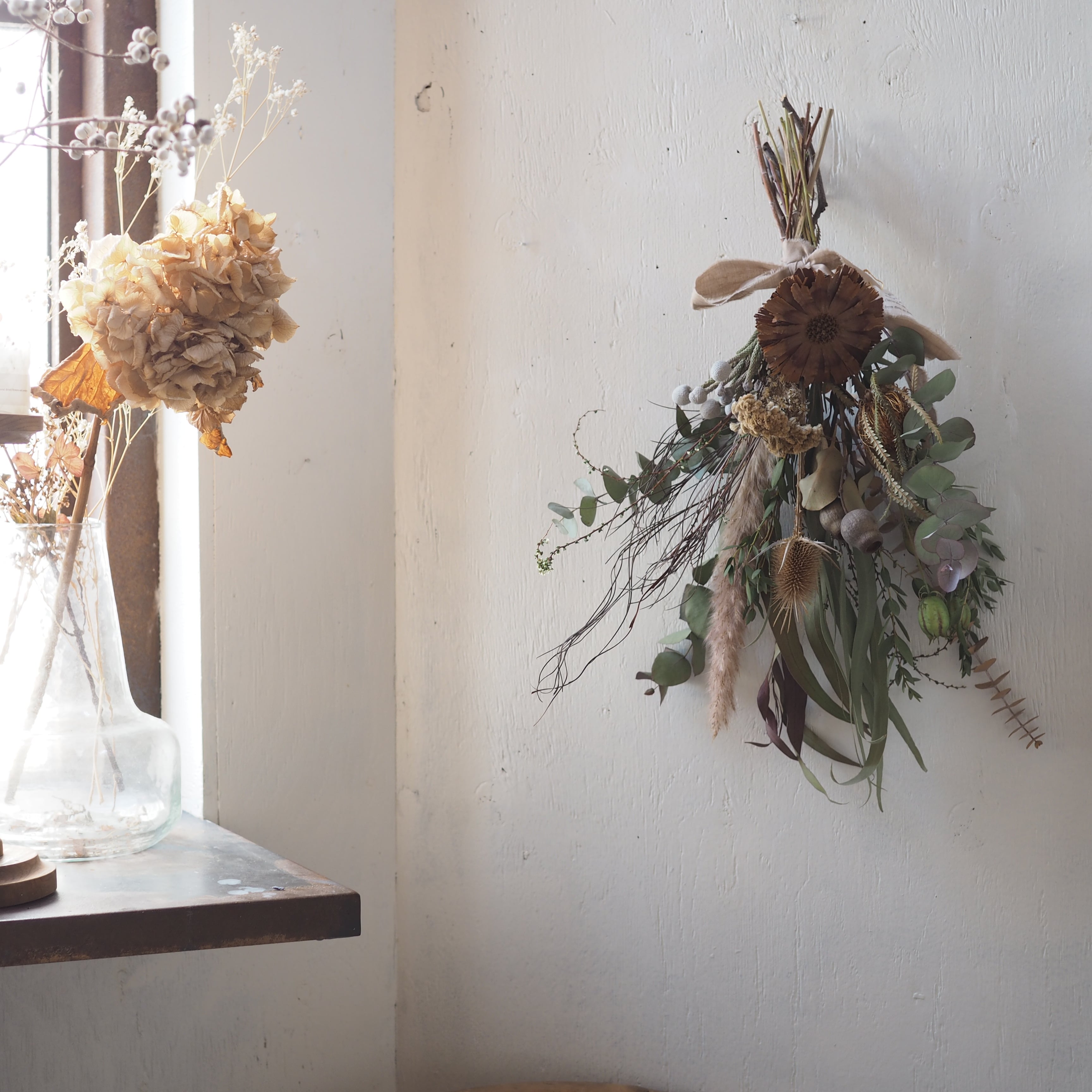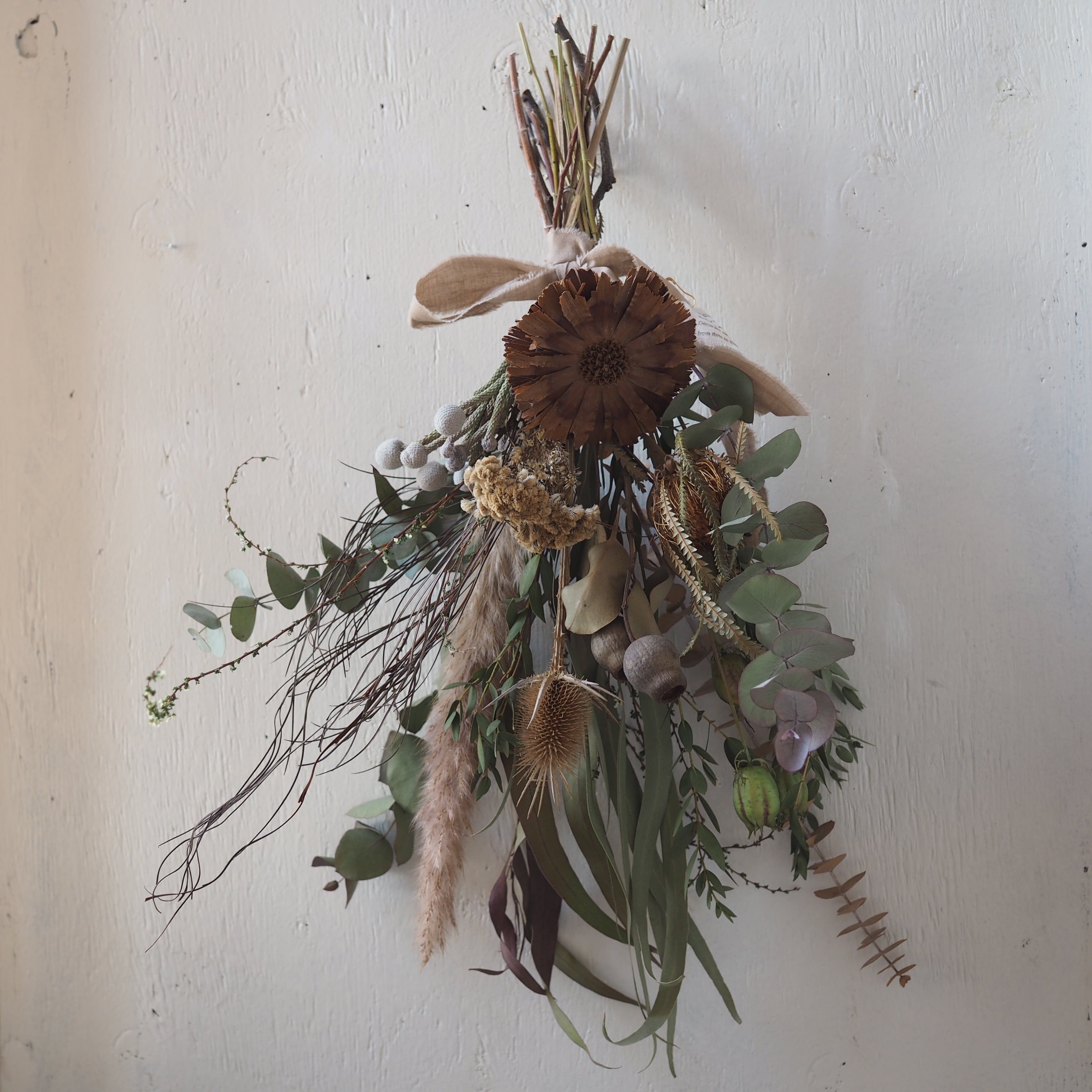 ドライフラワーの雰囲気溢れるスワッグに仕立てました。