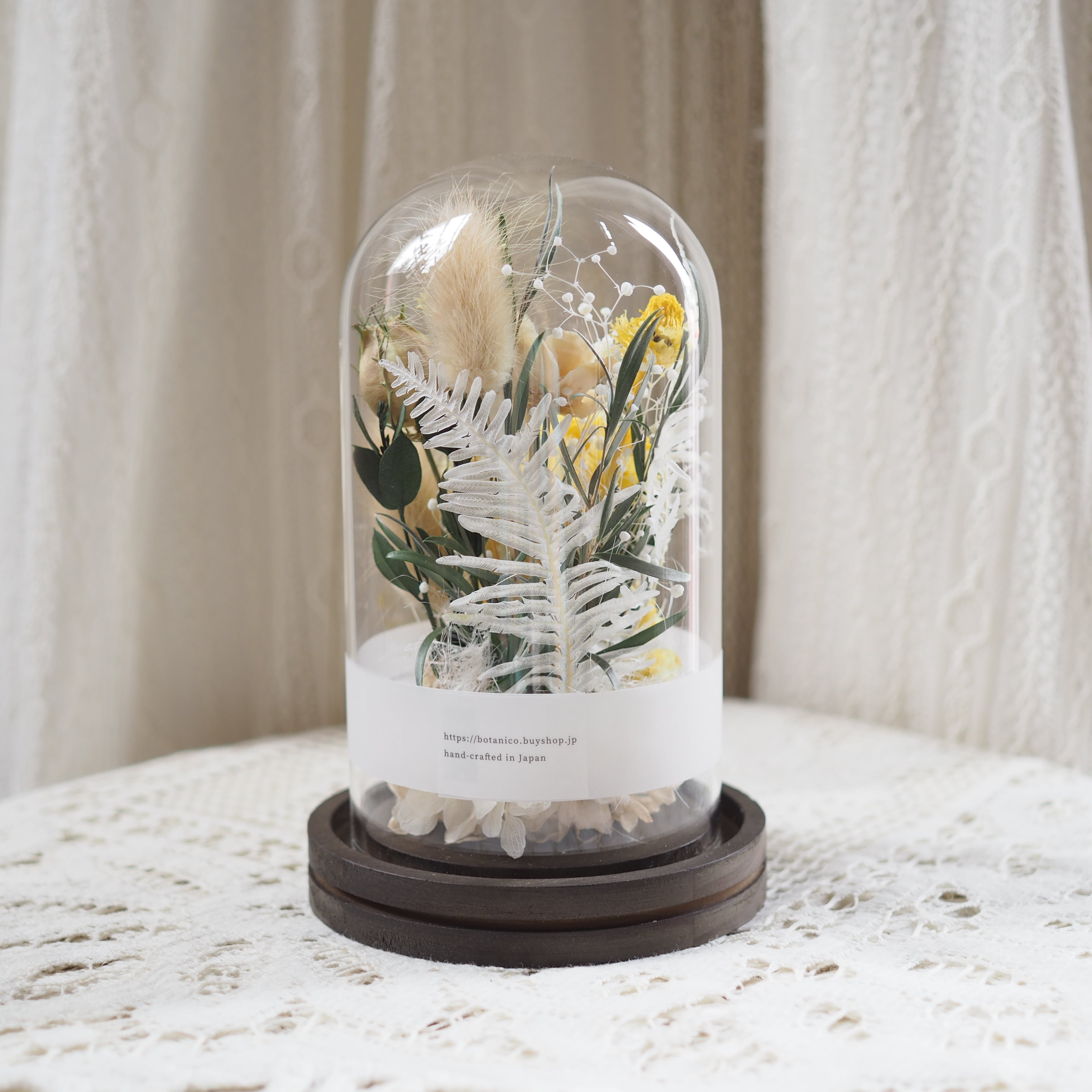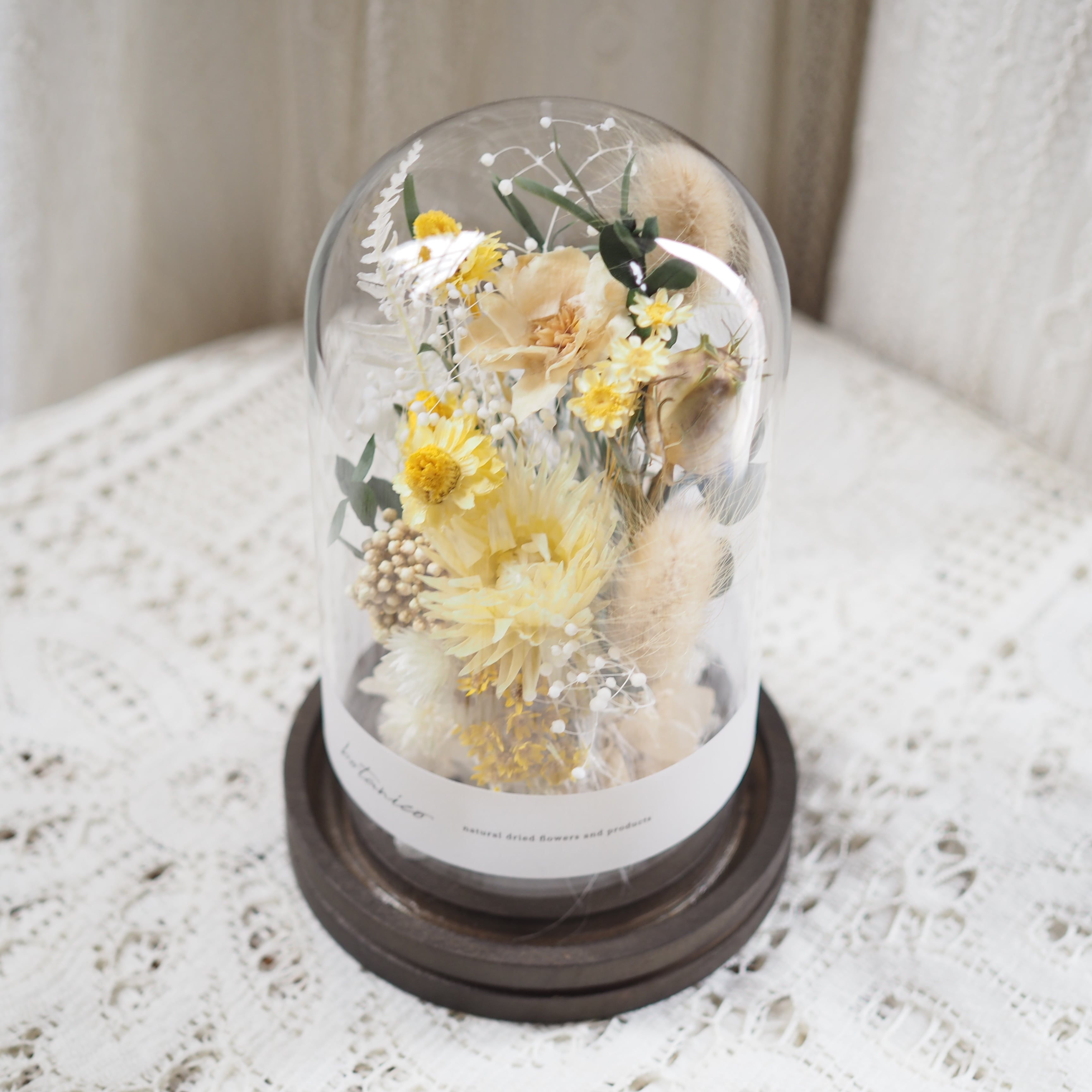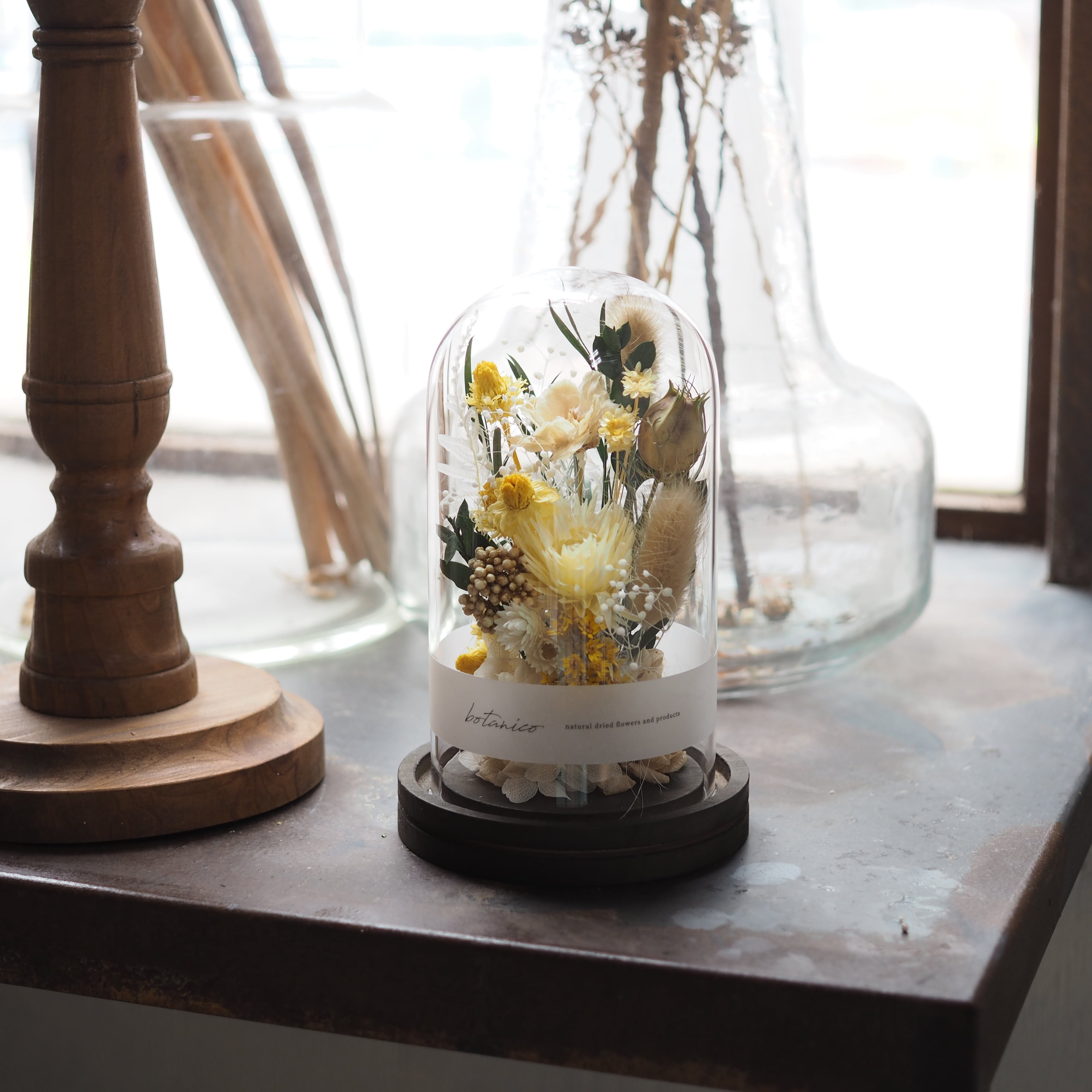 木の台座に、花や葉をひとつひとつ丁寧に配置し、ガラスドームでやさしく包みました。