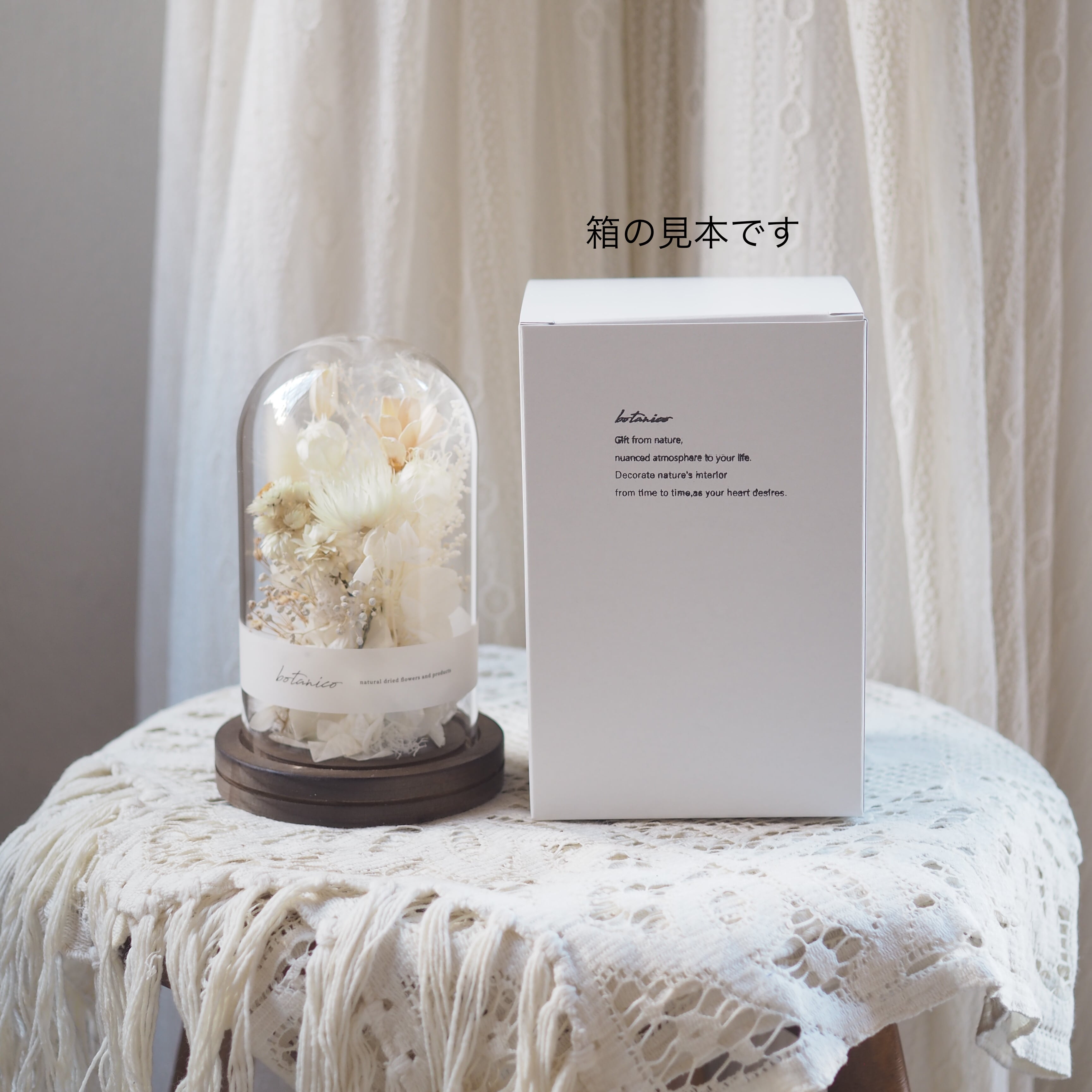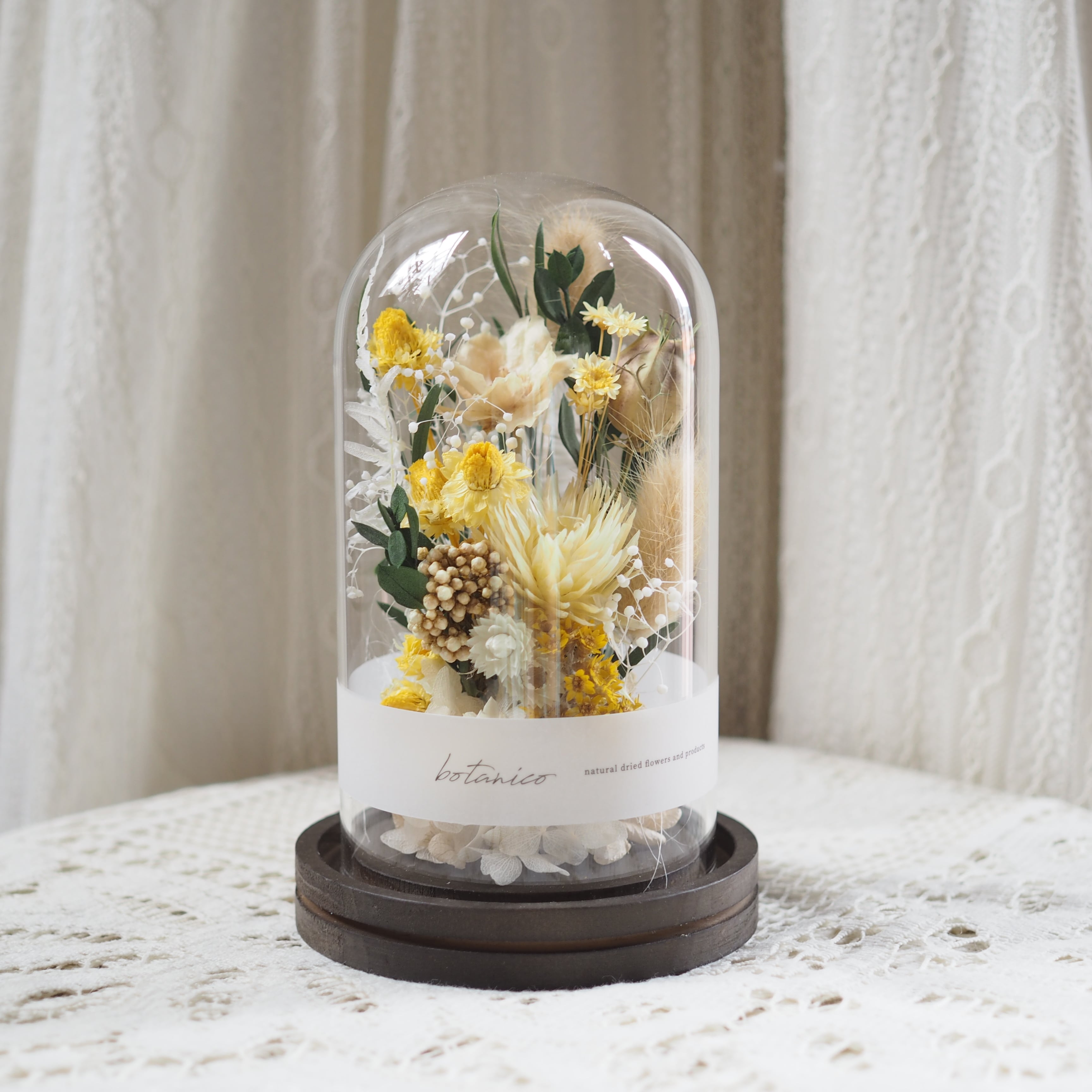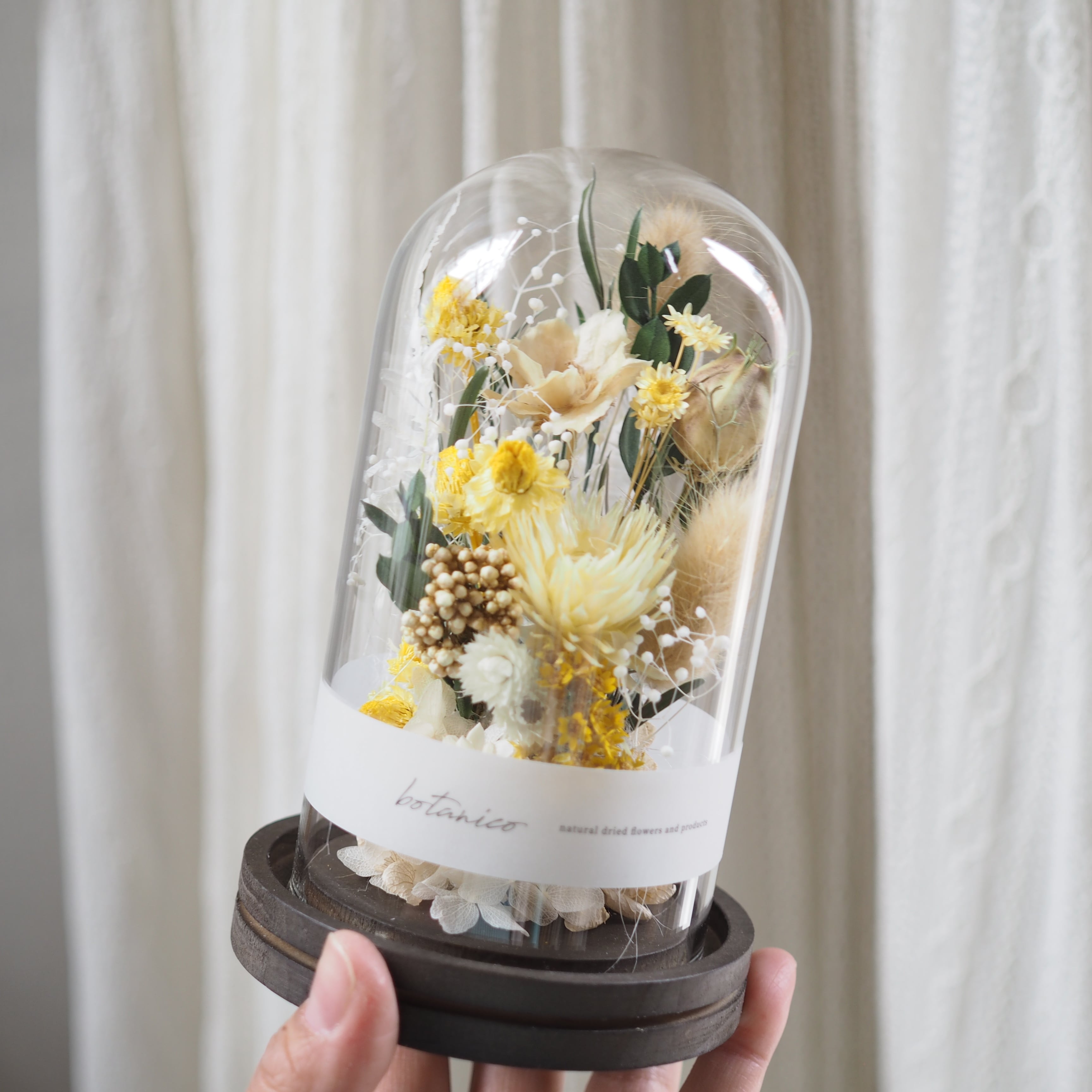 木の台座に、花や葉をひとつひとつ丁寧に配置し、ガラスドームでやさしく包みました。