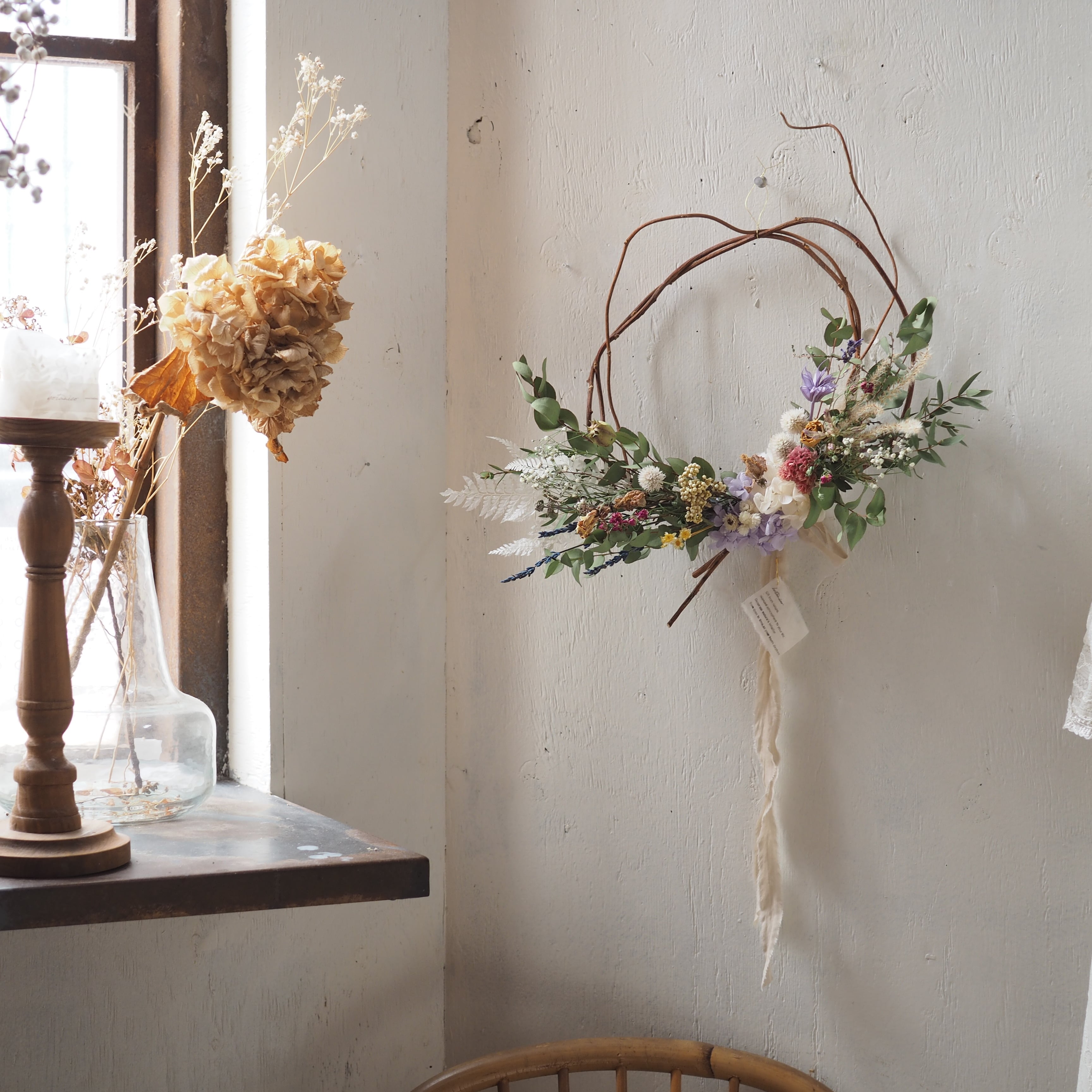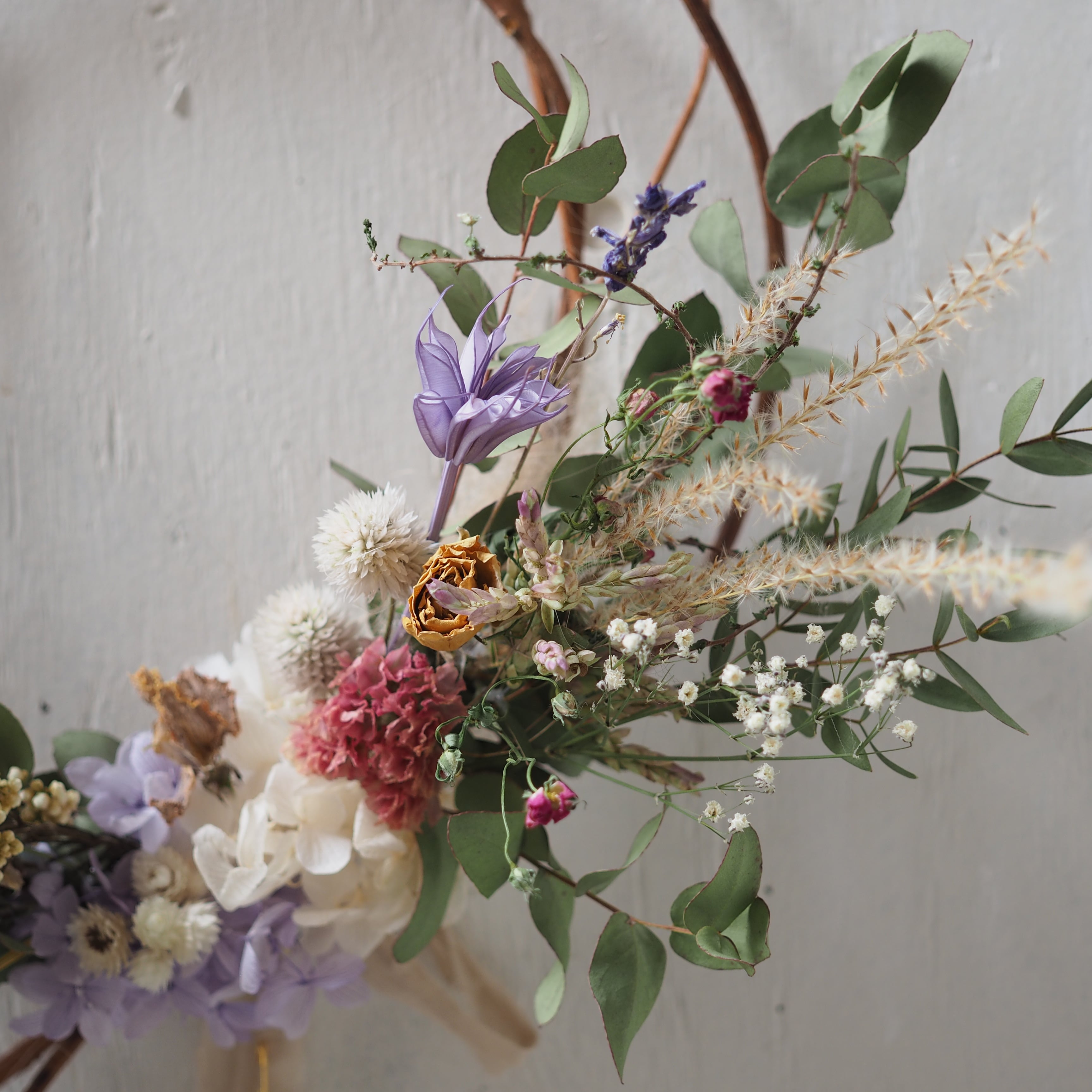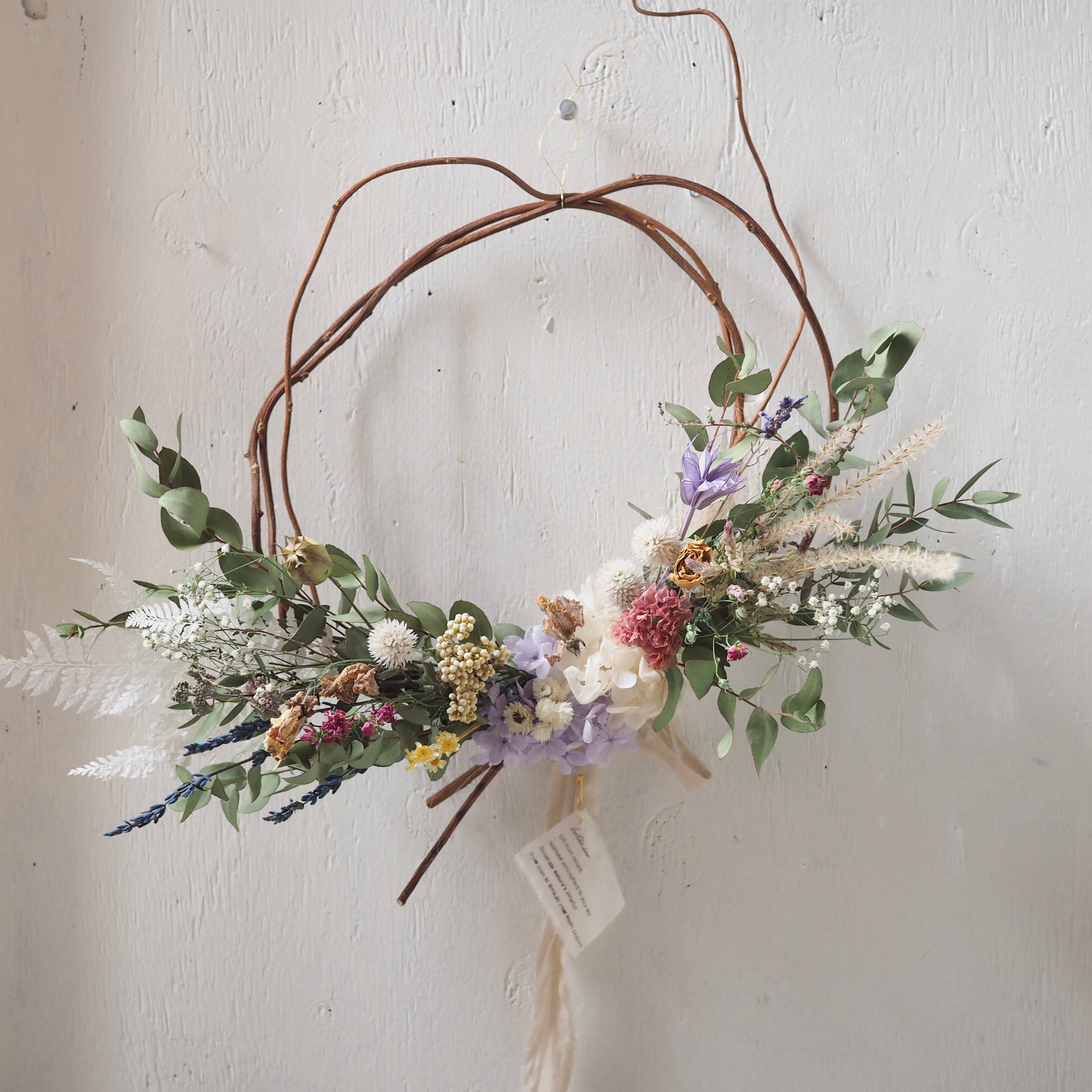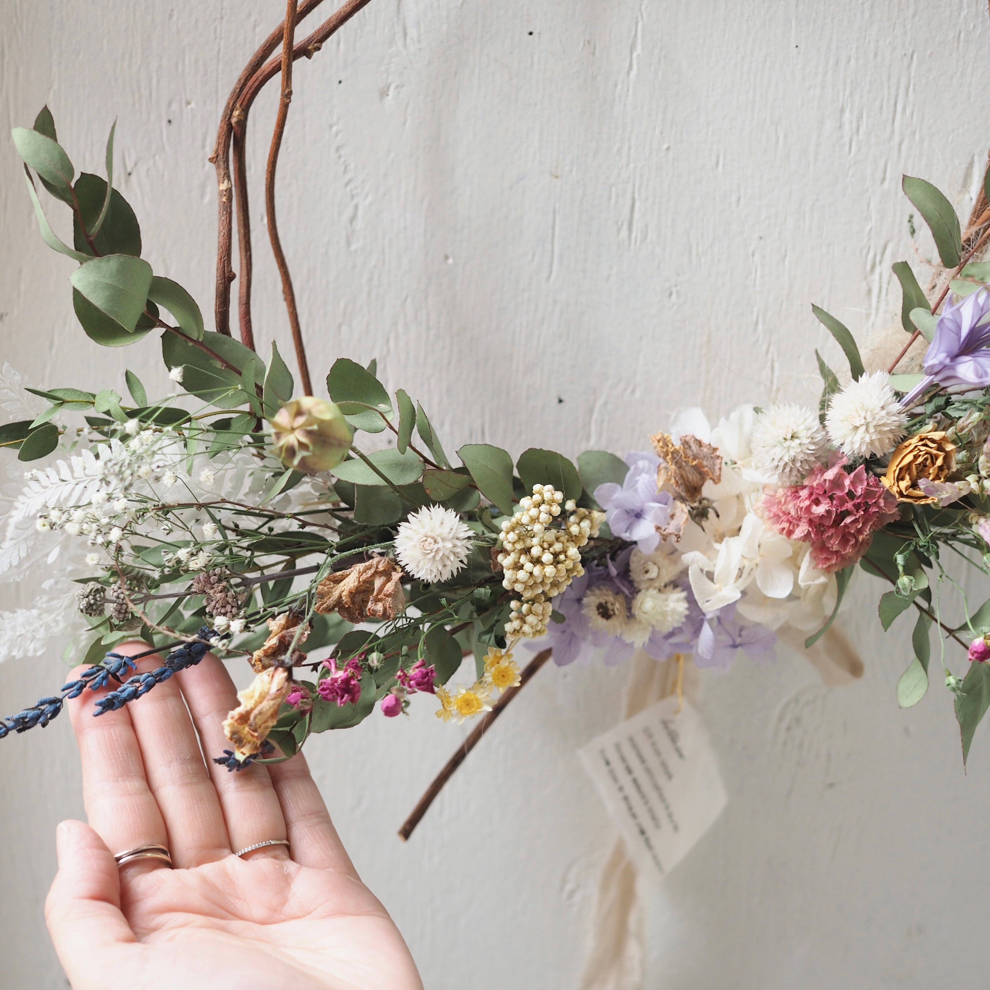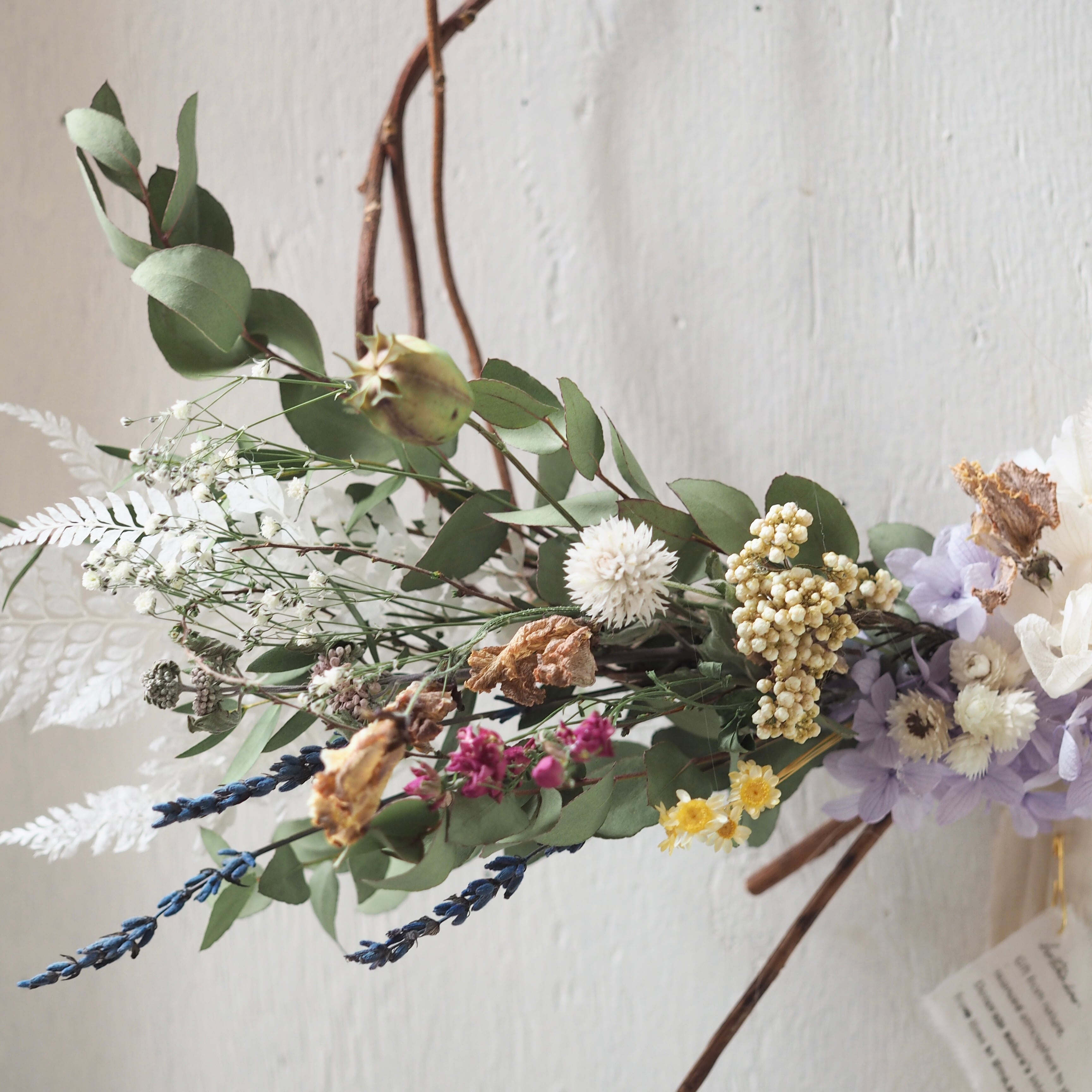 自然な枝ぶりをそのまま活かし、繊細な花や葉を添えた、ナチュラルなドライフラワーリースです。