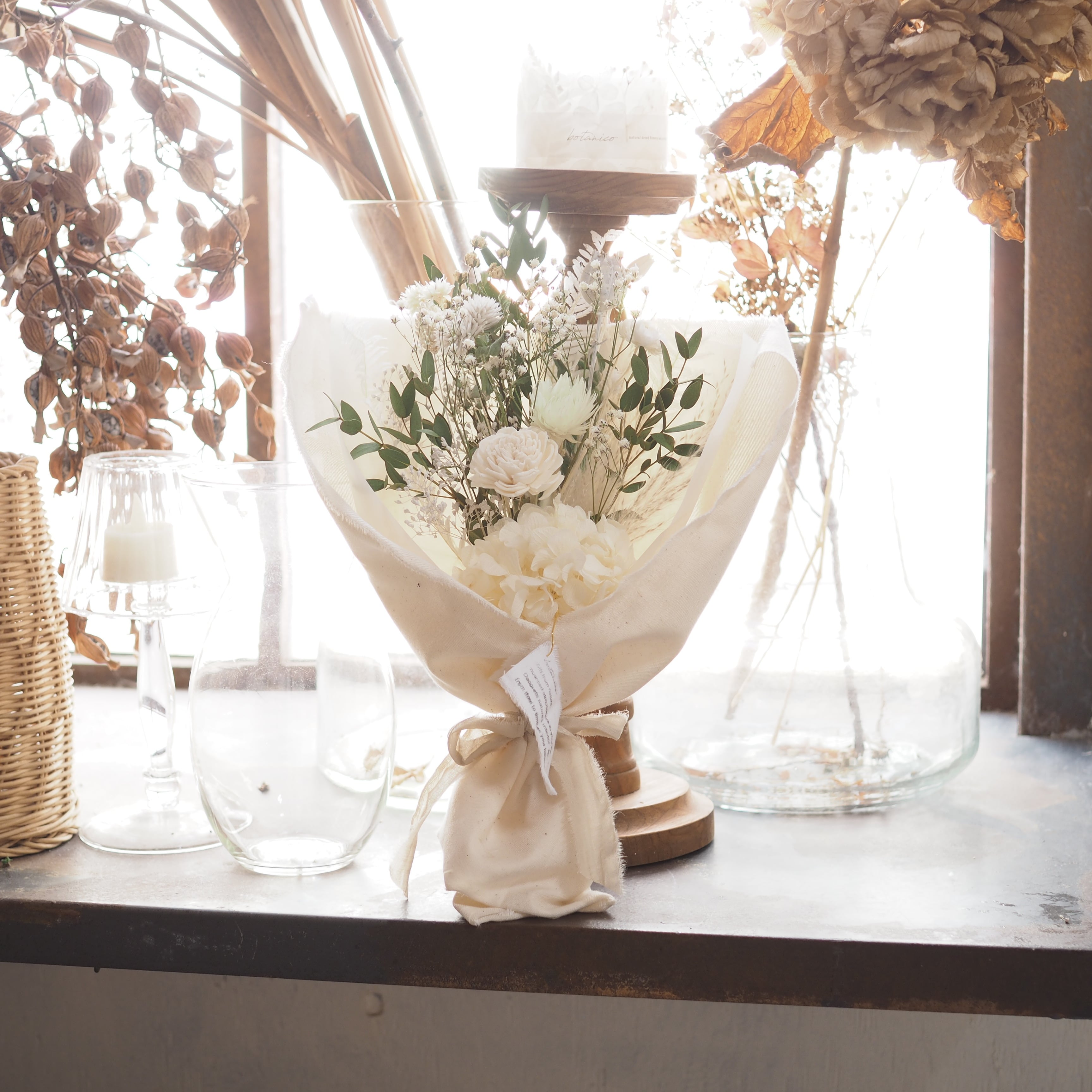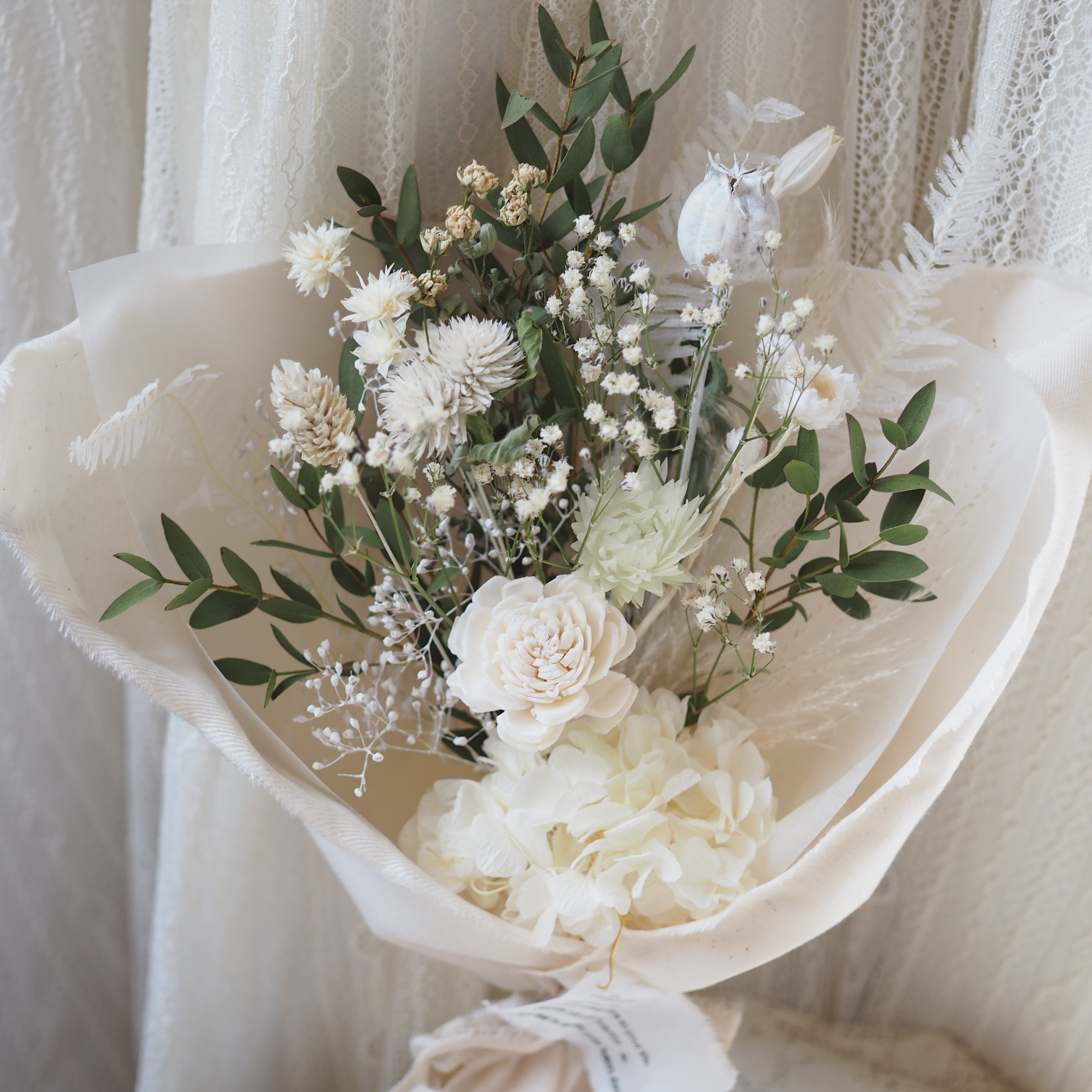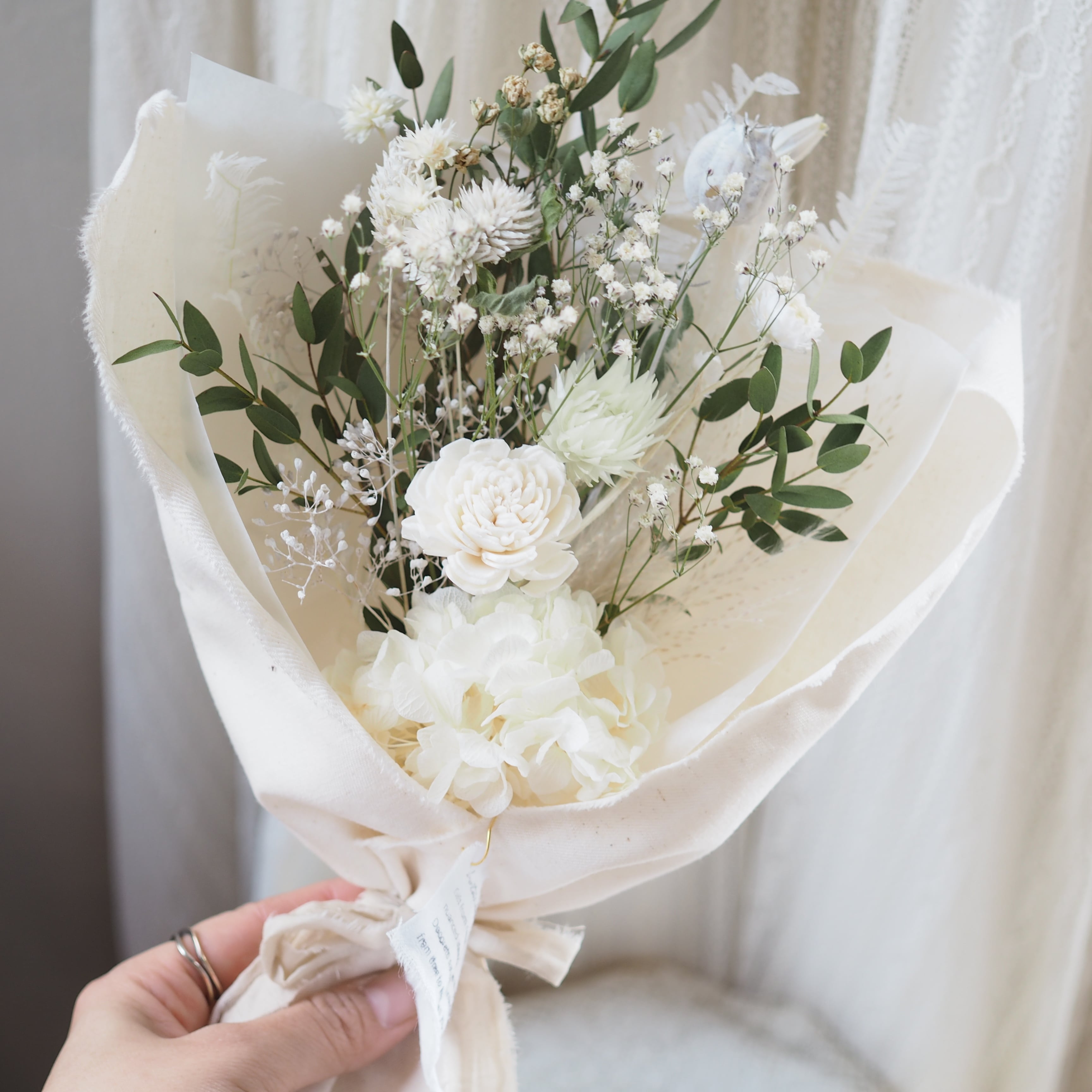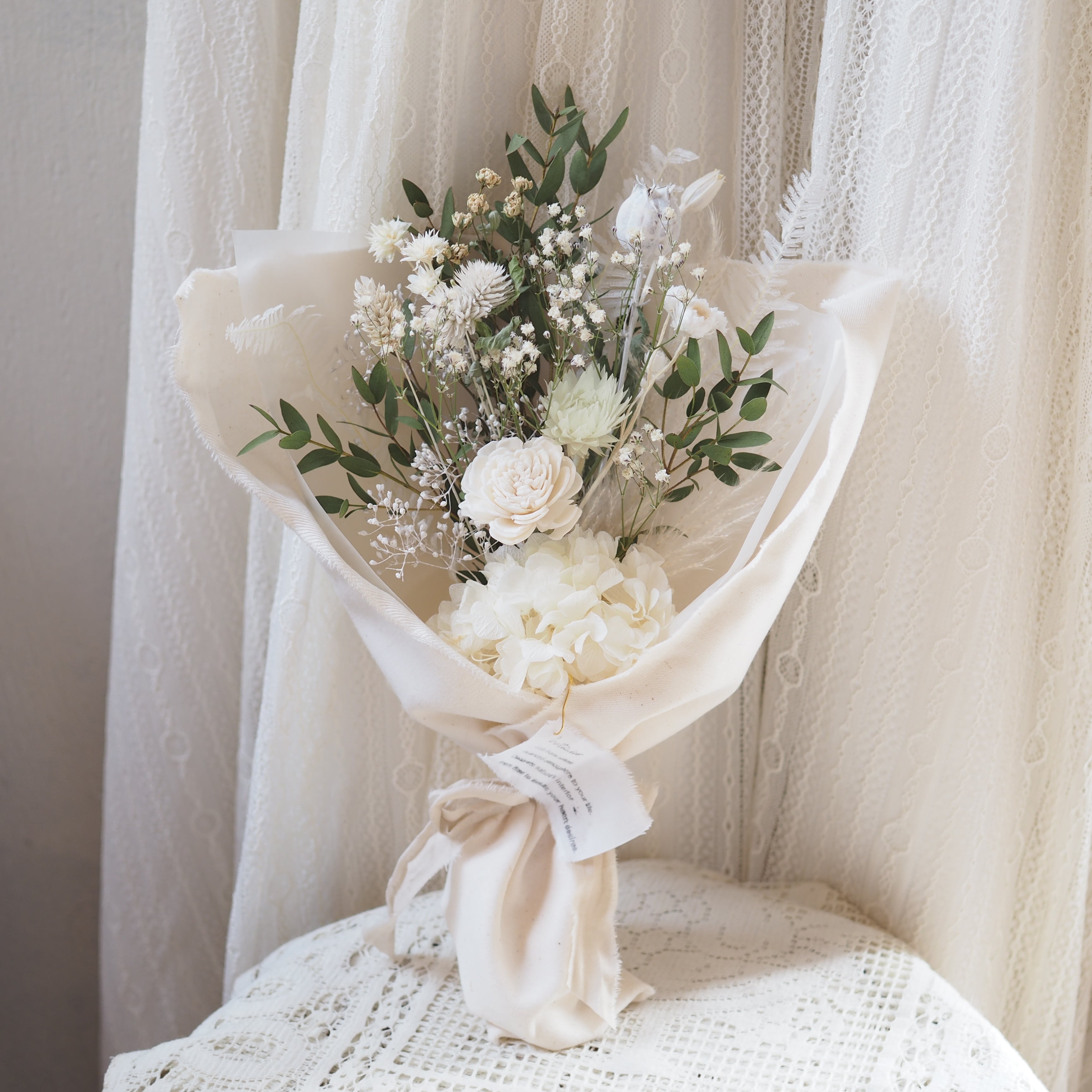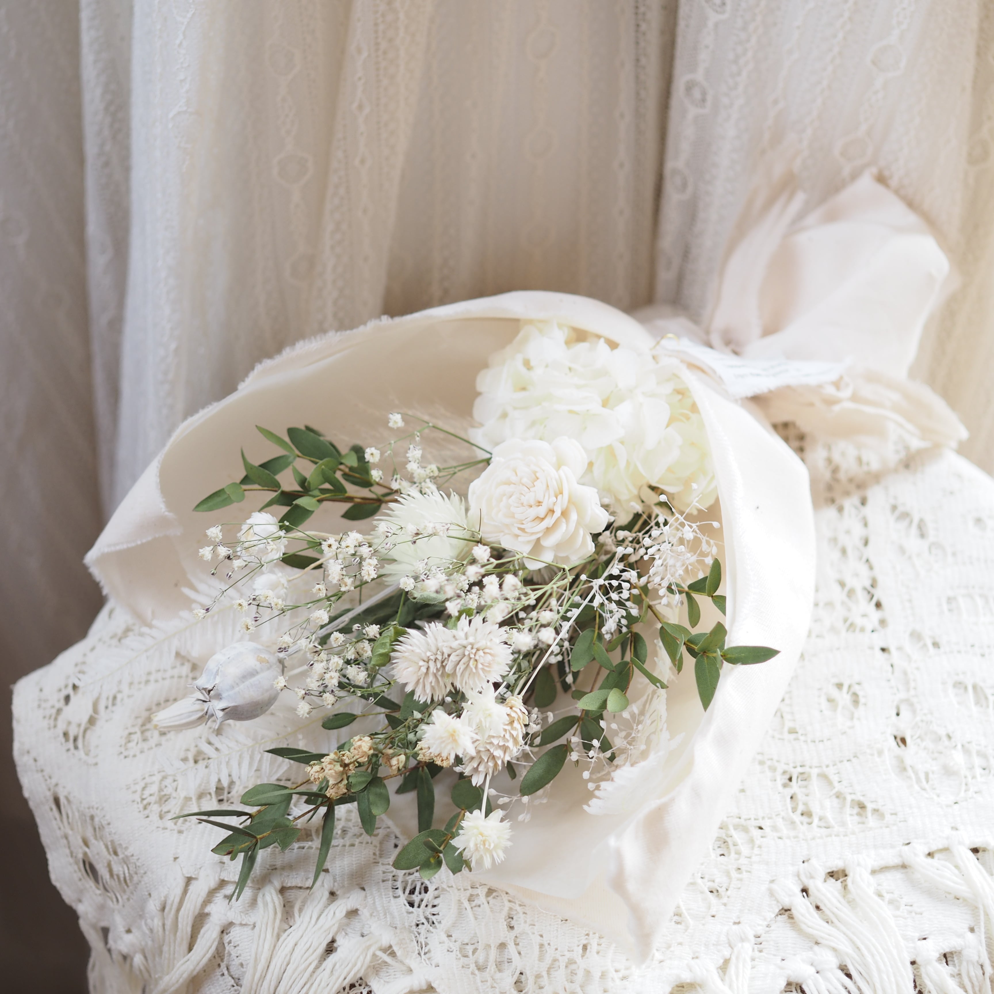 可愛い小花をたっぷり束ね、布で包んだブーケです。