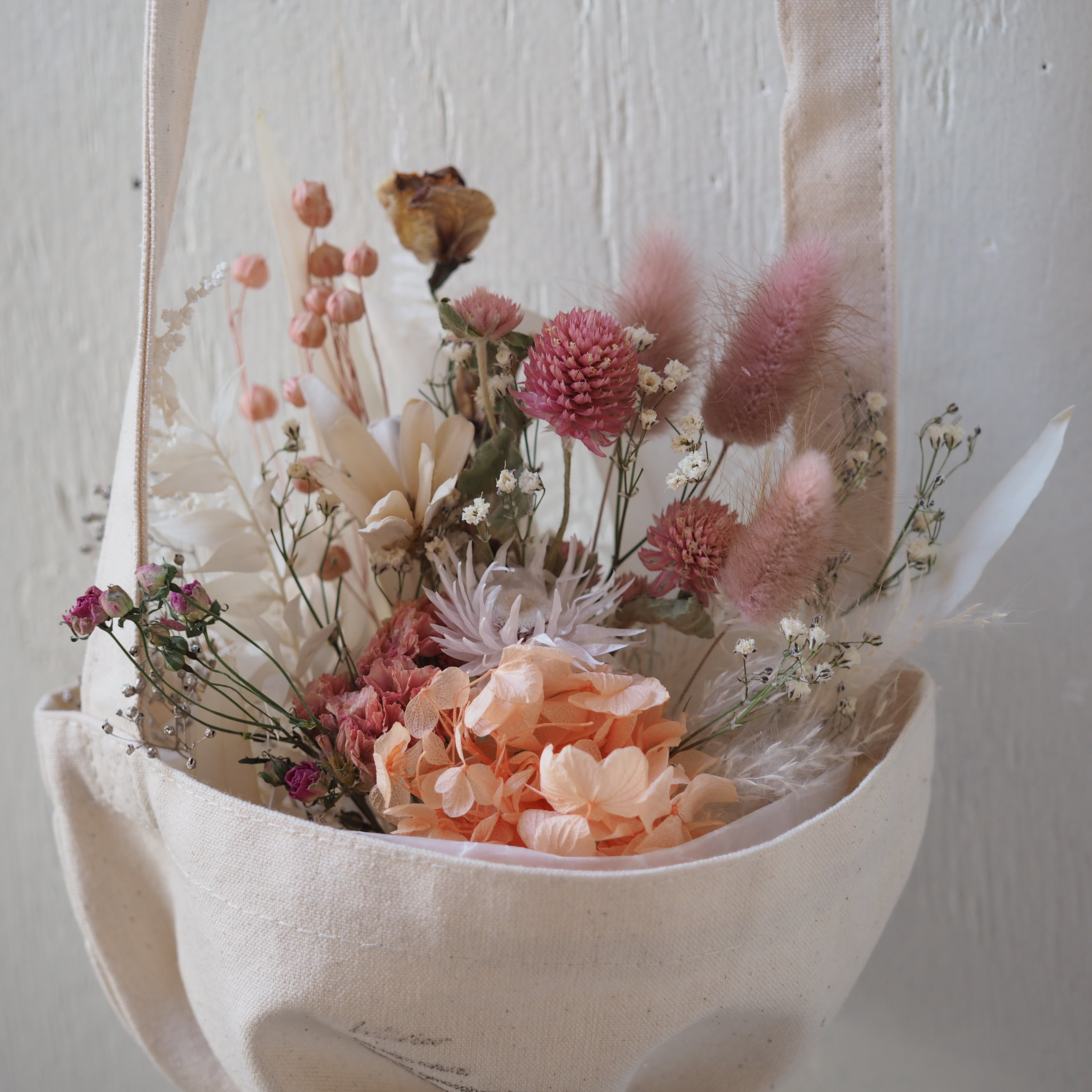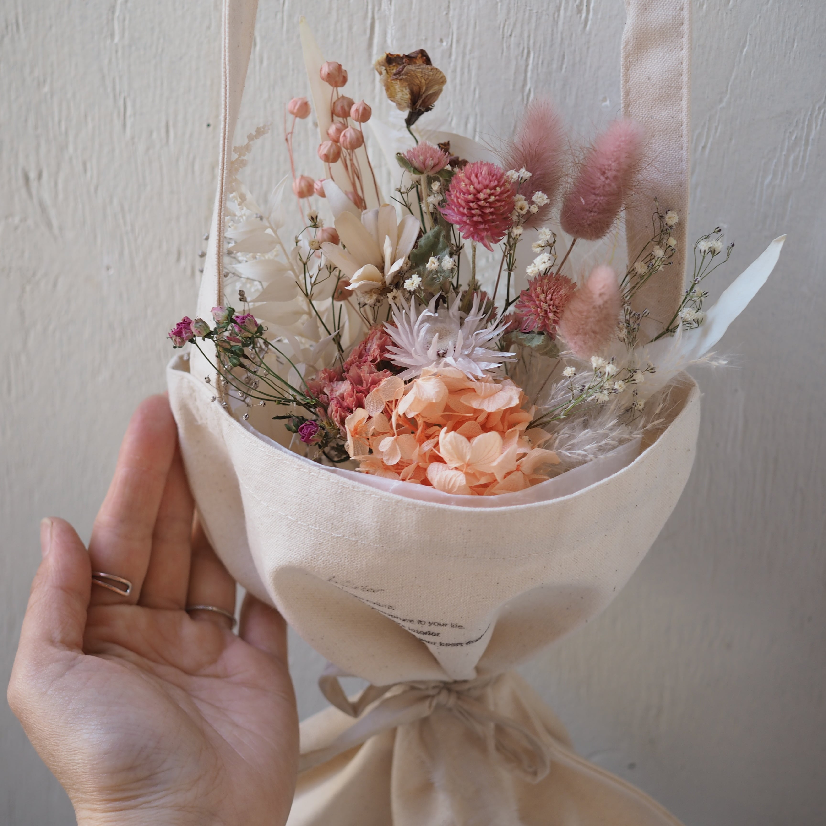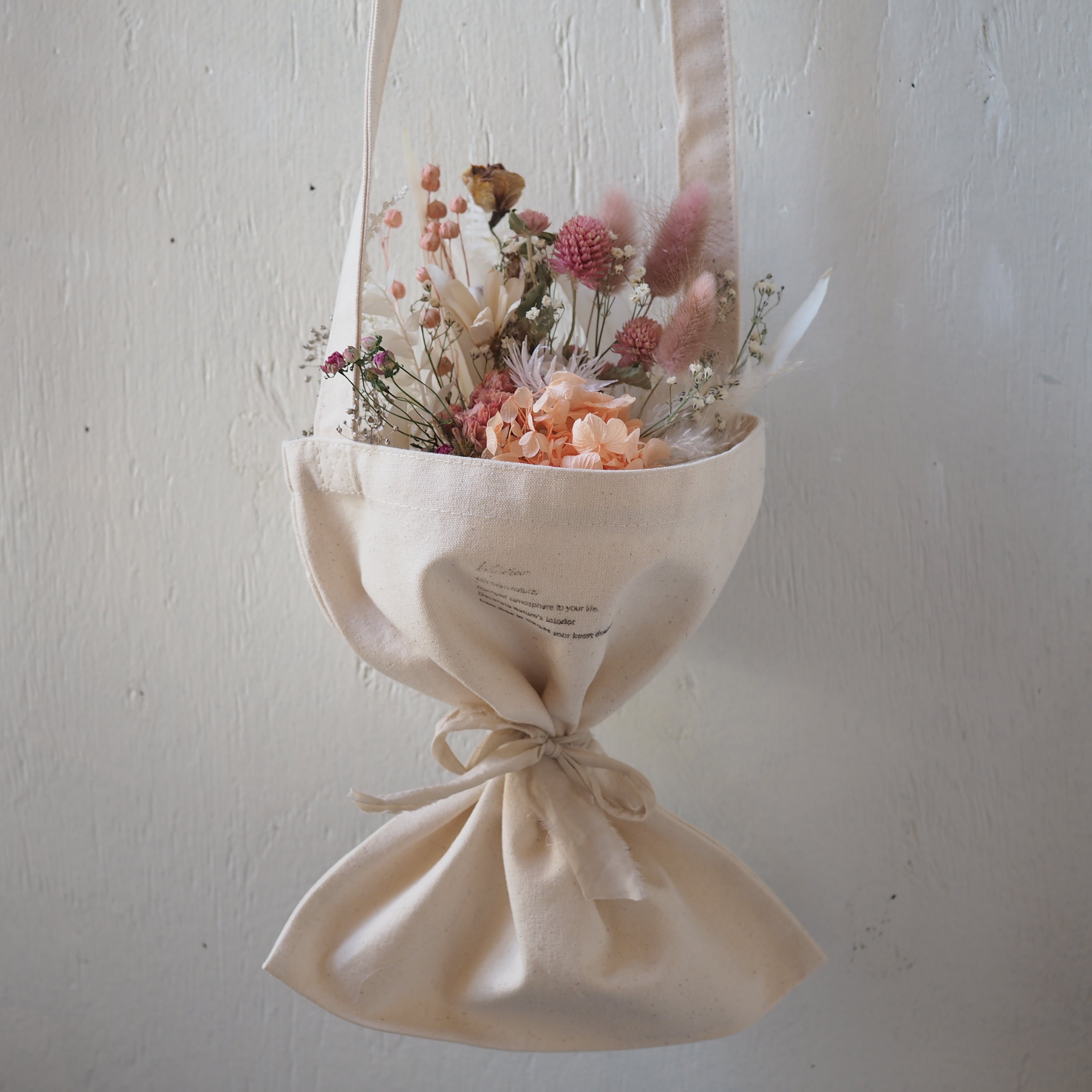 可愛いドライフラワーのブーケをポシェットタイプの花束にしました。