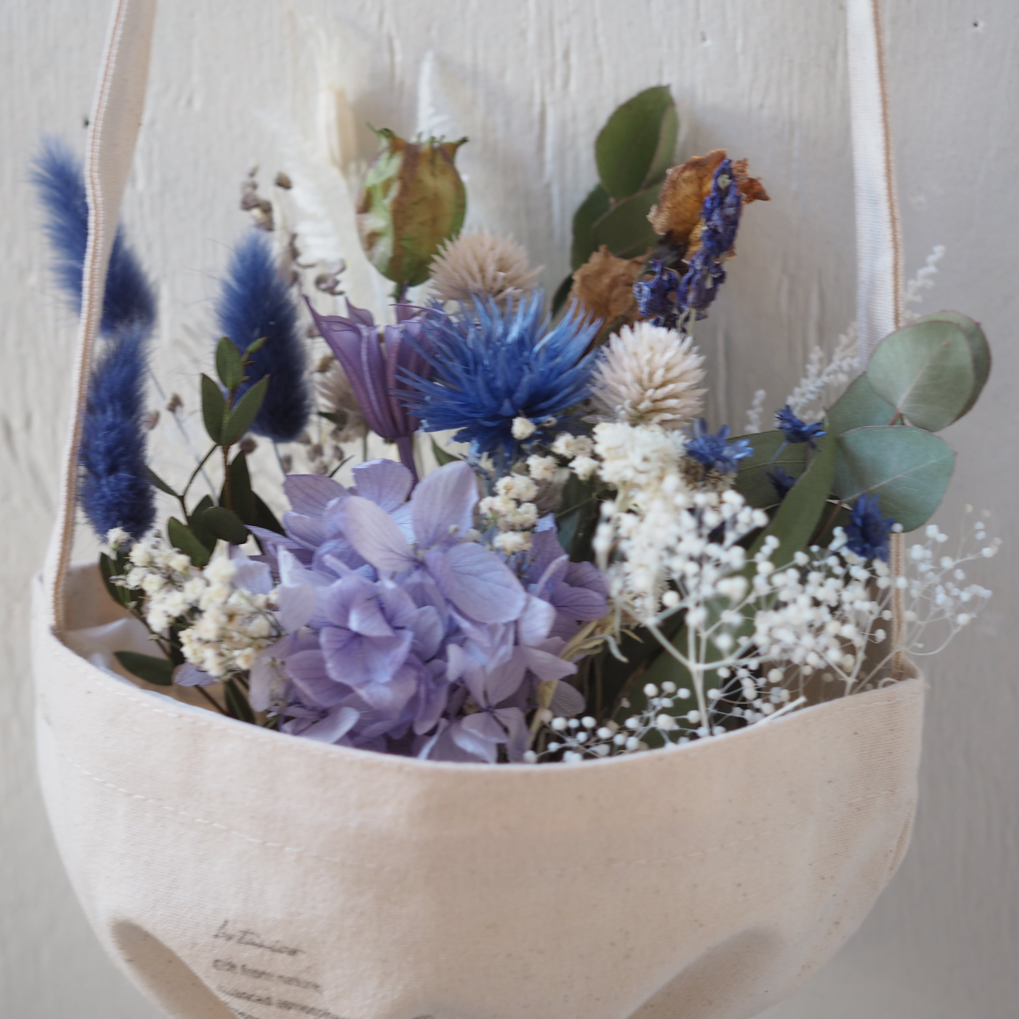 可愛いドライフラワーのブーケをポシェットタイプの花束にしました。
