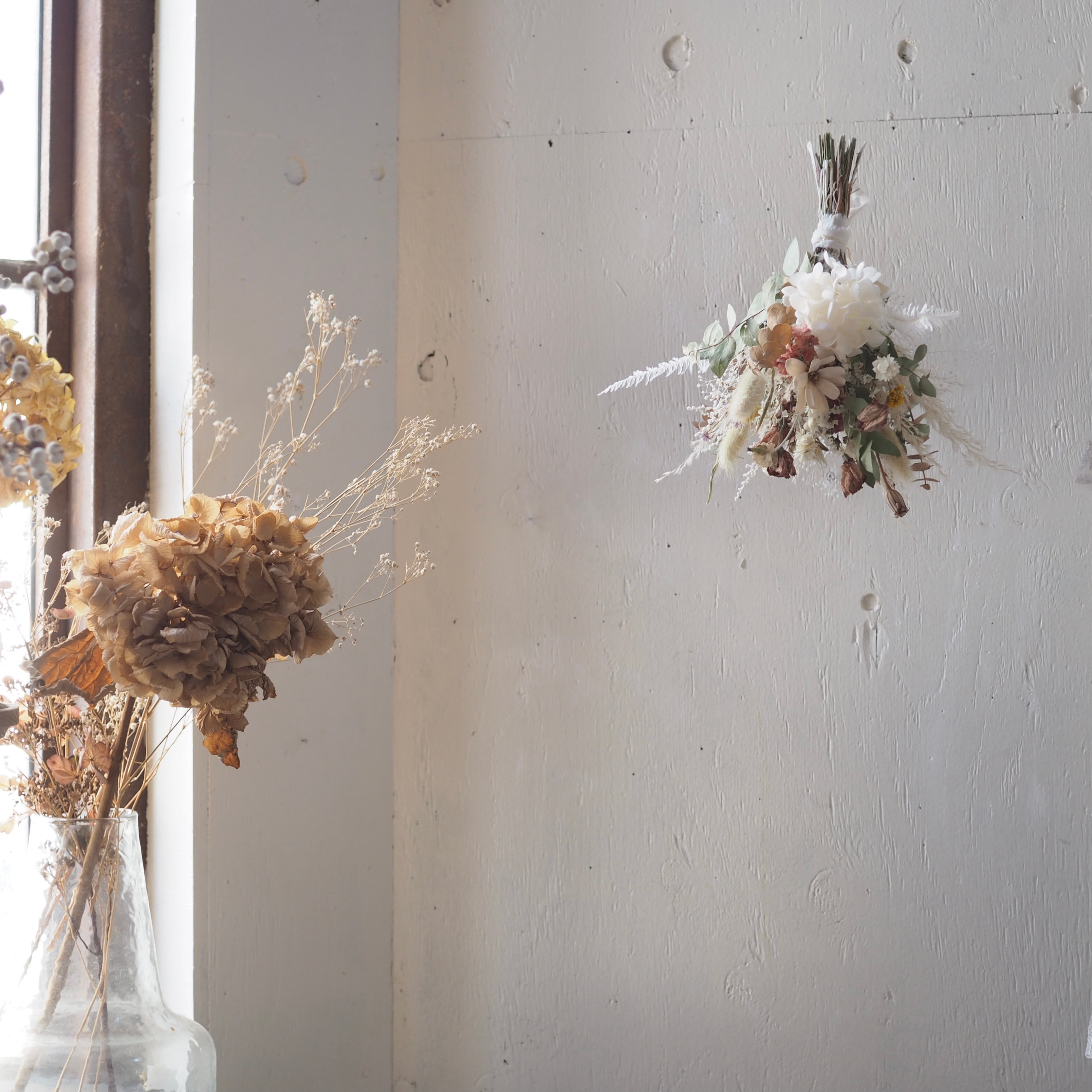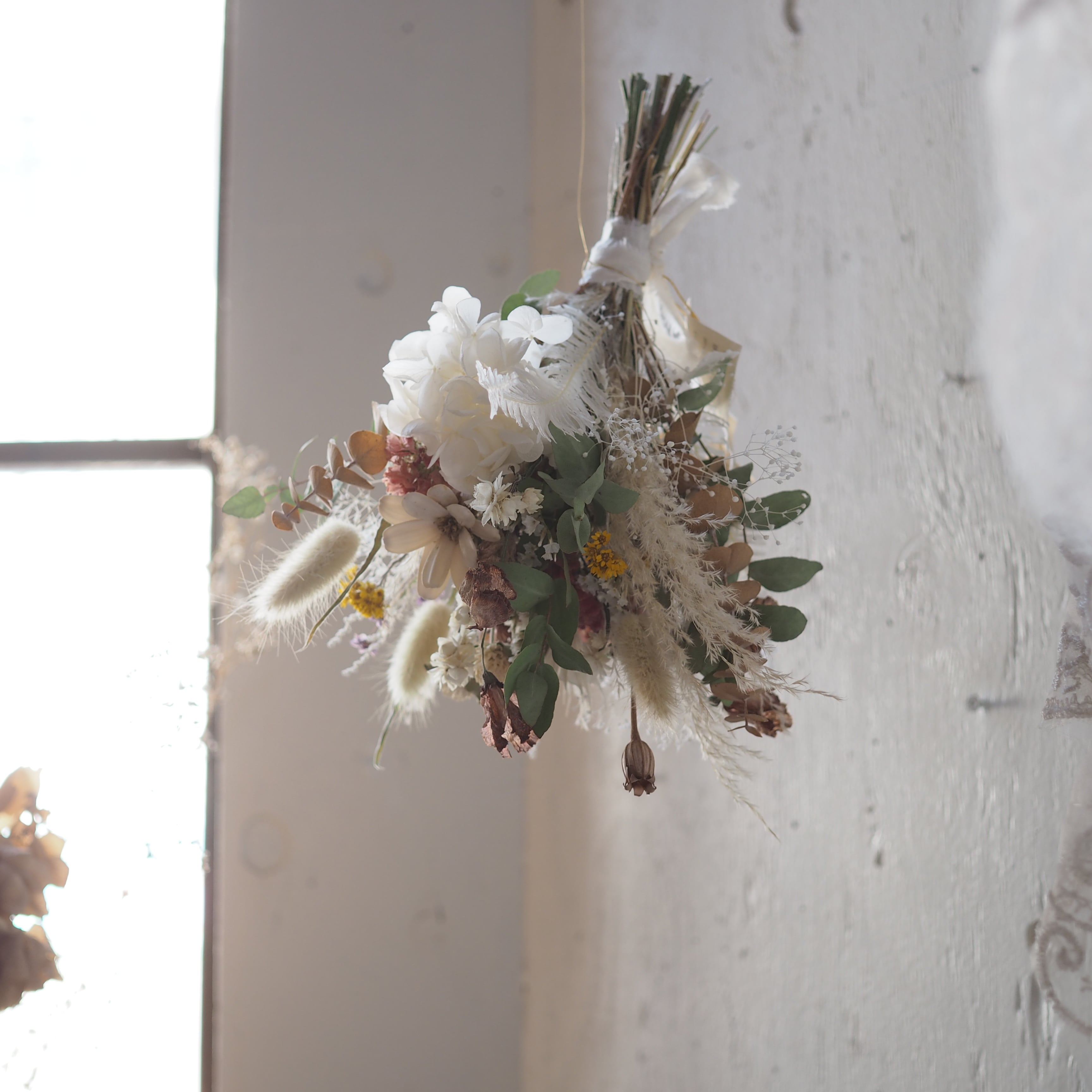 ナチュラルなドライフラワーのフライングスワッグ。