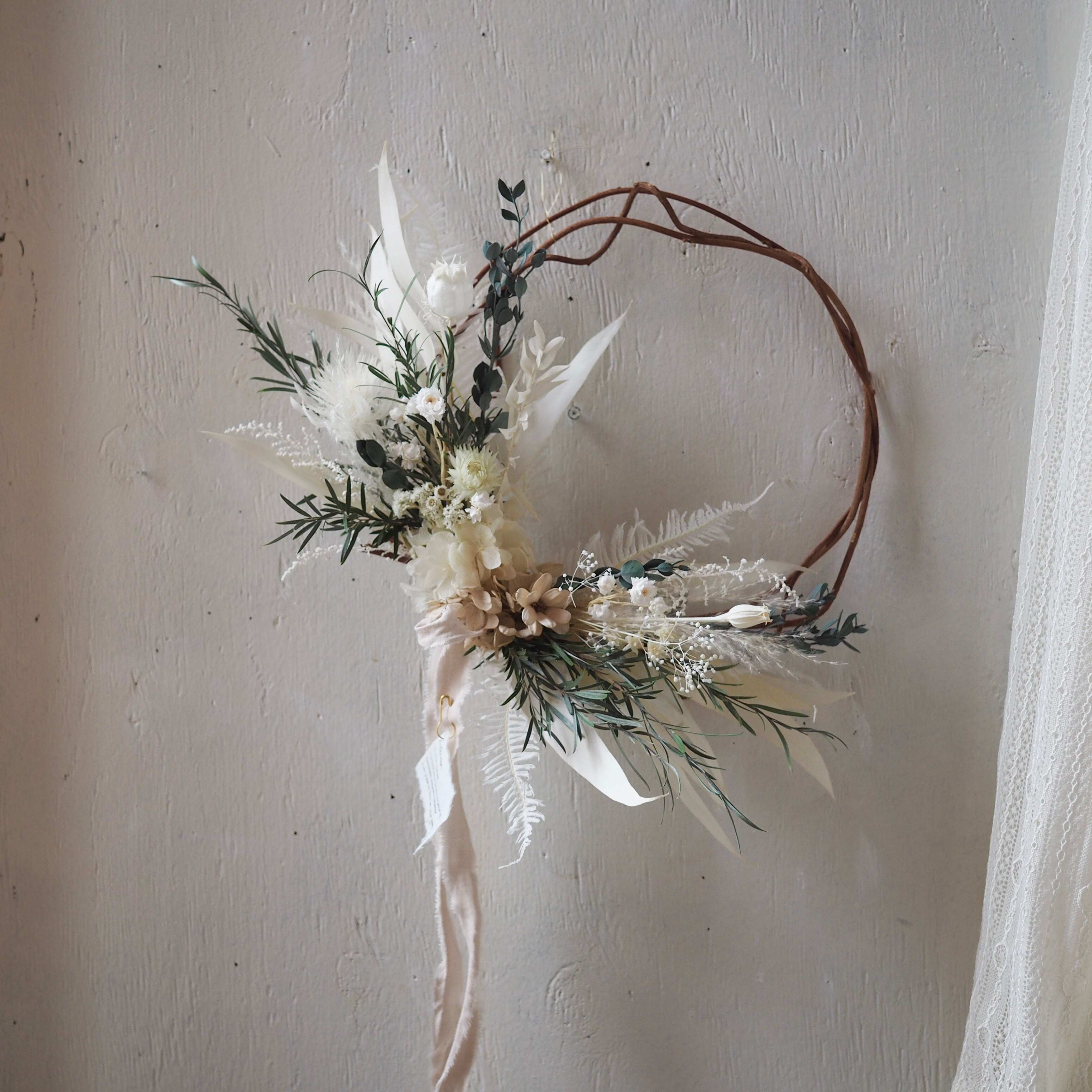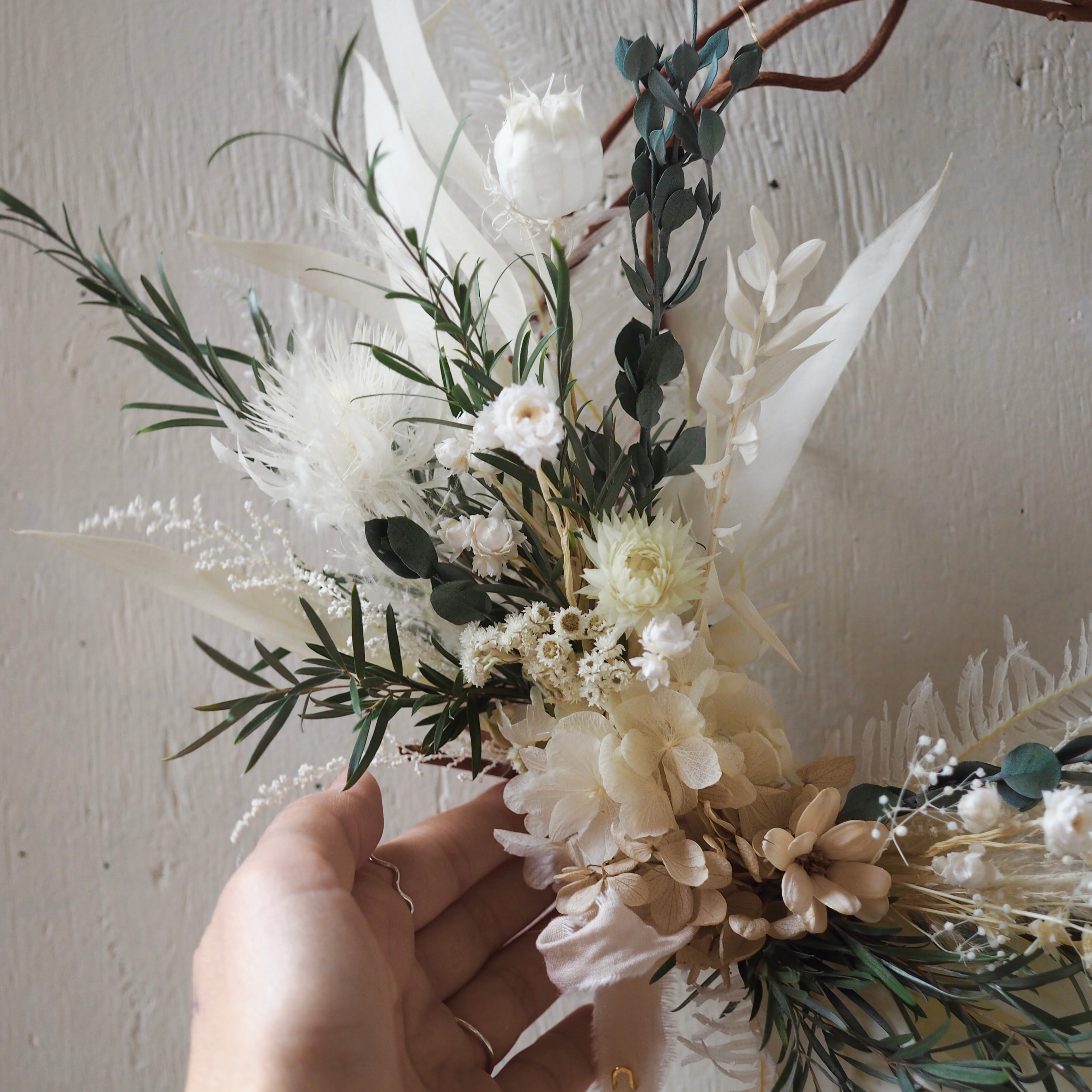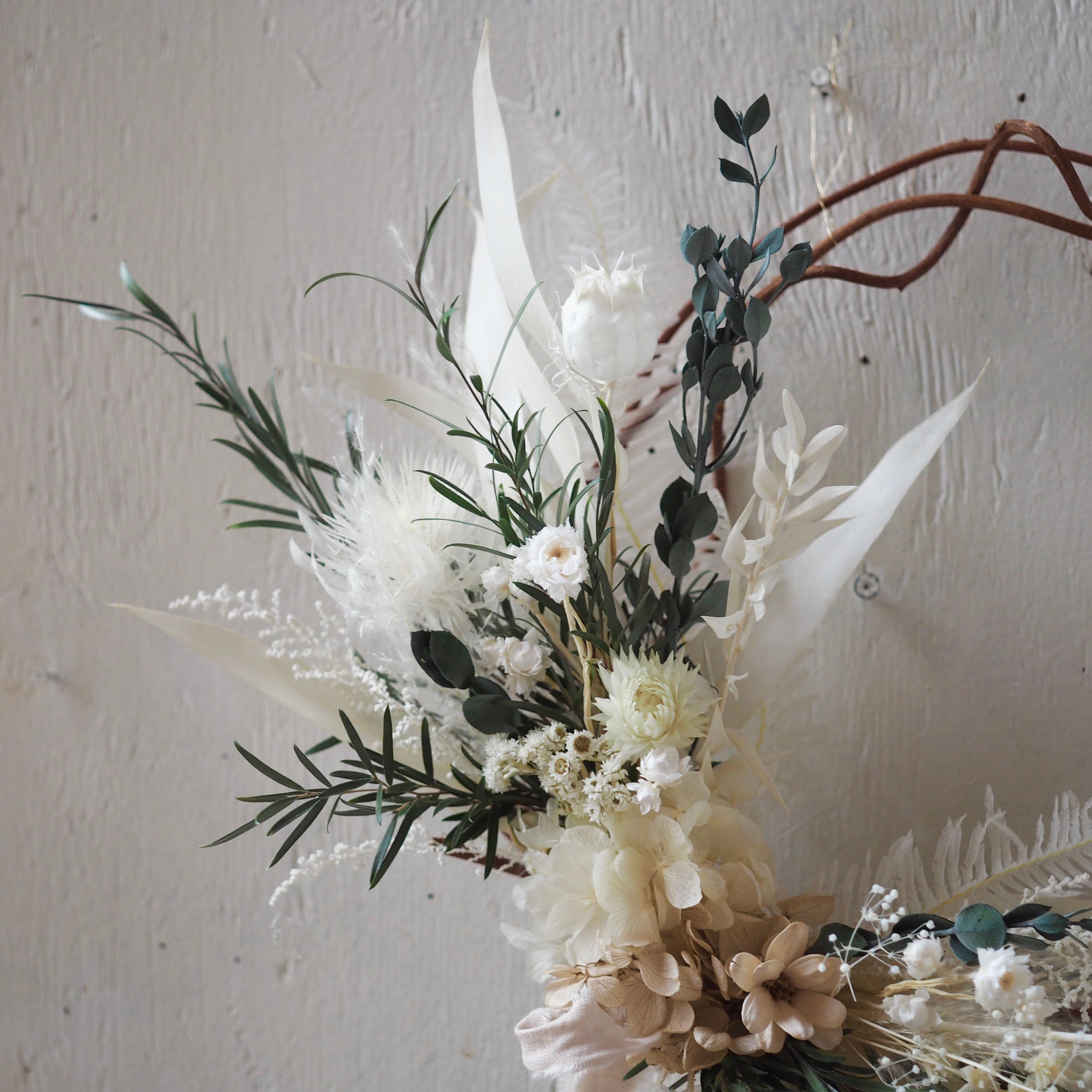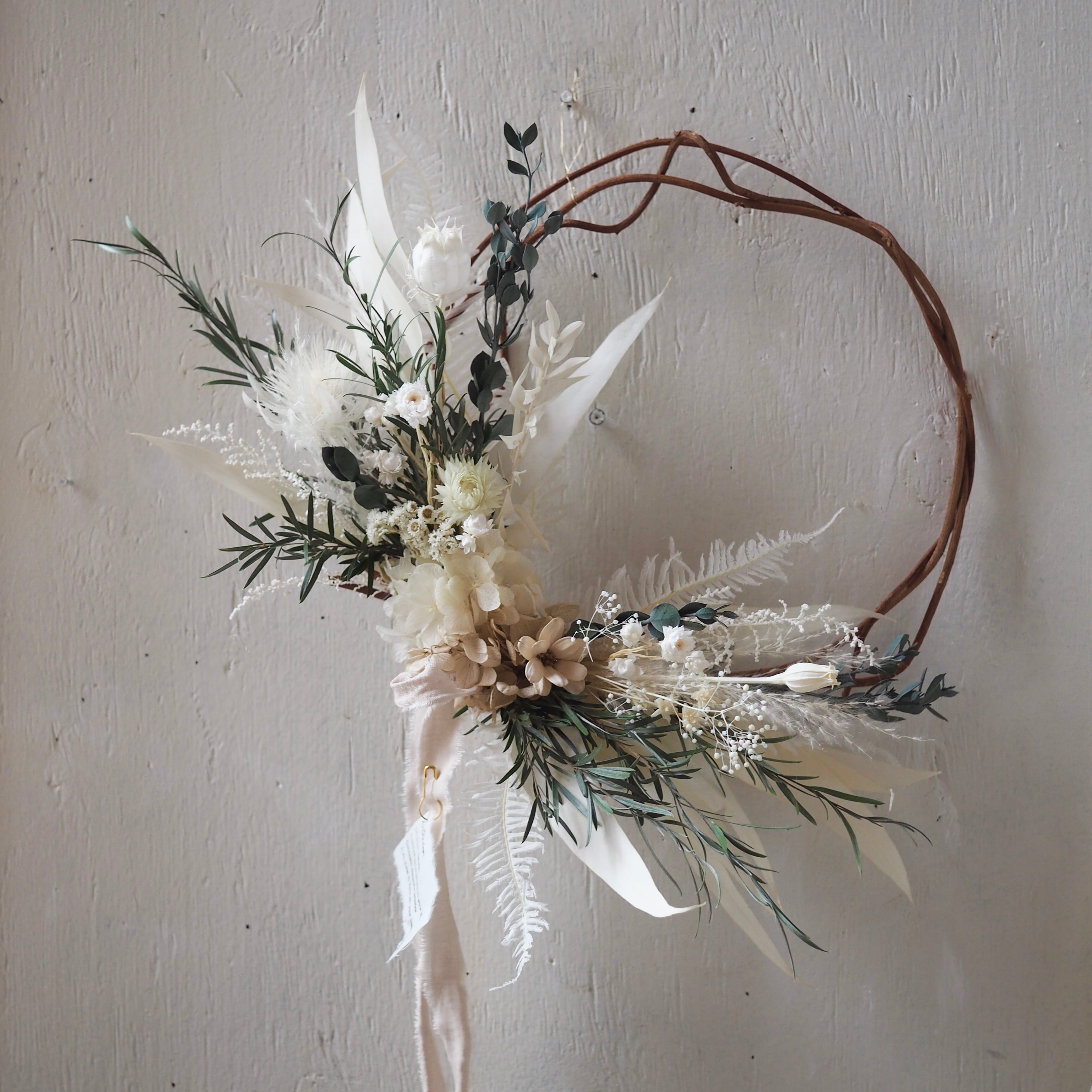自然な枝ぶりをそのまま活かし、繊細な花や葉を添えた、ナチュラルなドライフラワーリースです。