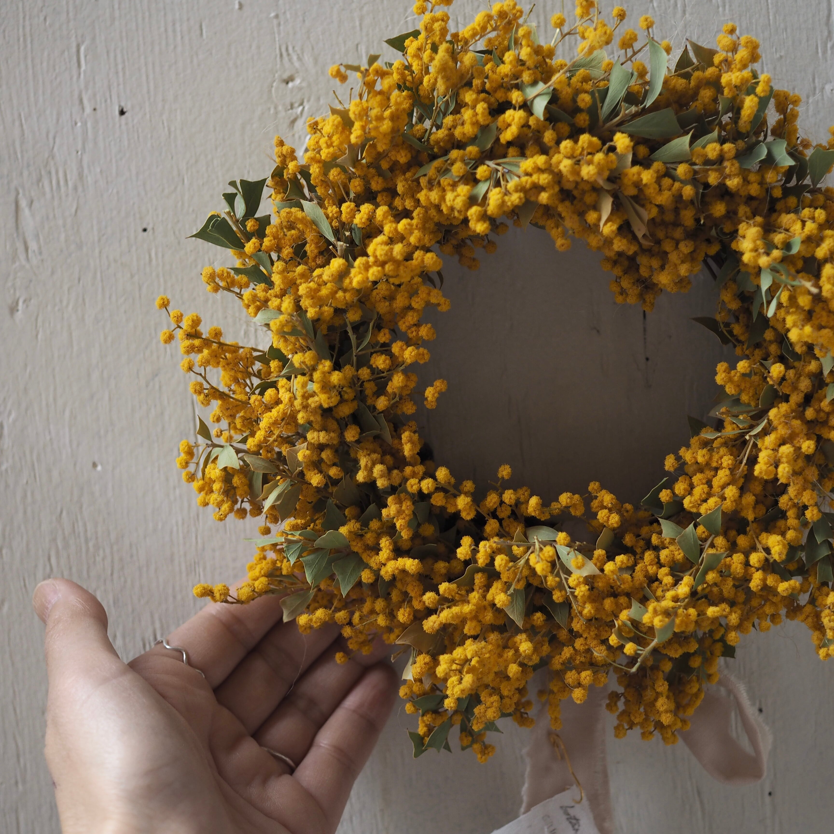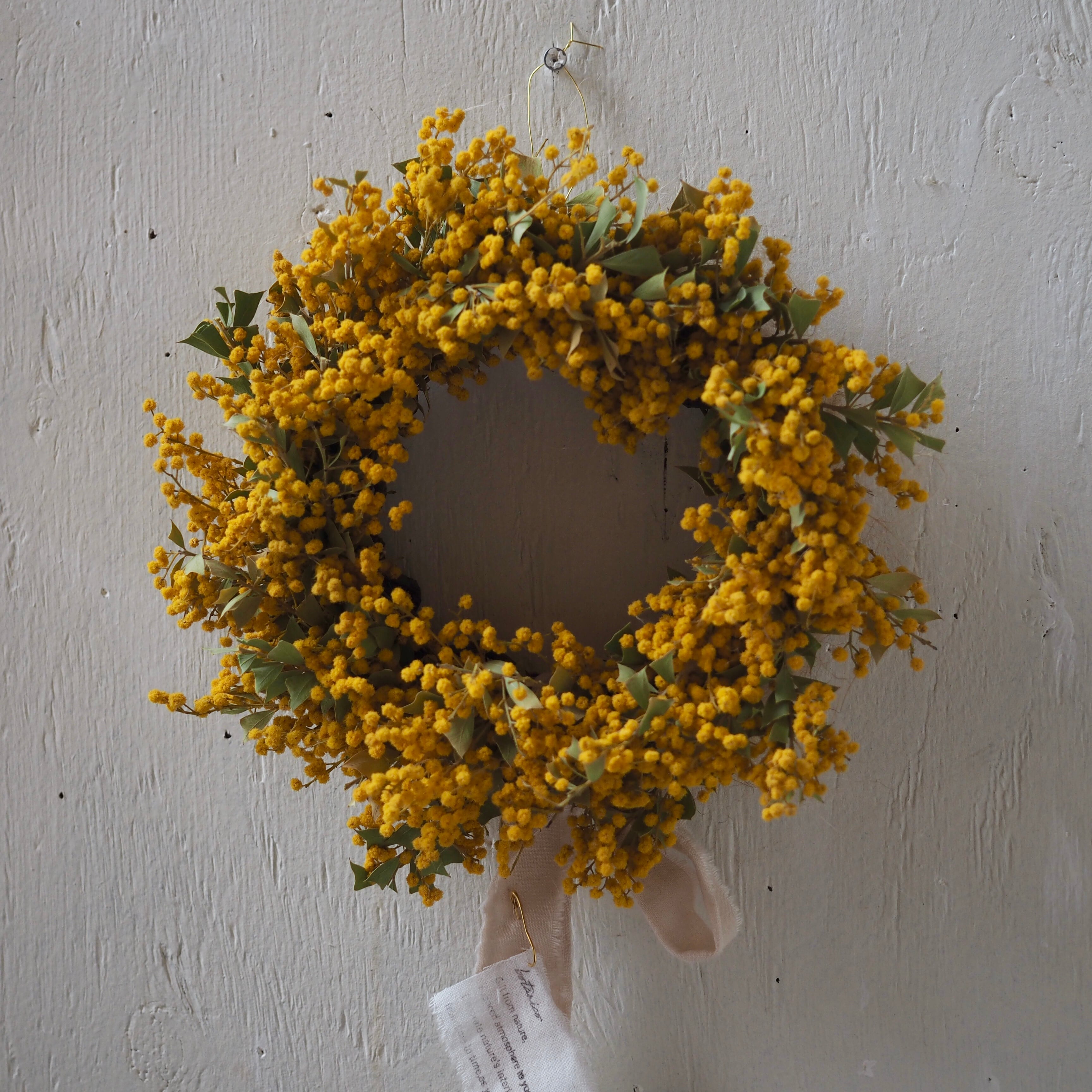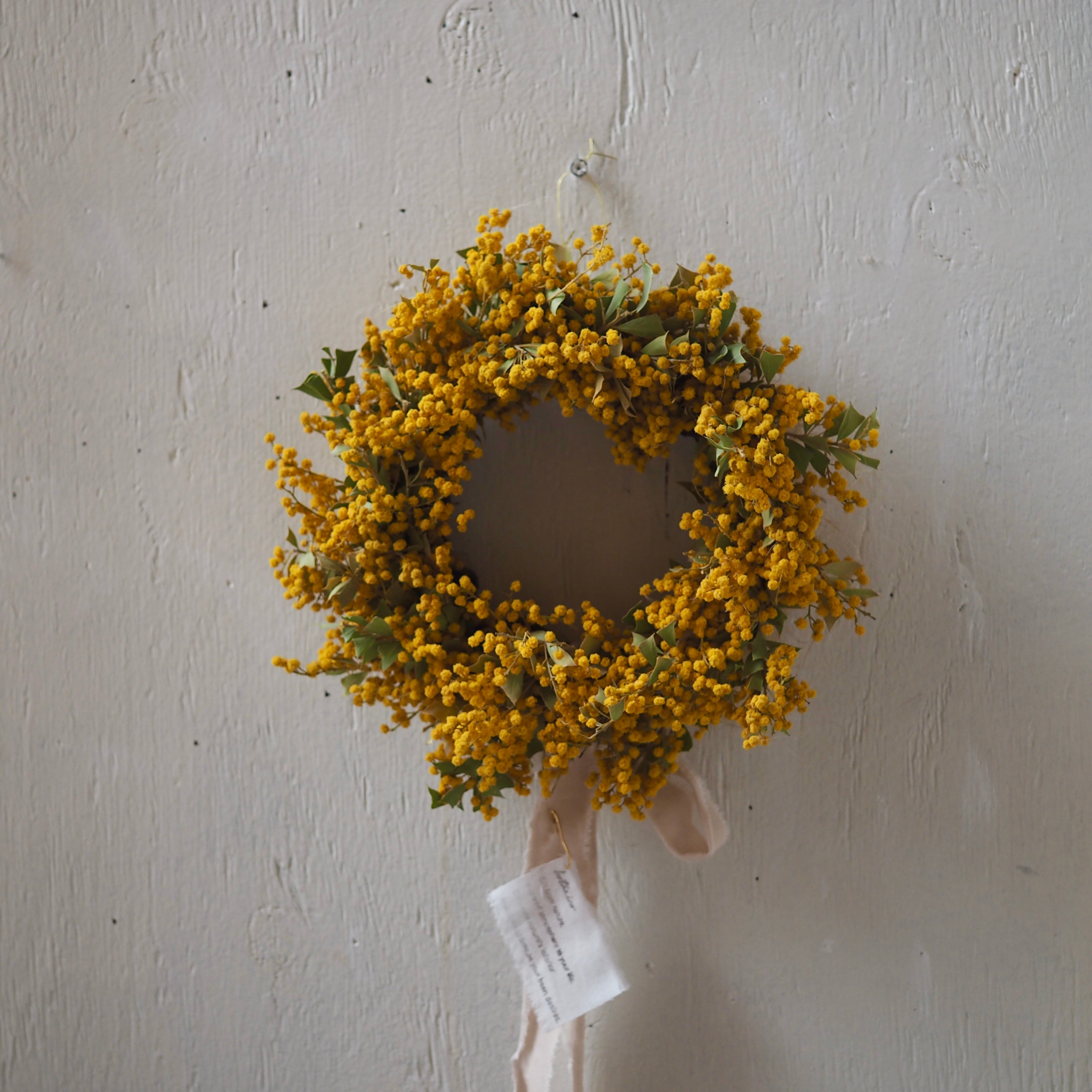 ミモザをぐるっと一周、たっぷりと贅沢にあしらったリースです。