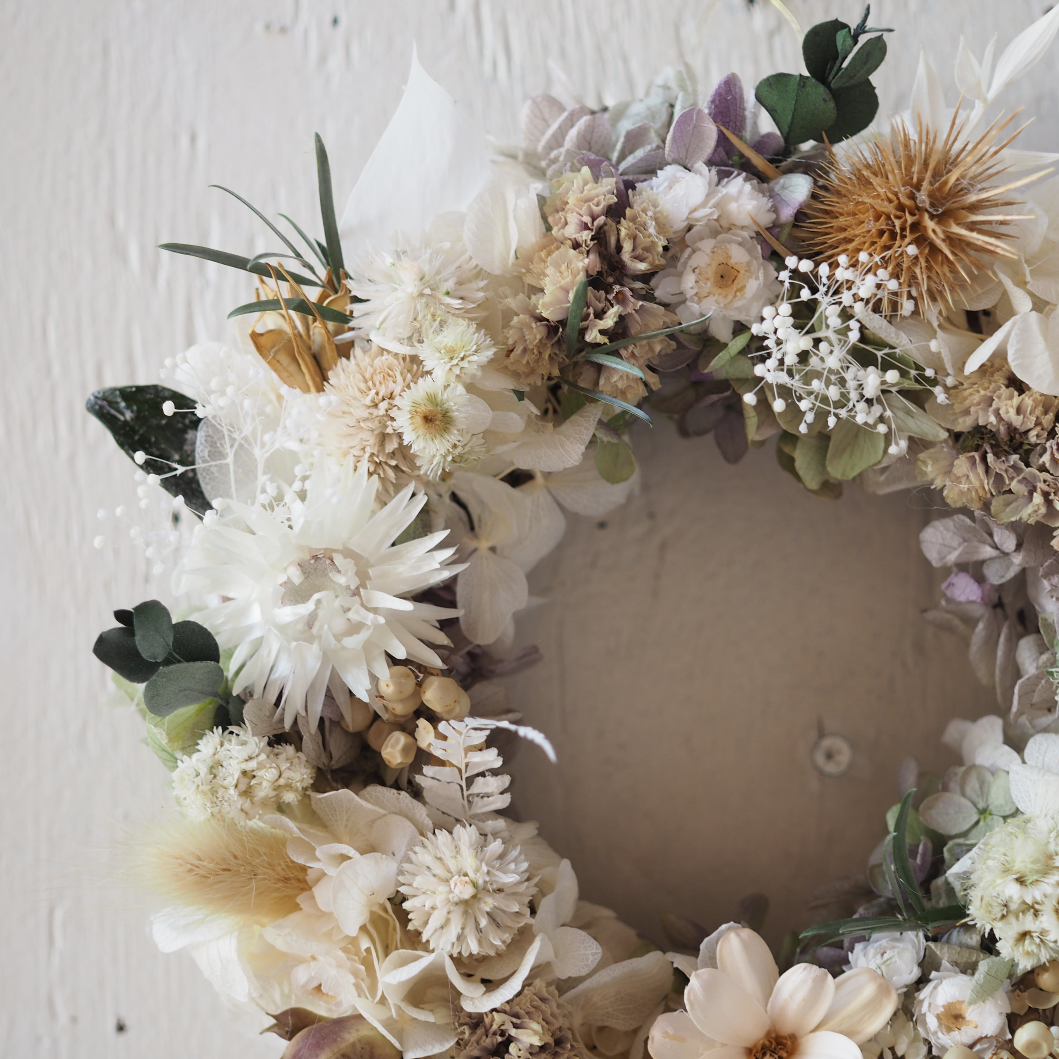 ドライフラワーをぐるっと一周、たっぷりと贅沢にあしらったリースです。