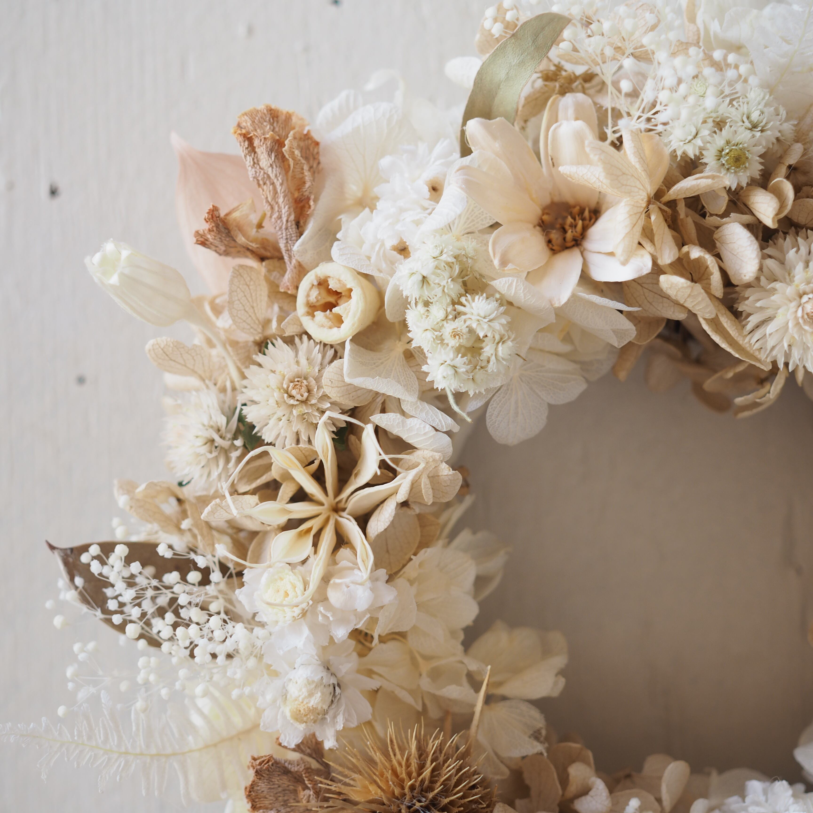 ドライフラワーをぐるっと一周、たっぷりと贅沢にあしらったリースです。