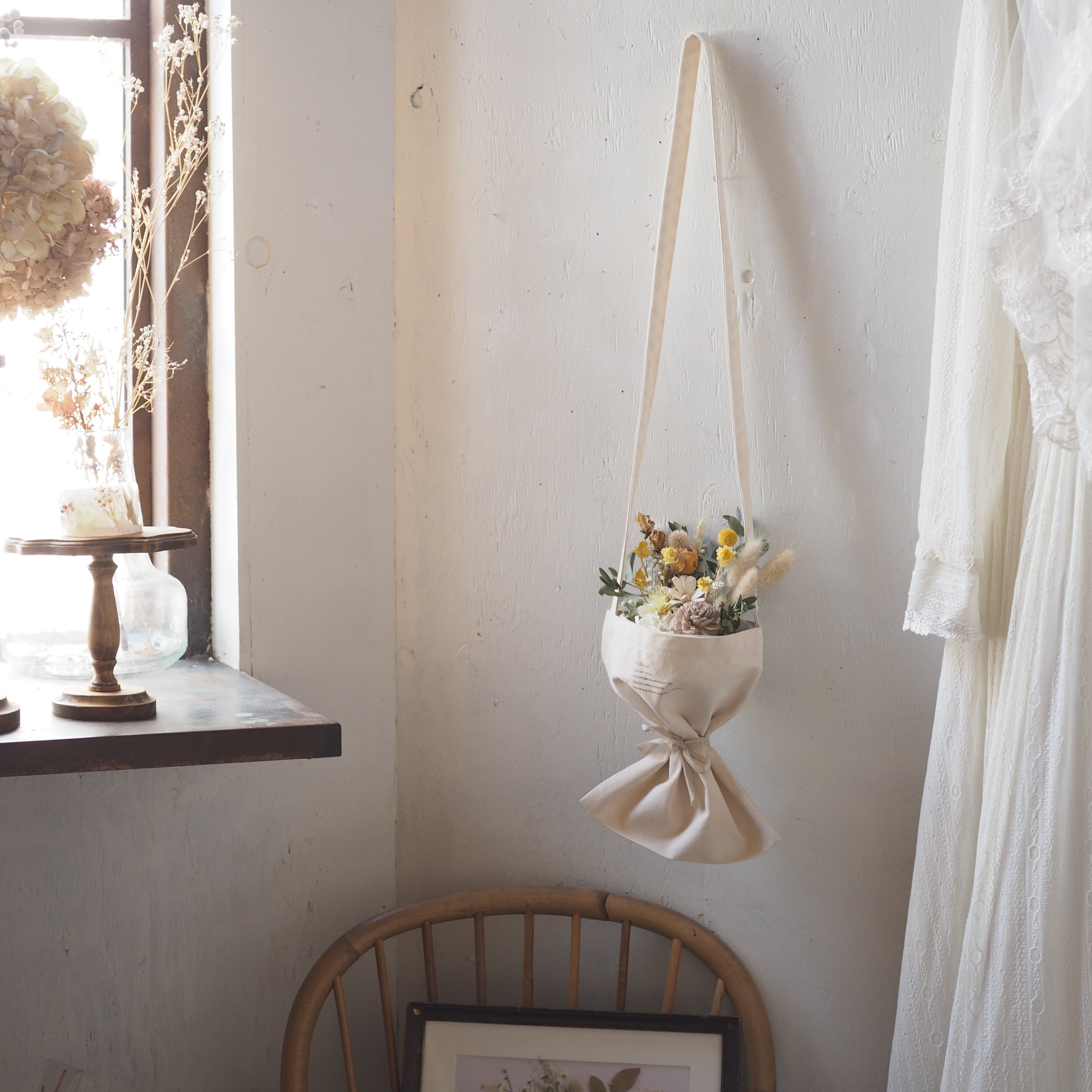 可愛いドライフラワーのブーケをポシェットタイプの花束にしました。