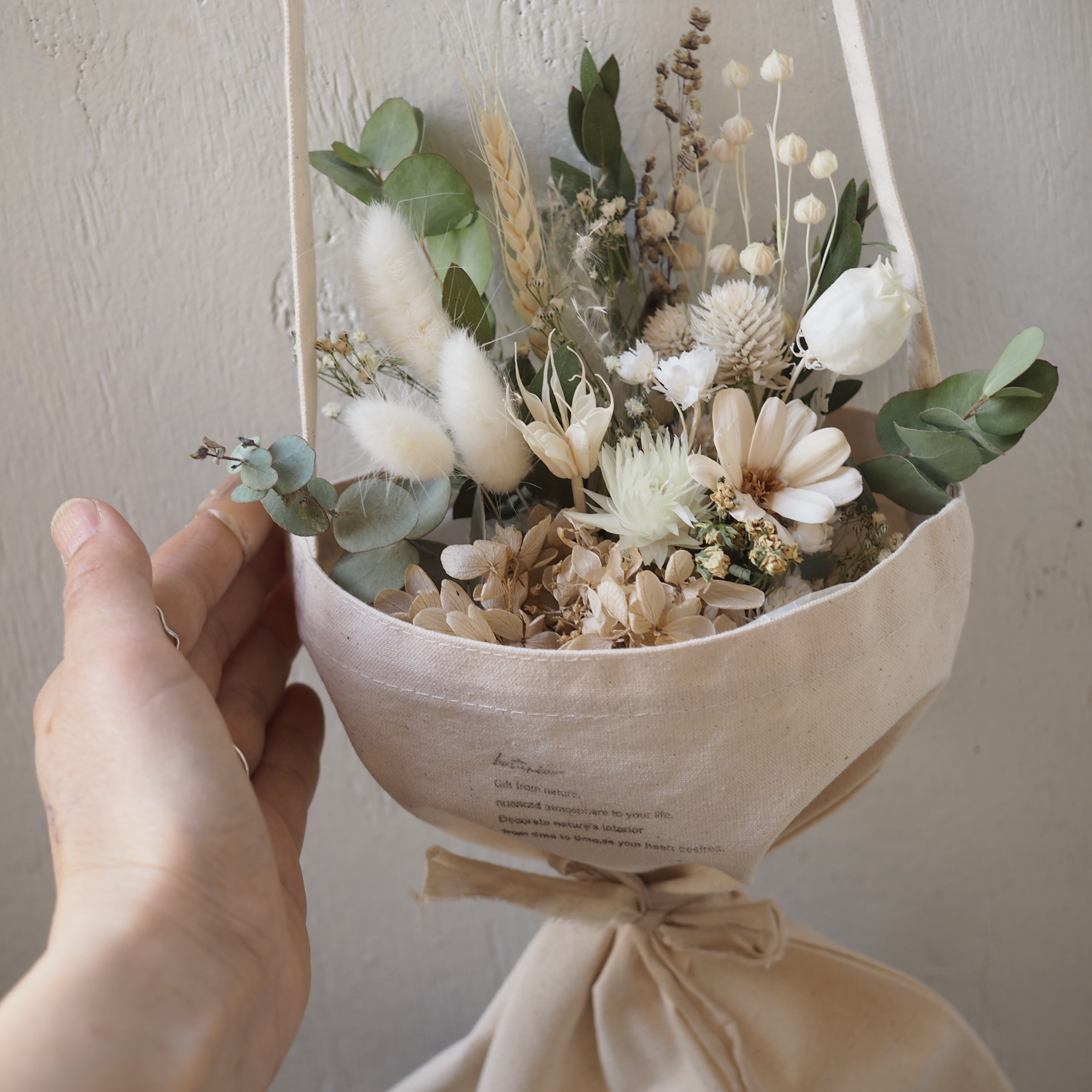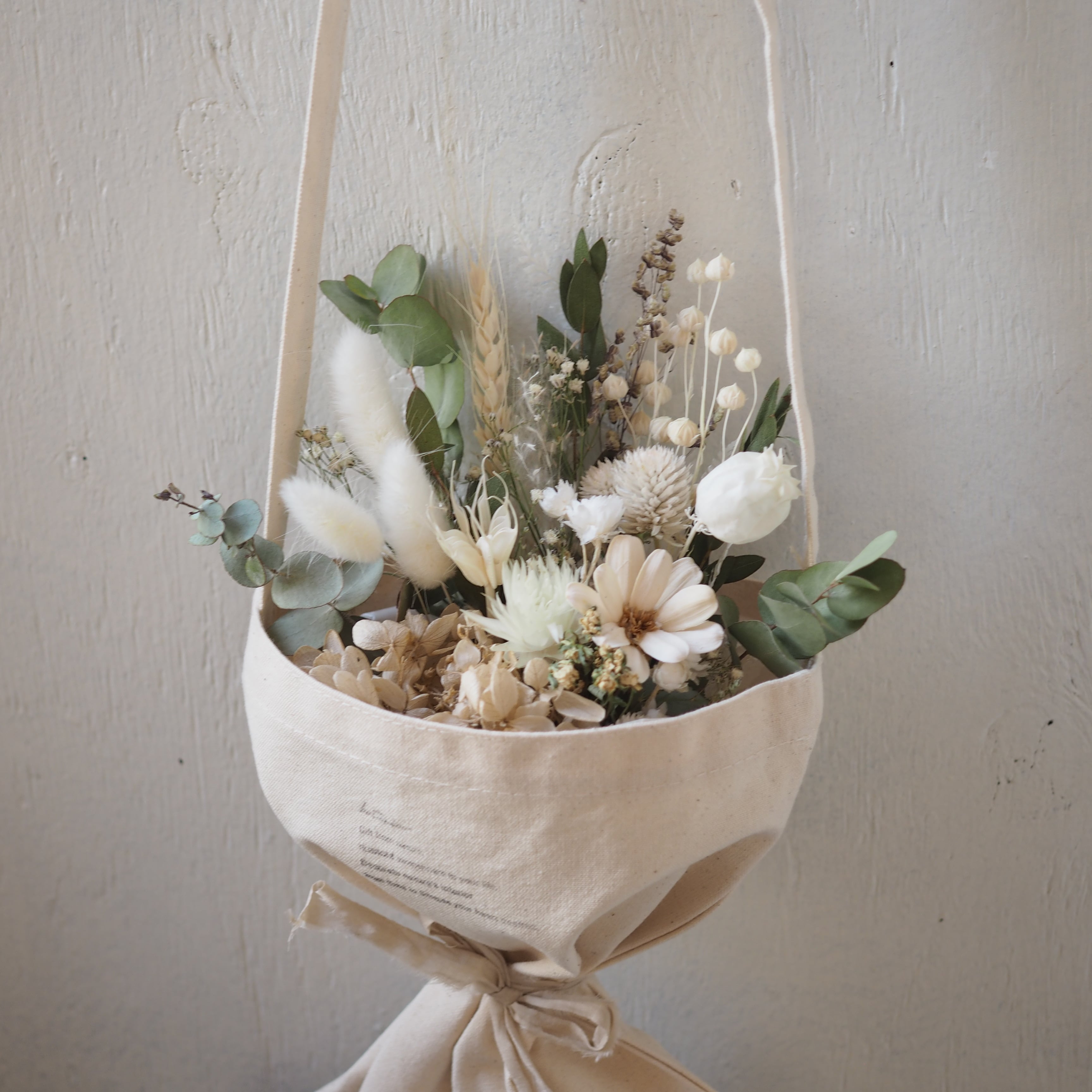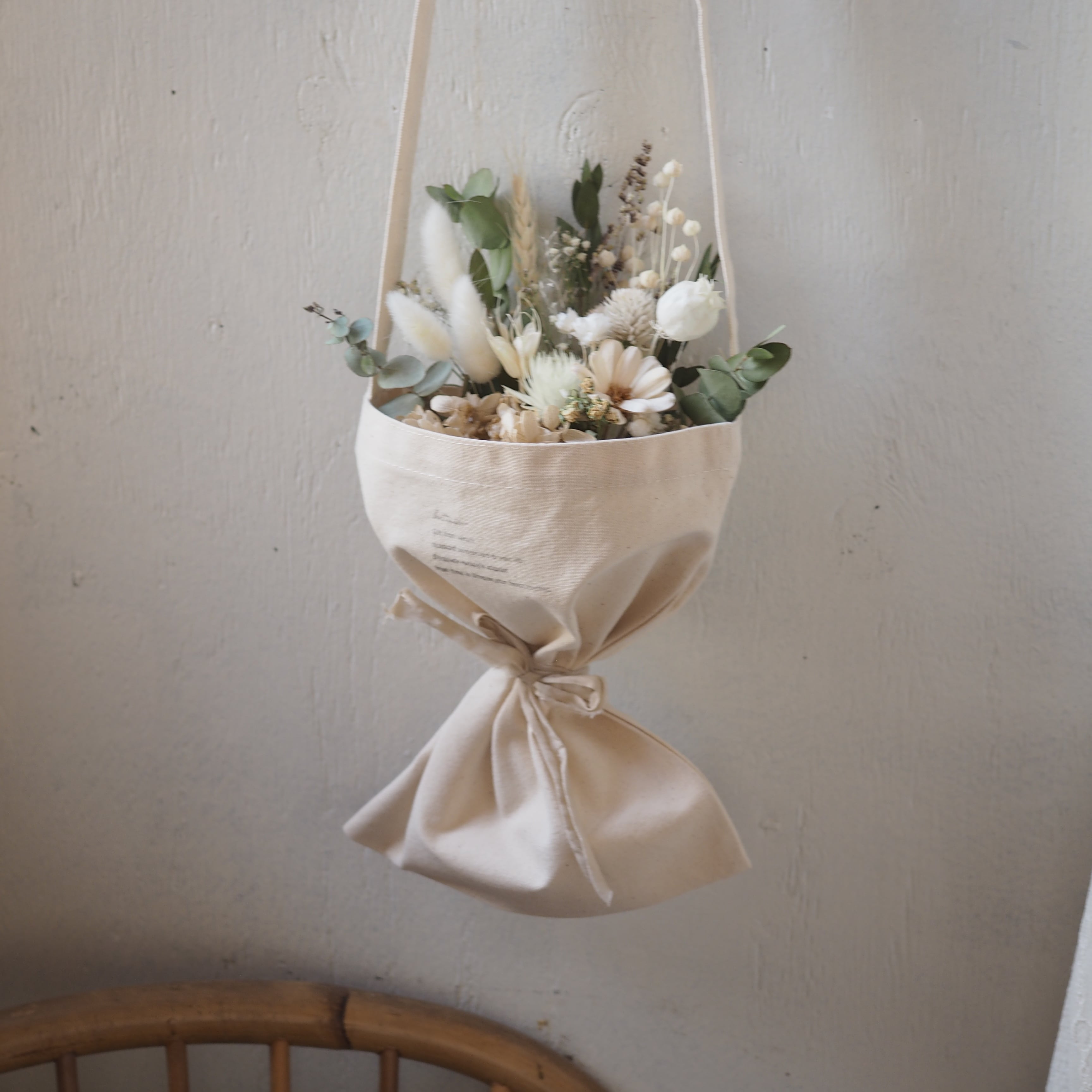 可愛いドライフラワーのブーケをポシェットタイプの花束にしました。