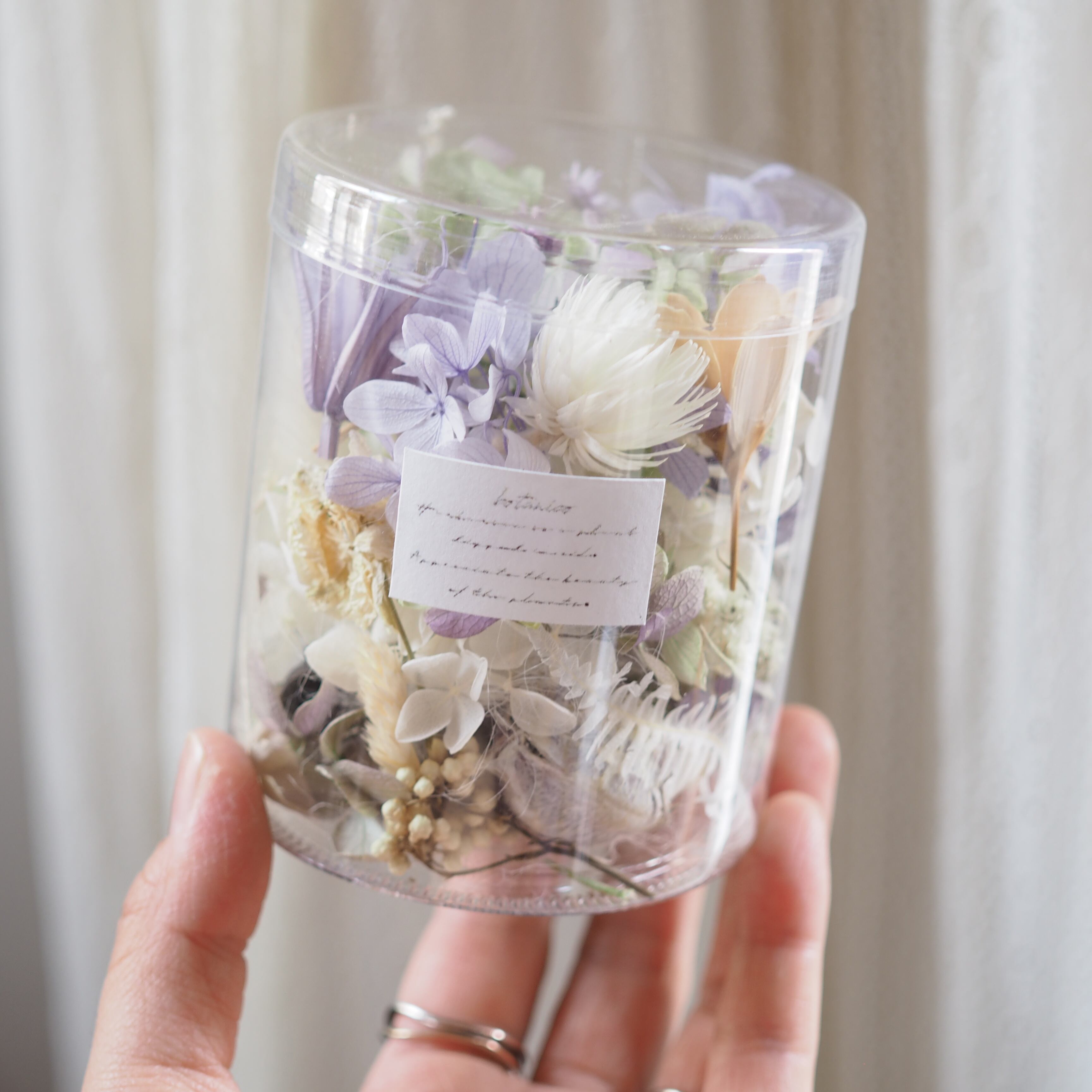カップに可愛いドライフラワーをぎゅっと詰め込んだ、見た目にも香りにも癒されるポプリです。
