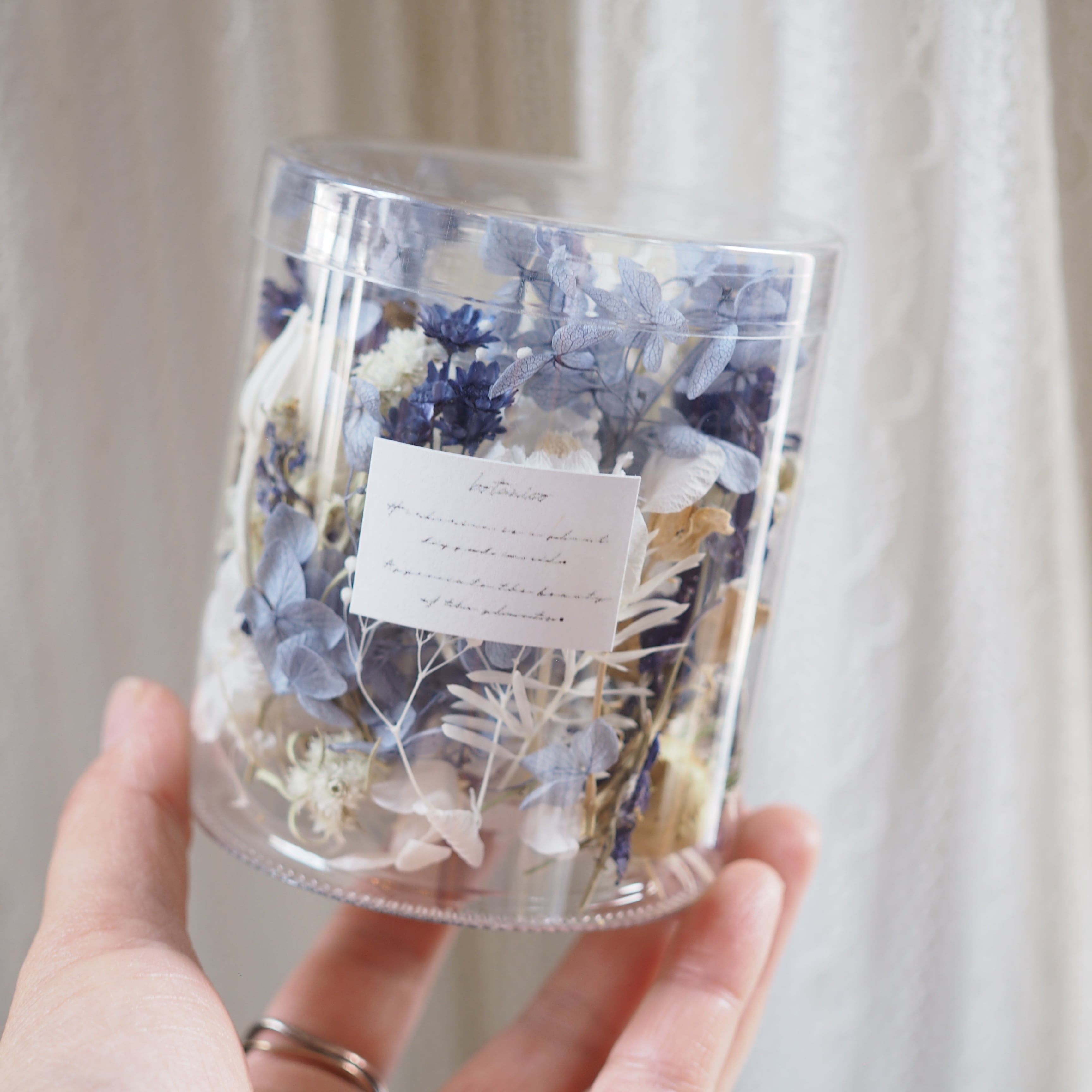 カップに可愛いドライフラワーをぎゅっと詰め込んだ、見た目にも香りにも癒されるポプリです。
