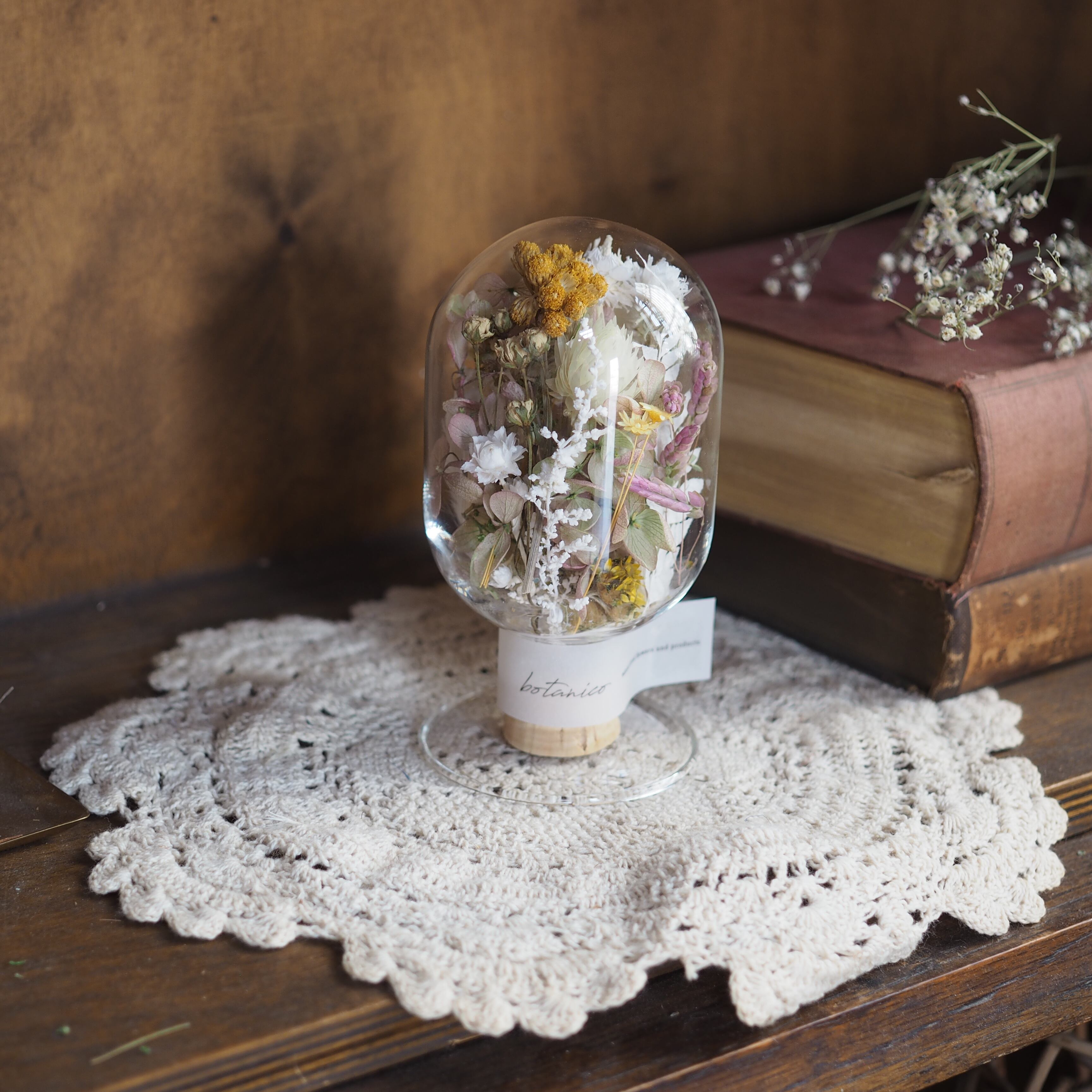 手作業で丁寧に仕上げたコルク瓶の中には、通年で扱いやすいドライフラワーを使用しています。